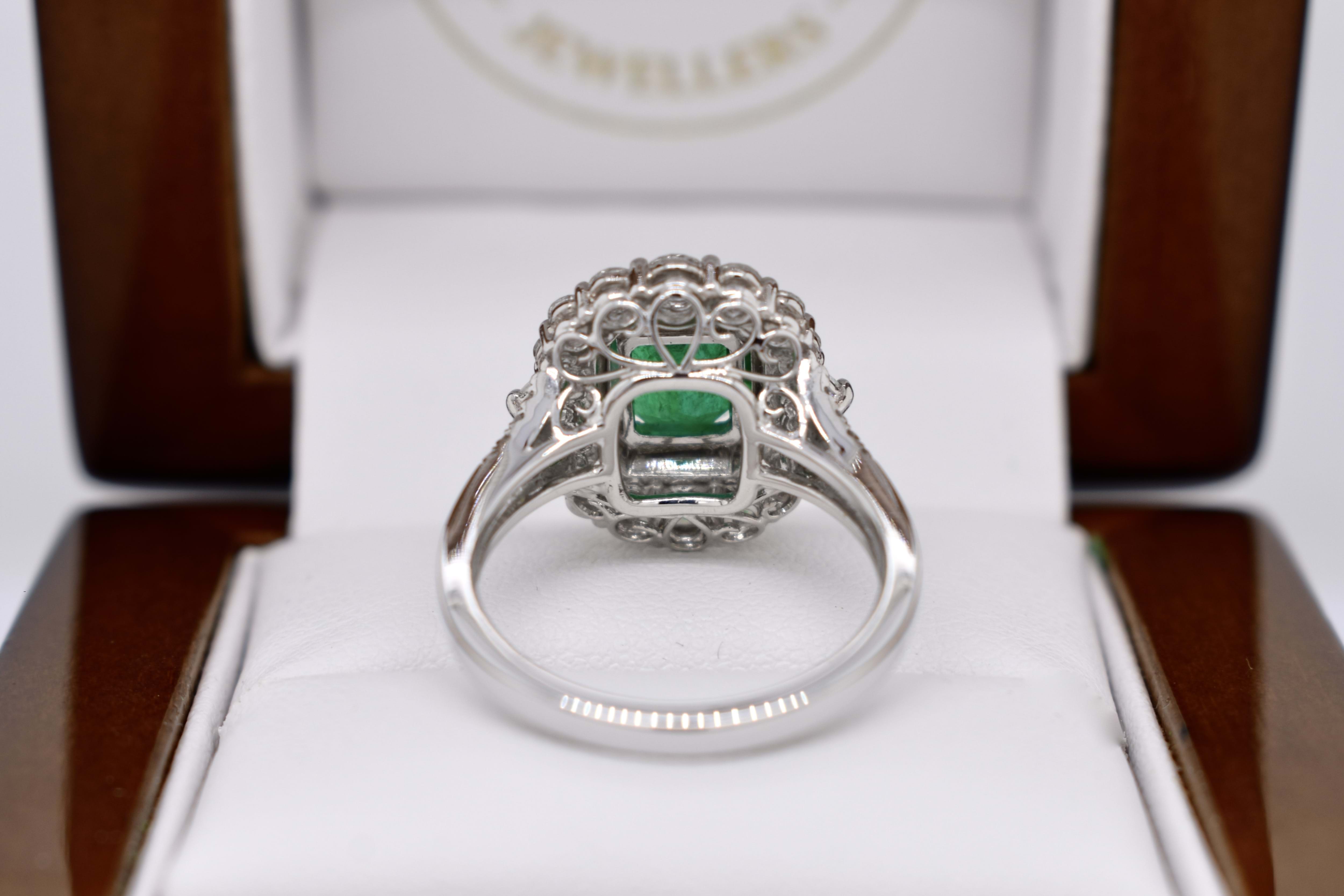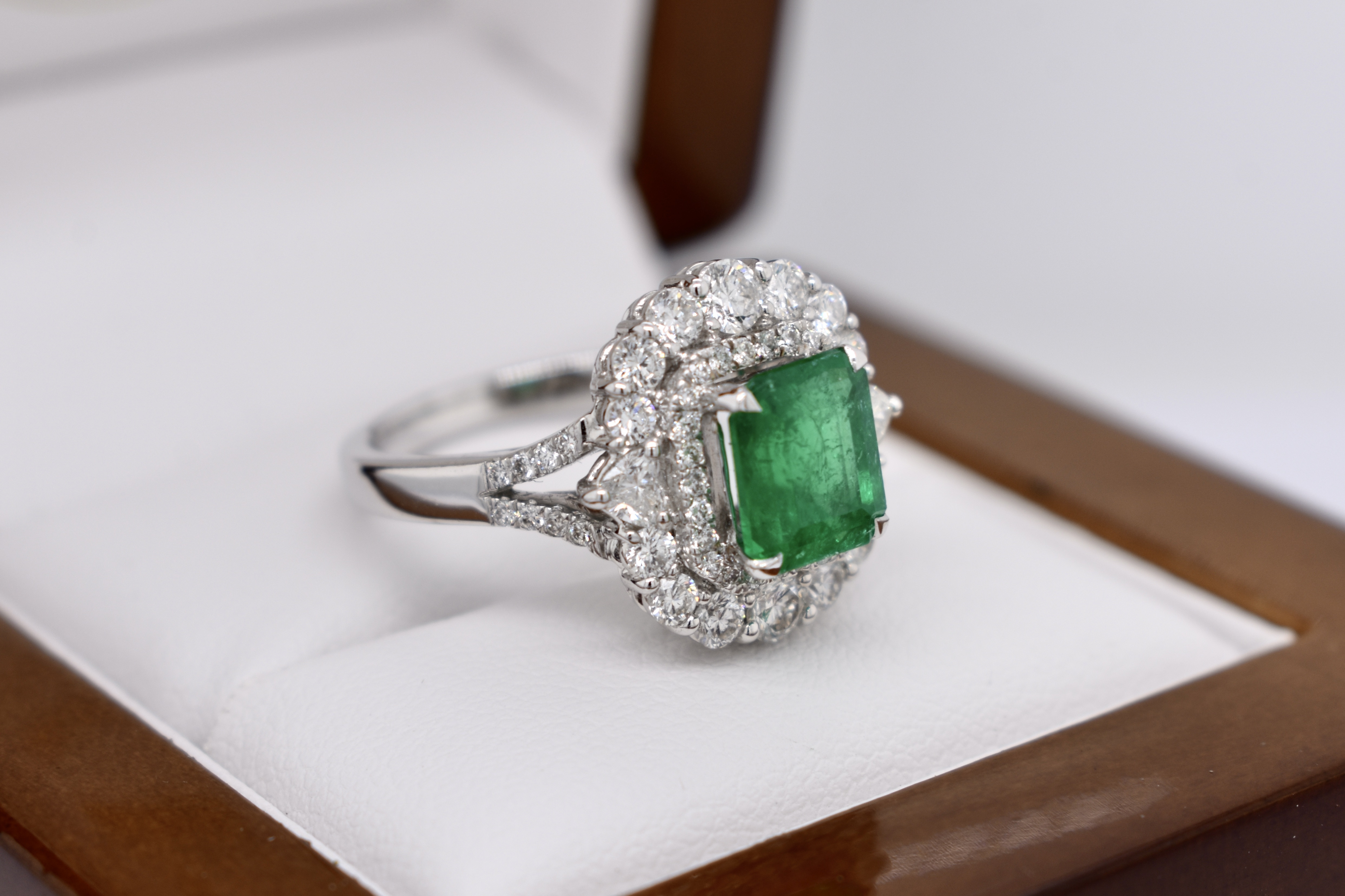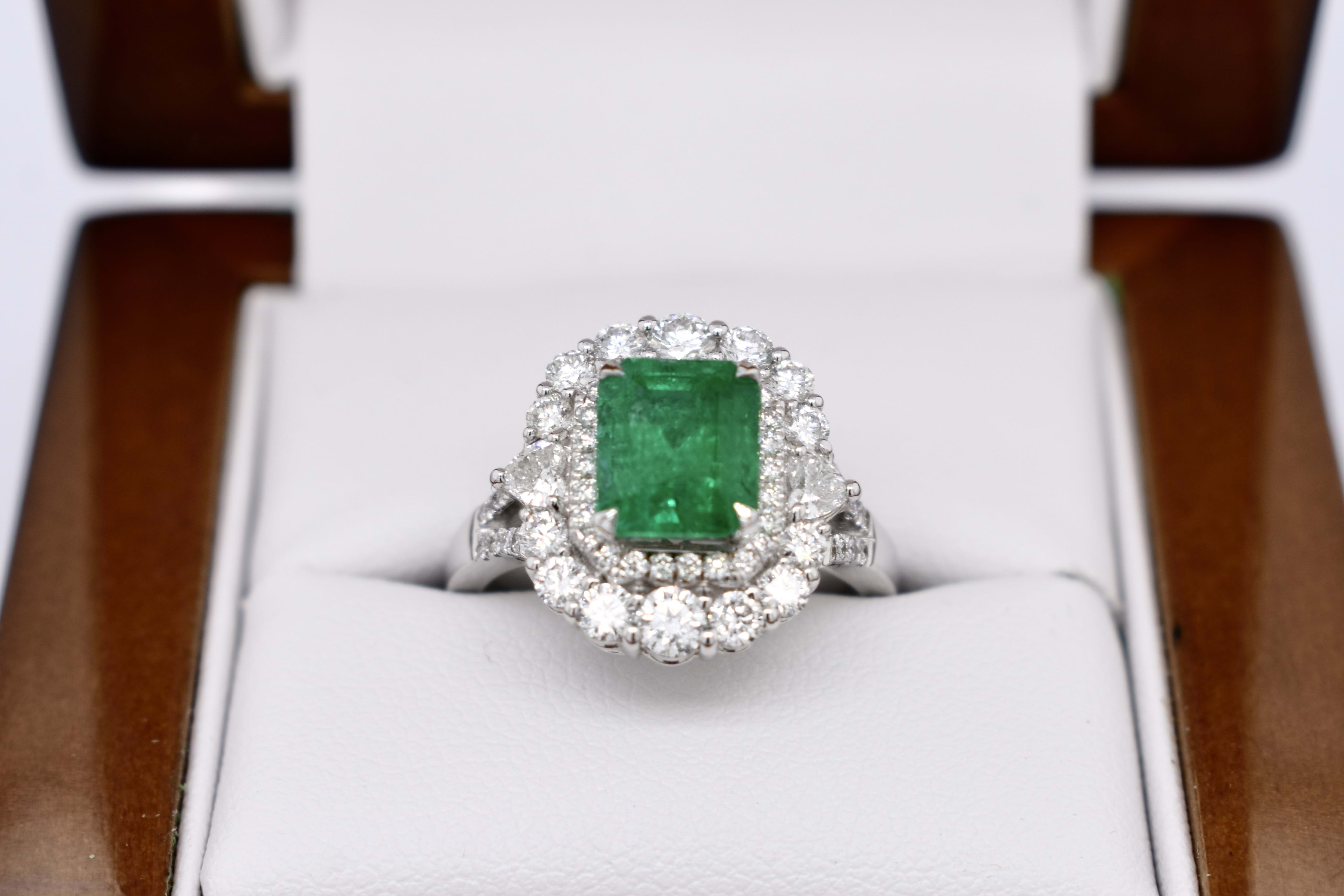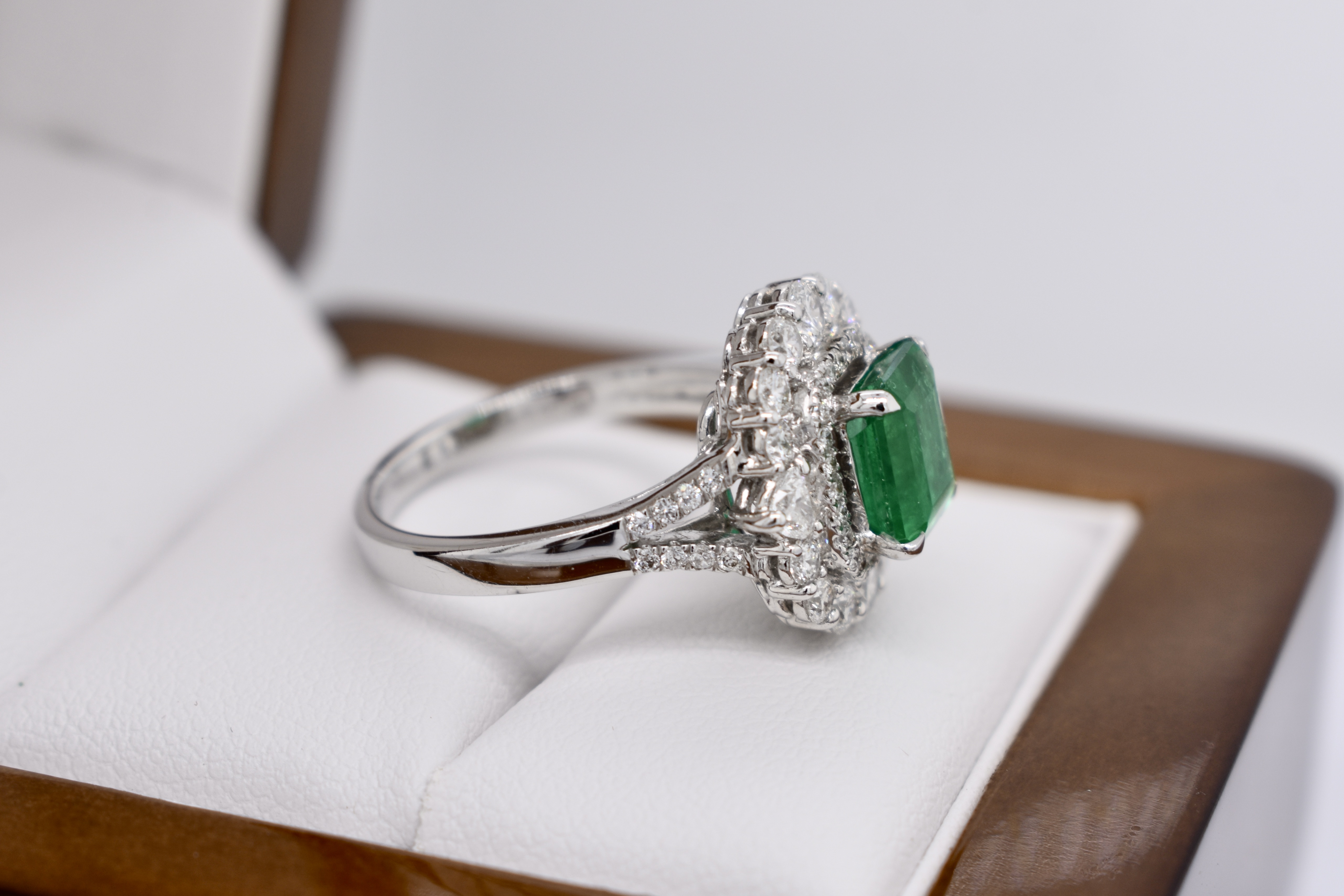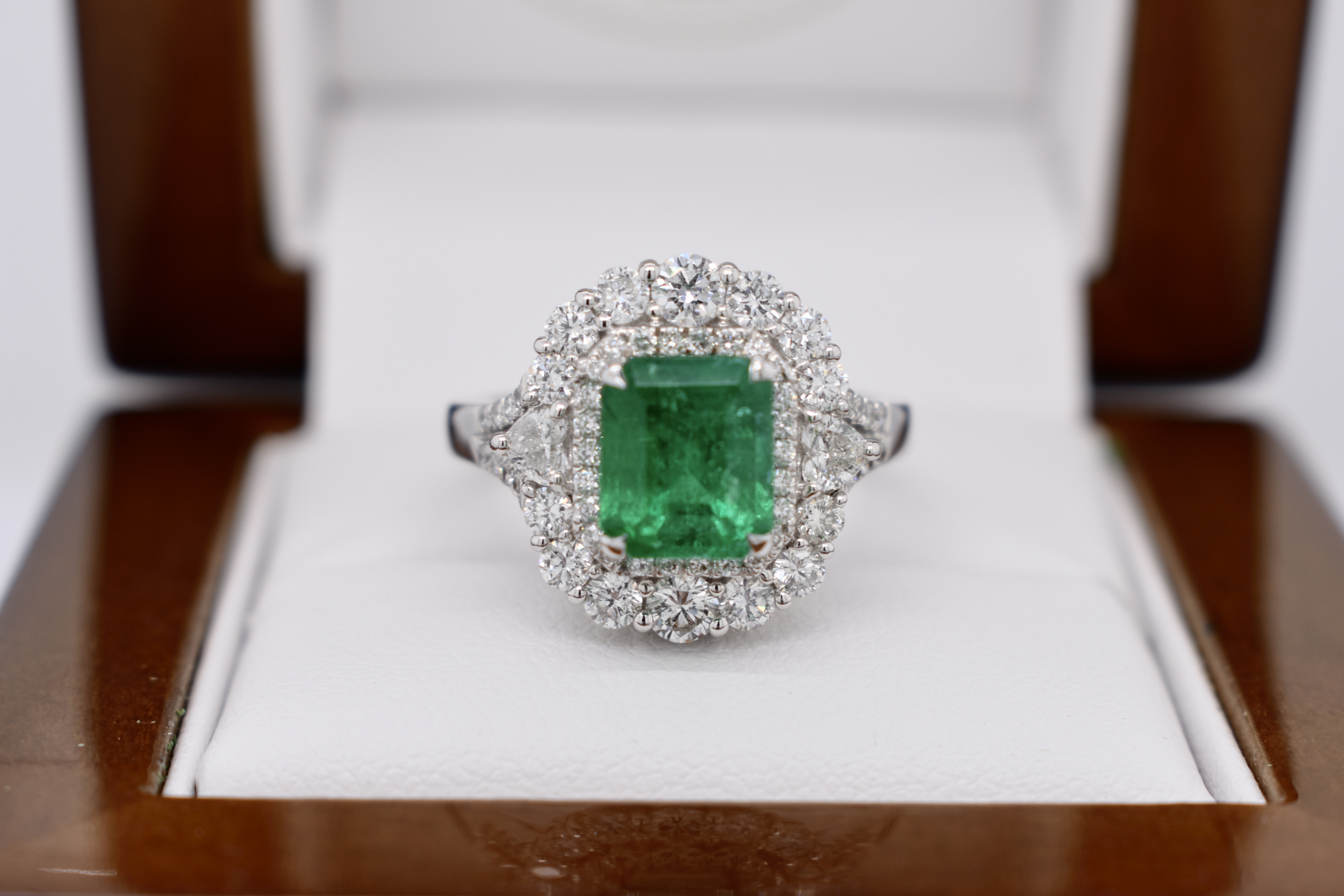 A bright and elegant ring, crafted in 18ct white gold featuring a 1.80ct emerald cut shaped Columbian emerald, in four claws with a double halo. The emerald is GRS certified and comes with GRS report. Surrounded by 56 twinkling round brilliant cut diamonds in the halo and continuing down the band, totalling 0.89ct FG VS-SI, with a cute heart shaped diamond each side, two hearts totalling 0.18ct. Total diamond weight 1.07ct FG VS-SI. Completed with a split tapering band. Finger size M. Approx. valuation of $29,000. Independent valuation provided upon purchase.