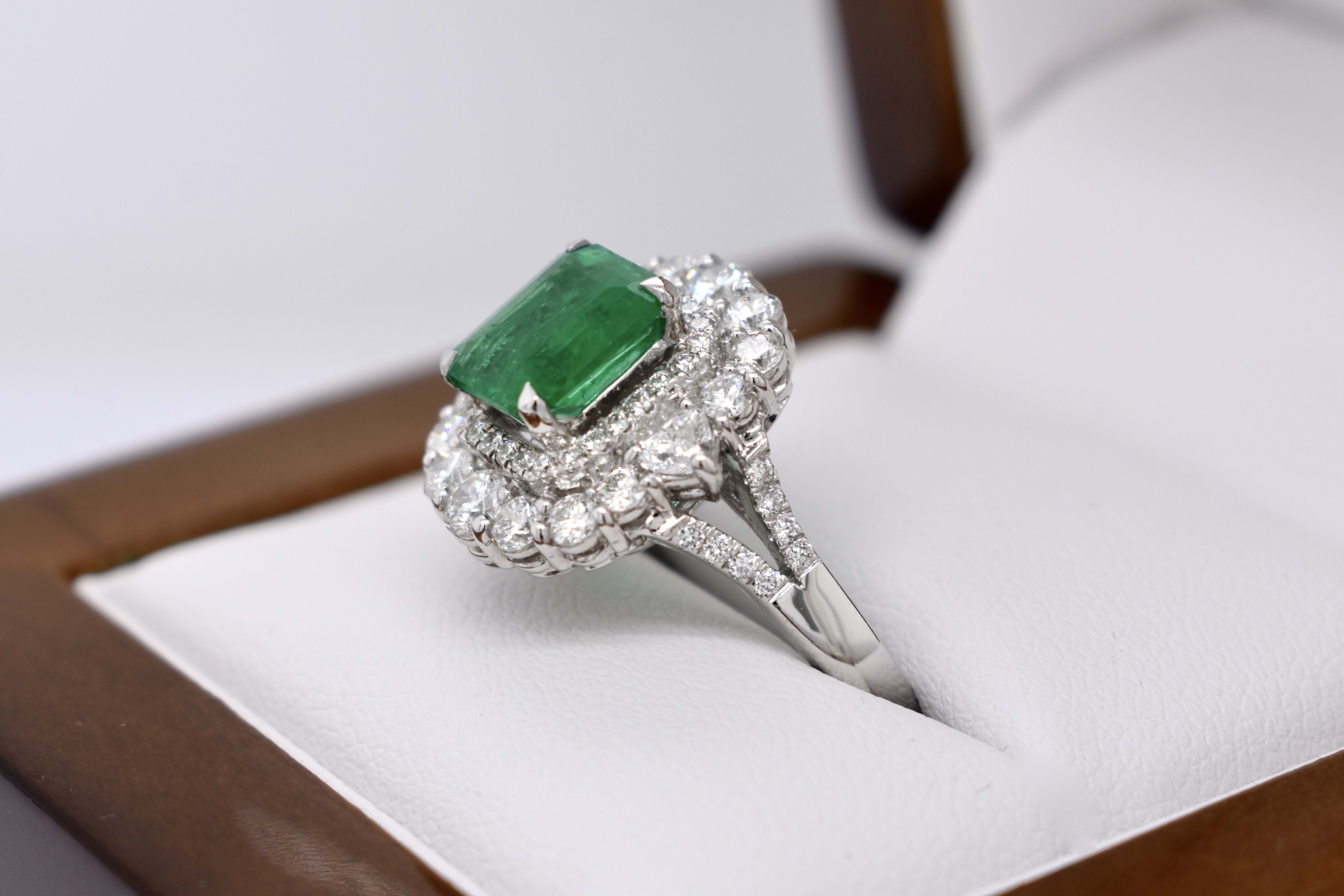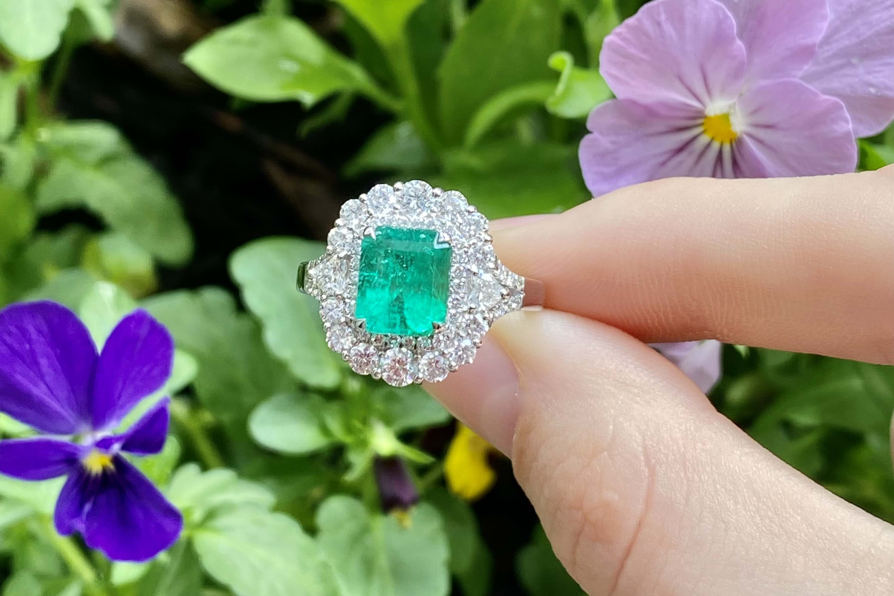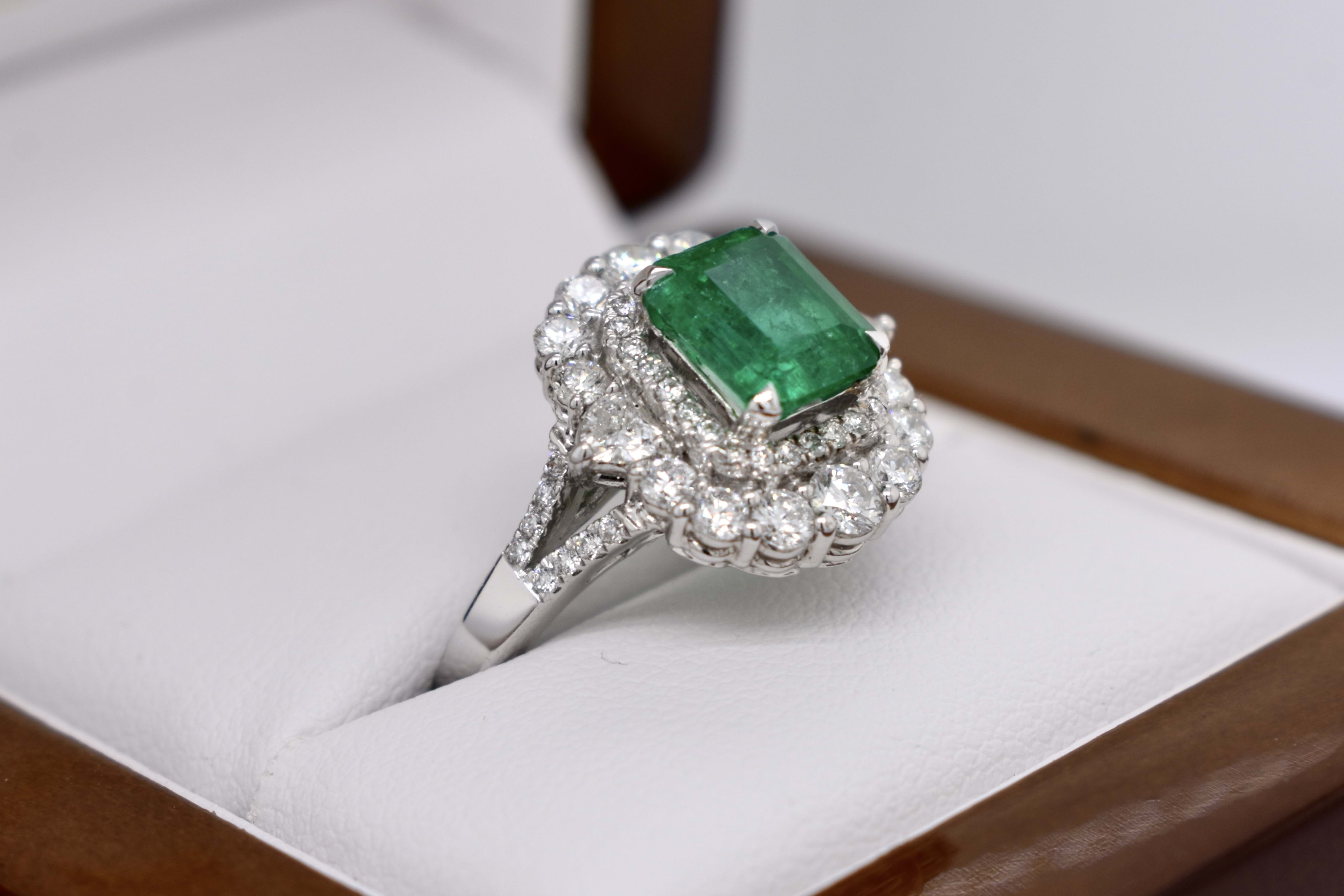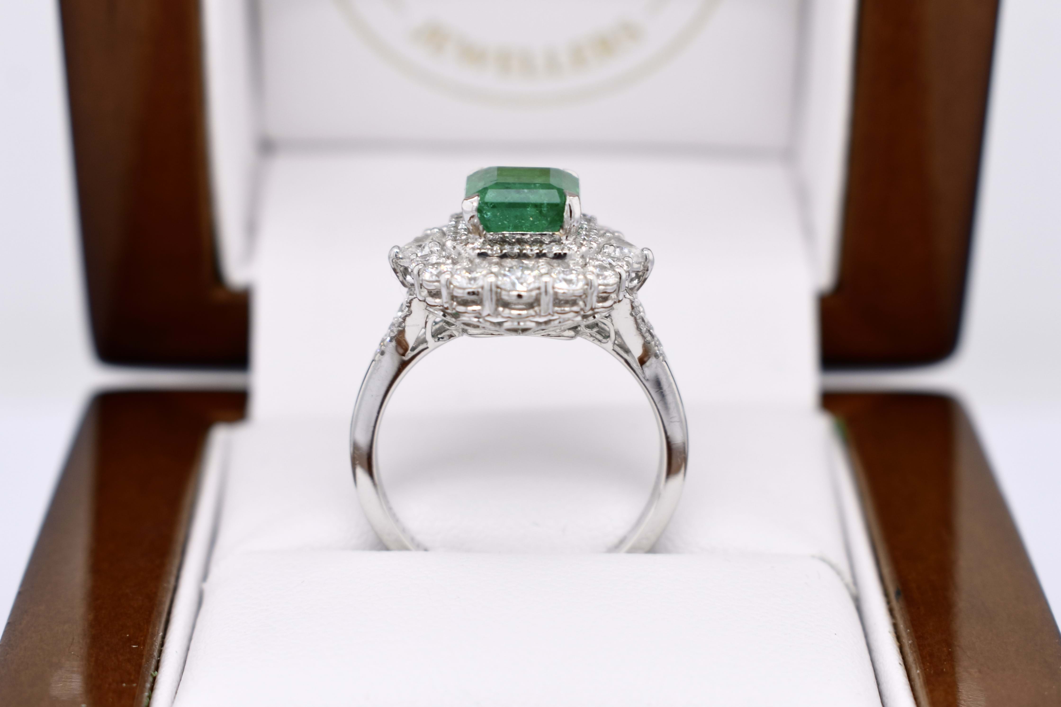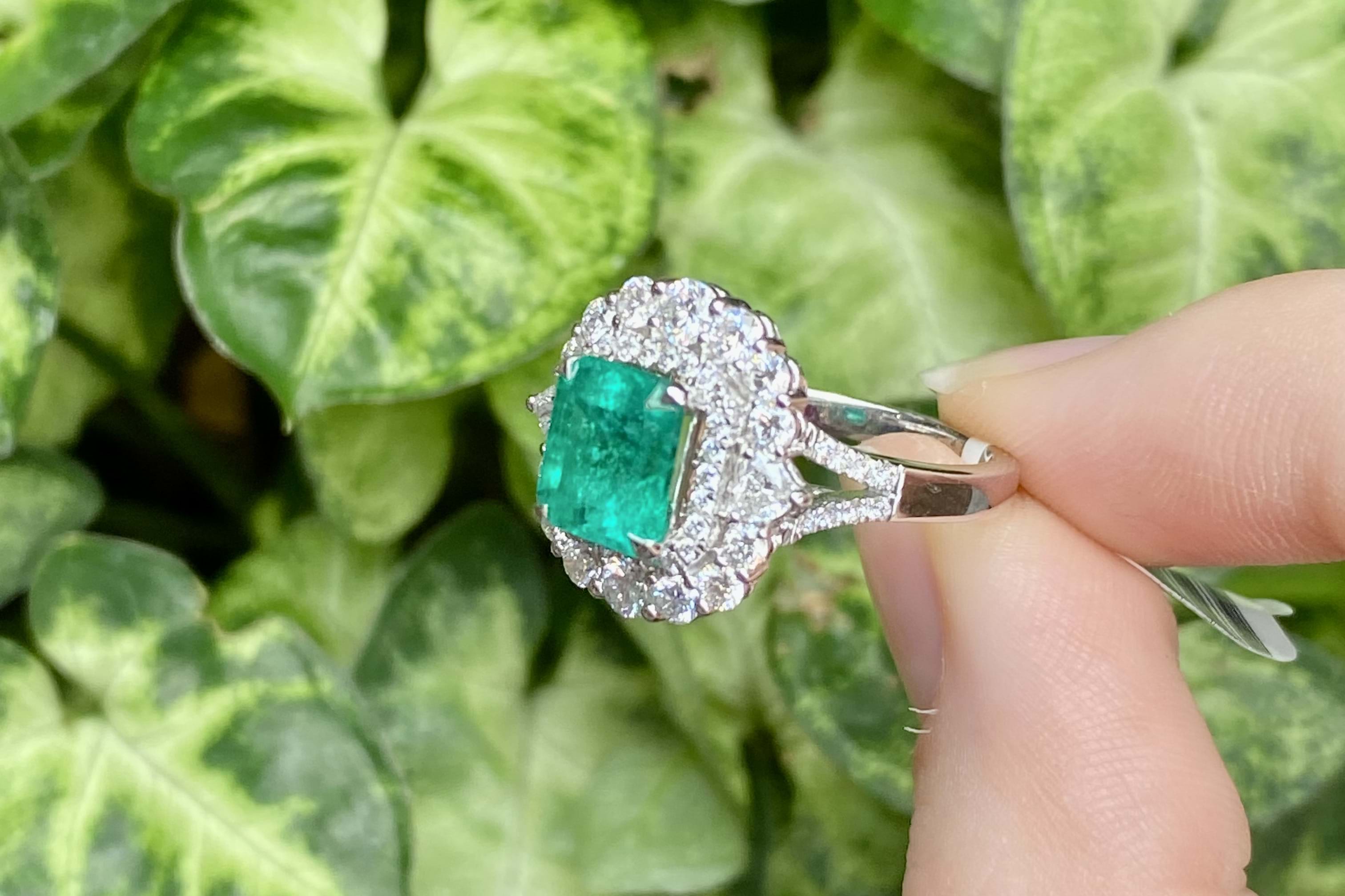 A bright and elegant ring, crafted in 18ct white gold featuring a 1.80ct emerald cut shaped Columbian emerald, in four claws with a double halo. The emerald is GRS certified and comes with GRS report. Surrounded by 56 twinkling round brilliant cut diamonds in the halo and continuing down the band, totalling 0.89ct FG VS-SI, with a cute heart shaped diamond each side, two hearts totalling 0.18ct. Total diamond weight 1.07ct FG VS-SI. Completed with a split tapering band. Finger size M. Approx. valuation of $29,000. Independent valuation provided upon purchase.