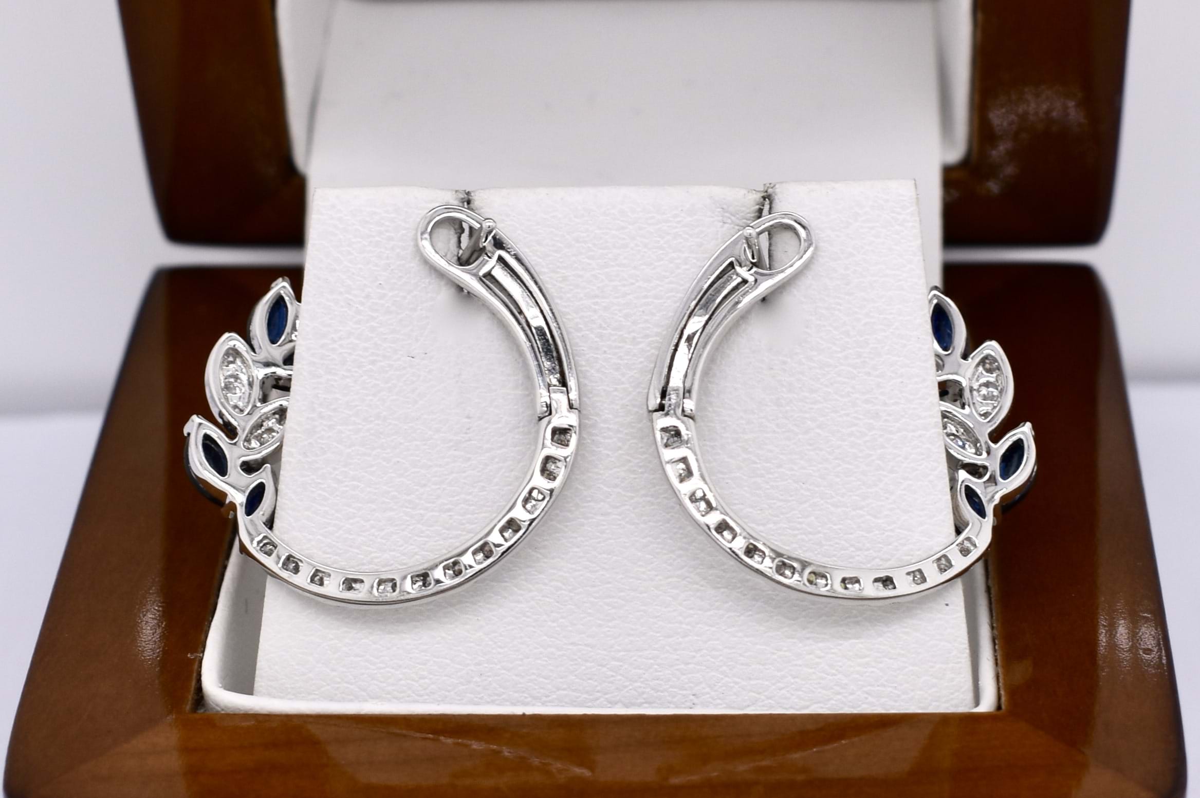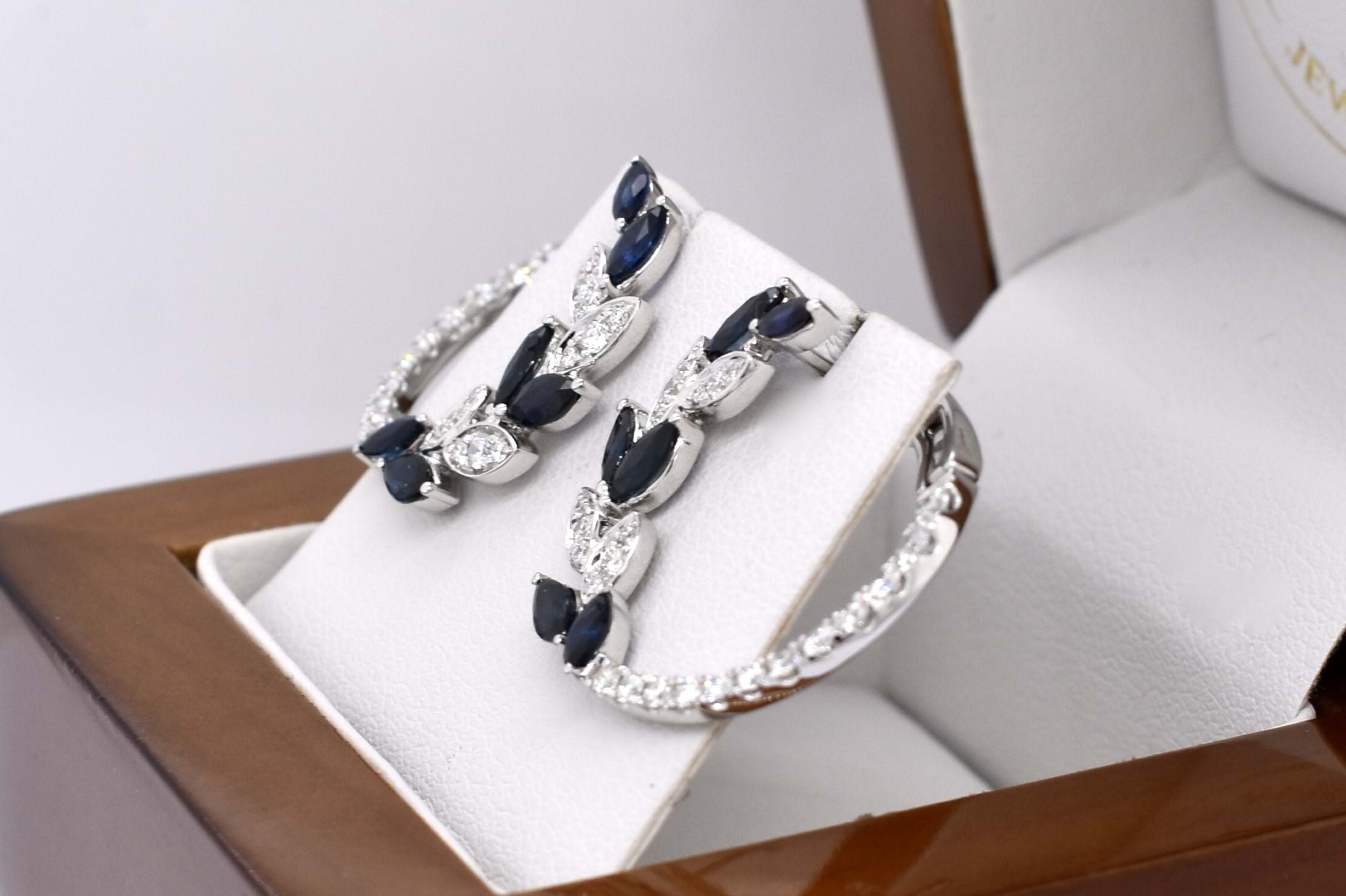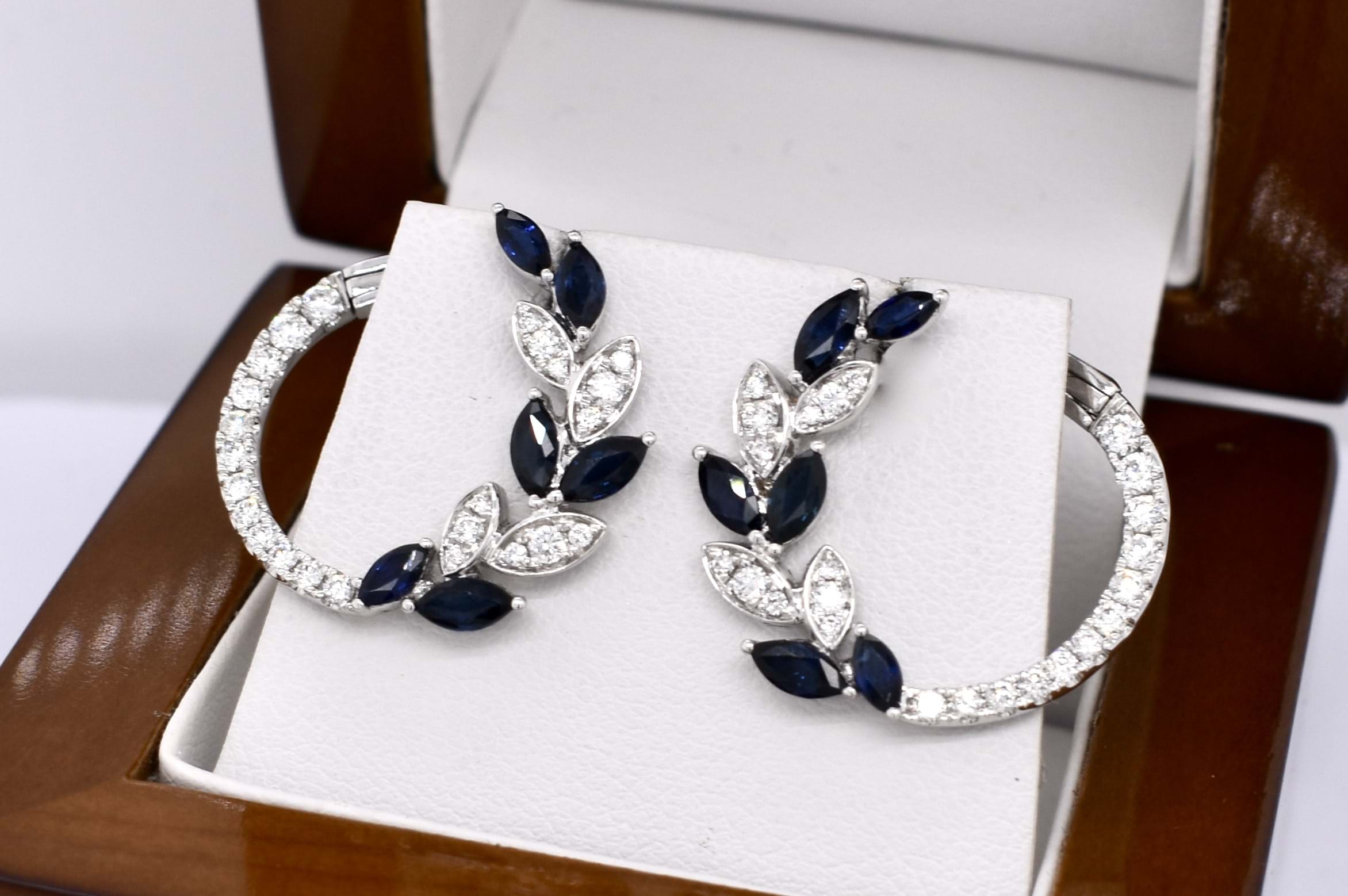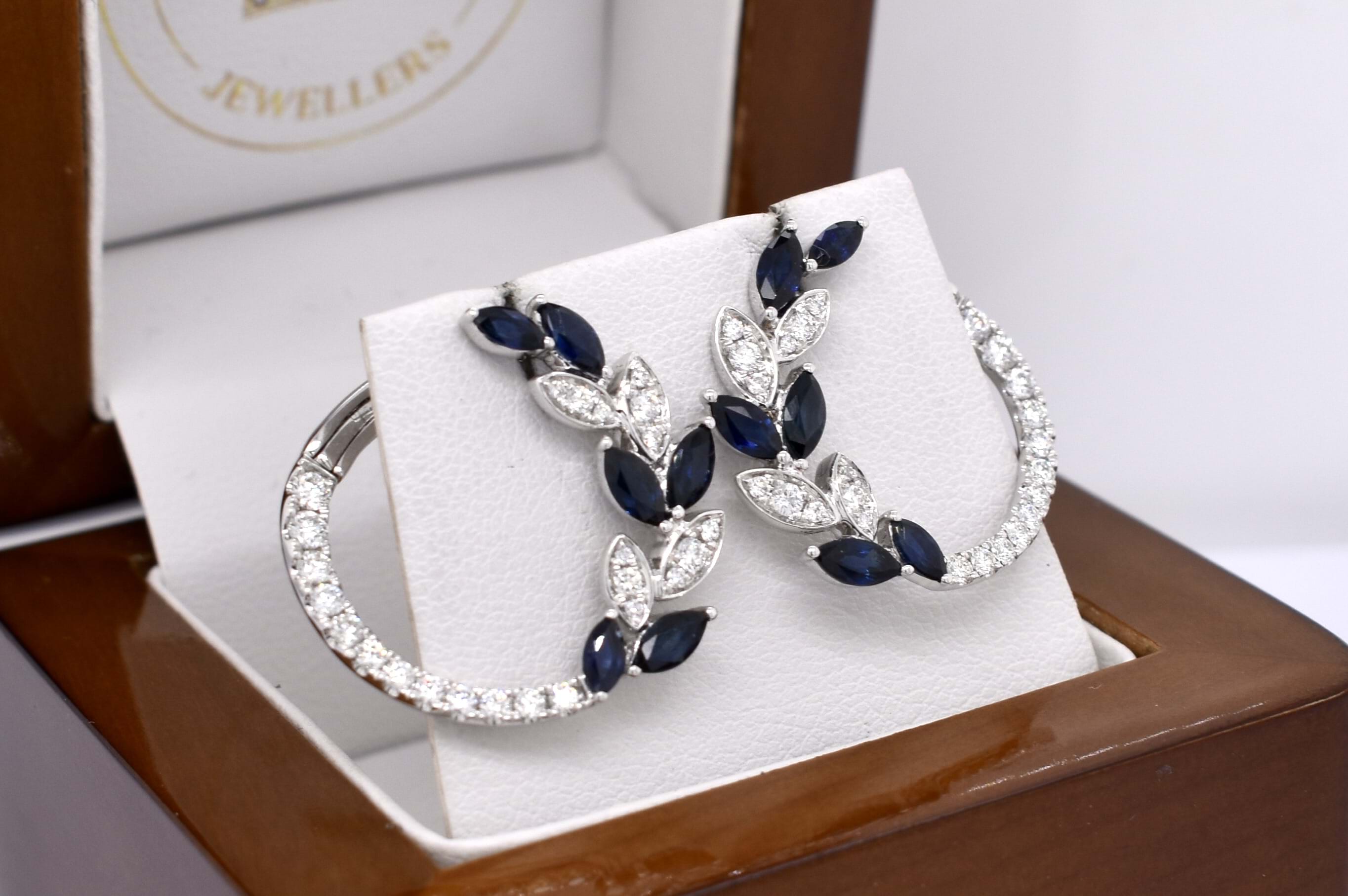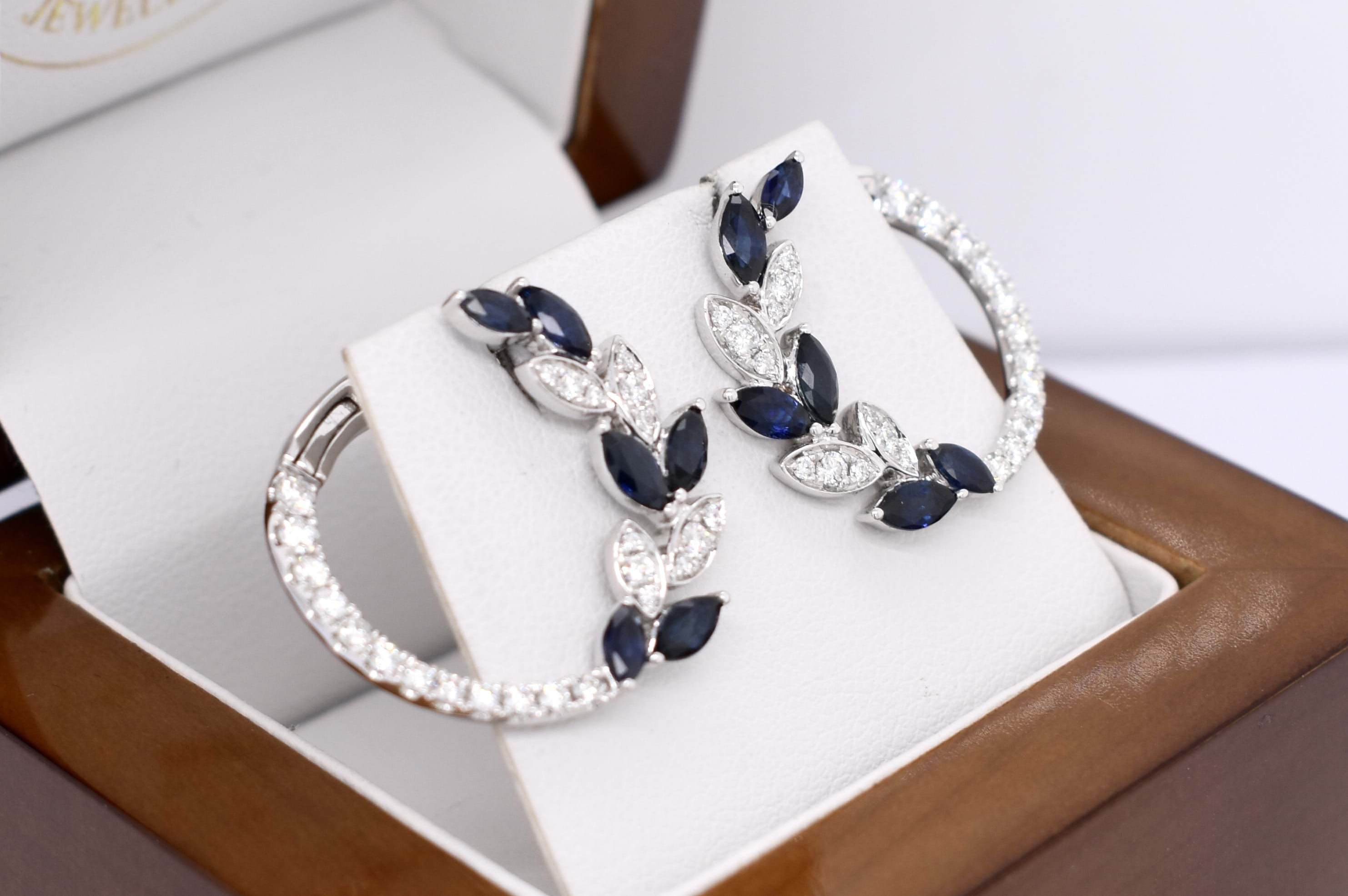 Crafted in 18ct white gold, these insanely beautiful circular hoop earrings feature 12 marquise shaped bright deep blue sapphires totalling 1.82ct. The sapphires measure 4.70x2.25-3.80x2.00mm. Earrings also contain 48 round brilliant cut diamonds, grain set in marquise shapes and continuing around the hoop. Total diamond weight of 0.73ct GH SI-P1. Completed with post and hinged clip fittings. Independent Valuation Supplied.