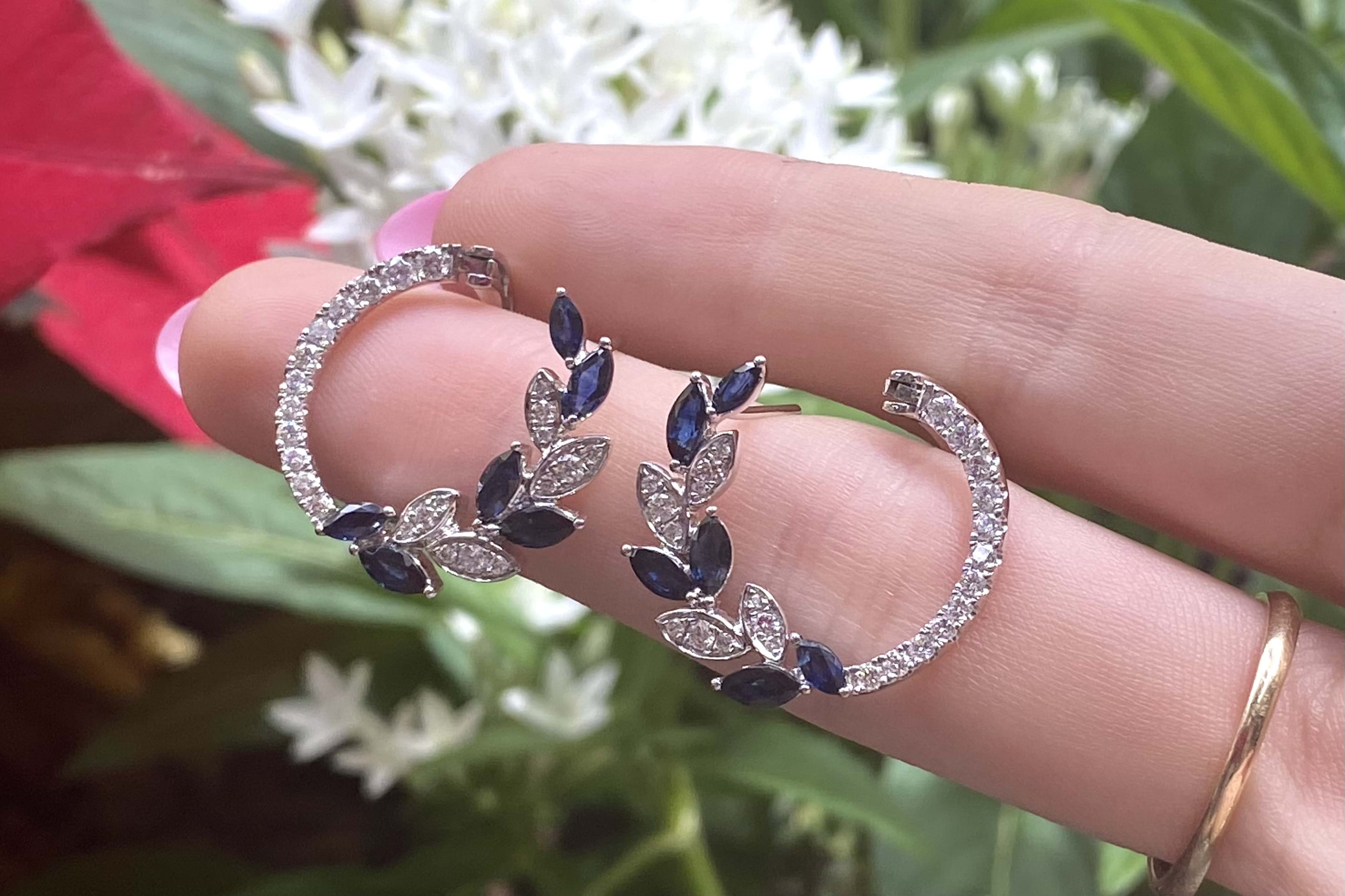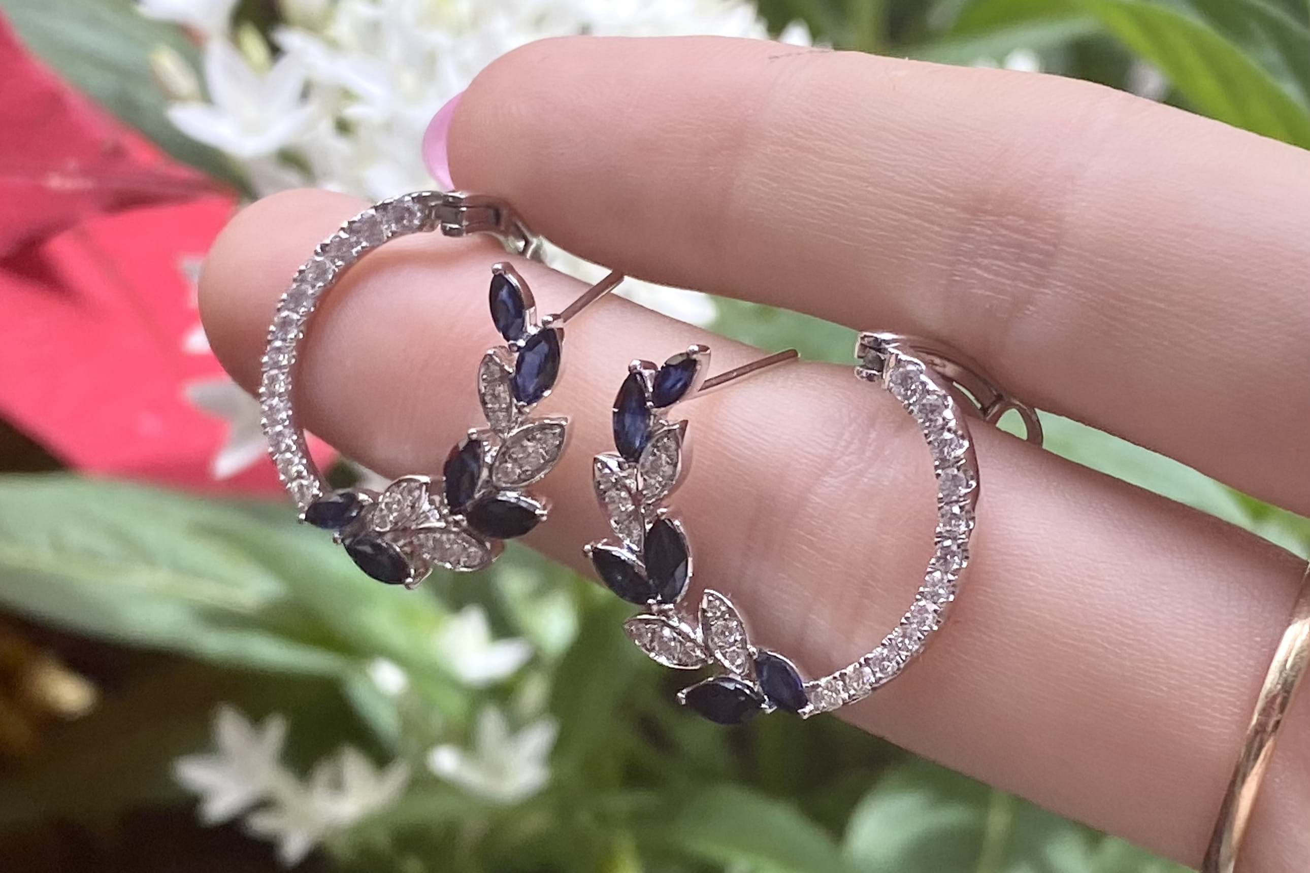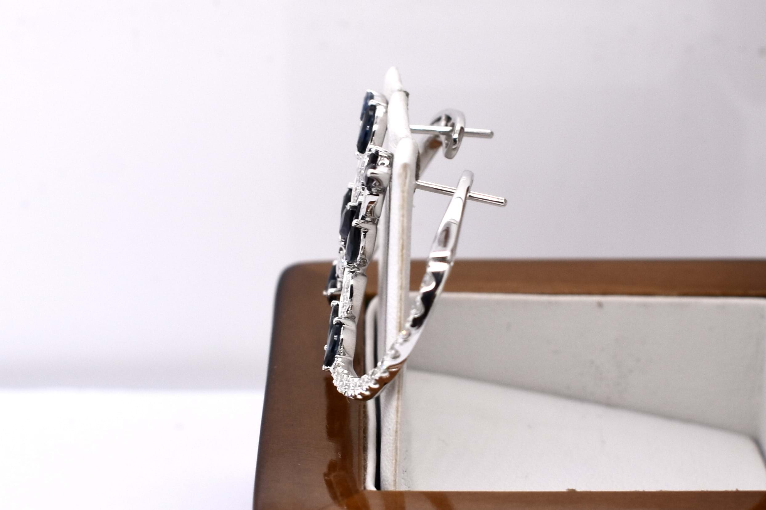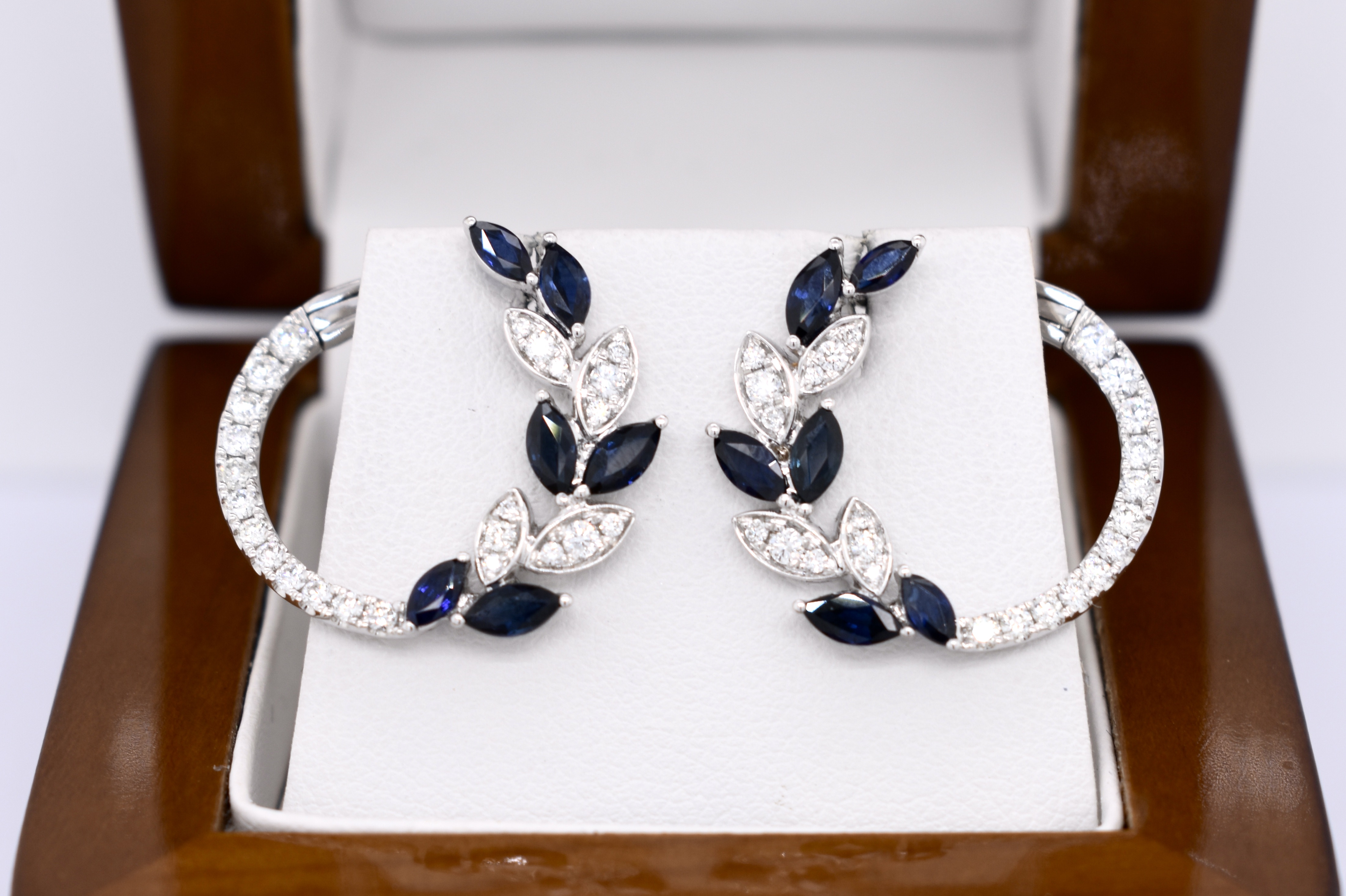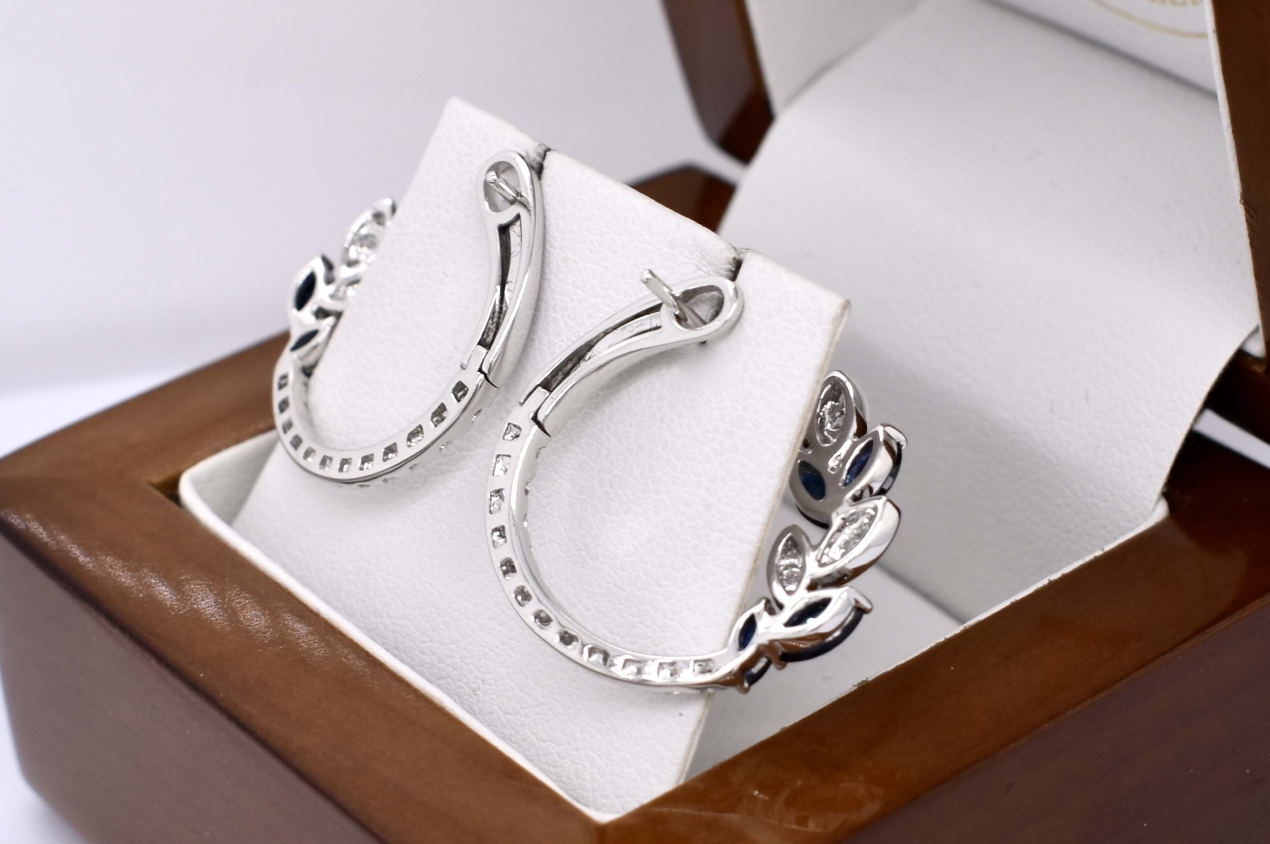 Crafted in 18ct white gold, these insanely beautiful circular hoop earrings feature 12 marquise shaped bright deep blue sapphires totalling 1.82ct. The sapphires measure 4.70x2.25-3.80x2.00mm. Earrings also contain 48 round brilliant cut diamonds, grain set in marquise shapes and continuing around the hoop. Total diamond weight of 0.73ct GH SI-P1. Completed with post and hinged clip fittings. Independent Valuation Supplied.