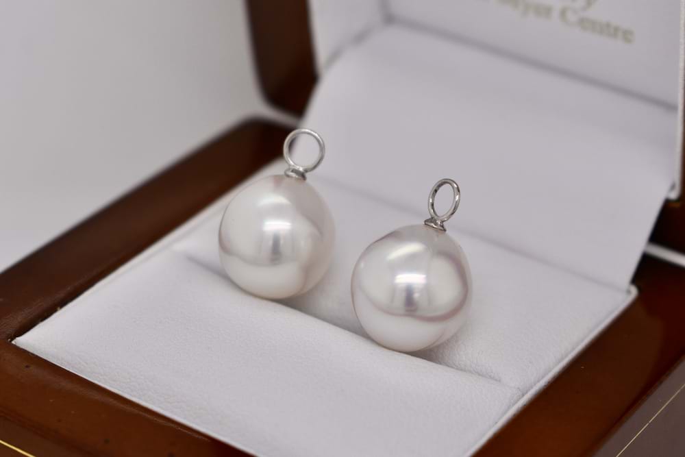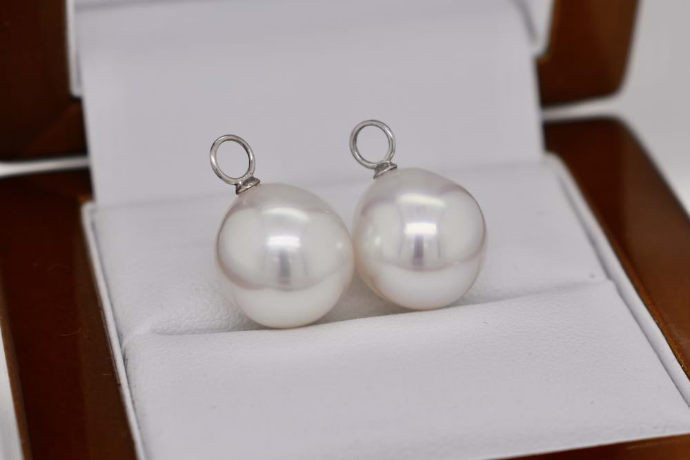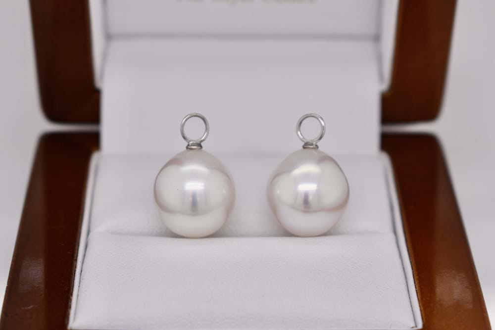 These 18ct white gold earring enhancers feature a pair of lovely South Sea pearls measuring 11.8mm with a good lustre, clean skin and are pink/white in colour. They look stunning when suspended from diamond huggies, this pair is displayed with 20257668 which are available for separate purchase. Independent valuation supplied
