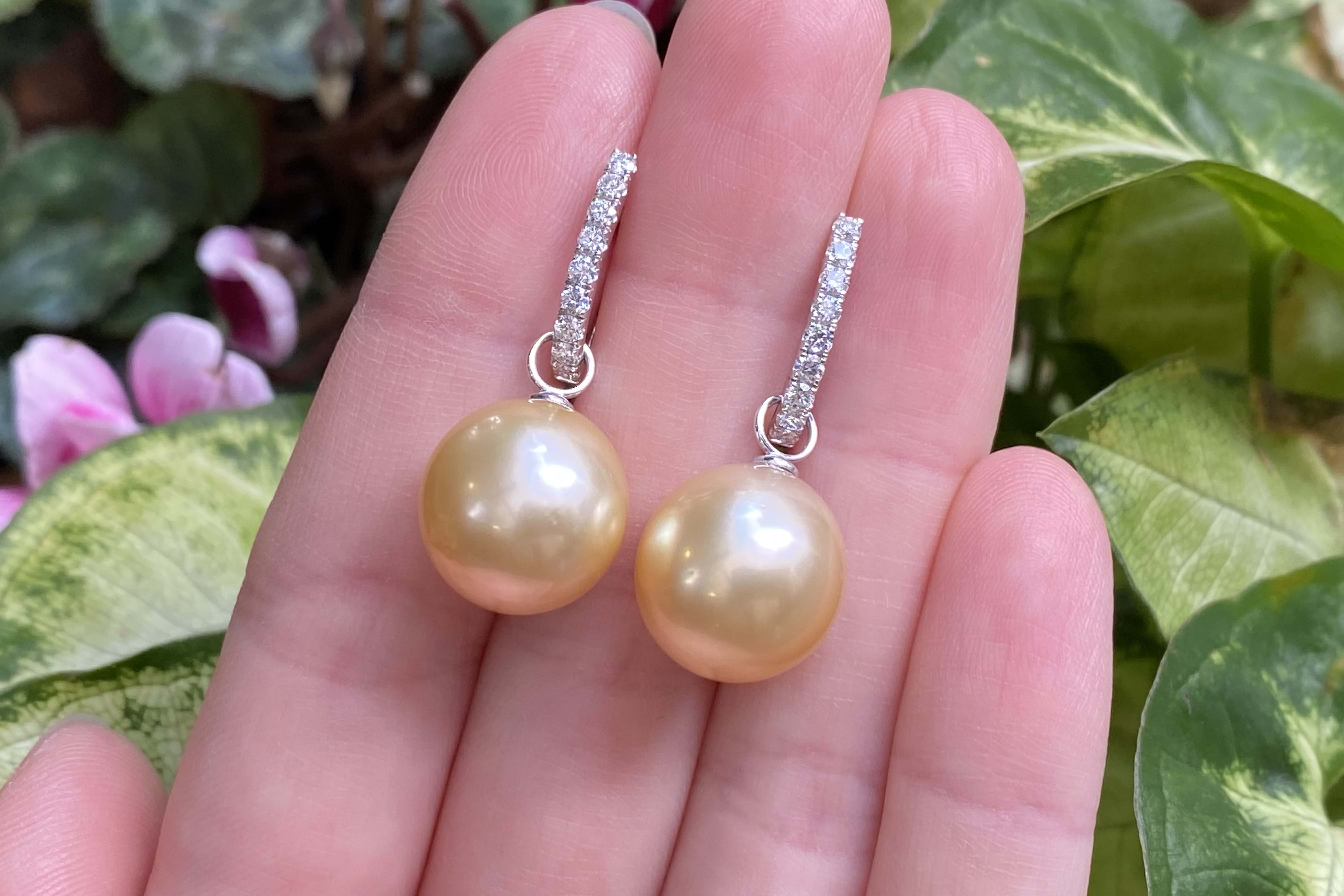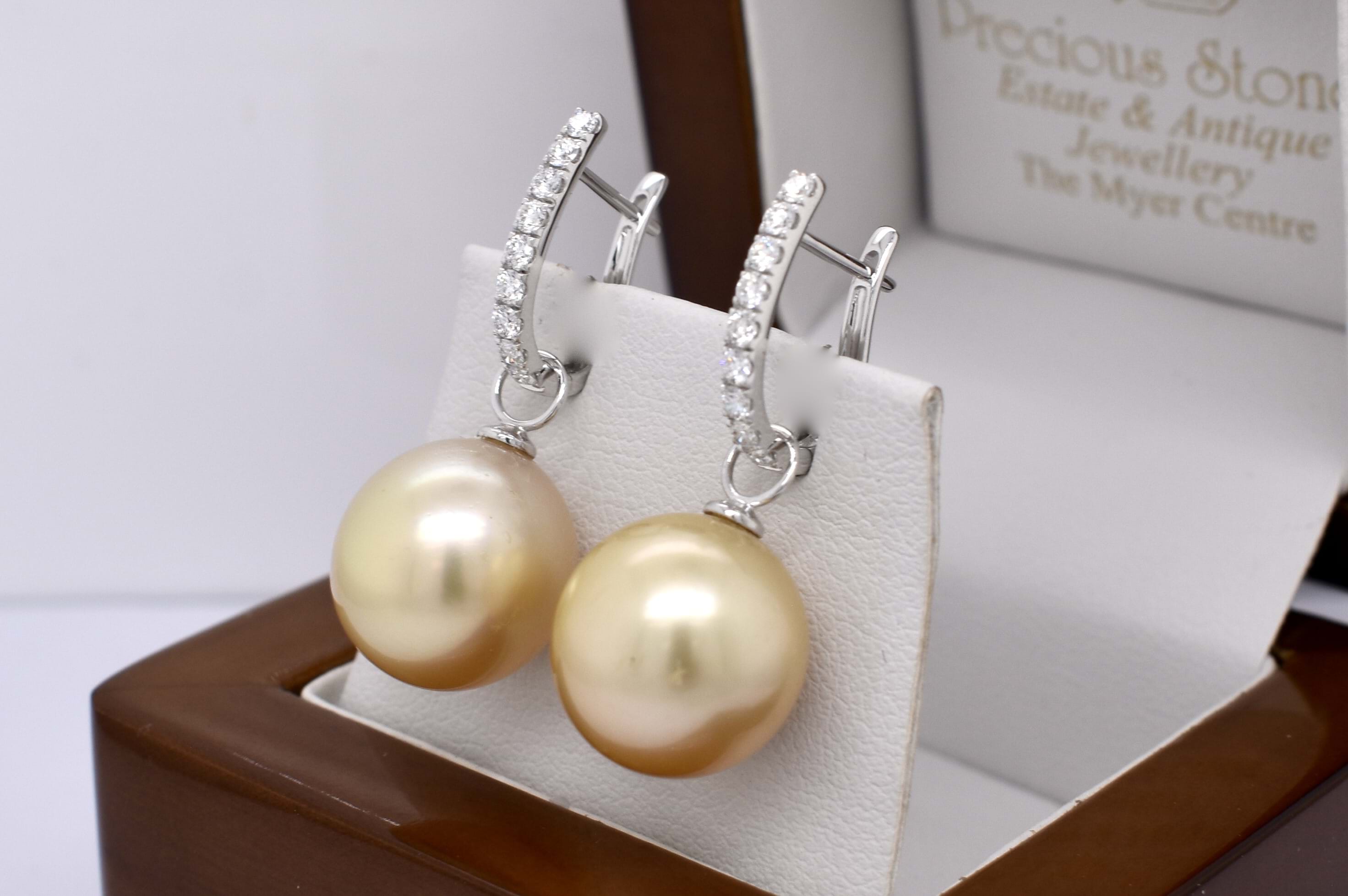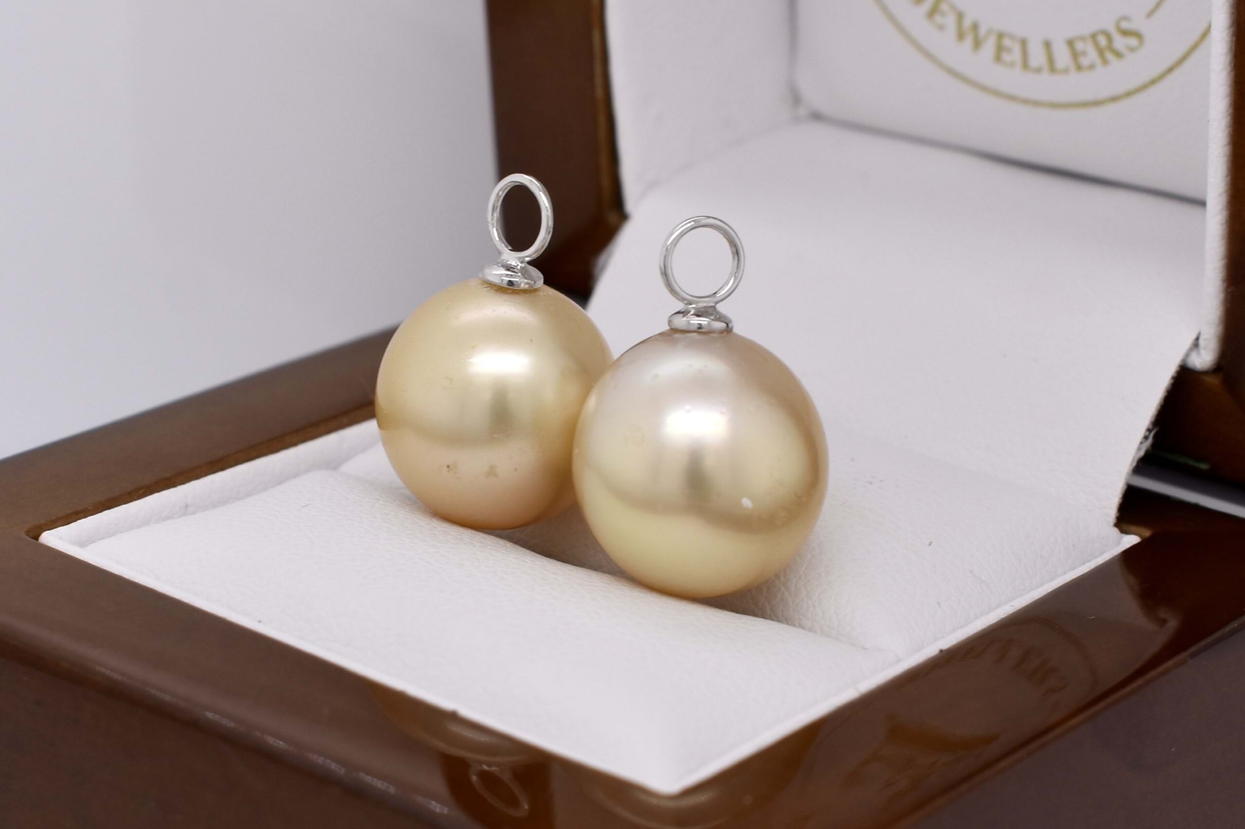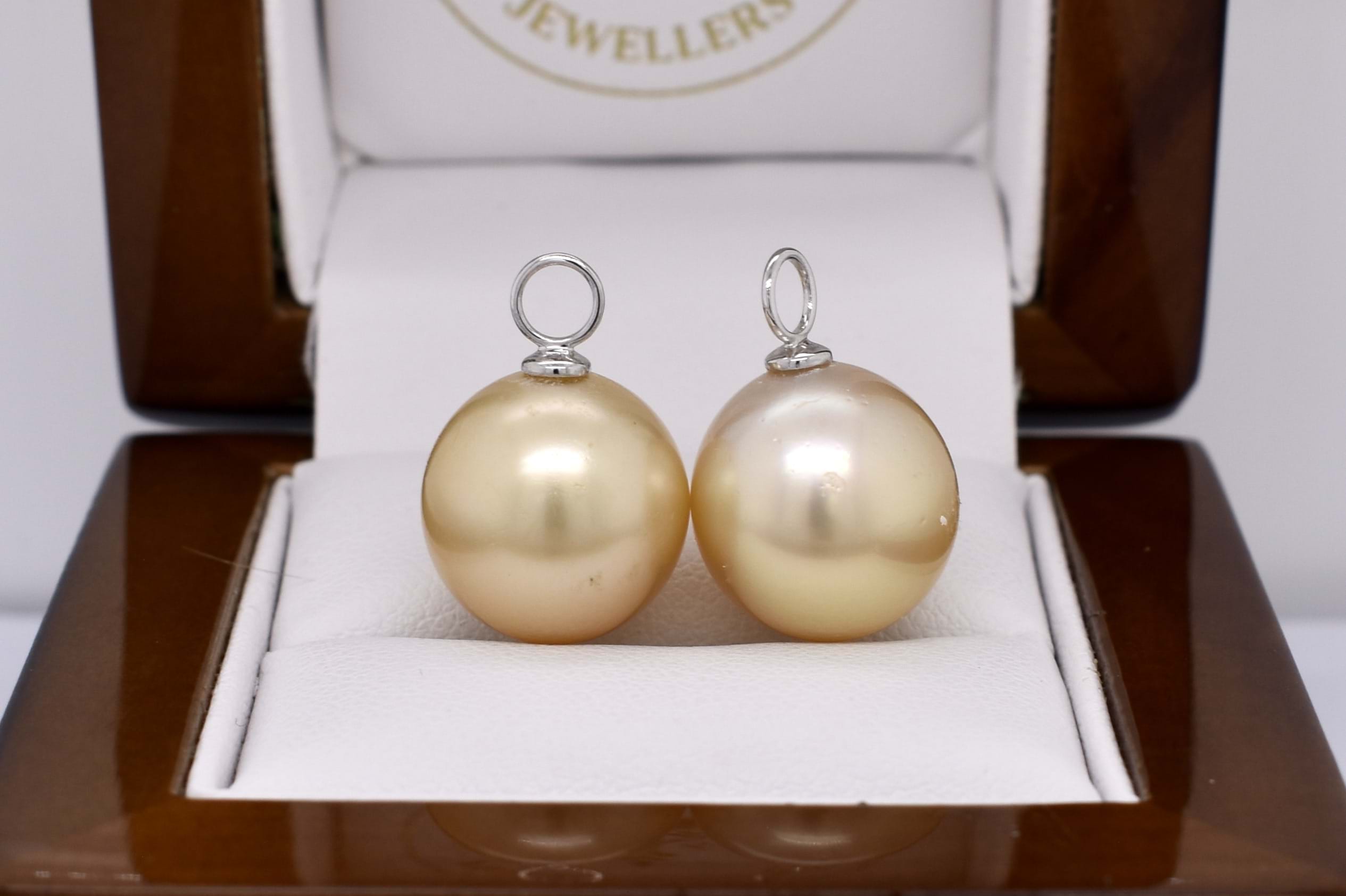 A versatile and elegant pair of near round 13-13.50mm golden south sea pearls, with 18ct white gold cap and ring fittings perfect to suspend from diamond huggies. Pearls independently graded as: near round, mid gold hue, with good lustre and very slight blemish. Independent Valuation Supplied.