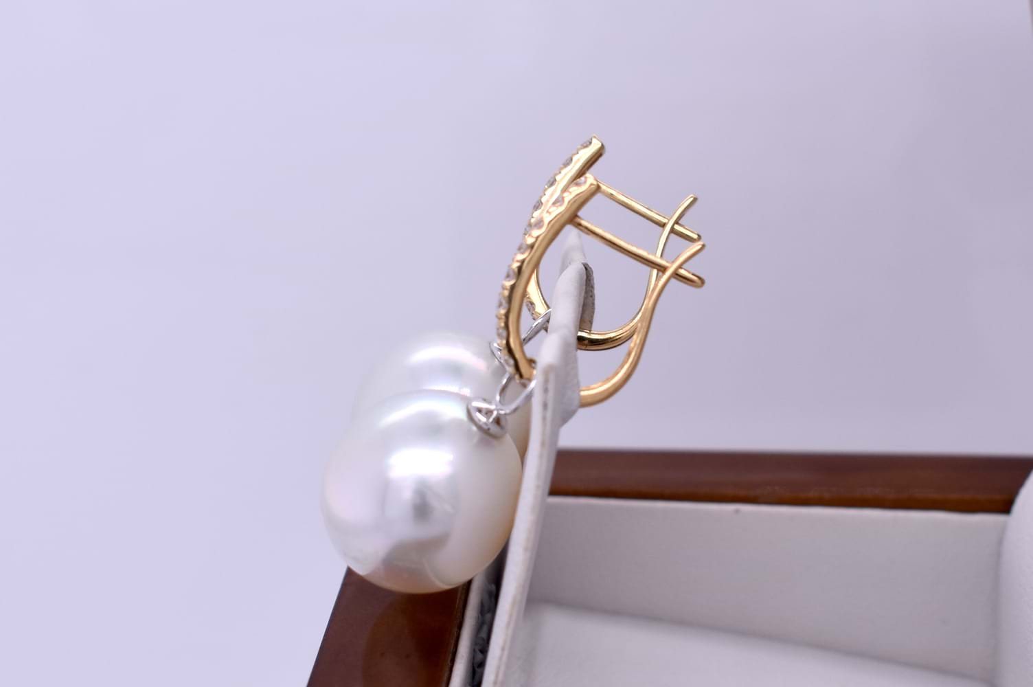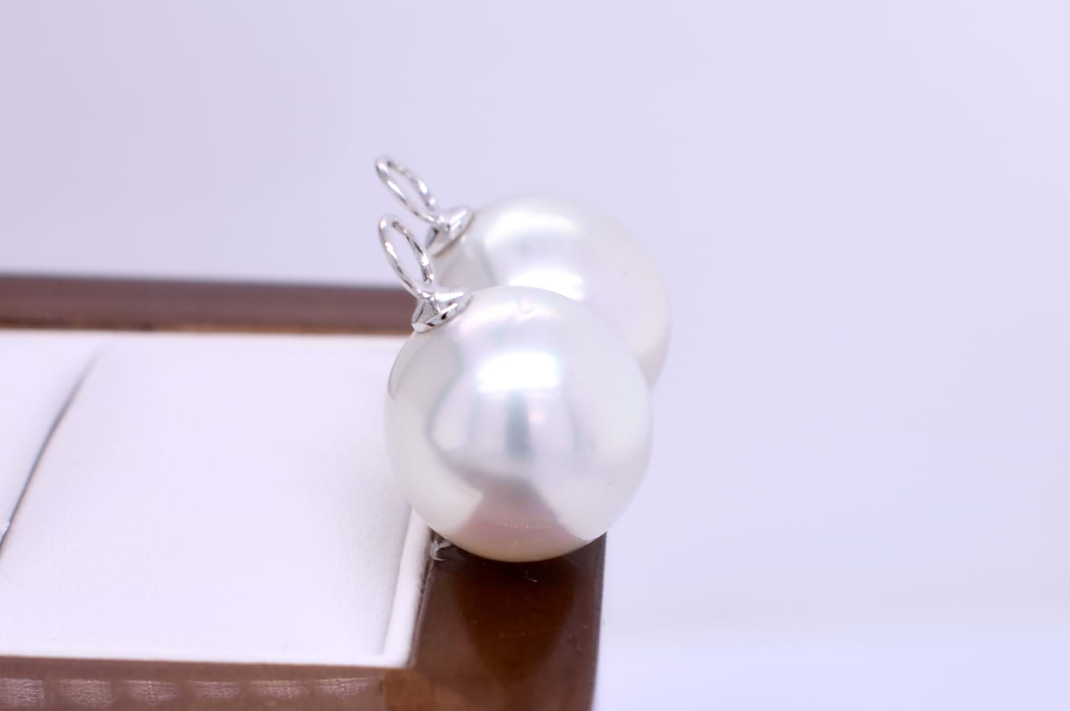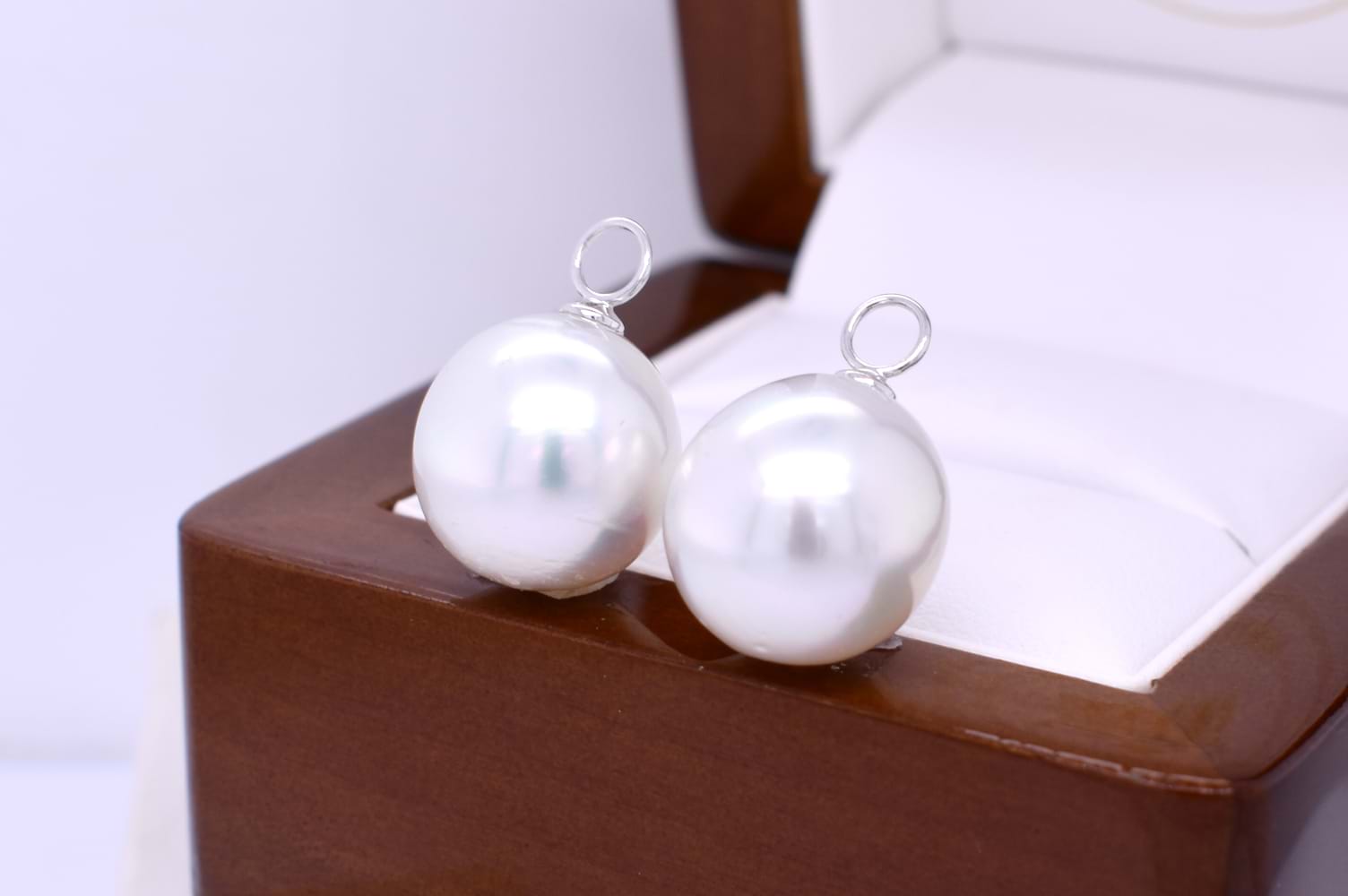 A simple and elegant pair of semi round 13.52-13.42mm south sea pearls with 18ct white gold cap and ring fittings perfect to suspend from diamond huggies. Pearls independently graded as: oval, good lustre, pink/white hue, moderately blemished. Independent Valuation Supplied. Diamond huggies pictured are available for separate purchase.