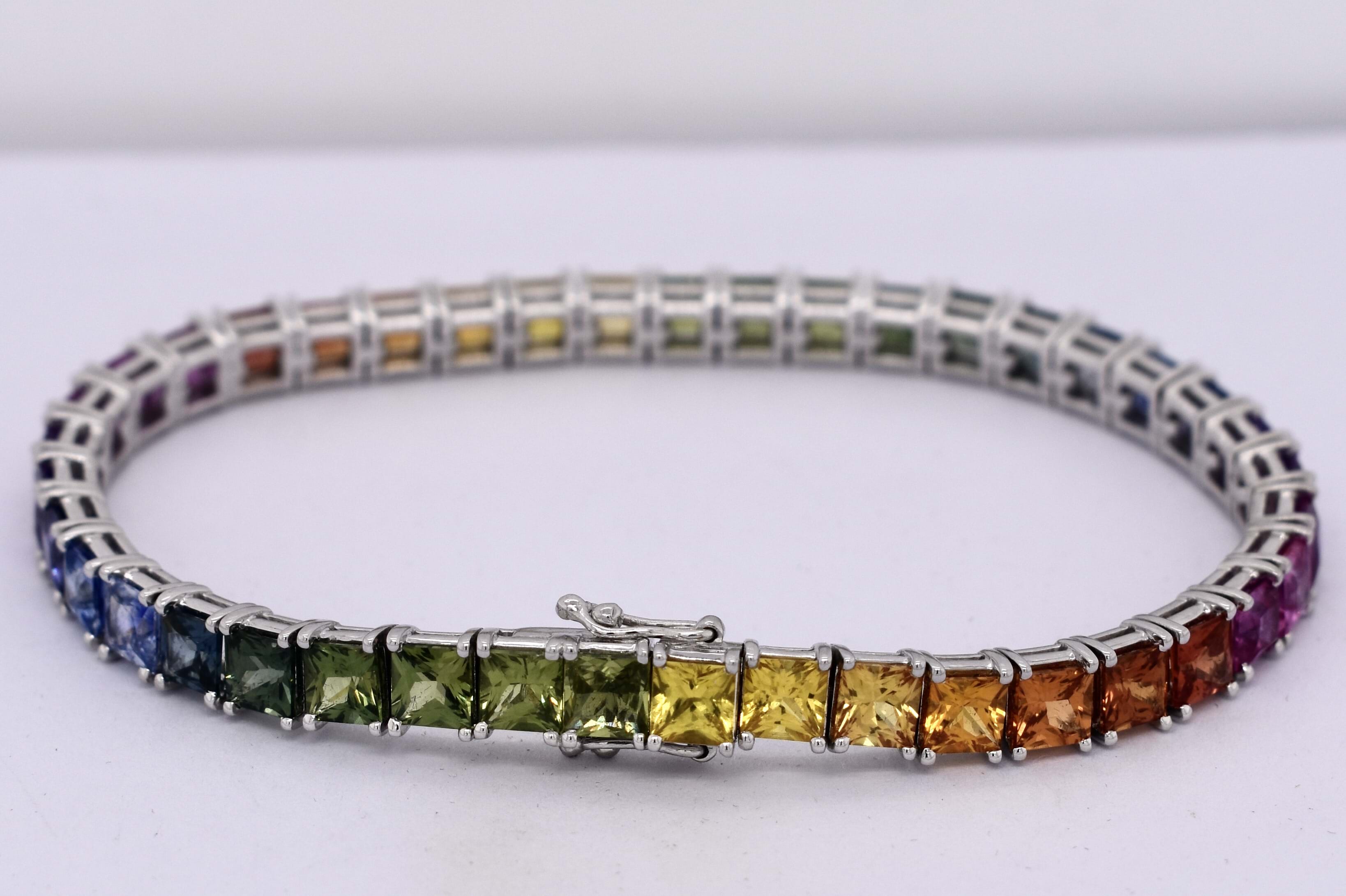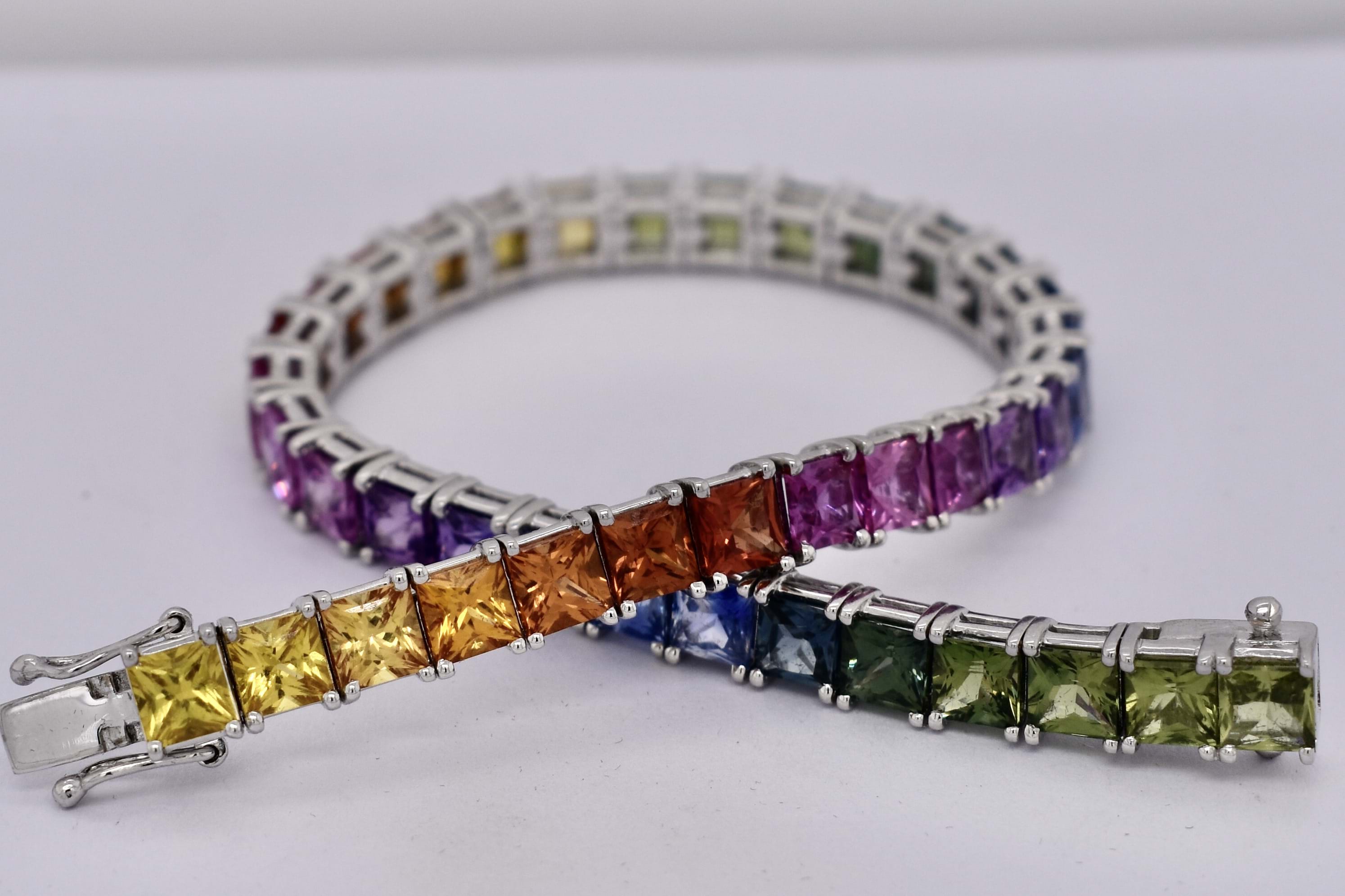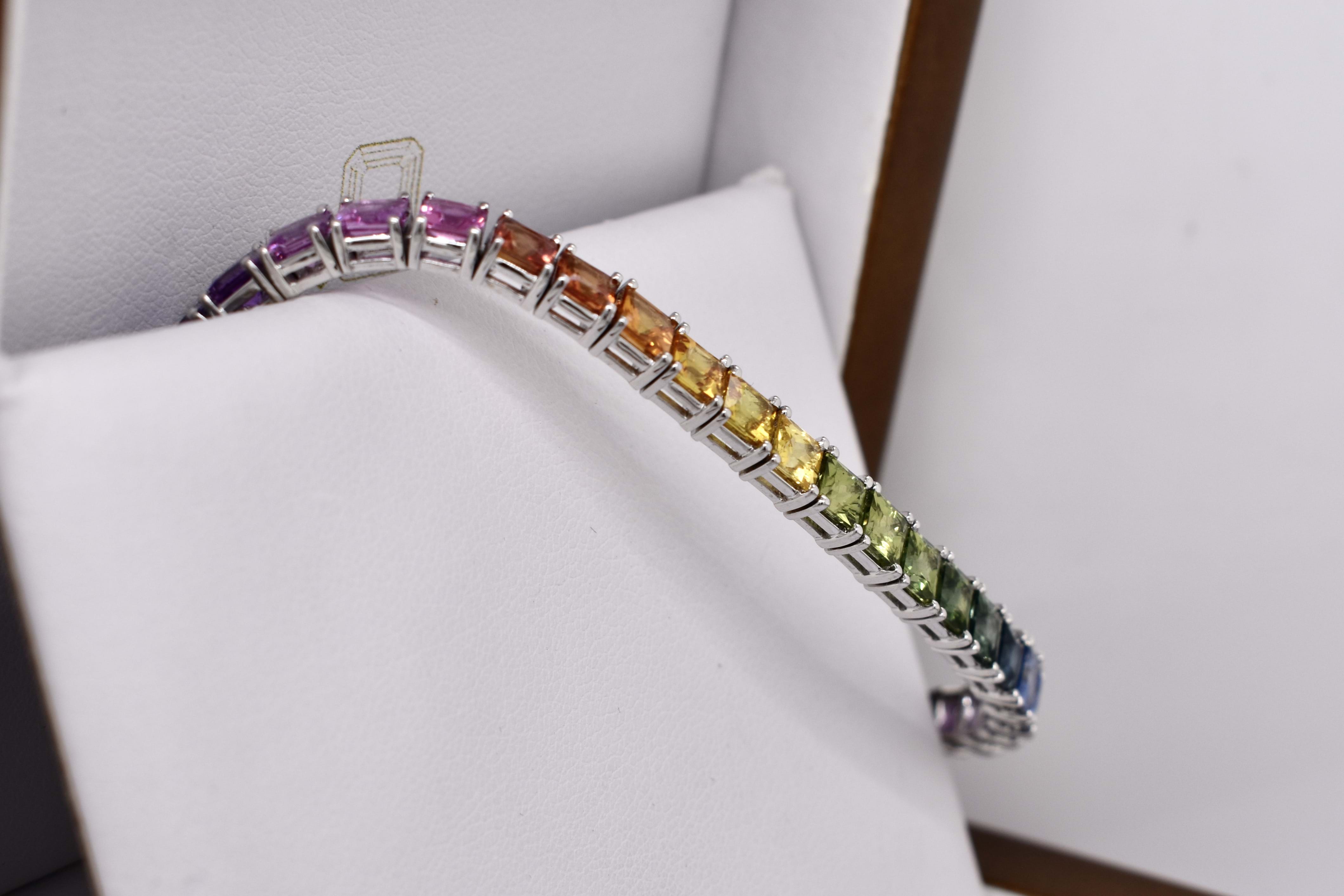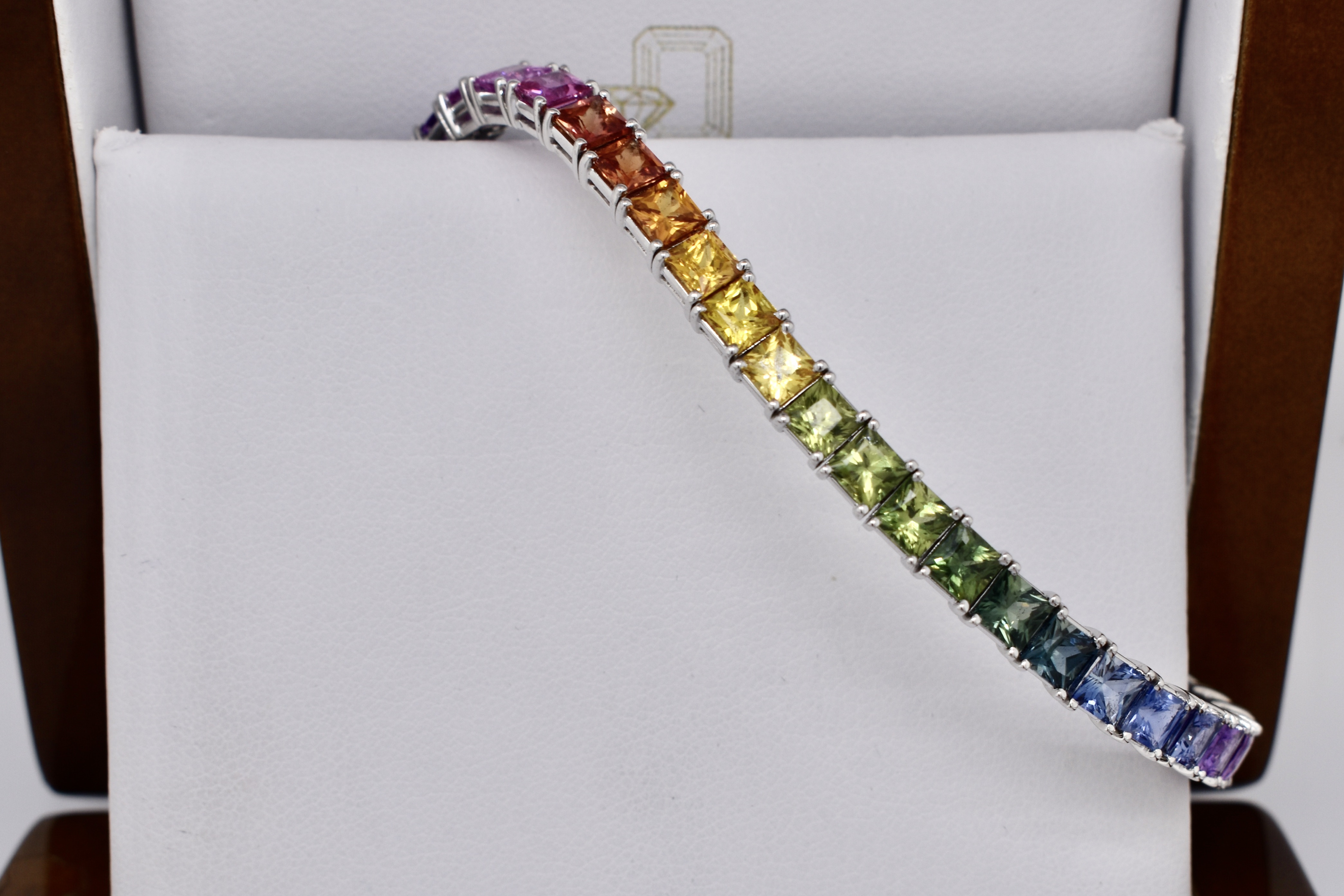 This beautiful bright multicoloured rainbow gradient sapphire bracele4t is crafted in 18ct white gold and is set with 41 princess cut sapphires, measuring 4.0-4.2mm. Including yellow, orange, pink, purple, blue and green with a total carat weight of 18.79ct. All of the stones are excellent cuts and eye clean and the bracelet is finished with an integrated box clasp and two figure 8s. Length 18.3cm. 20.92 grams. Independent valuation supplied.