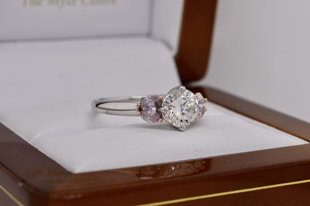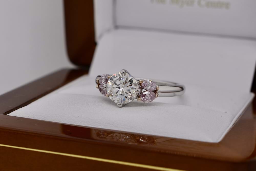A shimmering 1.00ct round brilliant cut diamond (GH/VS1) six claw set into an 18ct white gold collet with two blush pink marquise shape diamonds flanked on each side. The four natural pink diamonds total 0.33cts and are independently graded as Fancy Light Purplish Pink SI-P2 set into rose gold claws with the band continuing in 18ct white gold. Finger size M+ Independent Valuation Supplied