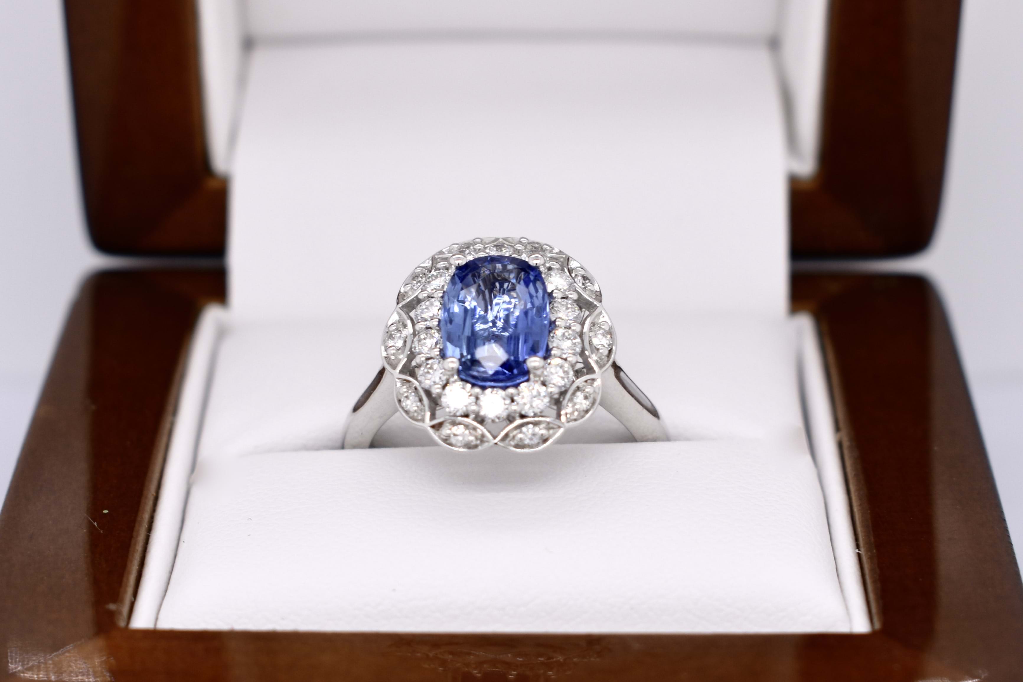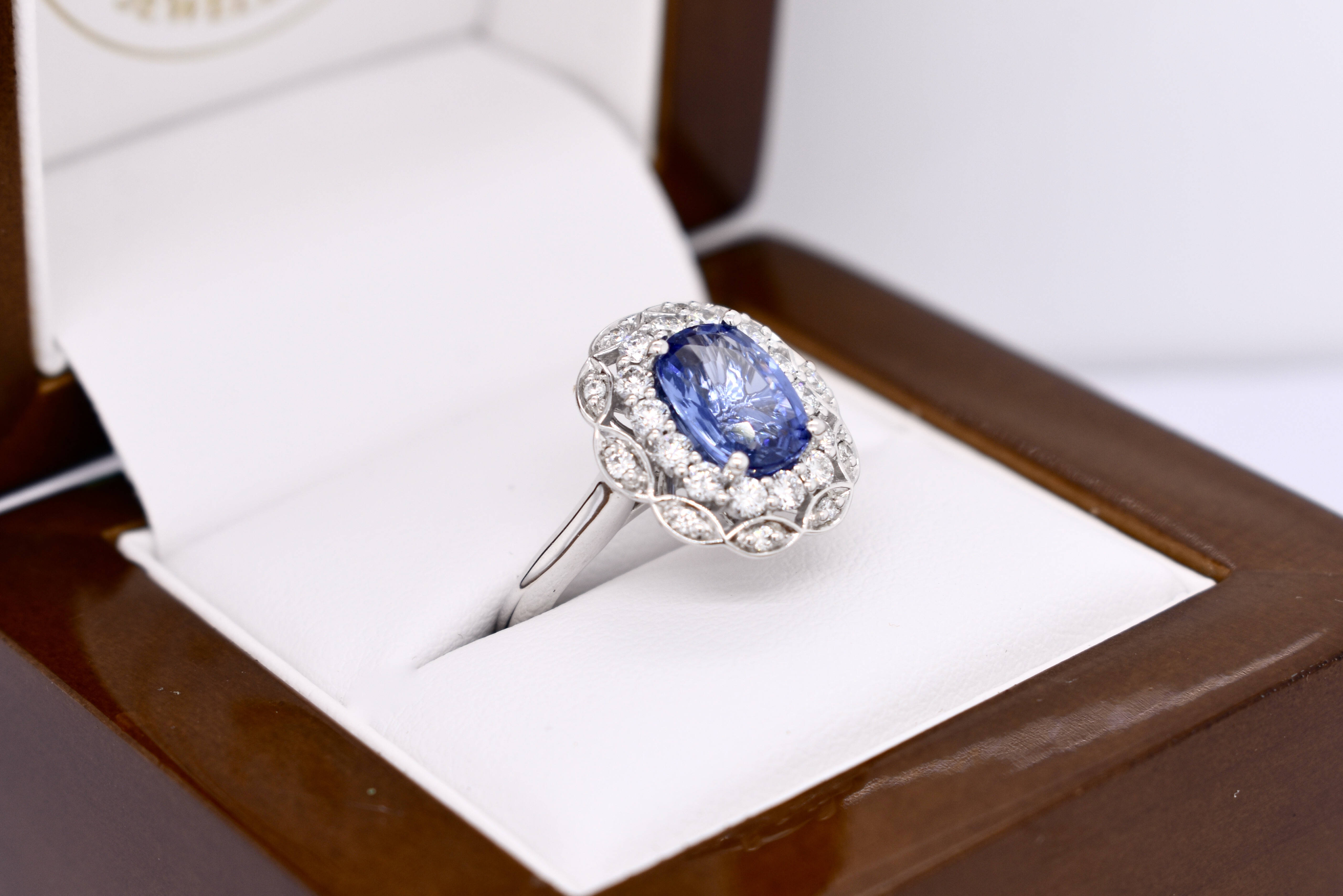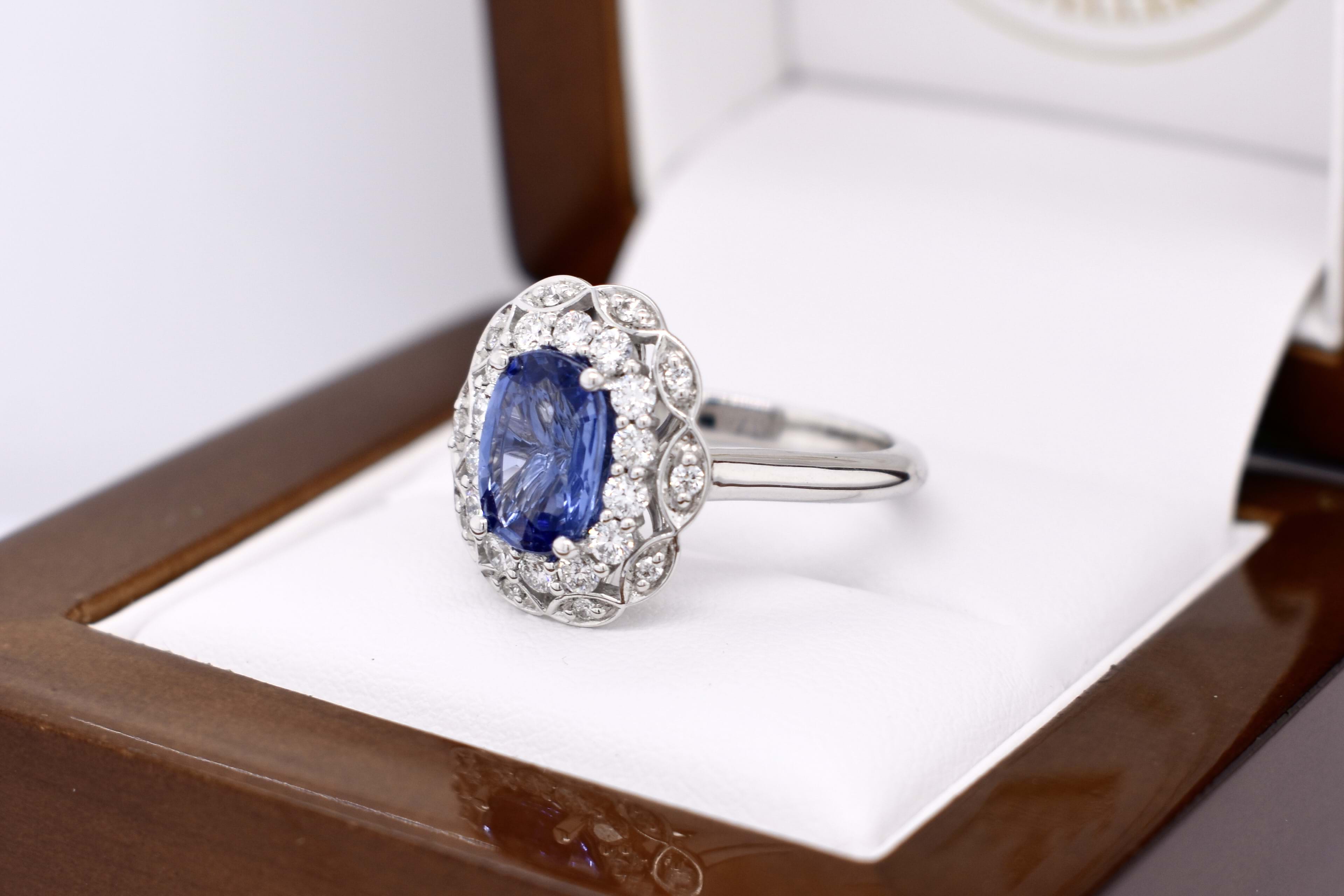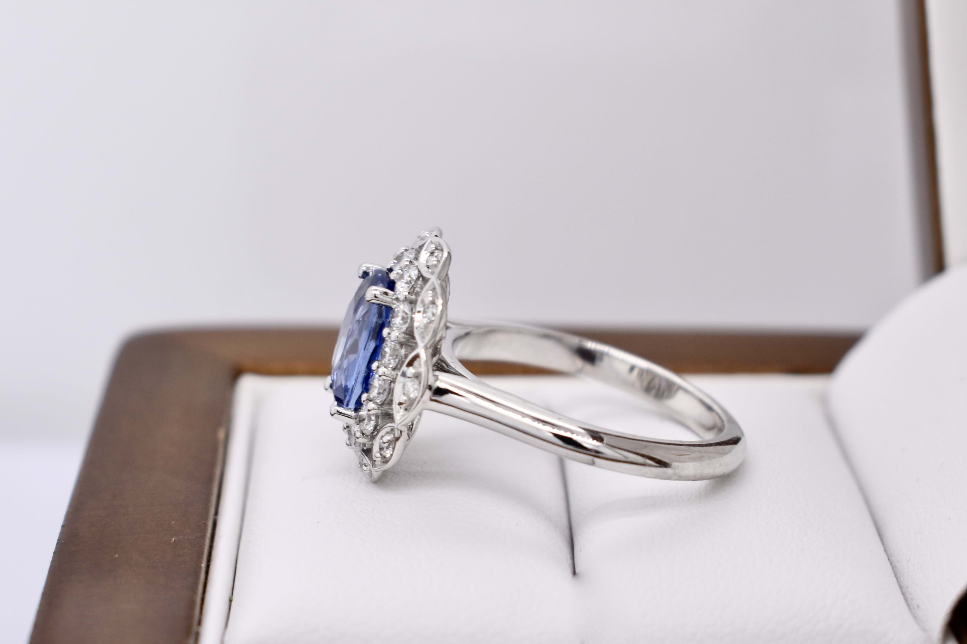 This fabulous fancy halo ring features a central blue oval Ceylon sapphire of 1.15ct, four claw set, with a halo of round brilliant cut diamonds, further marquise shaped grain set with another halo of round brilliant cut white diamonds. With a total of 24 diamonds totalling 0.22ct G SI, crafted in 18ct white gold with a plain band. Finger size N. Independent Valuation available upon purchase.