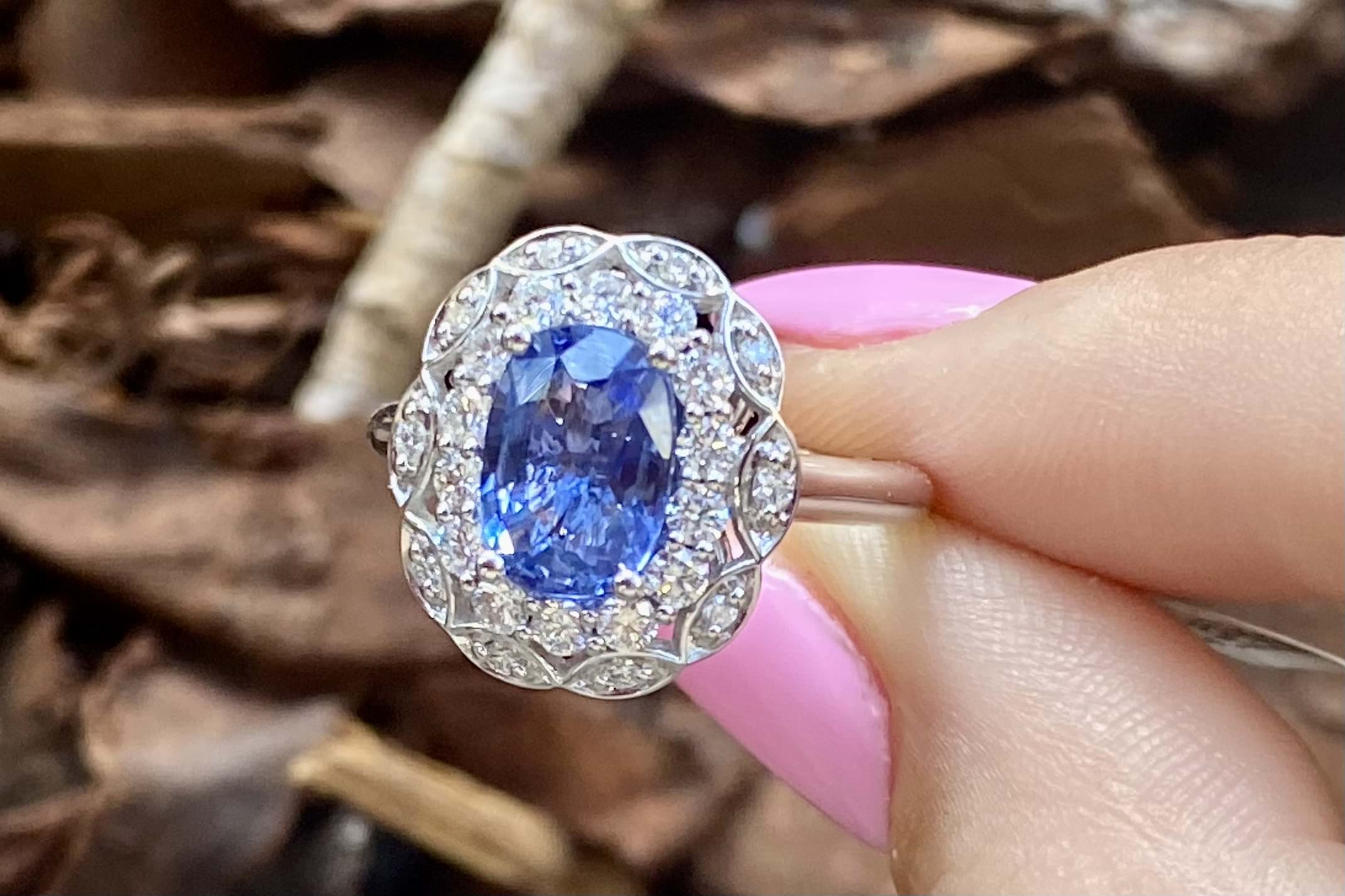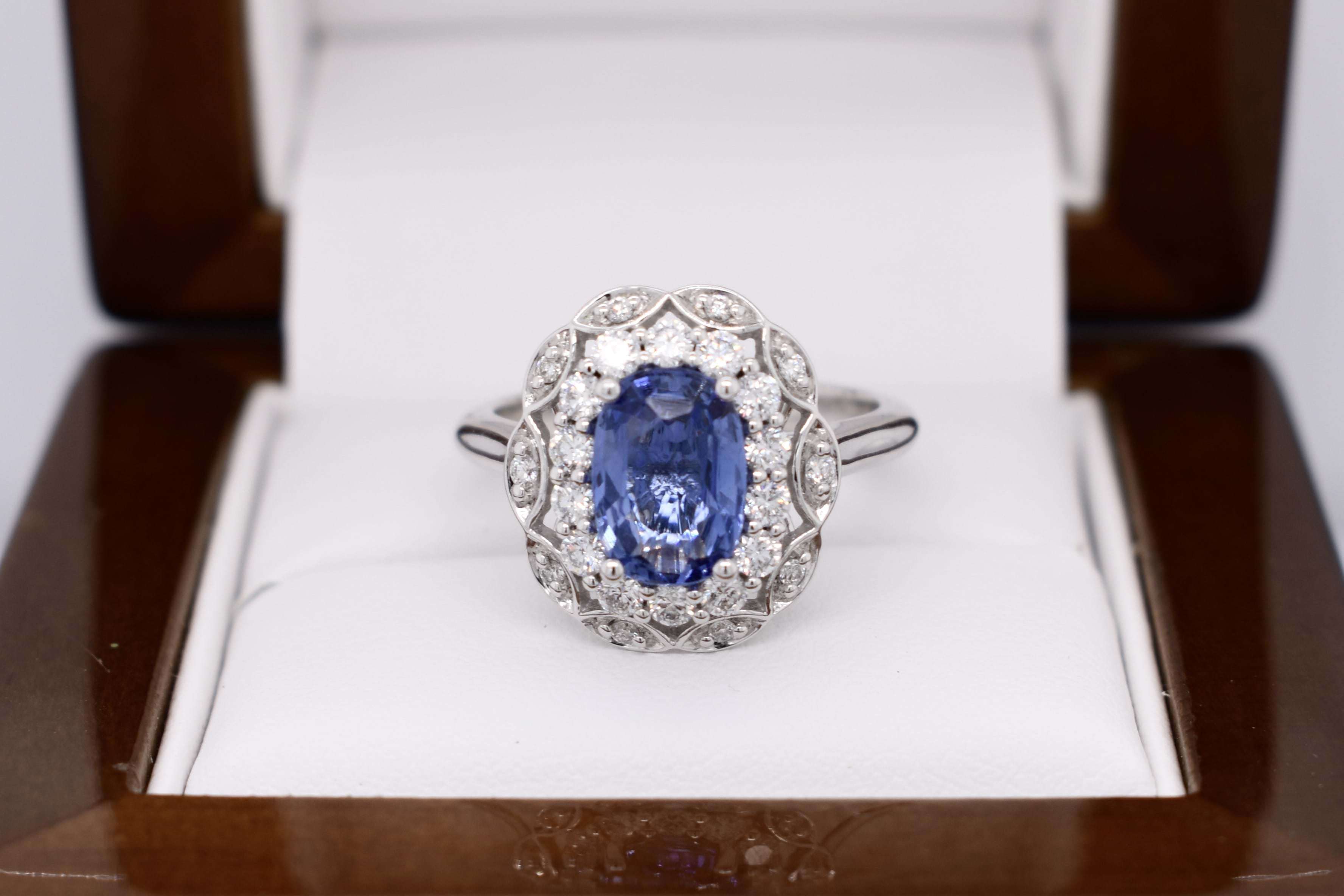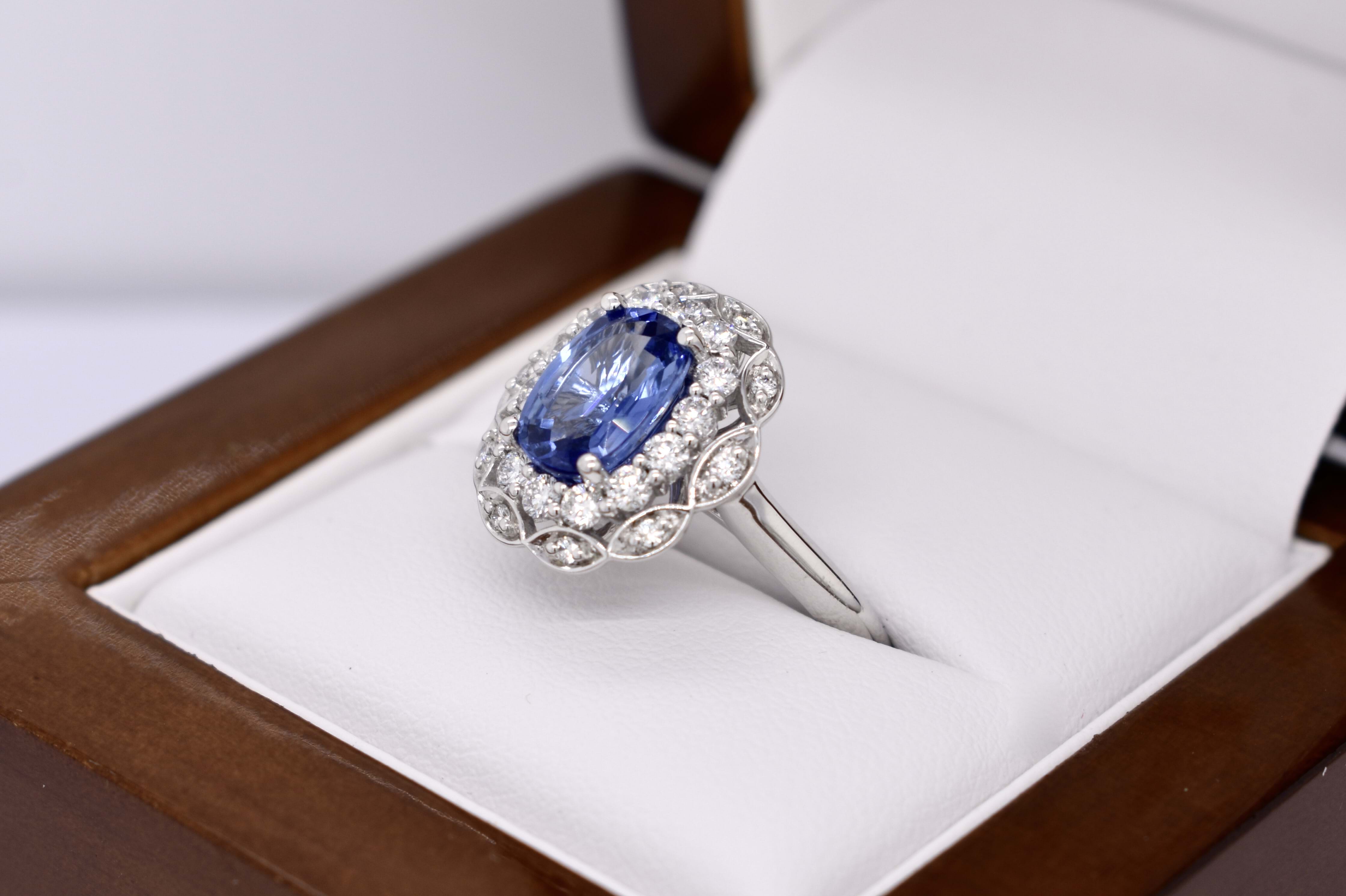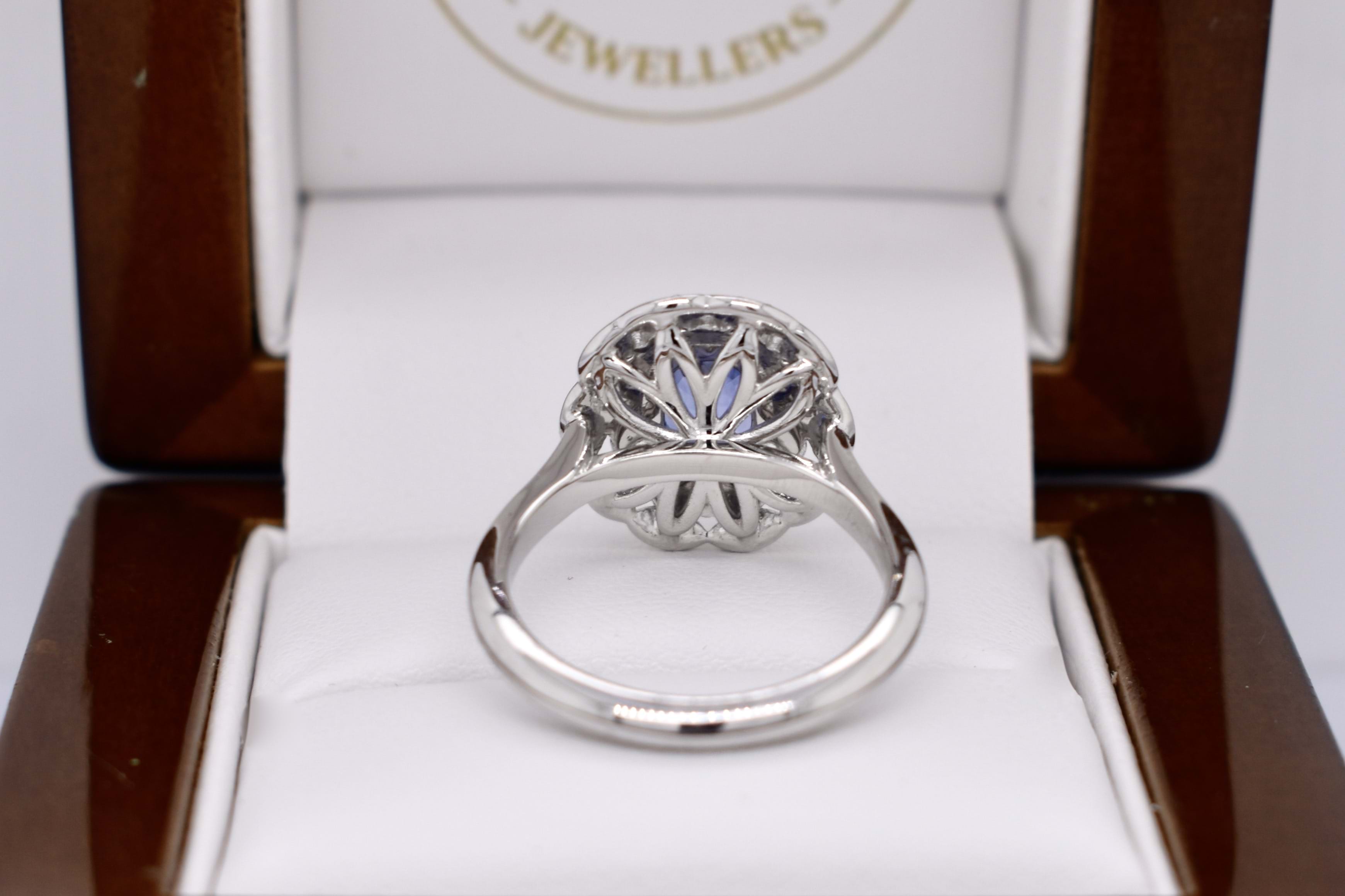 This fabulous fancy halo ring features a central blue oval Ceylon sapphire of 1.15ct, four claw set, with a halo of round brilliant cut diamonds, further marquise shaped grain set with another halo of round brilliant cut white diamonds. With a total of 24 diamonds totalling 0.22ct G SI, crafted in 18ct white gold with a plain band. Finger size N. Independent Valuation available upon purchase.