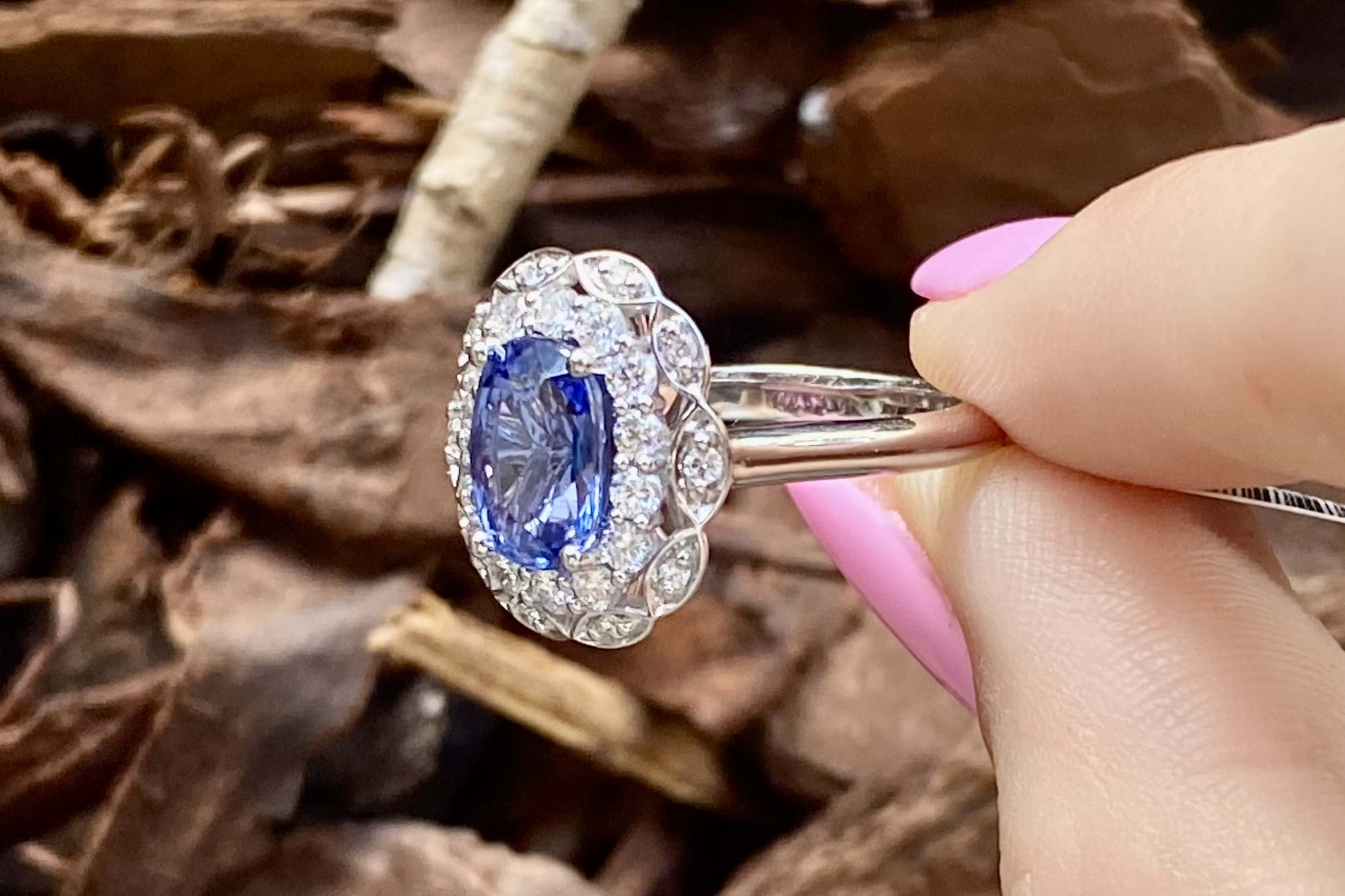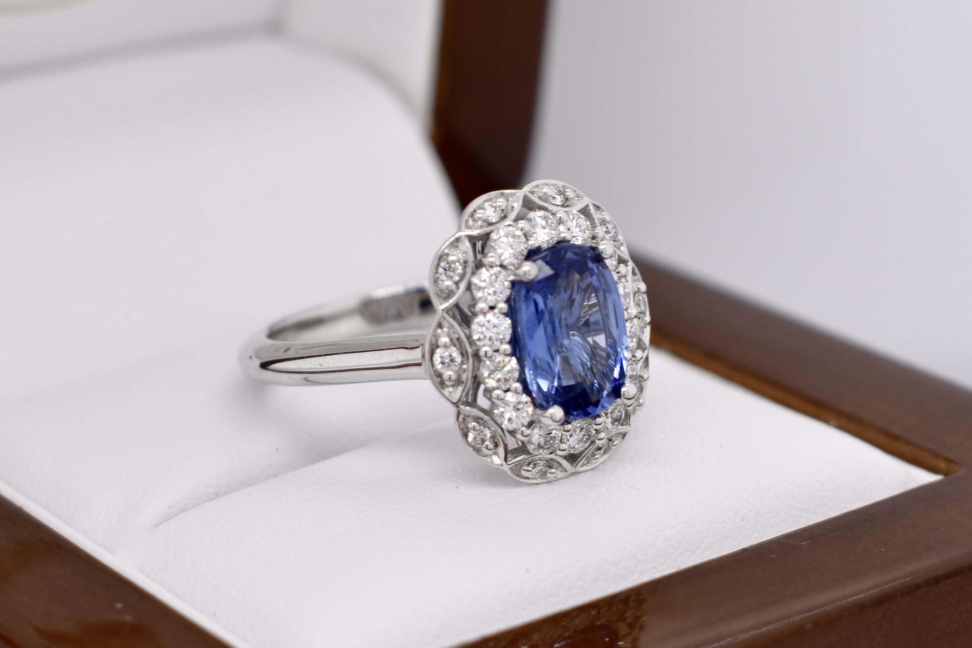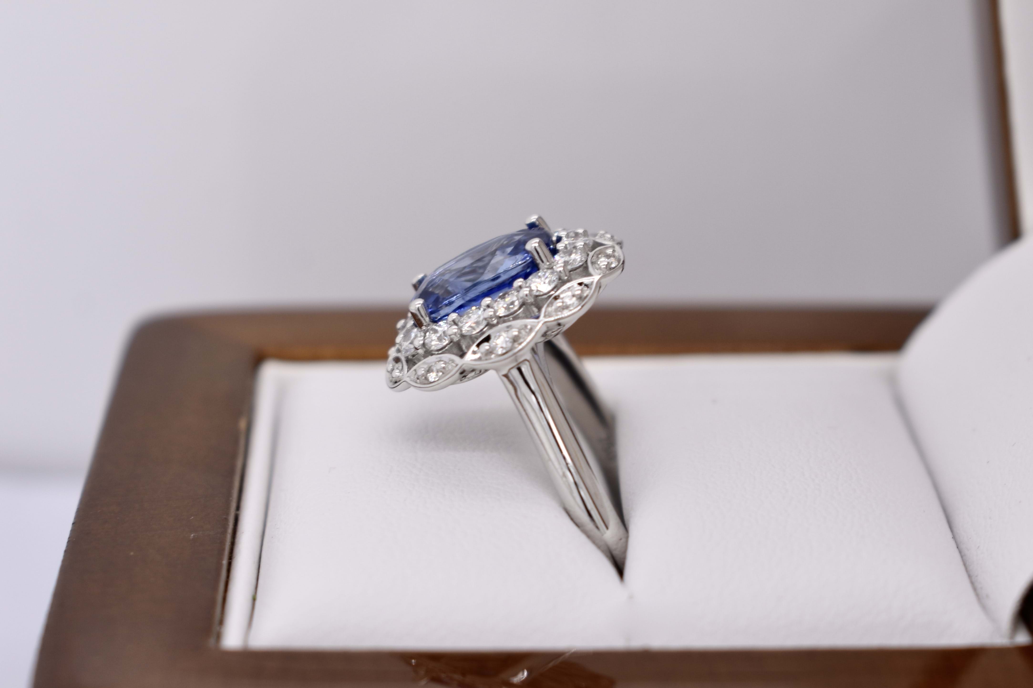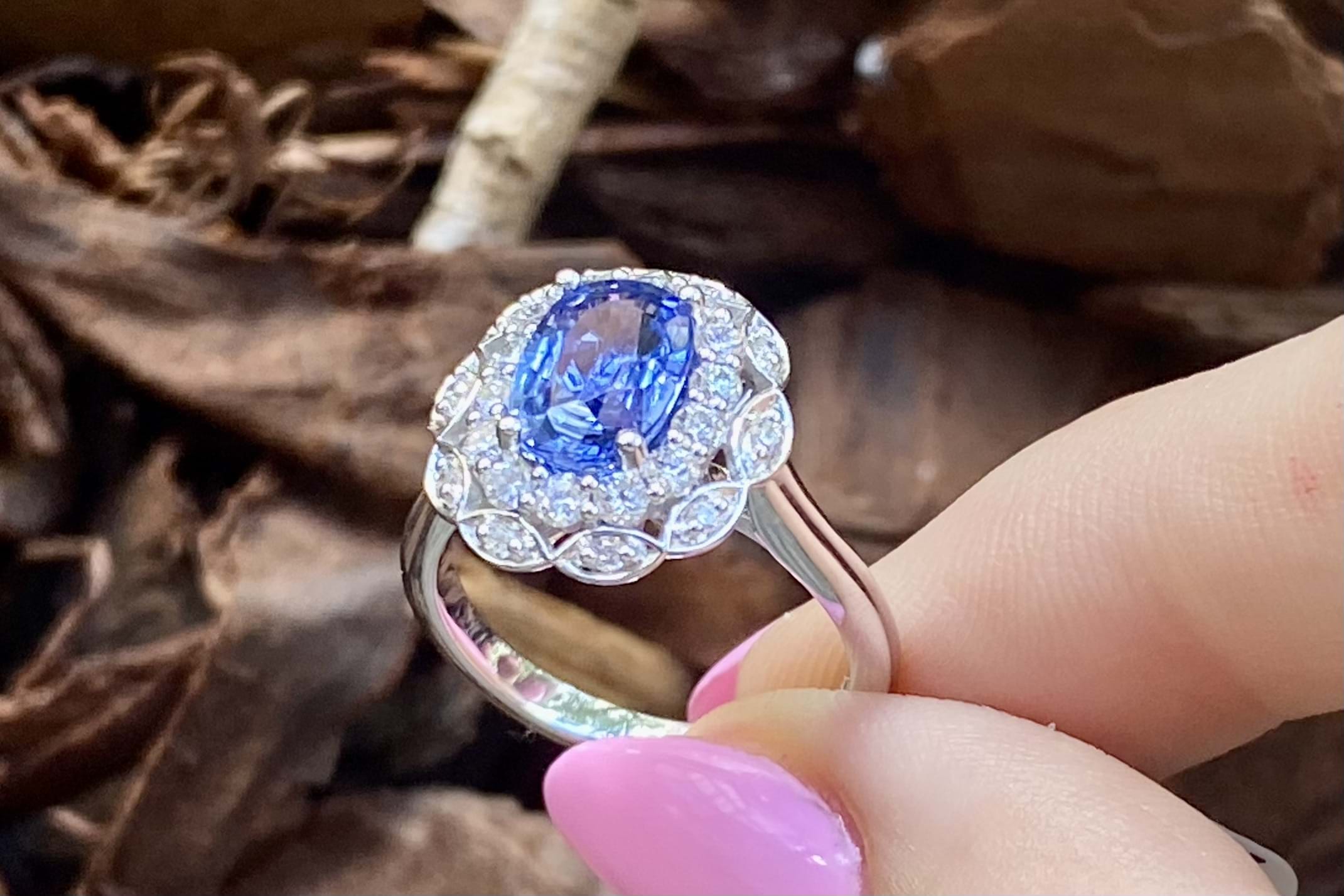 This fabulous fancy halo ring features a central blue oval Ceylon sapphire of 1.15ct, four claw set, with a halo of round brilliant cut diamonds, further marquise shaped grain set with another halo of round brilliant cut white diamonds. With a total of 24 diamonds totalling 0.22ct G SI, crafted in 18ct white gold with a plain band. Finger size N. Independent Valuation available upon purchase.