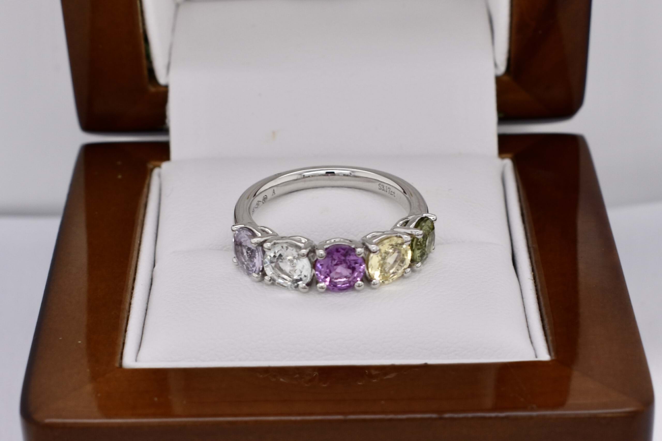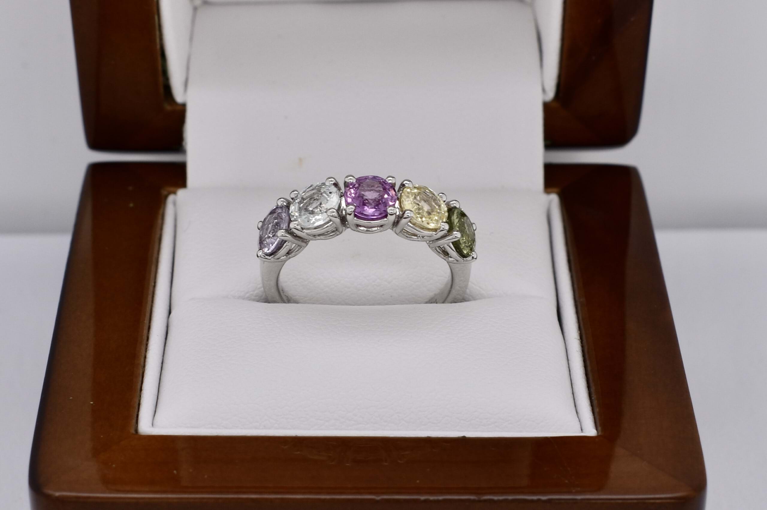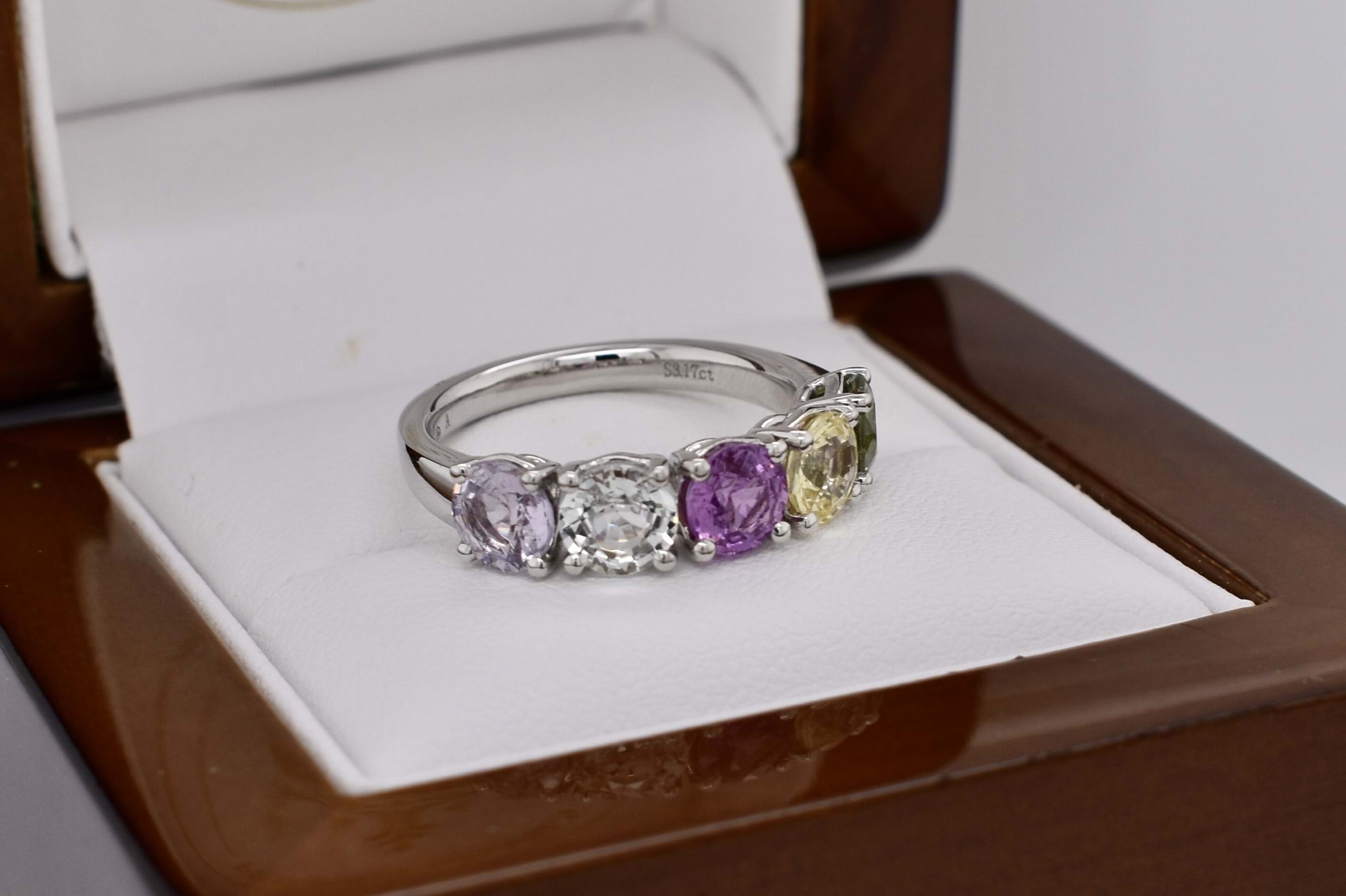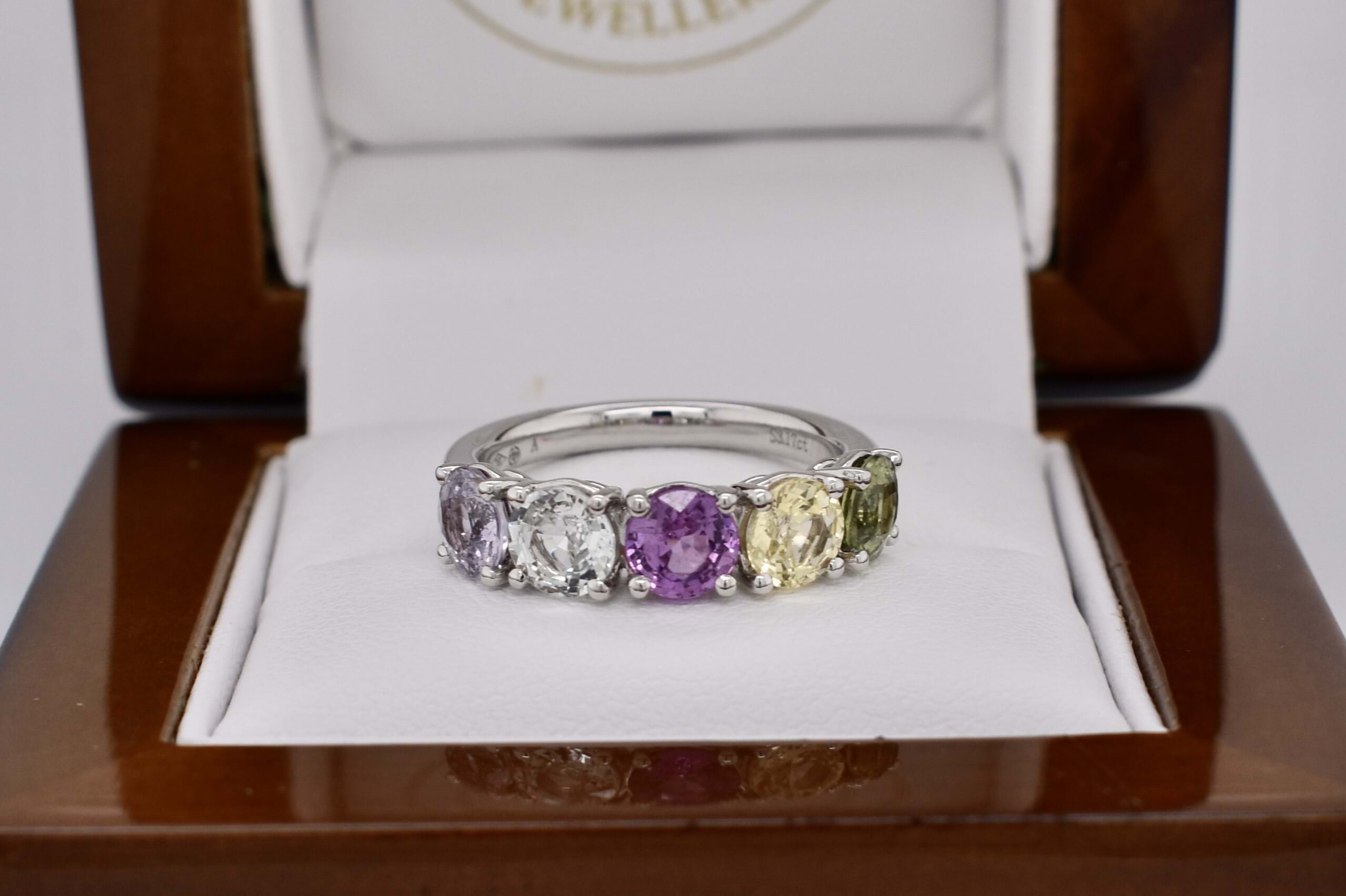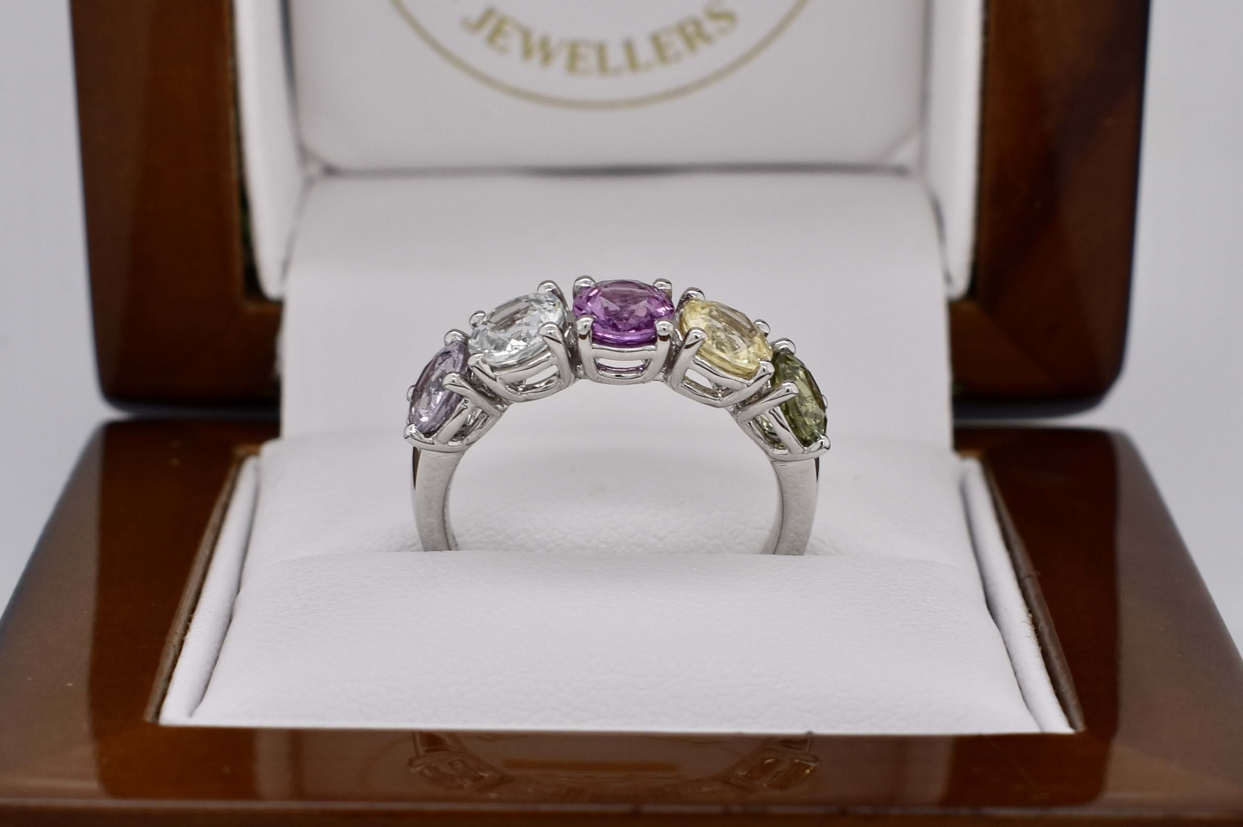 Crafted in 18ct white gold, this sweet multi coloured sapphire ring, features 5 round sapphires measuring 4.95-5.10mm in a horizontal line across the band. Including various beautiful shades of sapphires; light green, light yellow, purplish pink, pale green and pale pink. Total sapphire weight equalling 3.17ct. The stones are four claw set on a plain gold 2.41mm band. Finger size M. Independent Valuation Supplied.
