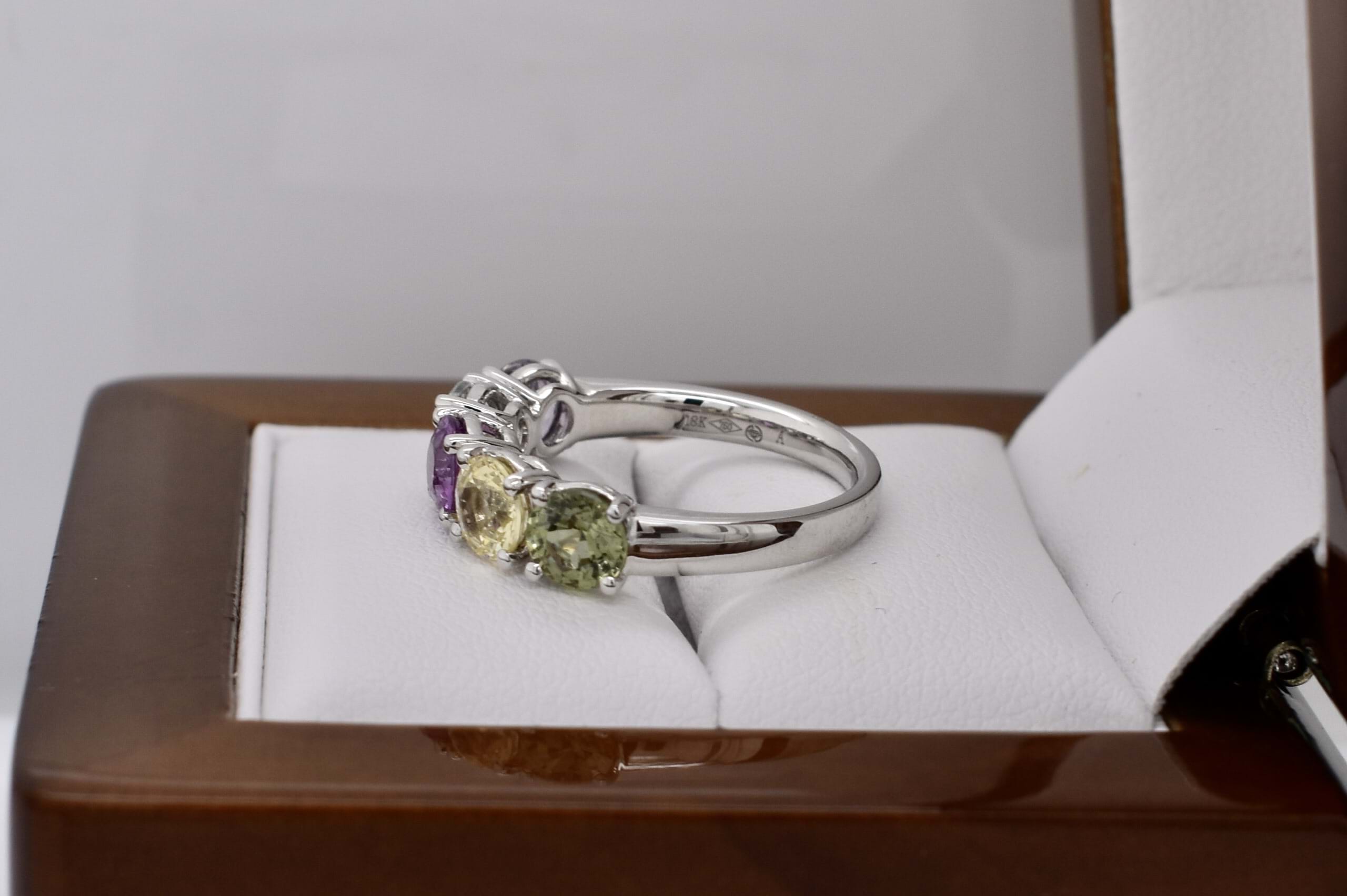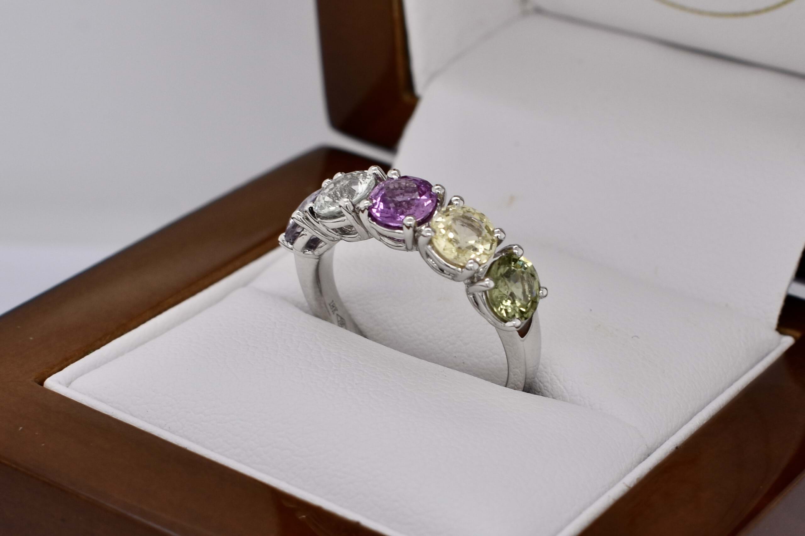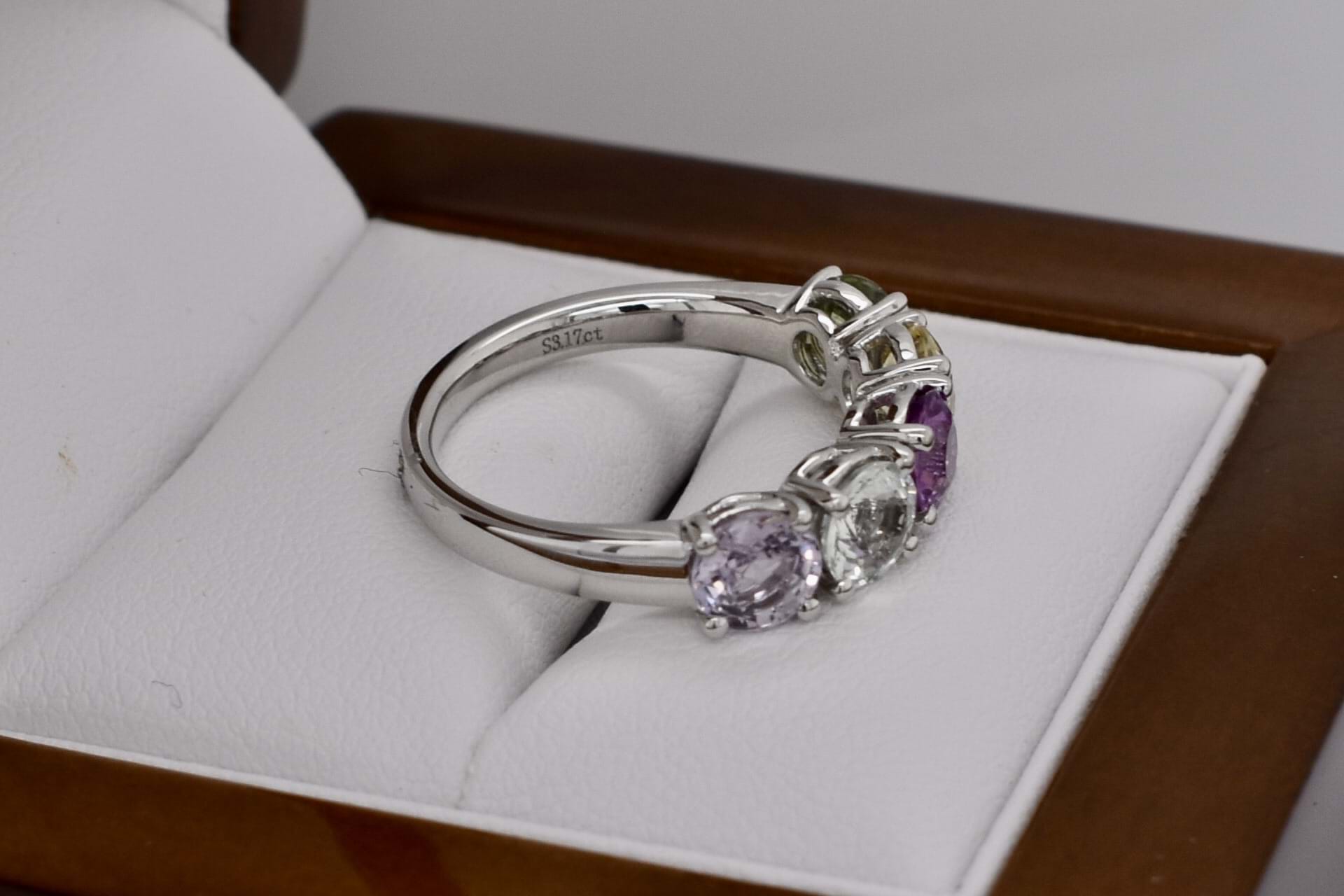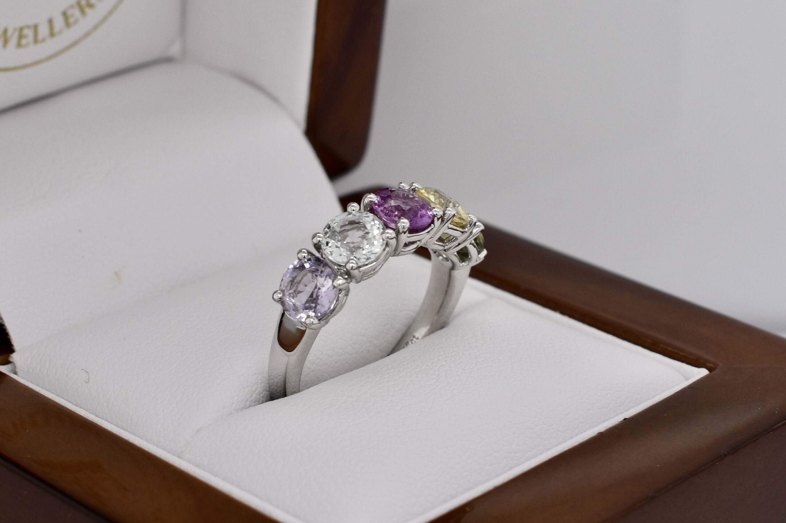 Crafted in 18ct white gold, this sweet multi coloured sapphire ring, features 5 round sapphires measuring 4.95-5.10mm in a horizontal line across the band. Including various beautiful shades of sapphires; light green, light yellow, purplish pink, pale green and pale pink. Total sapphire weight equalling 3.17ct. The stones are four claw set on a plain gold 2.41mm band. Finger size M. Independent Valuation Supplied.