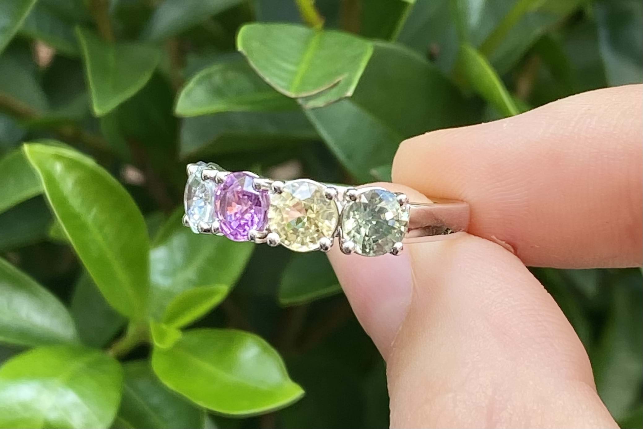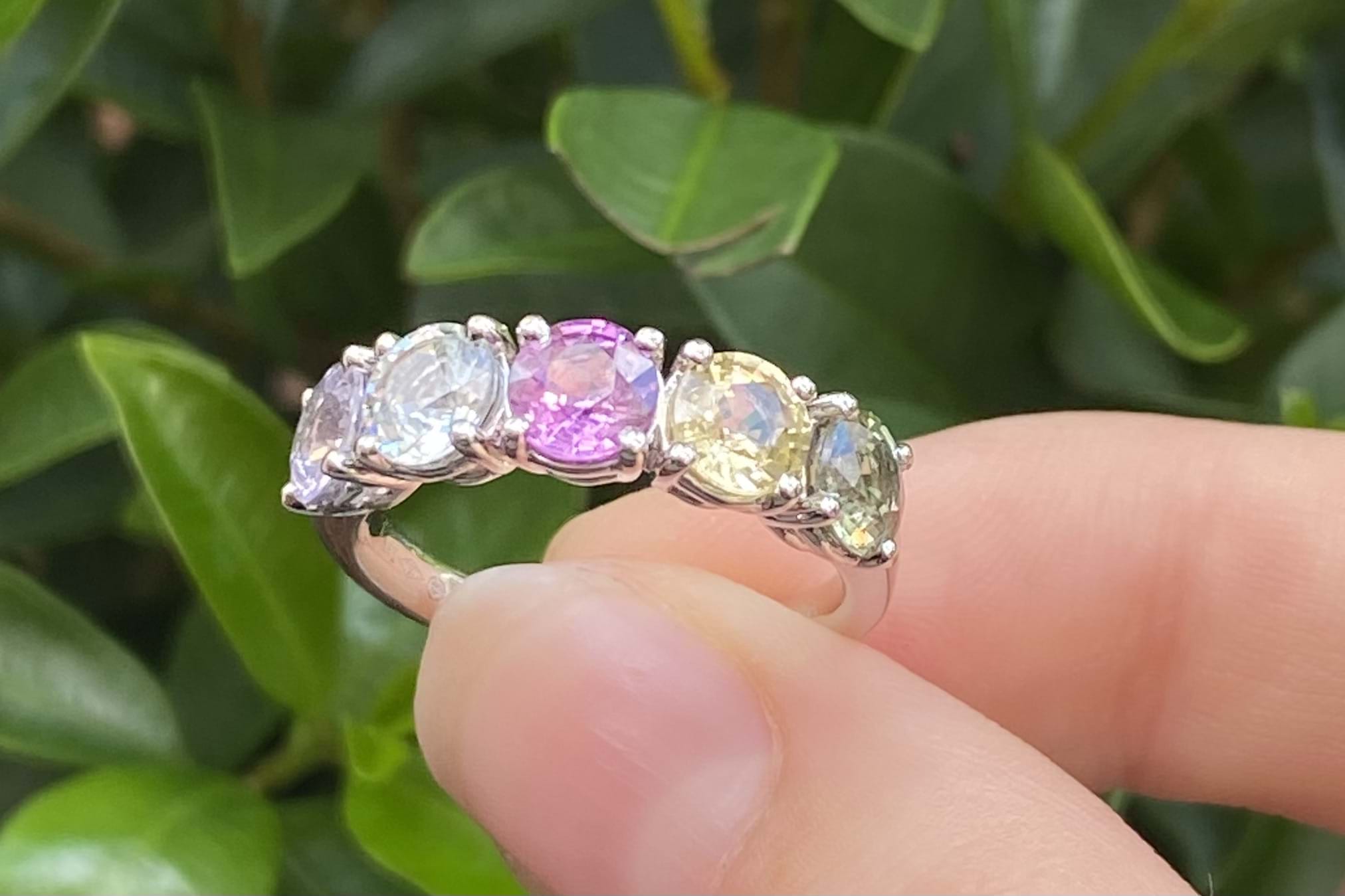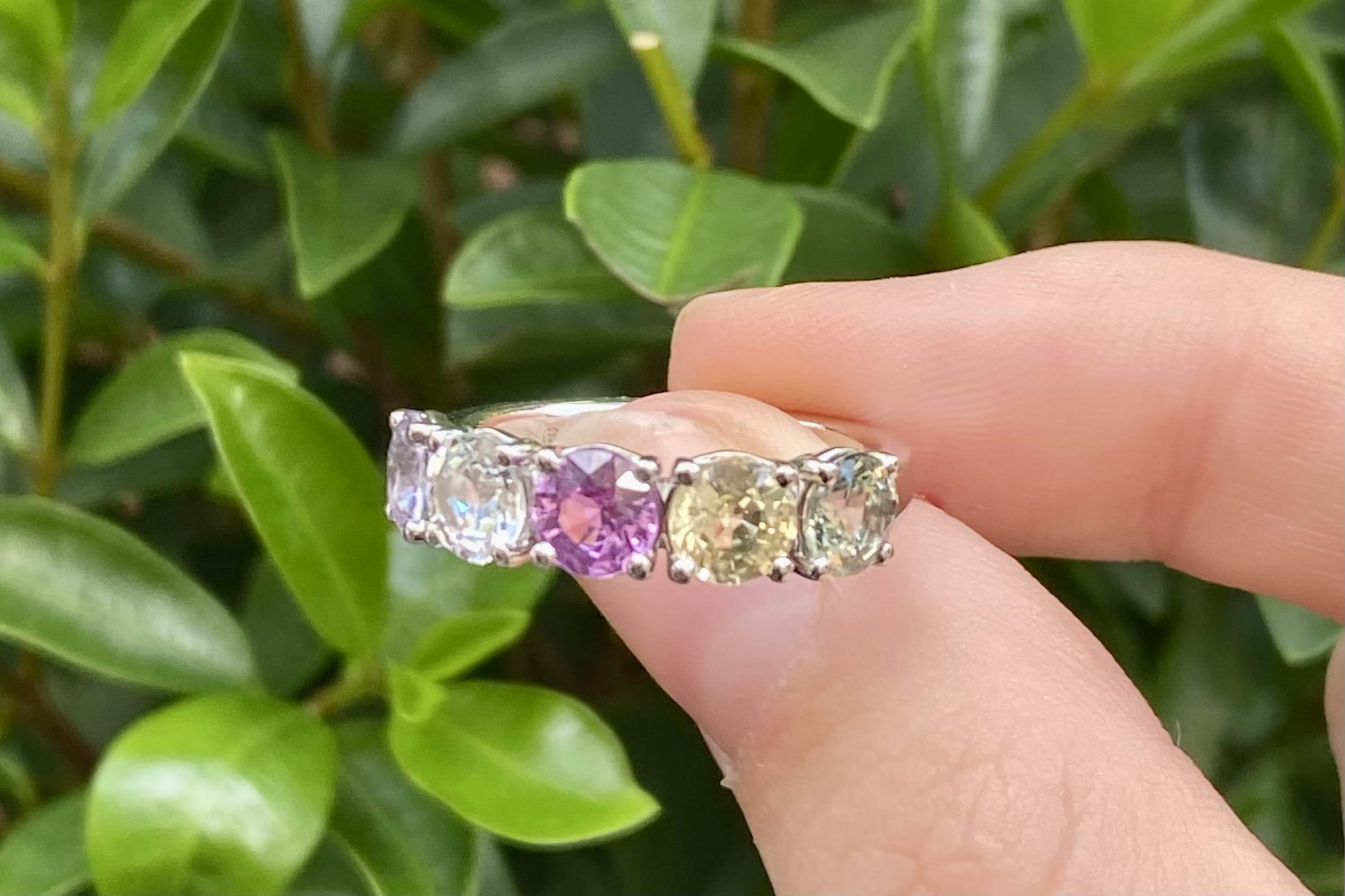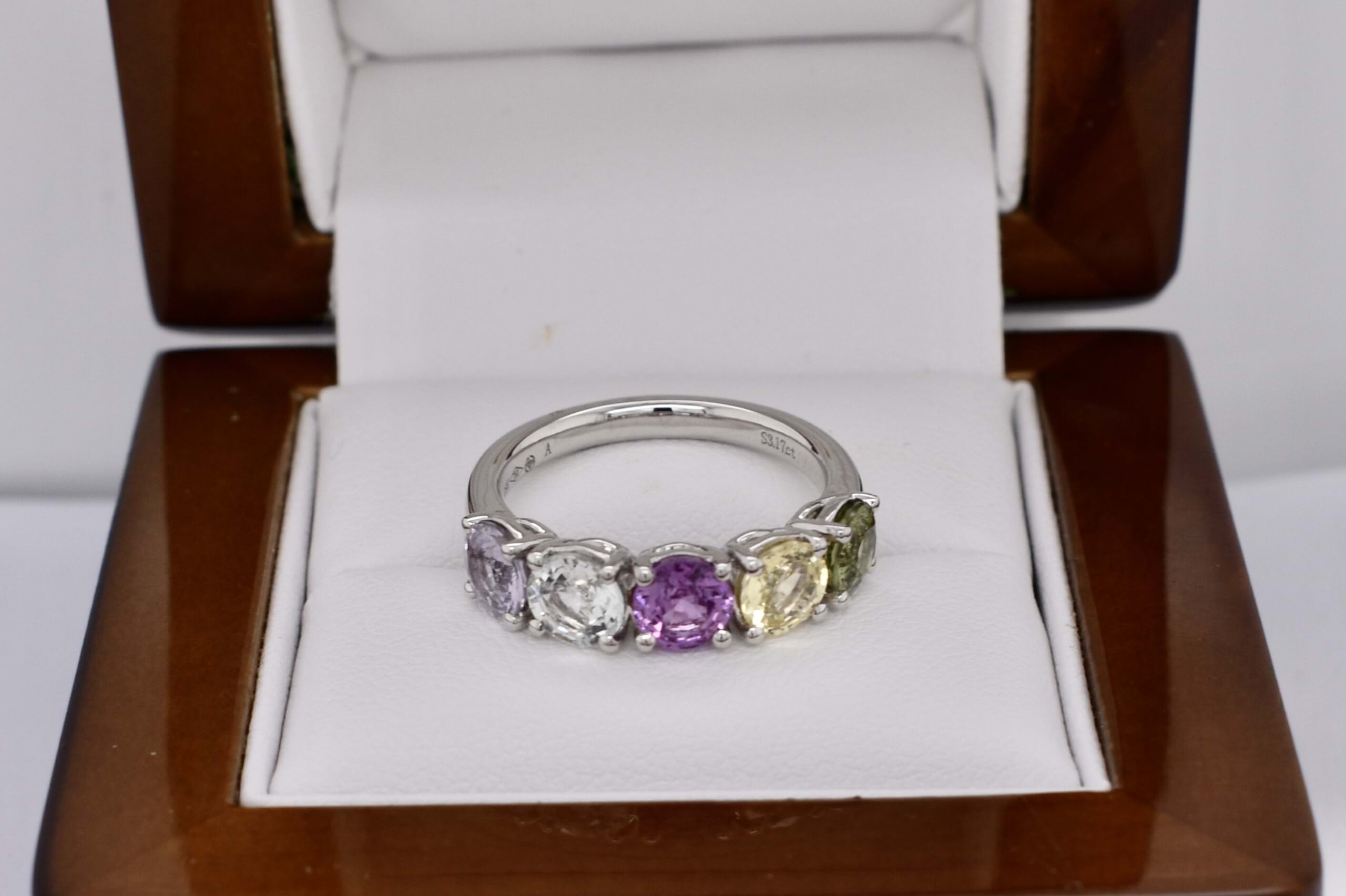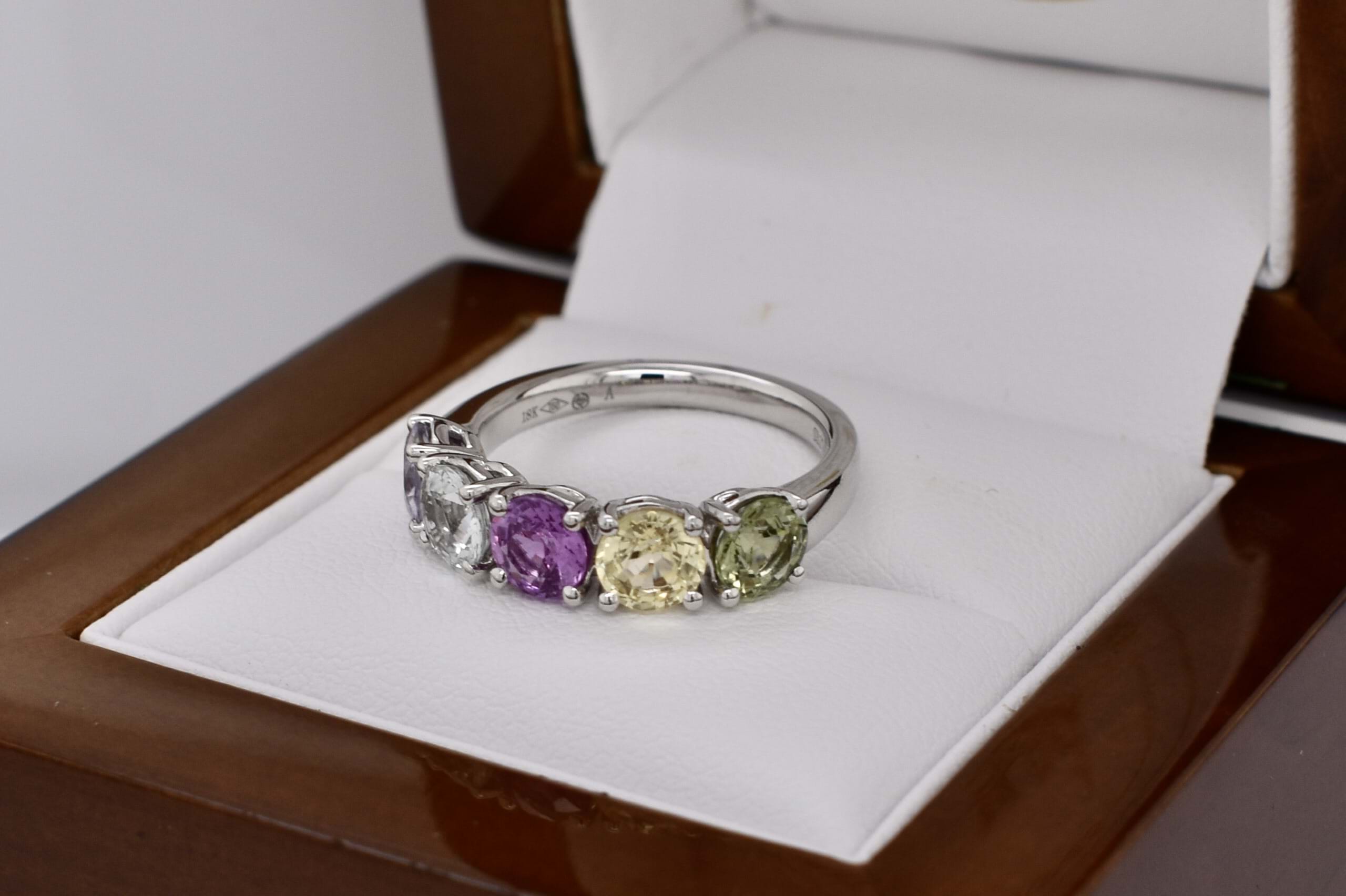 Crafted in 18ct white gold, this sweet multi coloured sapphire ring, features 5 round sapphires measuring 4.95-5.10mm in a horizontal line across the band. Including various beautiful shades of sapphires; light green, light yellow, purplish pink, pale green and pale pink. Total sapphire weight equalling 3.17ct. The stones are four claw set on a plain gold 2.41mm band. Finger size M. Independent Valuation Supplied.