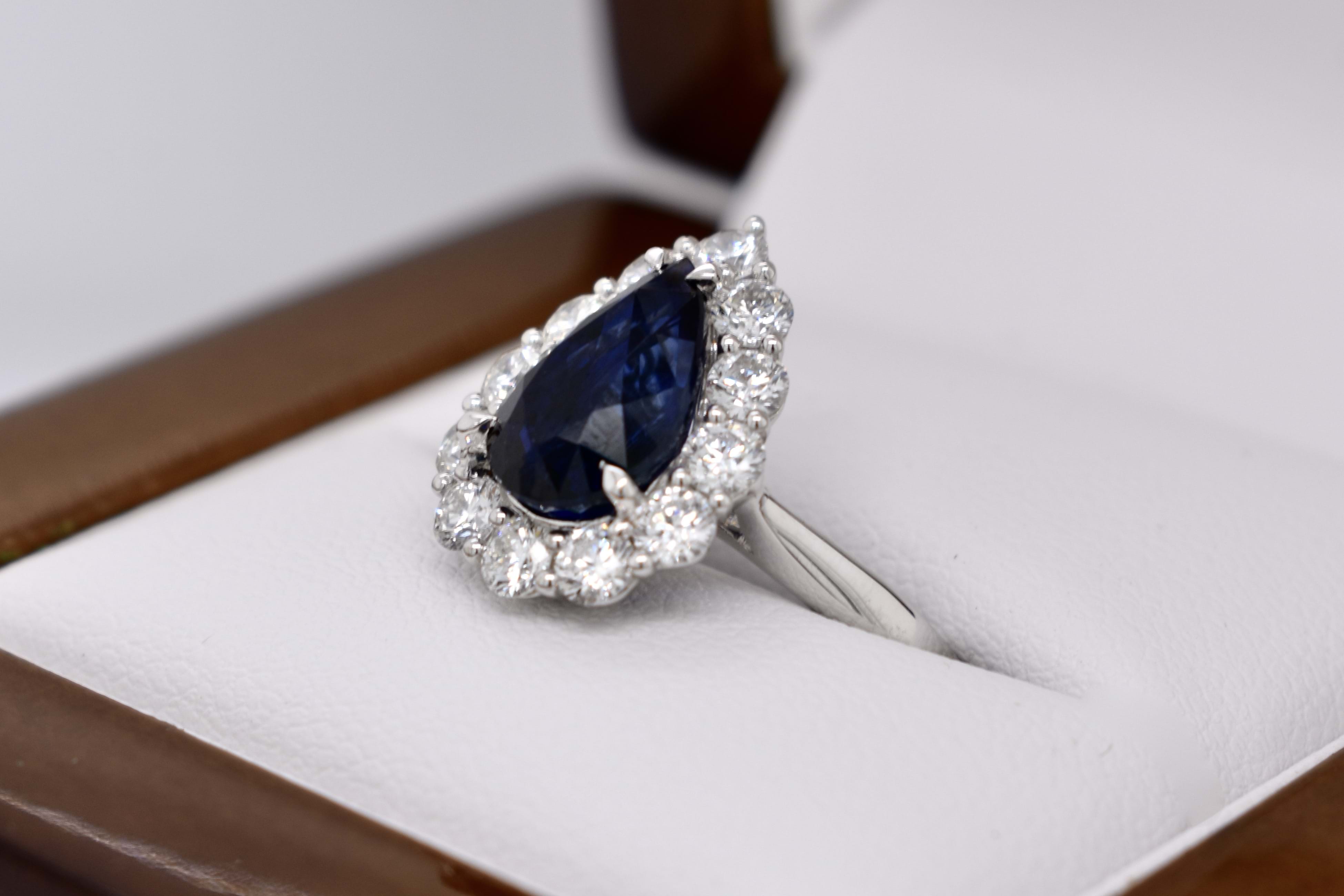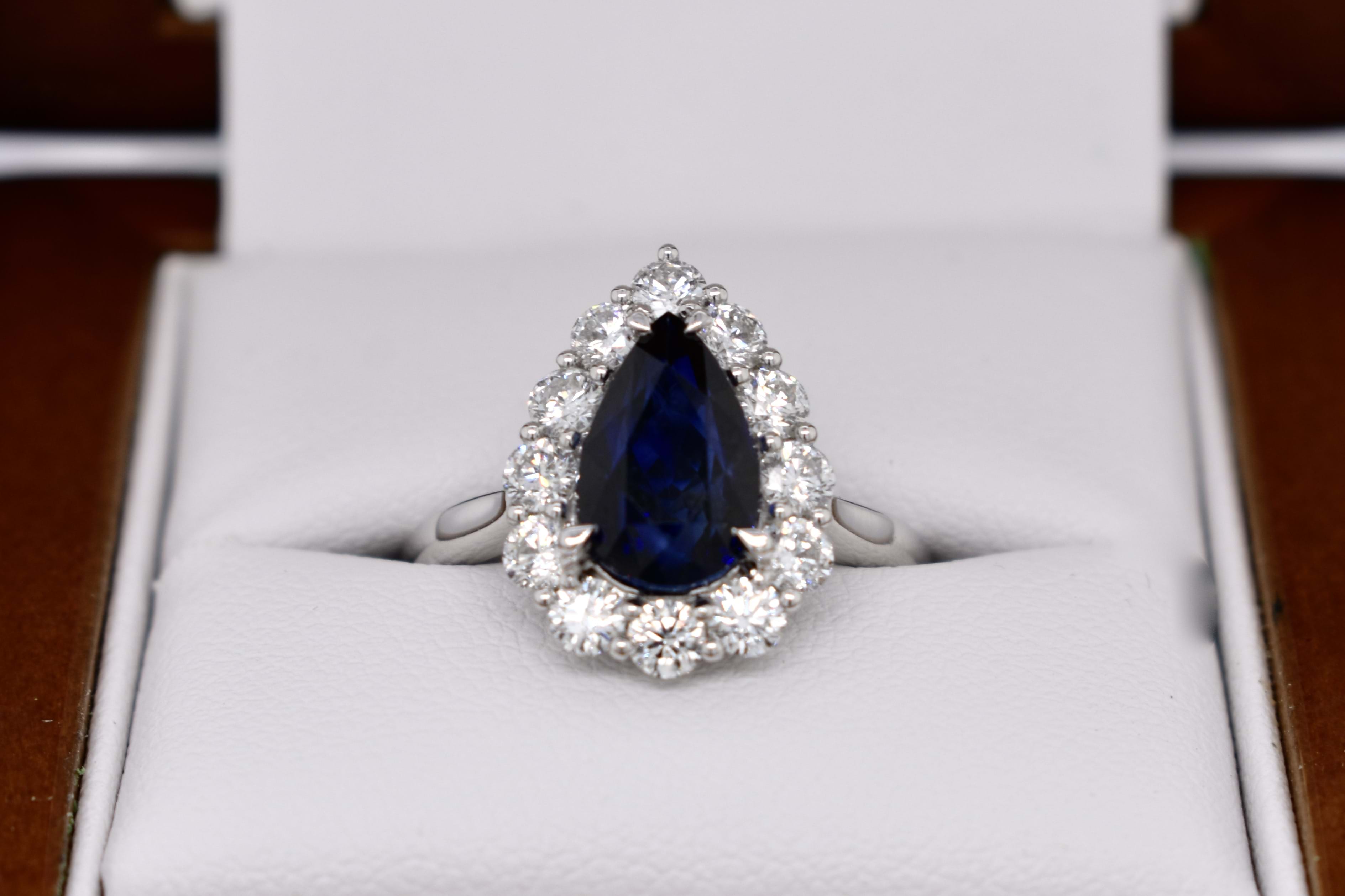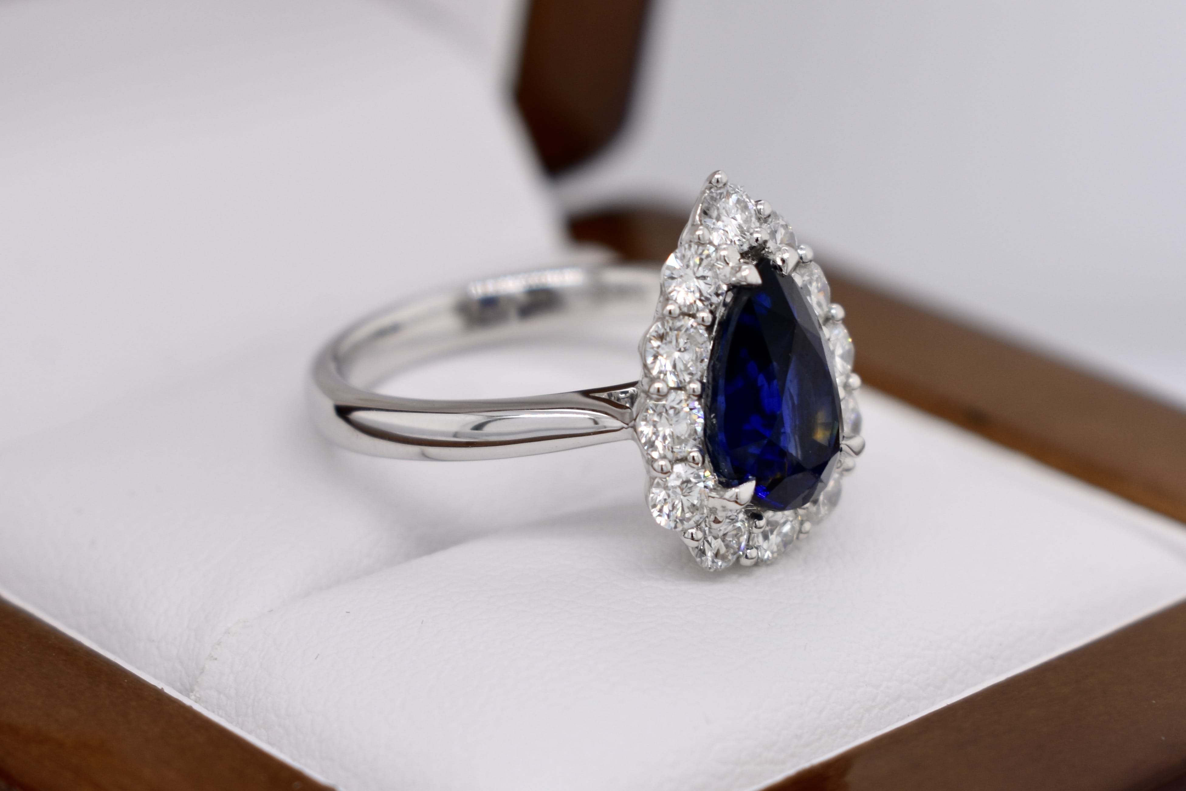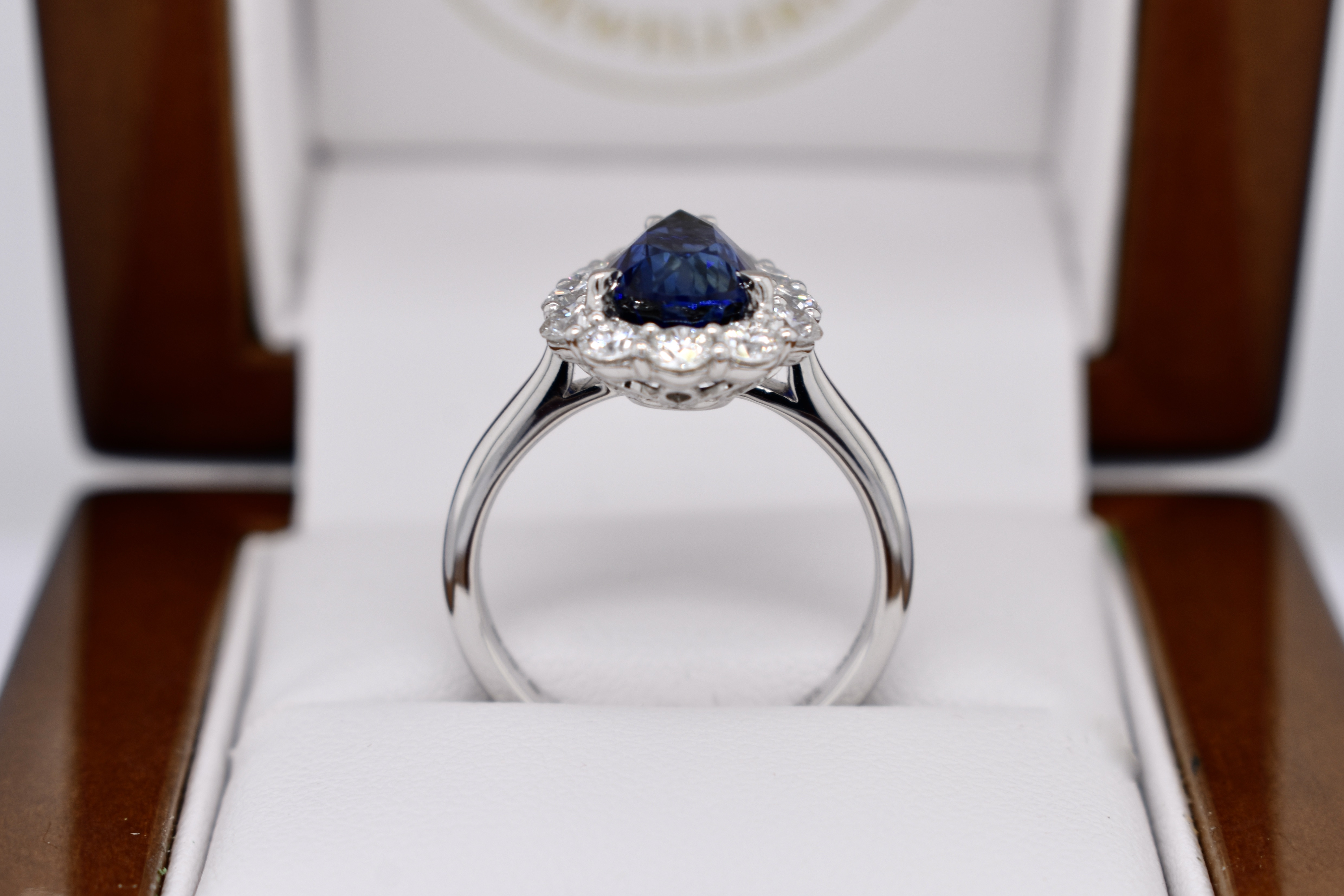 An elegant and timeless ring, crafted in 18ct white gold featuring a 3.35ct pear shaped dark blue Ceylon sapphire in four claws, with a halo of twelve twinkling round brilliant cut diamonds, shared claw set, totalling 0.95ct FG VS-SI. Completed with a plain tapered band. Finger size M. Approx. valuation of $25,000. Independent valuation provided upon purchase.