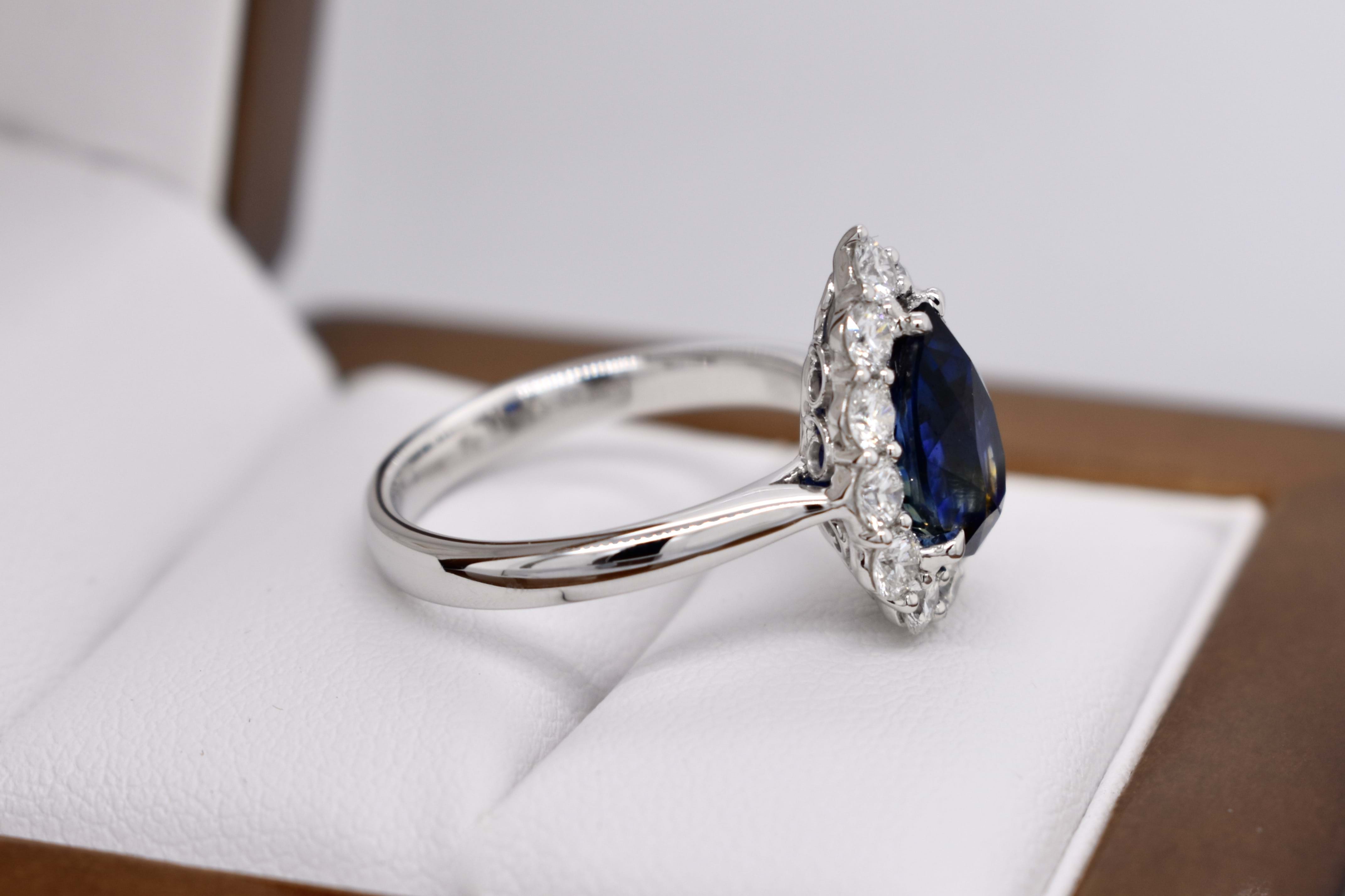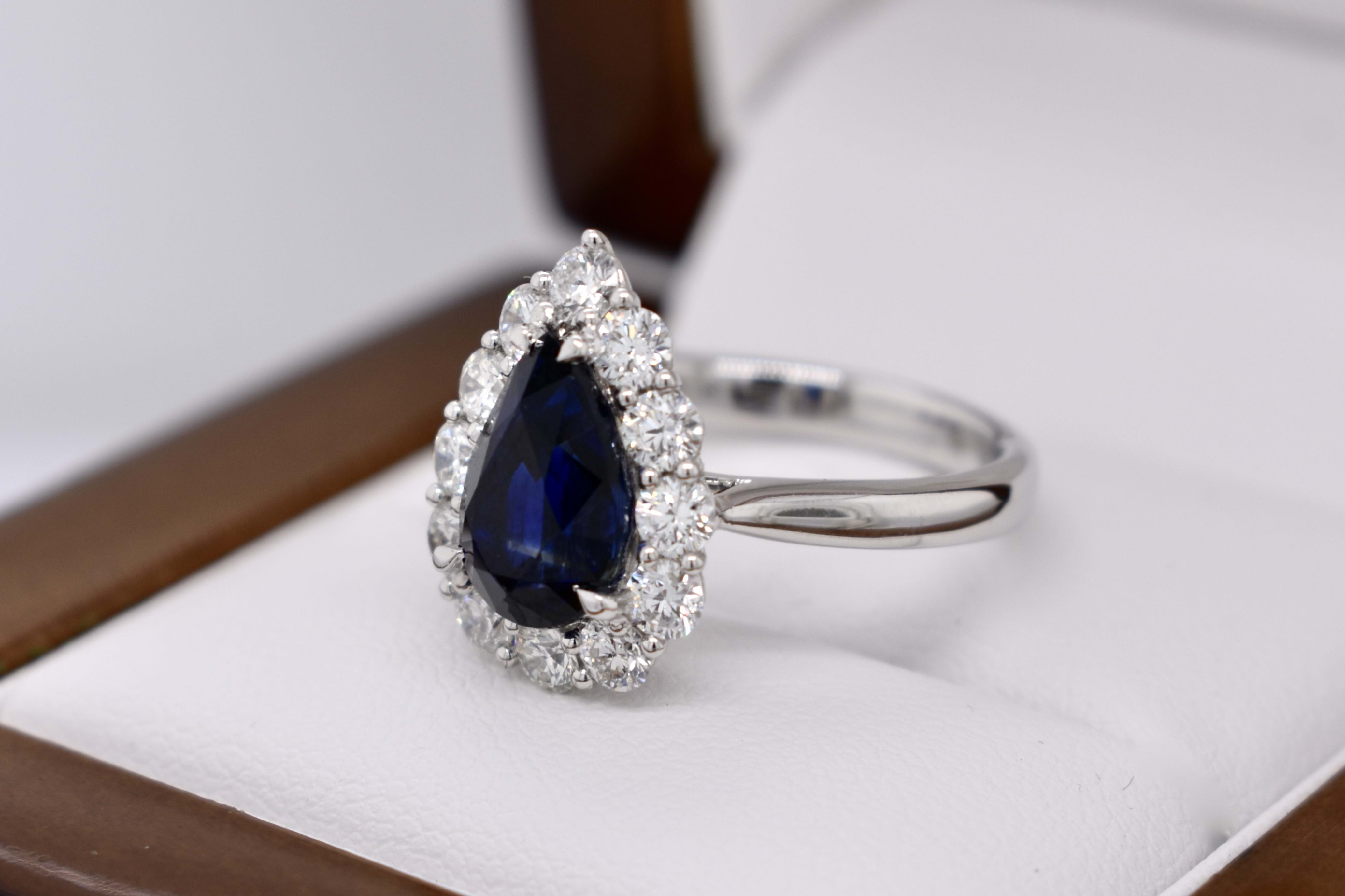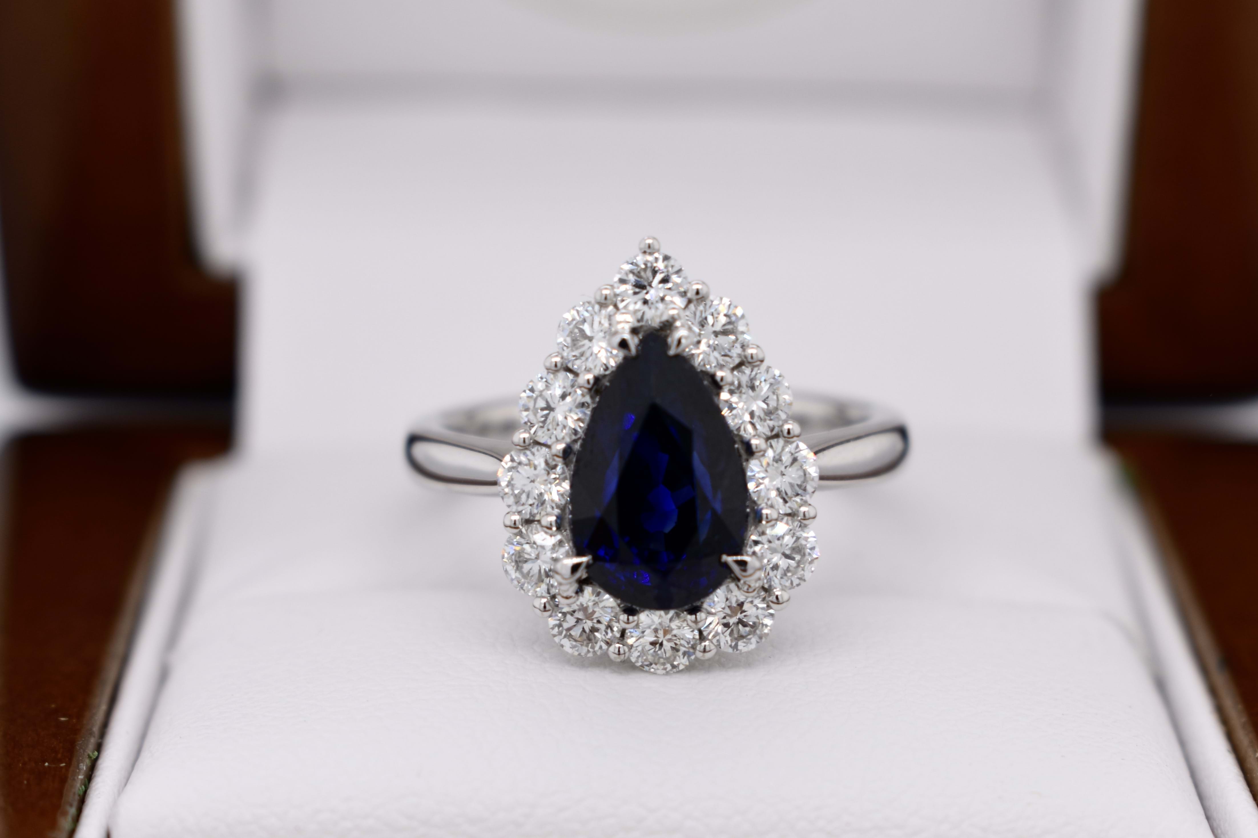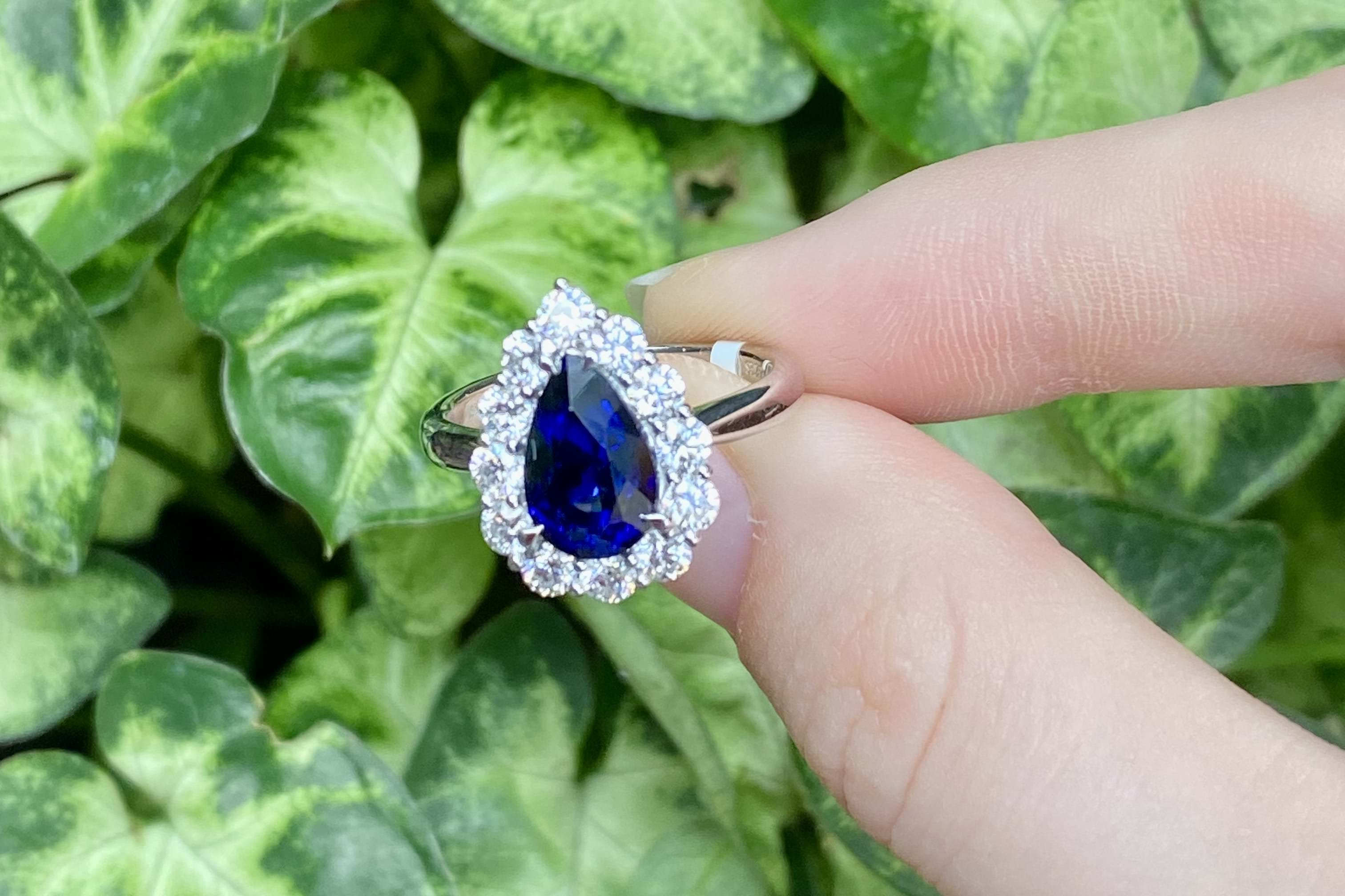 An elegant and timeless ring, crafted in 18ct white gold featuring a 3.35ct pear shaped dark blue Ceylon sapphire in four claws, with a halo of twelve twinkling round brilliant cut diamonds, shared claw set, totalling 0.95ct FG VS-SI. Completed with a plain tapered band. Finger size M. Approx. valuation of $25,000. Independent valuation provided upon purchase.