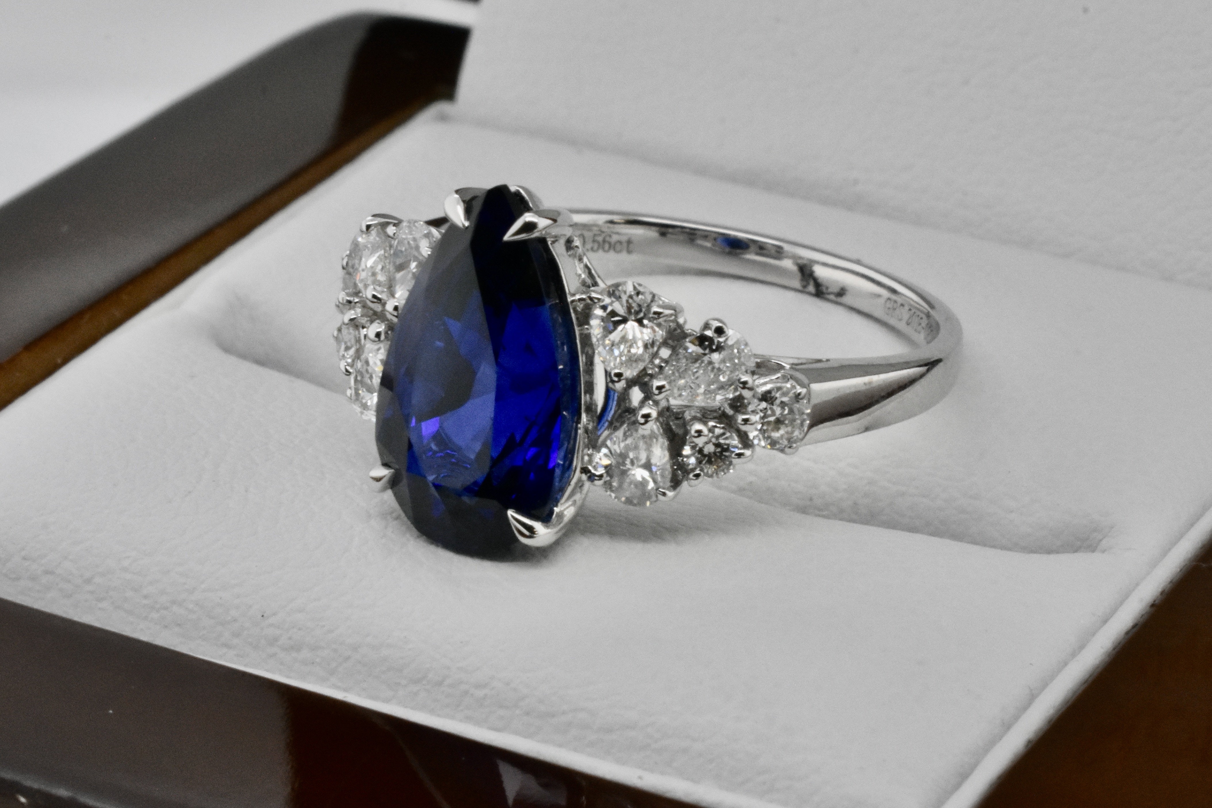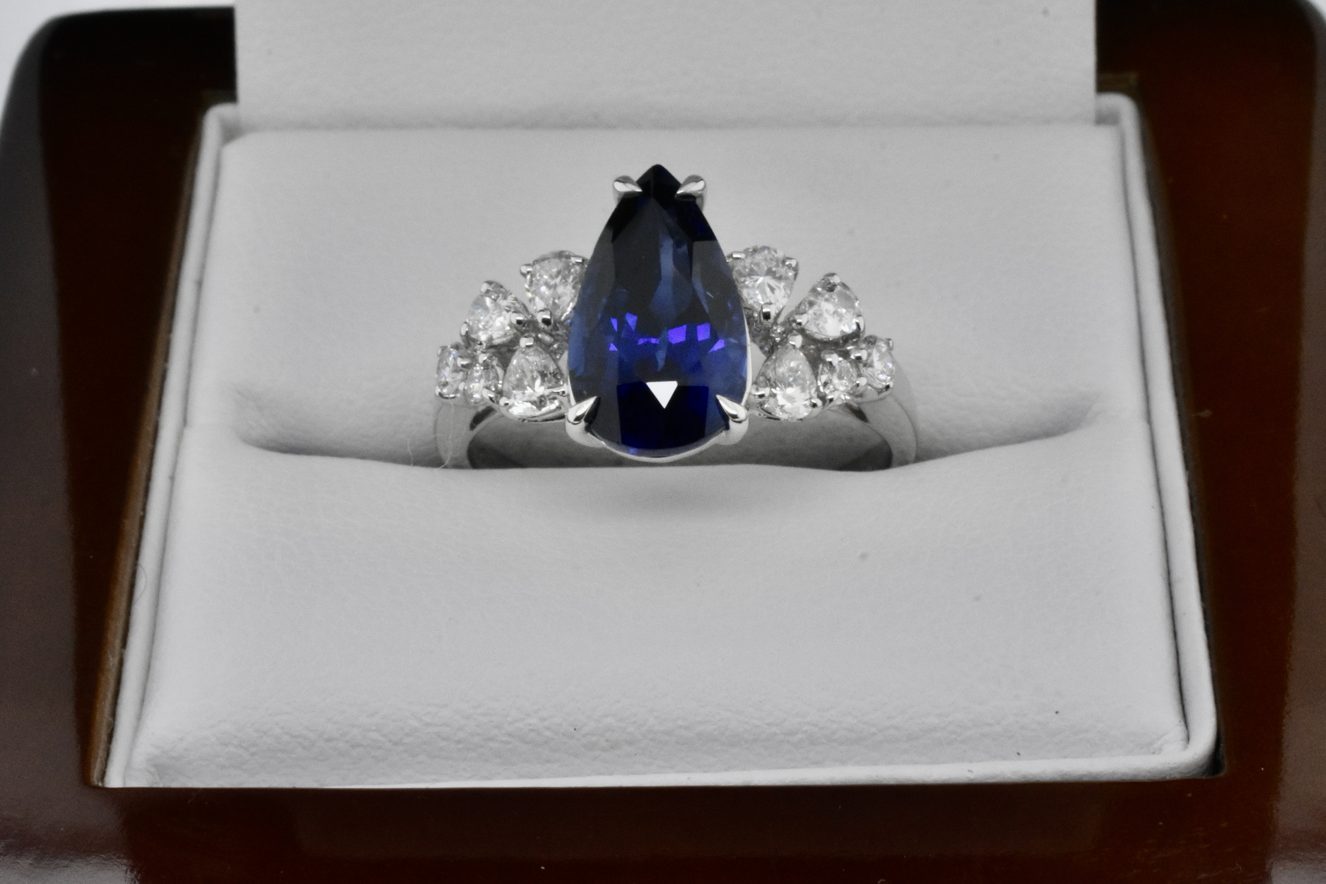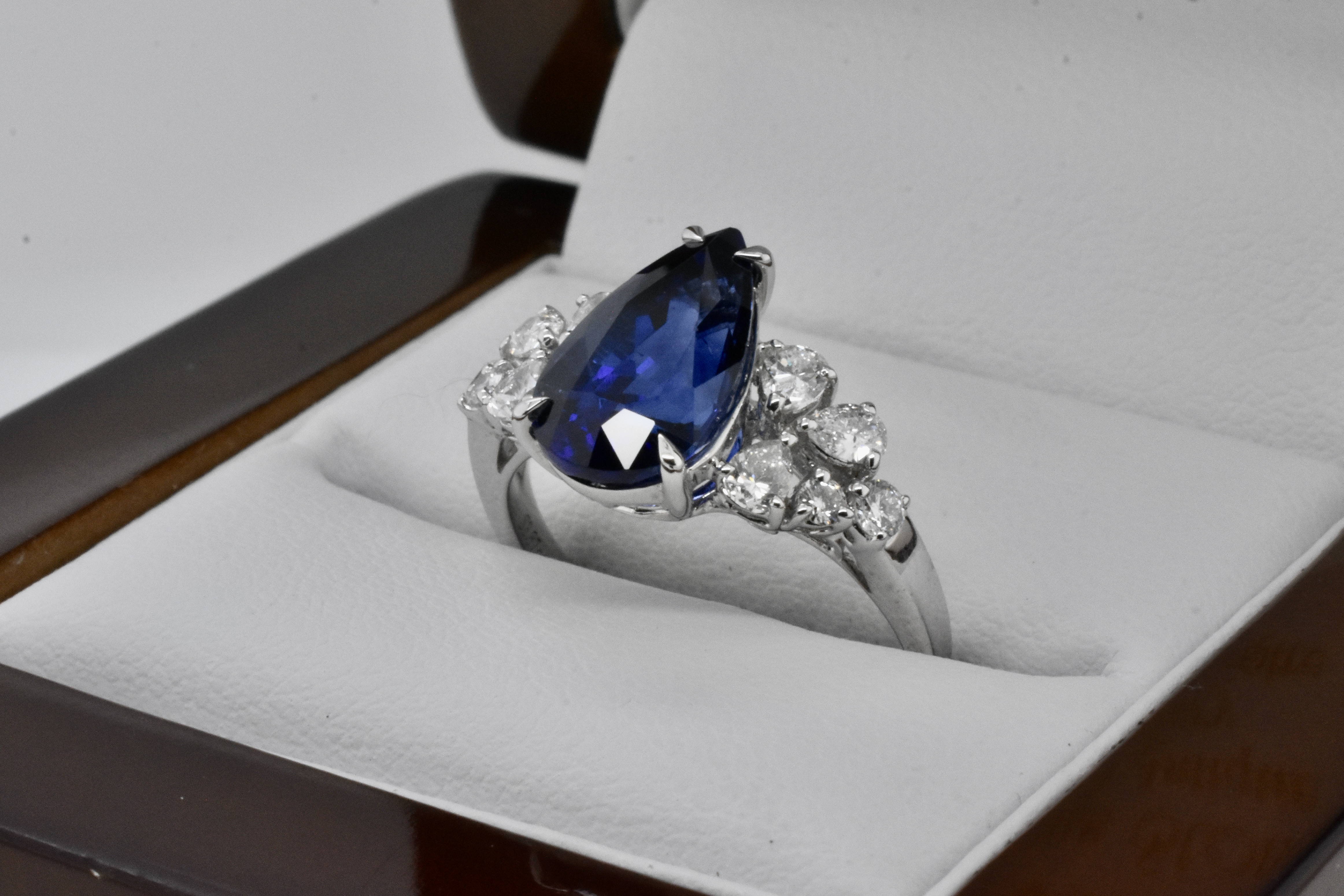 This gorgeous 3.87ct vivid blue Ceylon sapphire is the feature of this striking yet feminine 18ct white gold ring with beautiful pearshape and round brilliant cut diamonds accents. The ring contains six pearshape diamonds totalling 0.44cts GHSI and four round brilliant cut diamonds equalling 0.13ct GHSI. Finger size N. Independent Valuation & GRS Cert Supplied