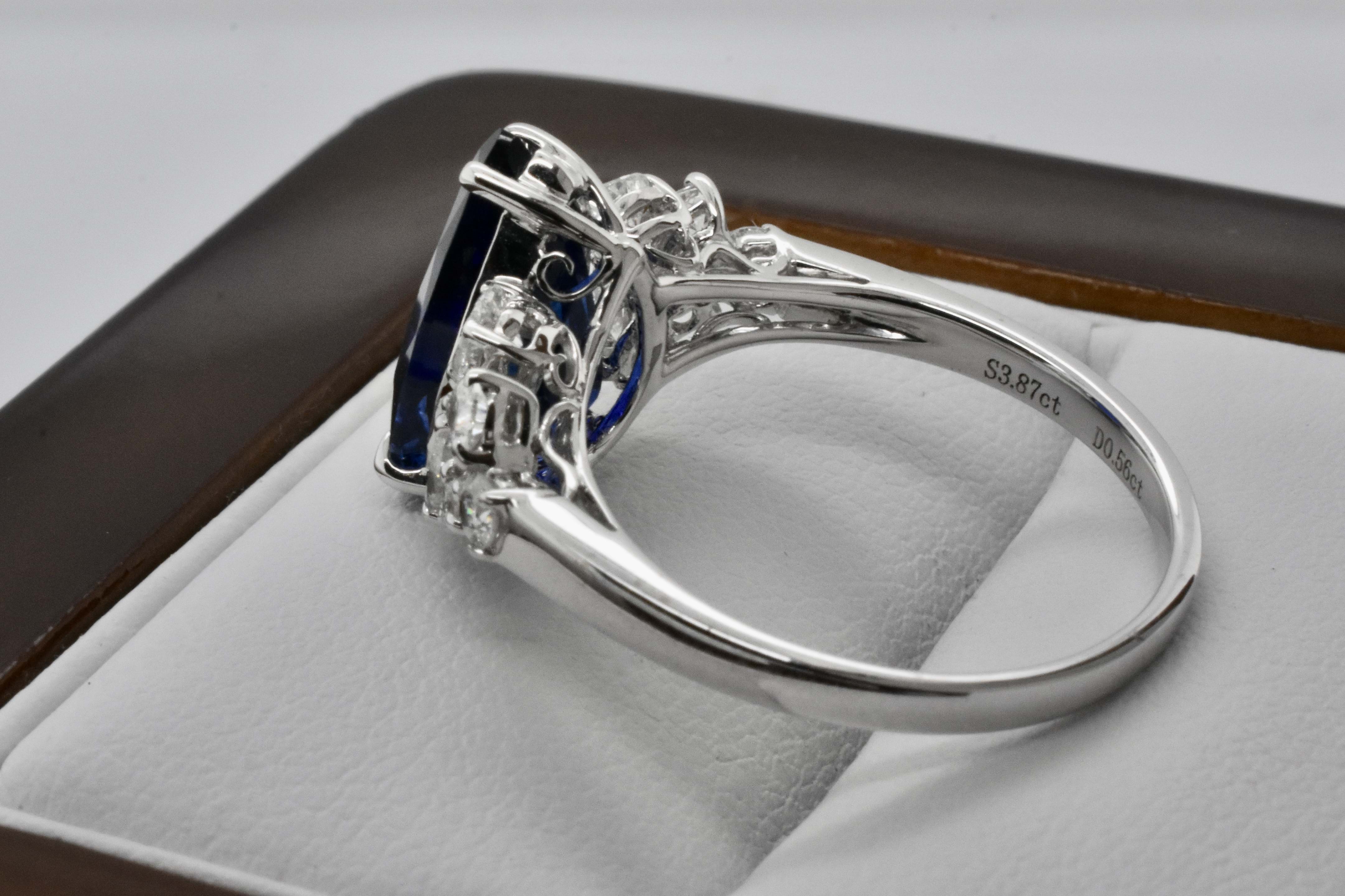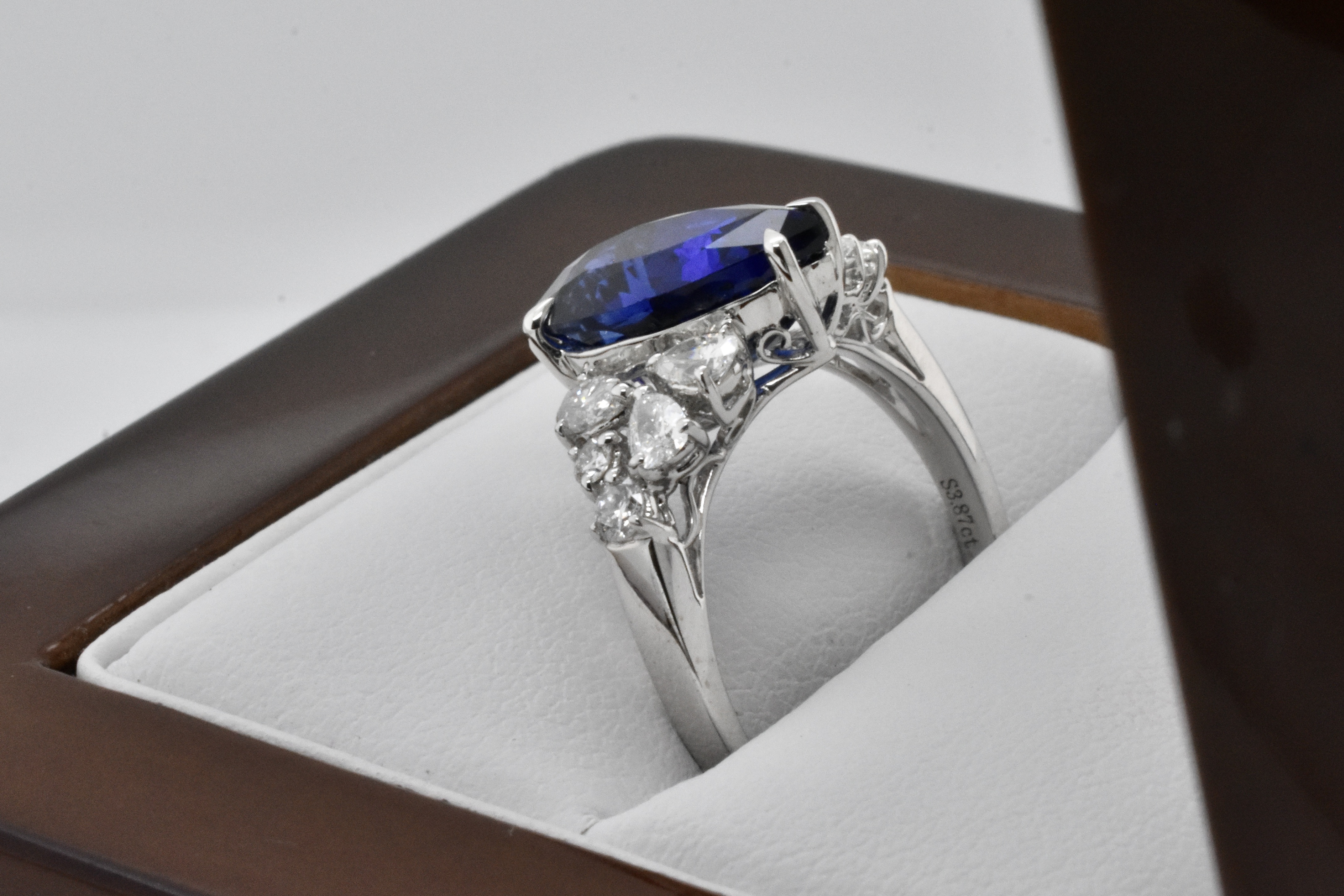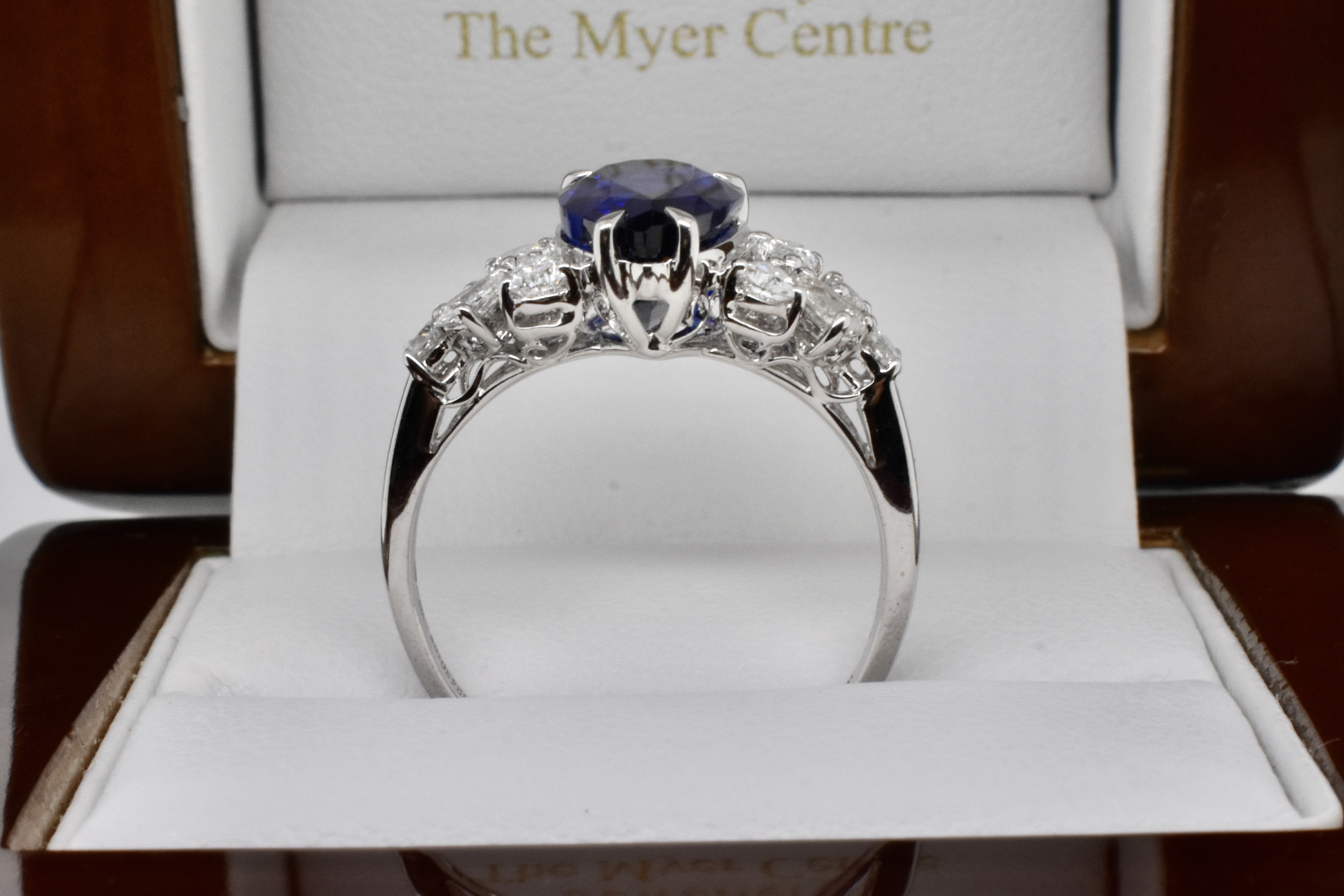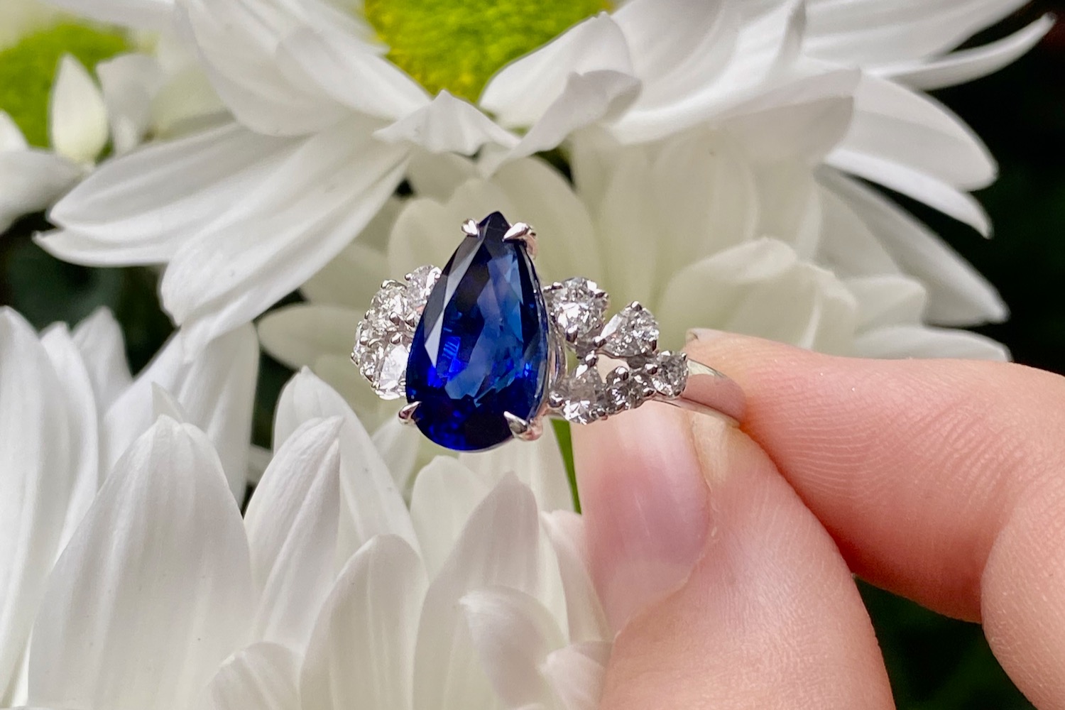 This gorgeous 3.87ct vivid blue Ceylon sapphire is the feature of this striking yet feminine 18ct white gold ring with beautiful pearshape and round brilliant cut diamonds accents. The ring contains six pearshape diamonds totalling 0.44cts GHSI and four round brilliant cut diamonds equalling 0.13ct GHSI. Finger size N. Independent Valuation & GRS Cert Supplied