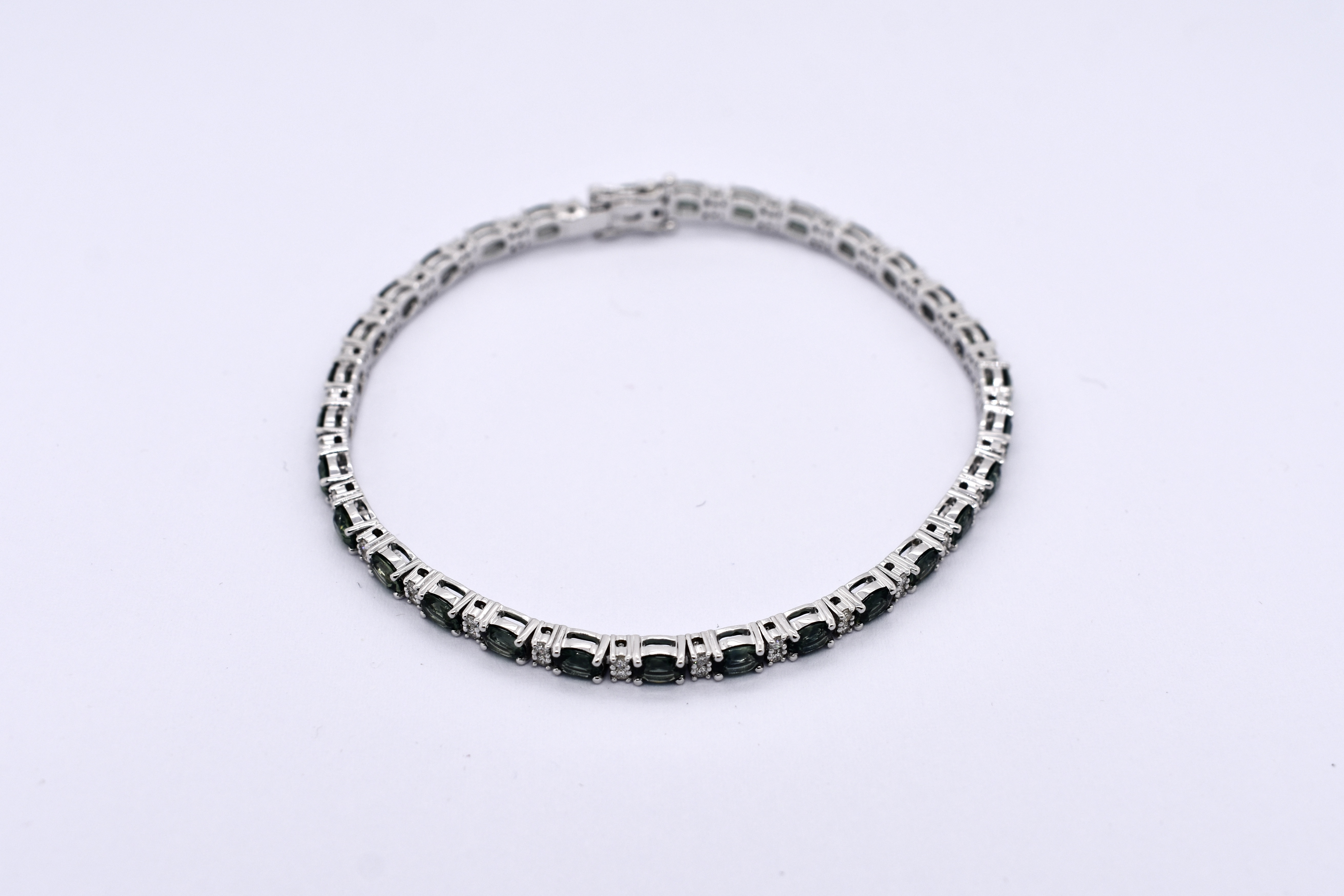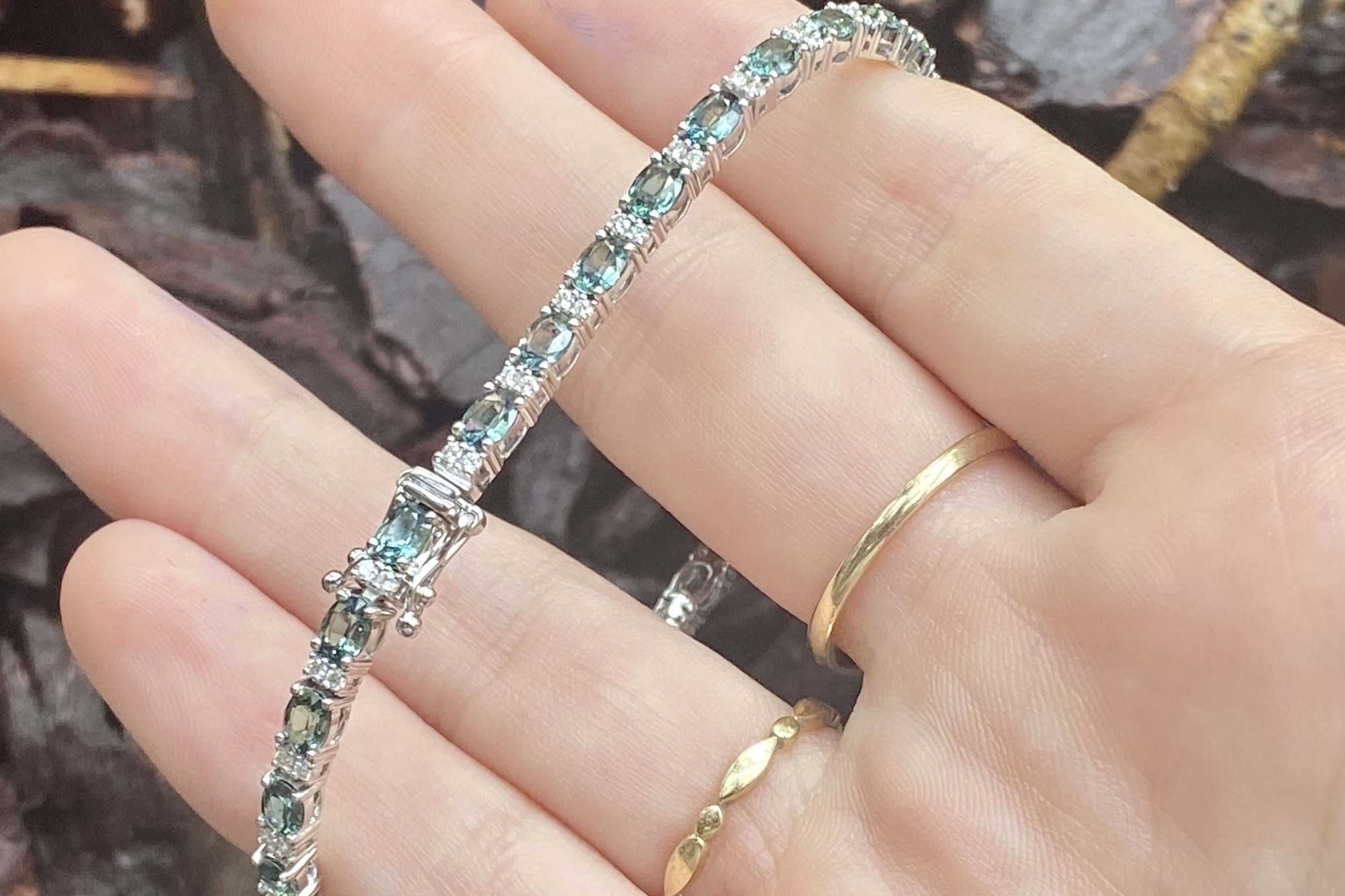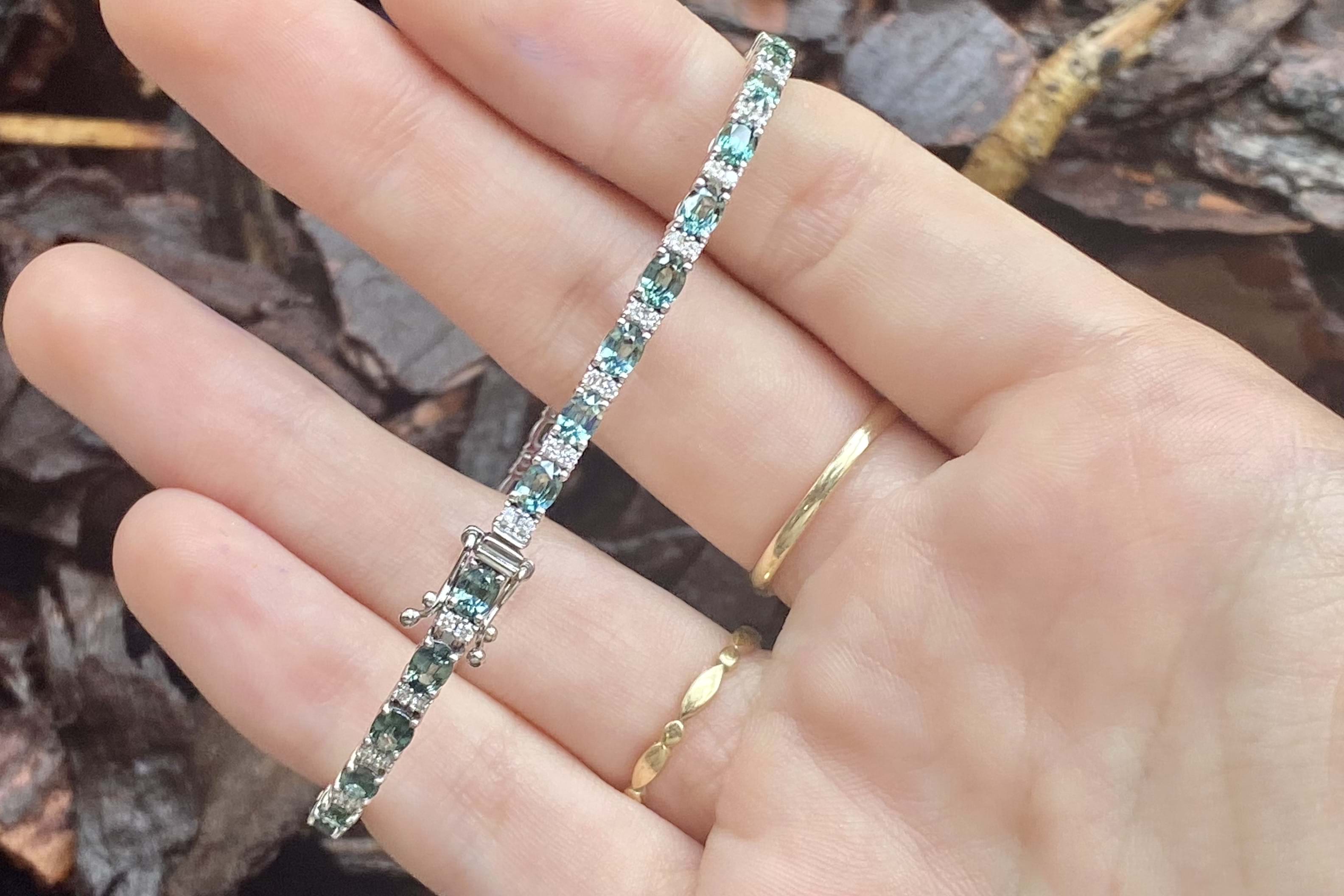 This dazzling bracelet is crafted in 18ct white gold and is set with 30 oval teal sapphires, totalling 5.14ct. It also features 60 round brilliant cut diamonds, set between, alternating with the sapphires. With a total diamond weight of 0.49ct G SI1. Bracelet length is 18cm long with double safety catches. Independent Valuation available upon purchase.