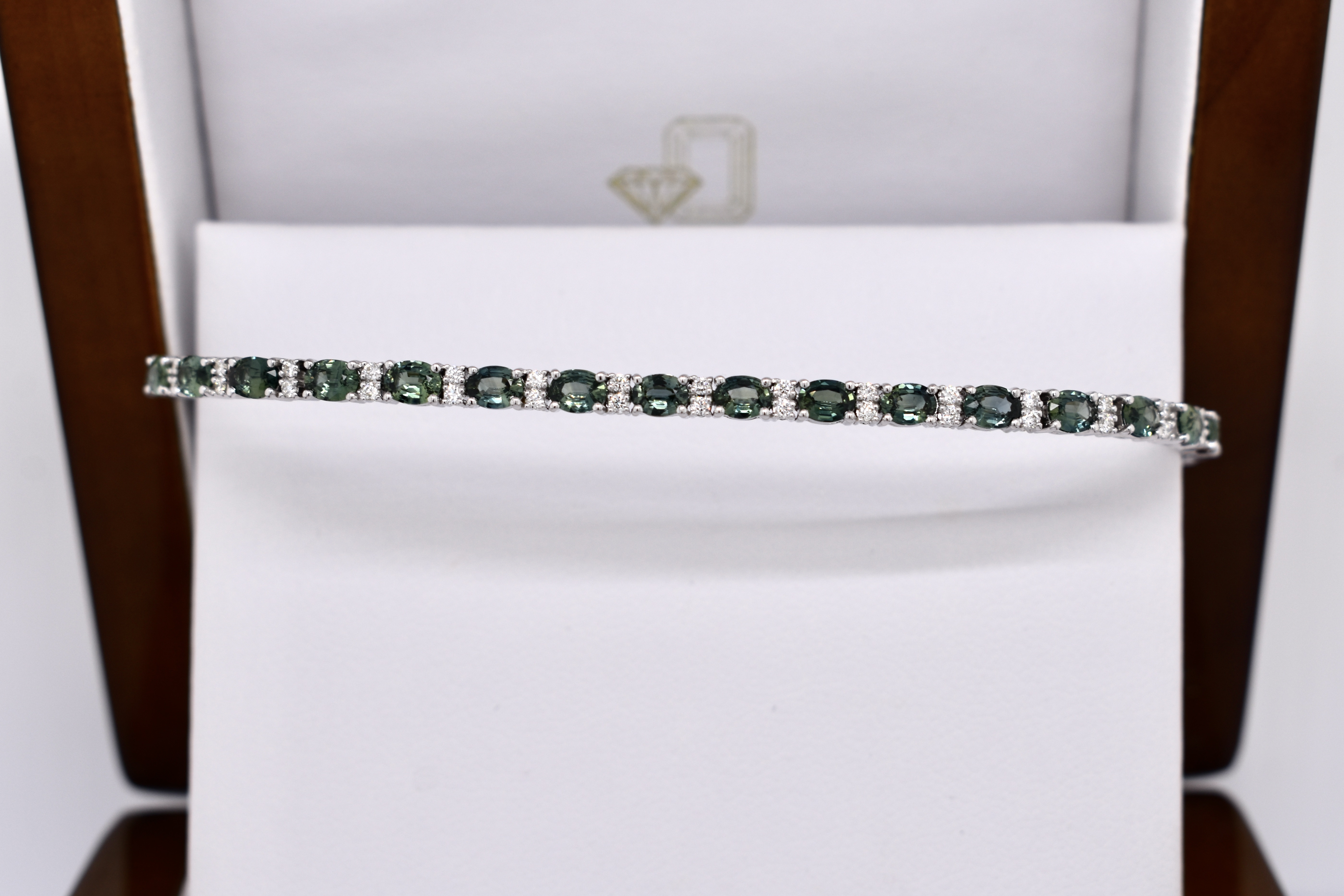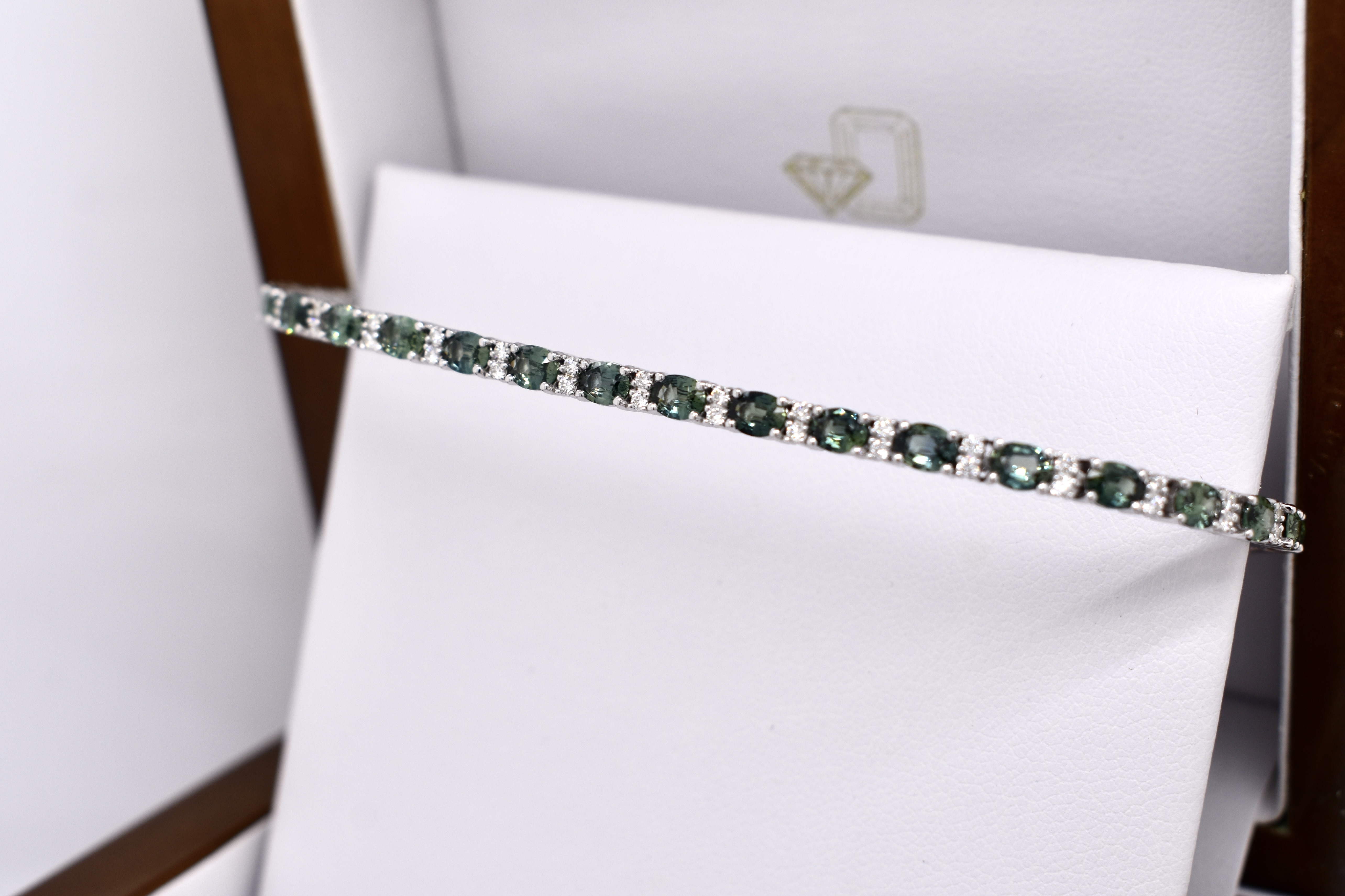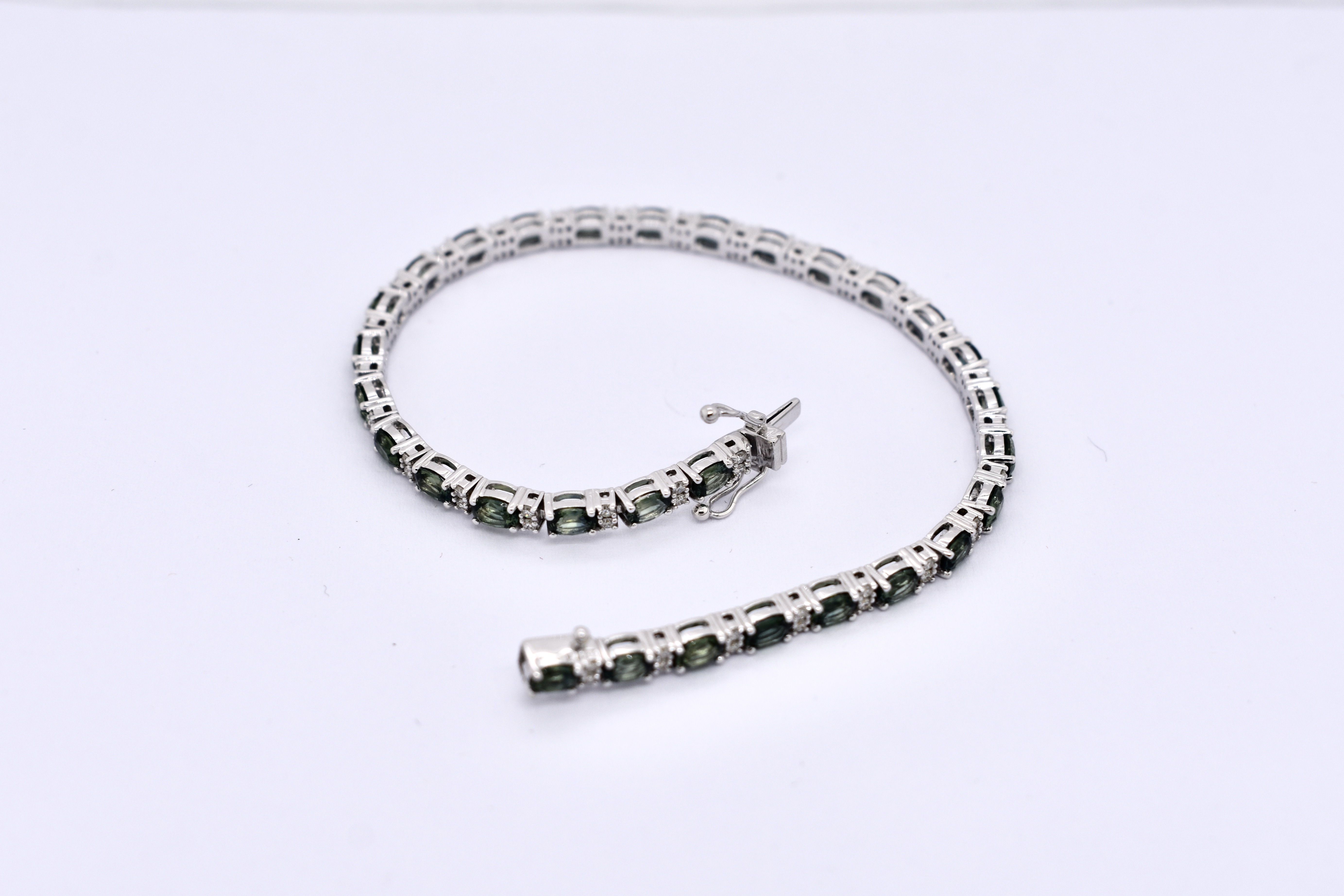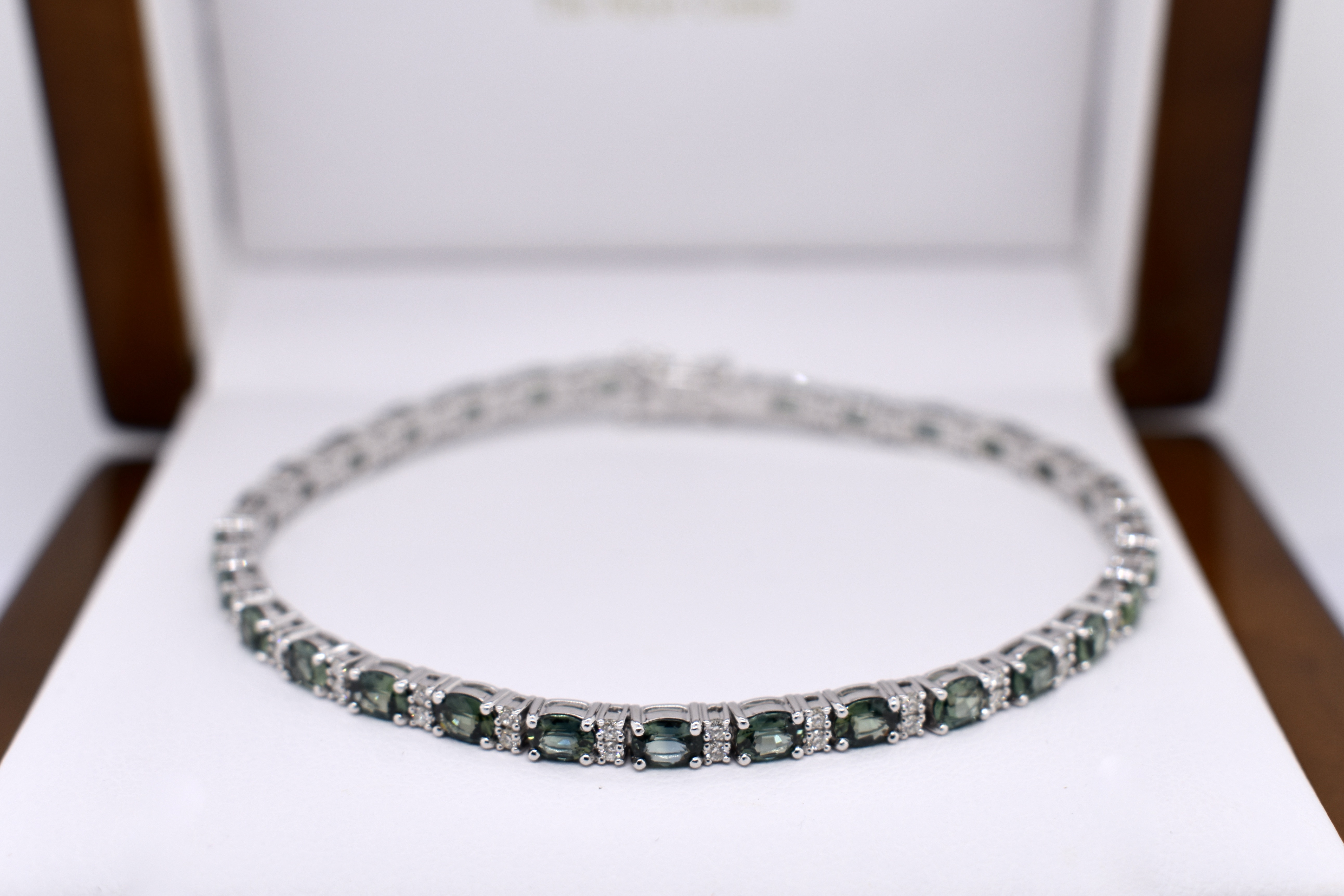 This dazzling bracelet is crafted in 18ct white gold and is set with 30 oval teal sapphires, totalling 5.14ct. It also features 60 round brilliant cut diamonds, set between, alternating with the sapphires. With a total diamond weight of 0.49ct G SI1. Bracelet length is 18cm long with double safety catches. Independent Valuation available upon purchase.