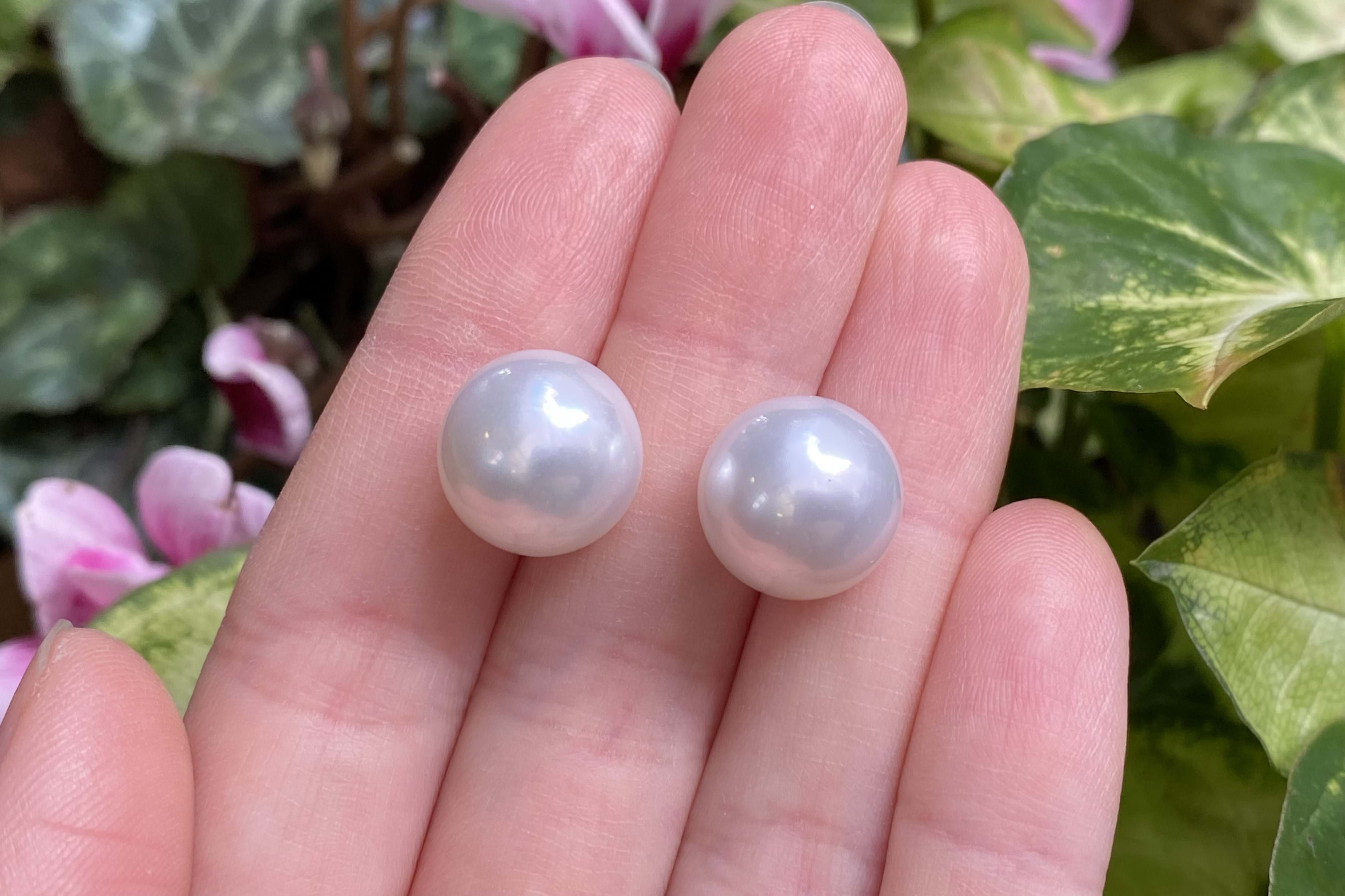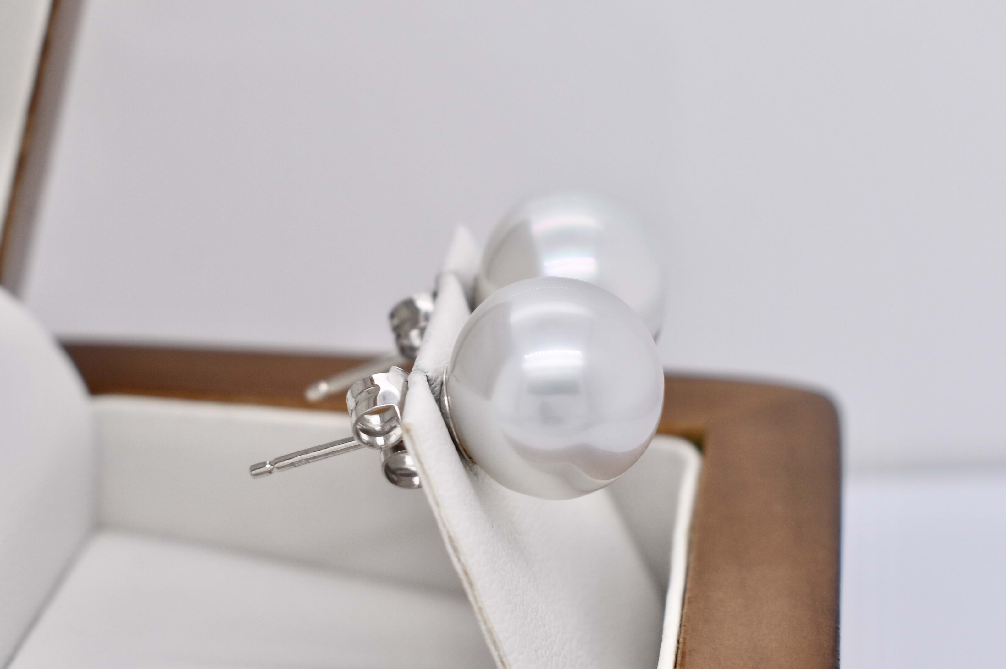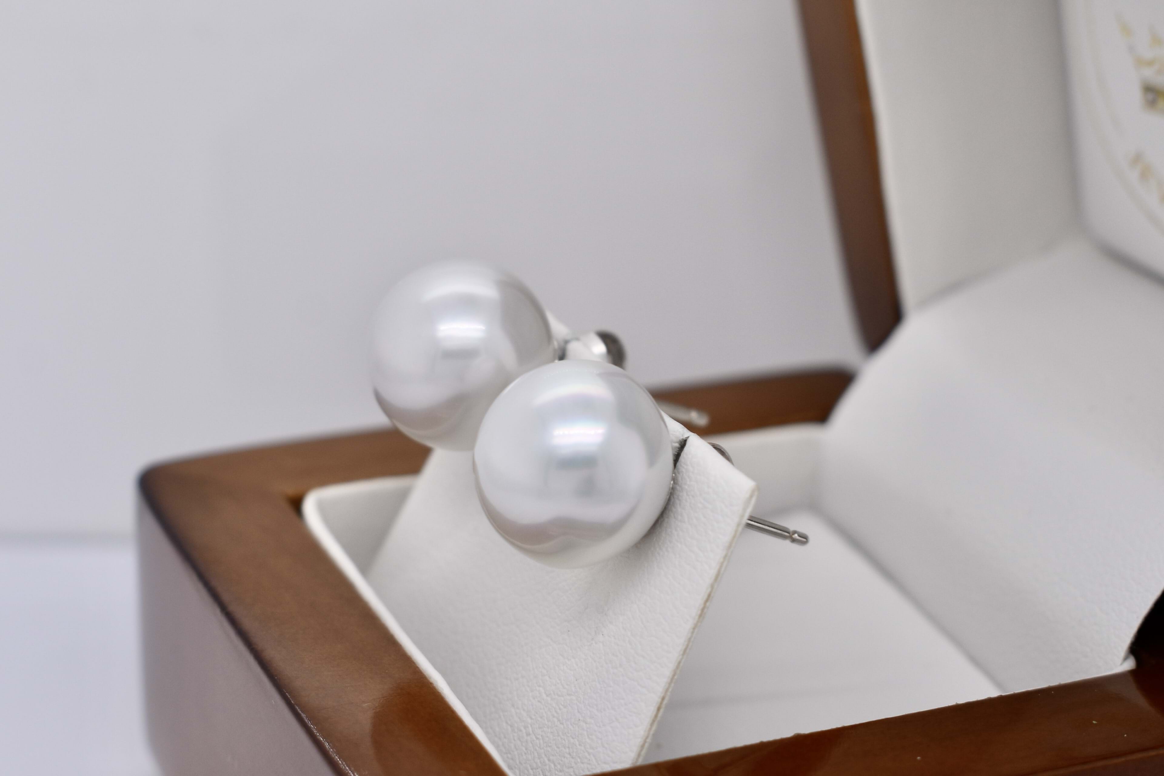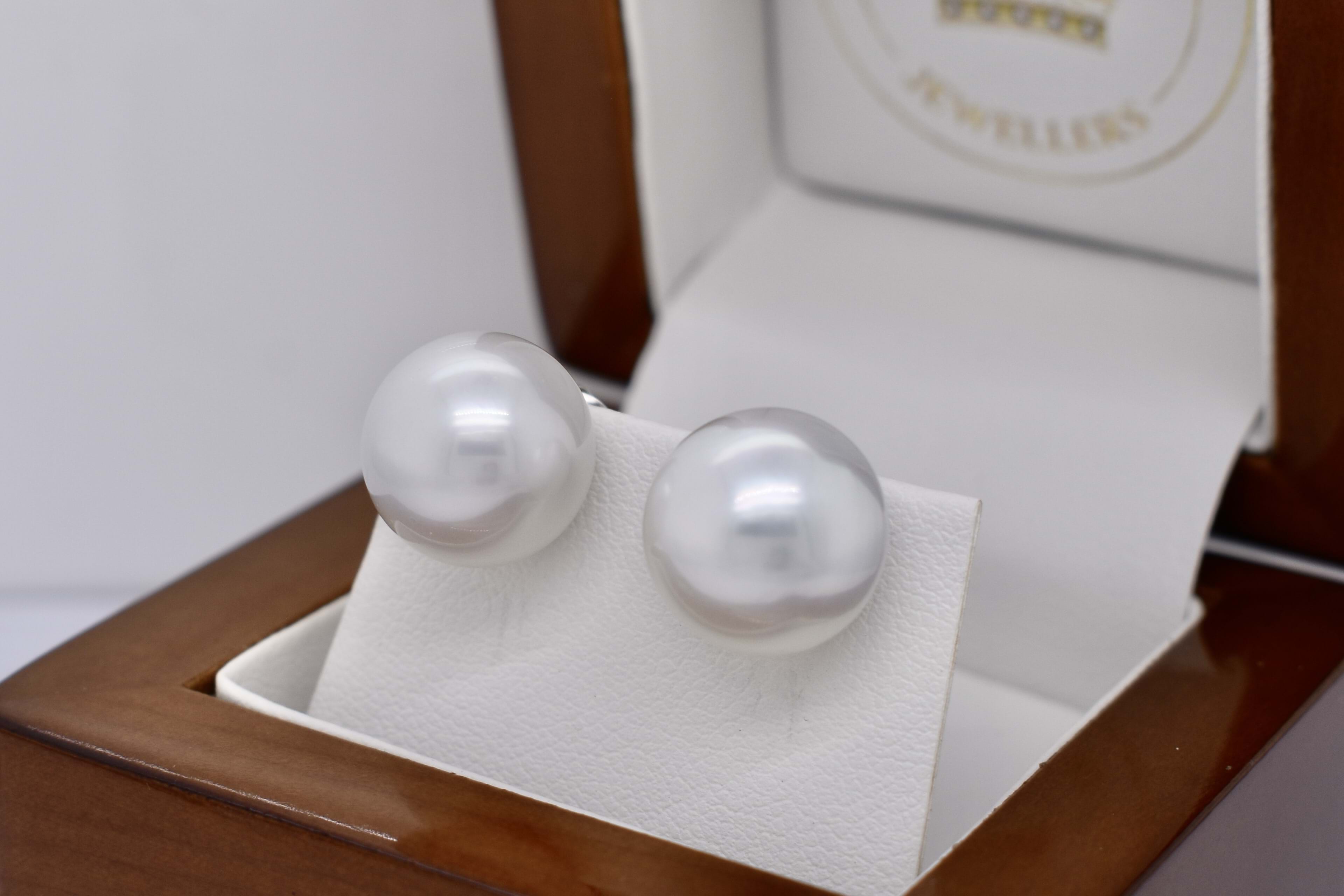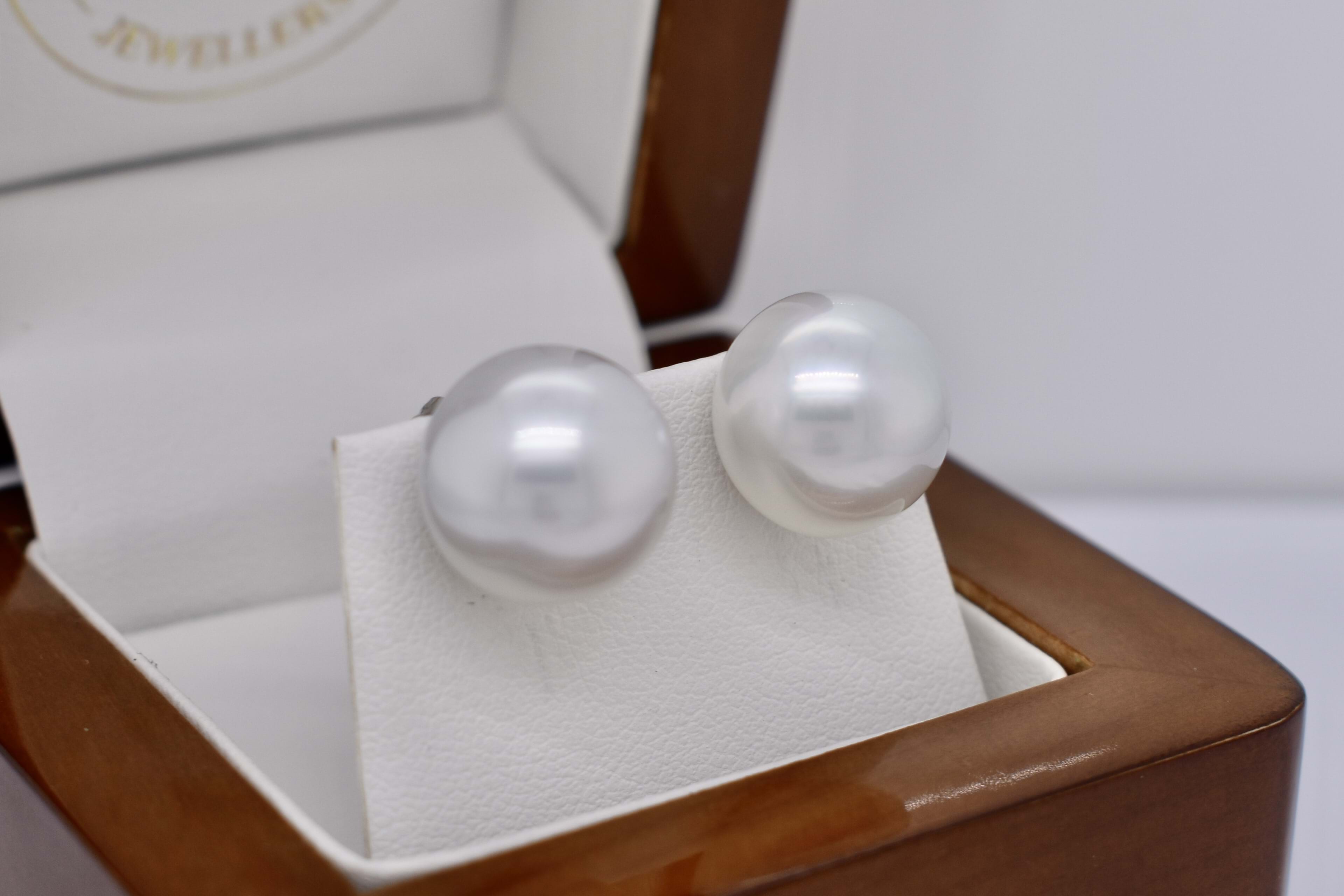 This lovely pair of pearl studs feature large 12-12.5mm near round, white/silver south sea pearls, with a good lustre, in 18ct white gold settings with post and butterfly fittings. Independent Valuation Supplied.