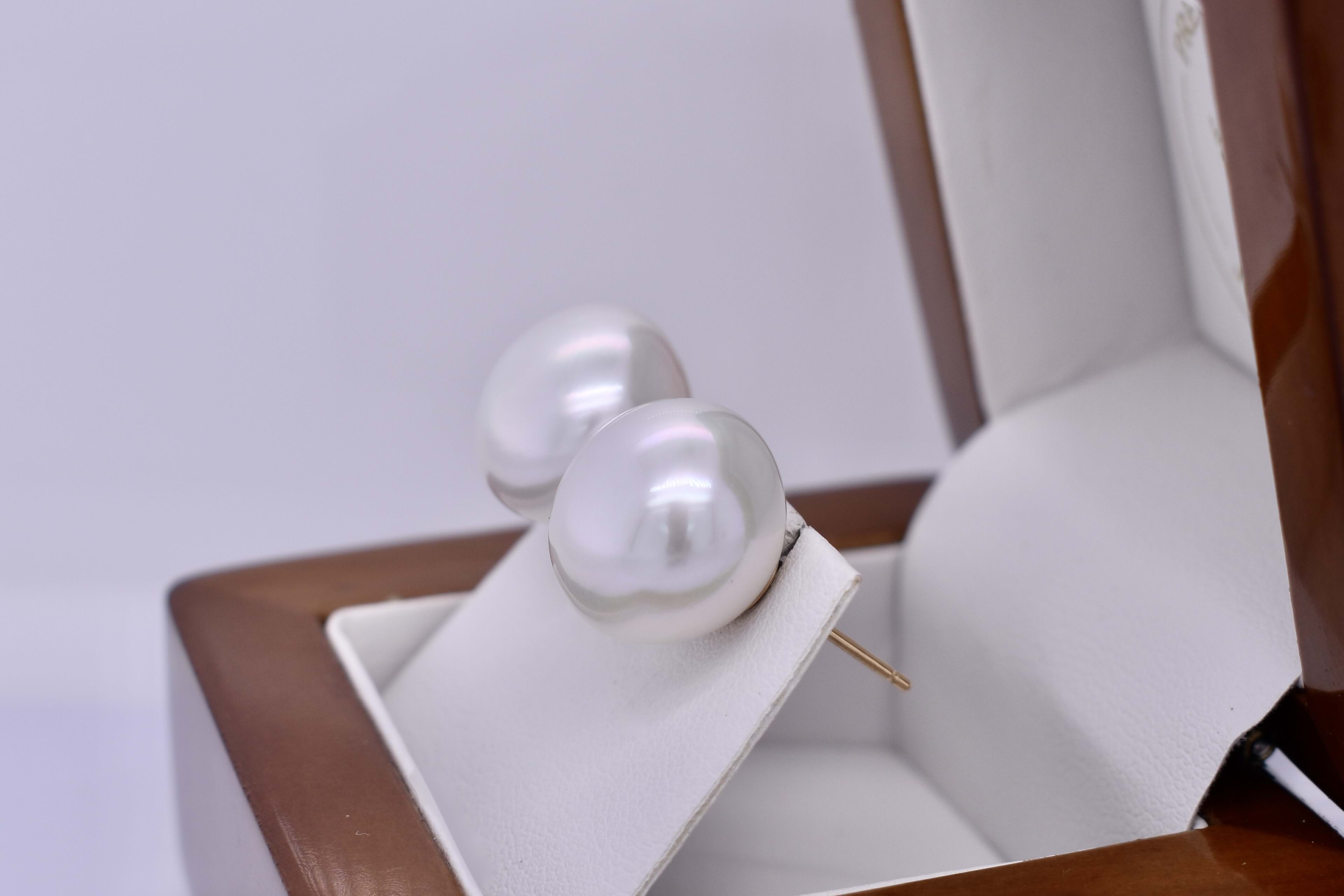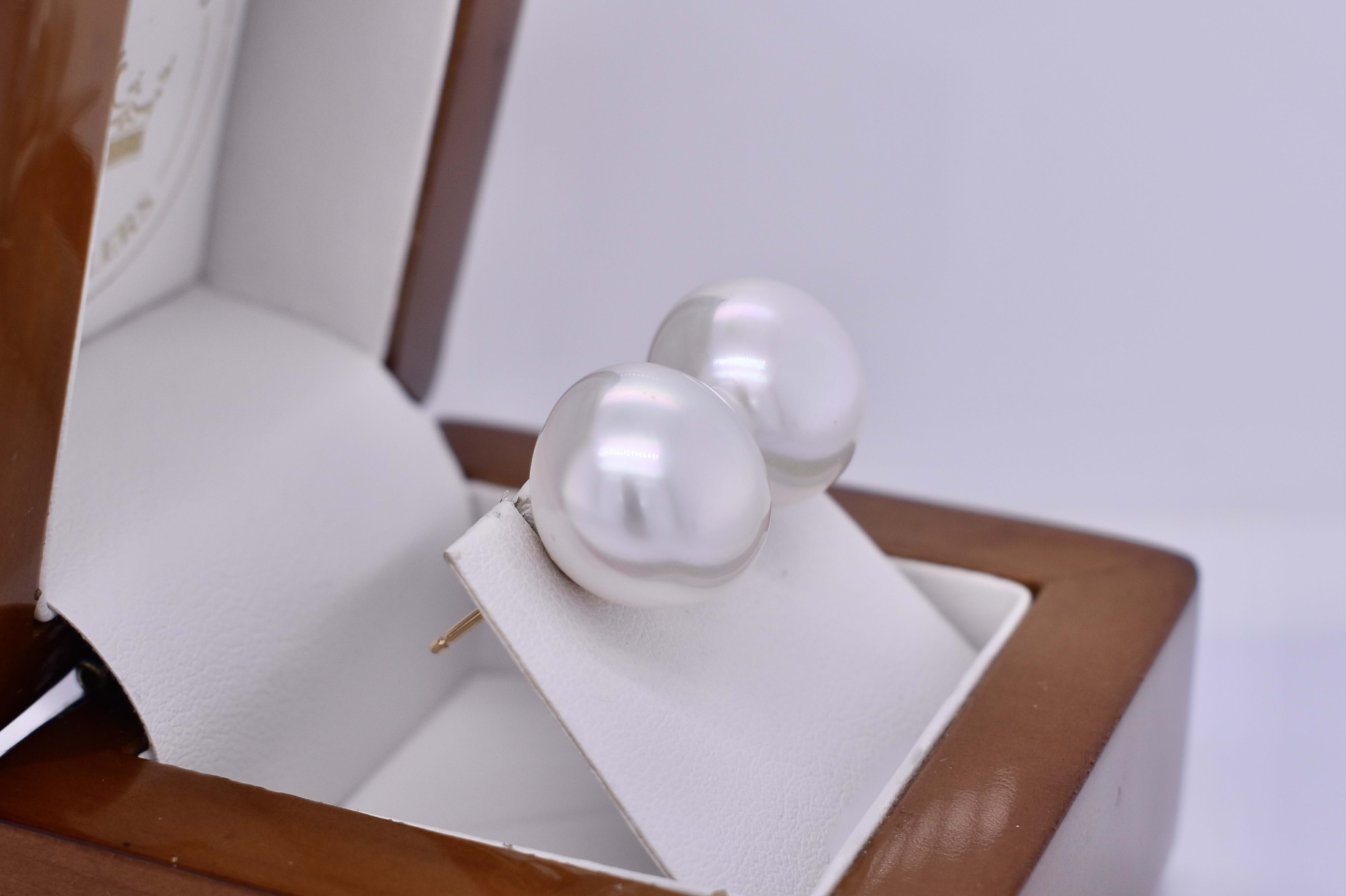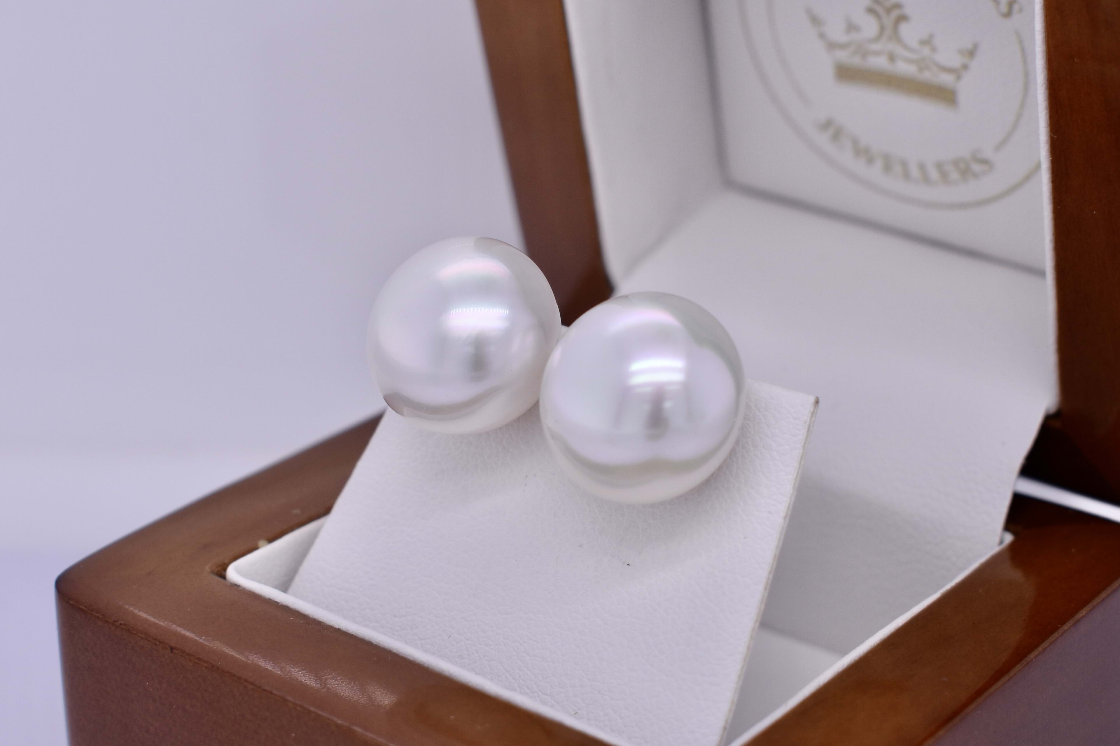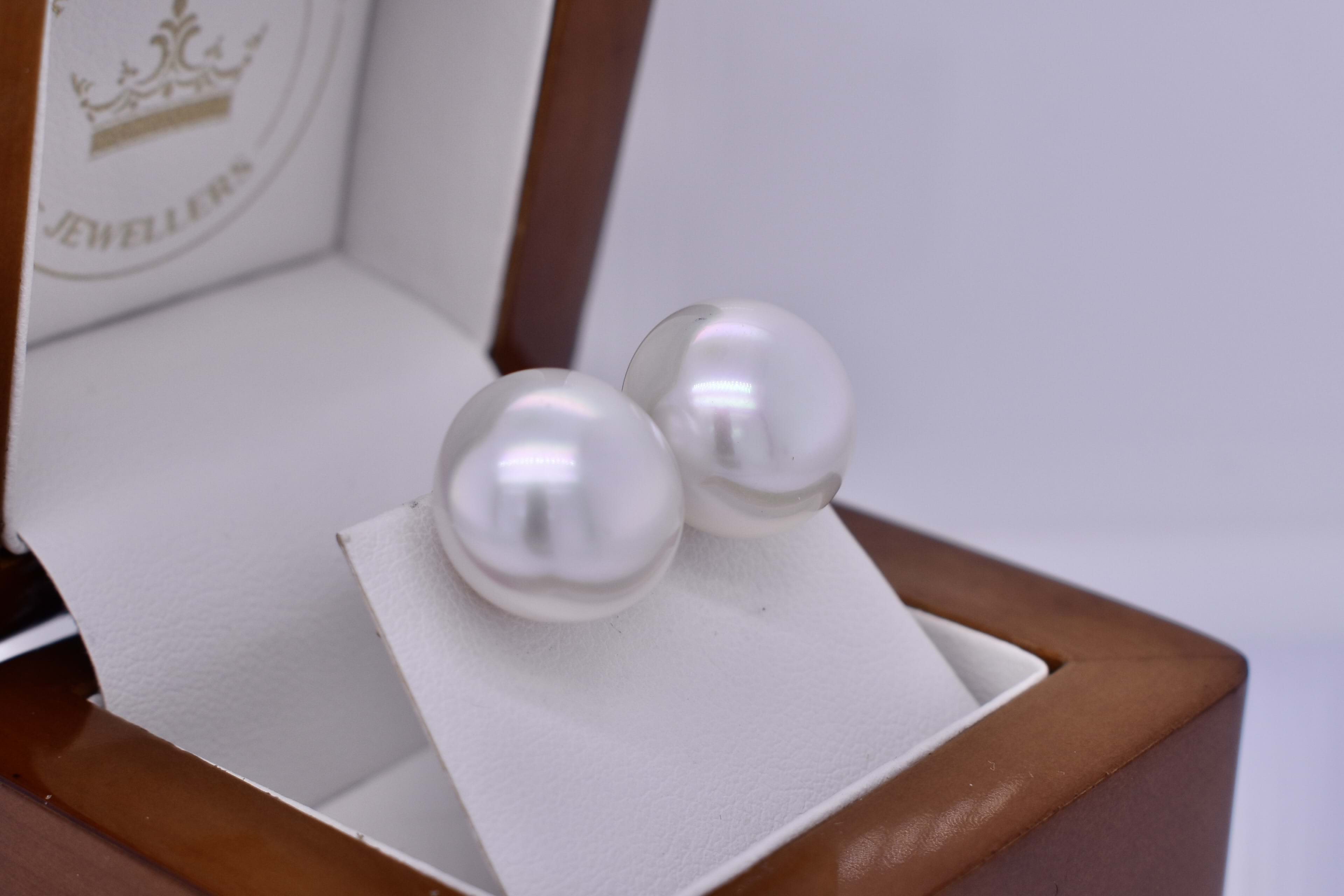 Classic pair of pearl earrings, with two 14.0-14.5mm near round white south sea pearls with a high lustre in 18ct white gold studs with post and butterfly fittings. Independent Valuation Supplied.