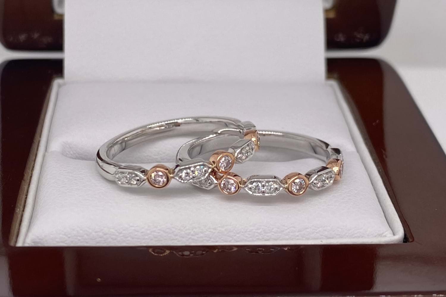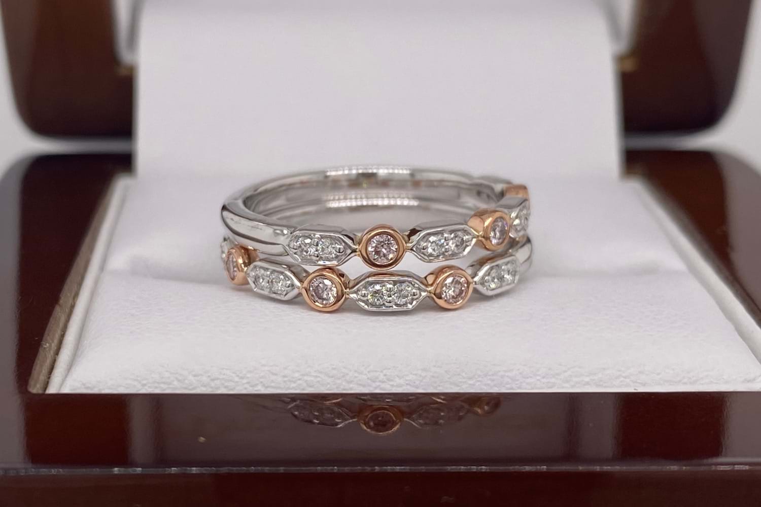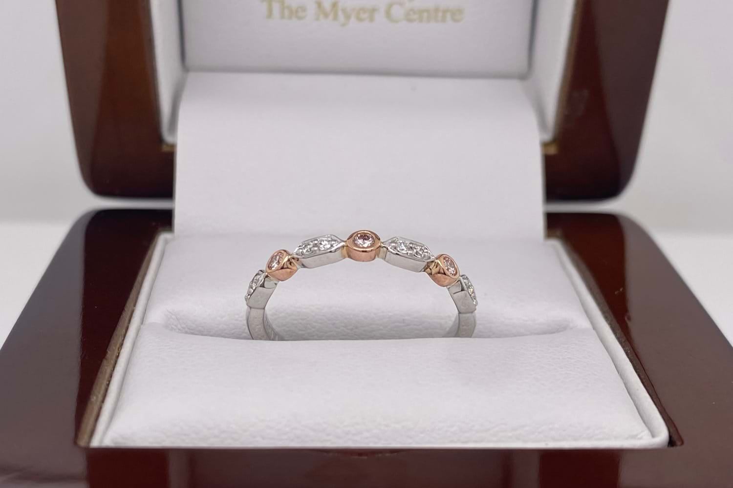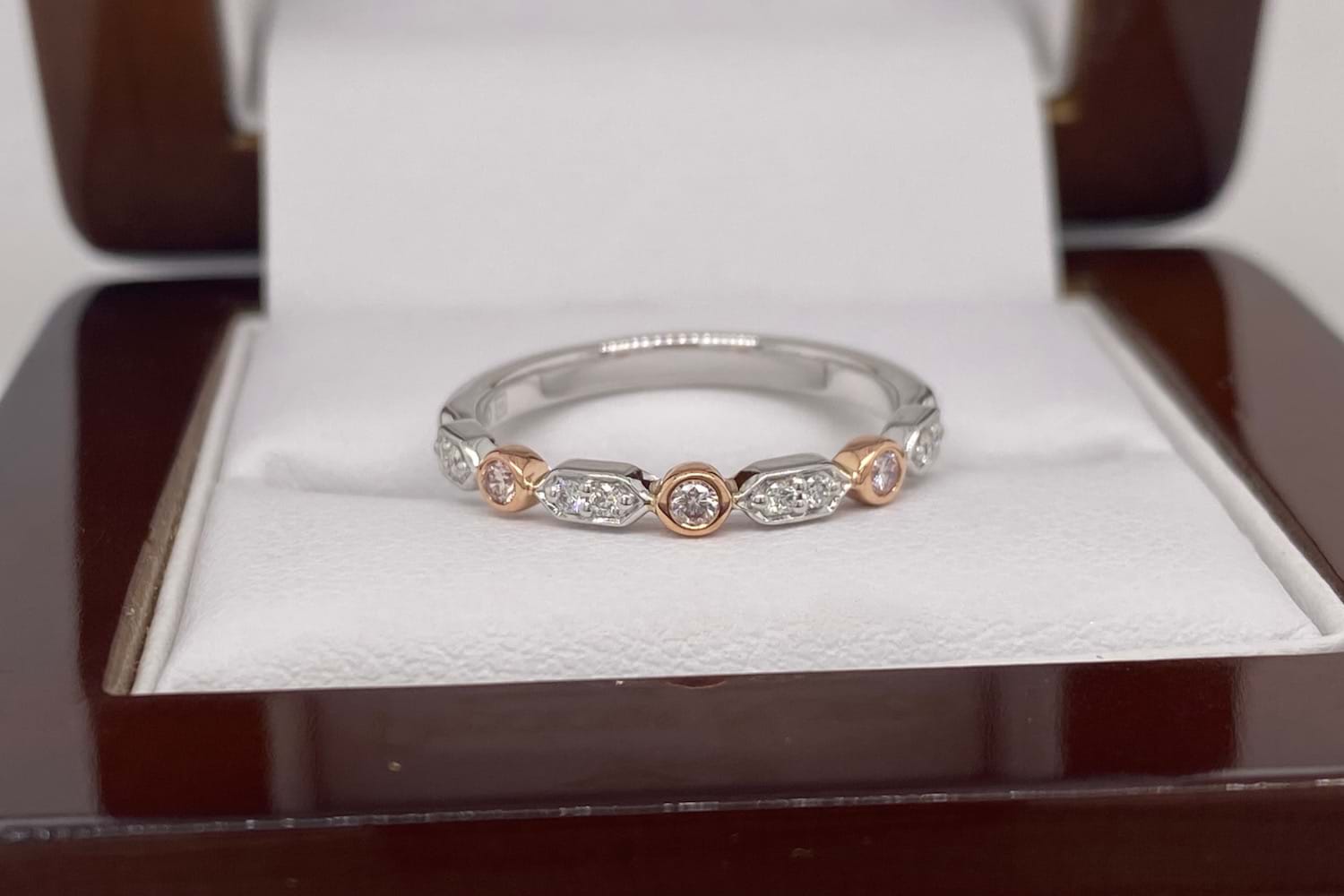 Stunning Art Deco inspired band crafted in 18ct white and rose gold featuring three Argyle pink diamonds totalling 0.07ct (NCP/SI) and eight white diamonds equalling 0.06cts (GSI). Finger size L. Priced per band. Argyle lot number & Independent Valuation Supplied