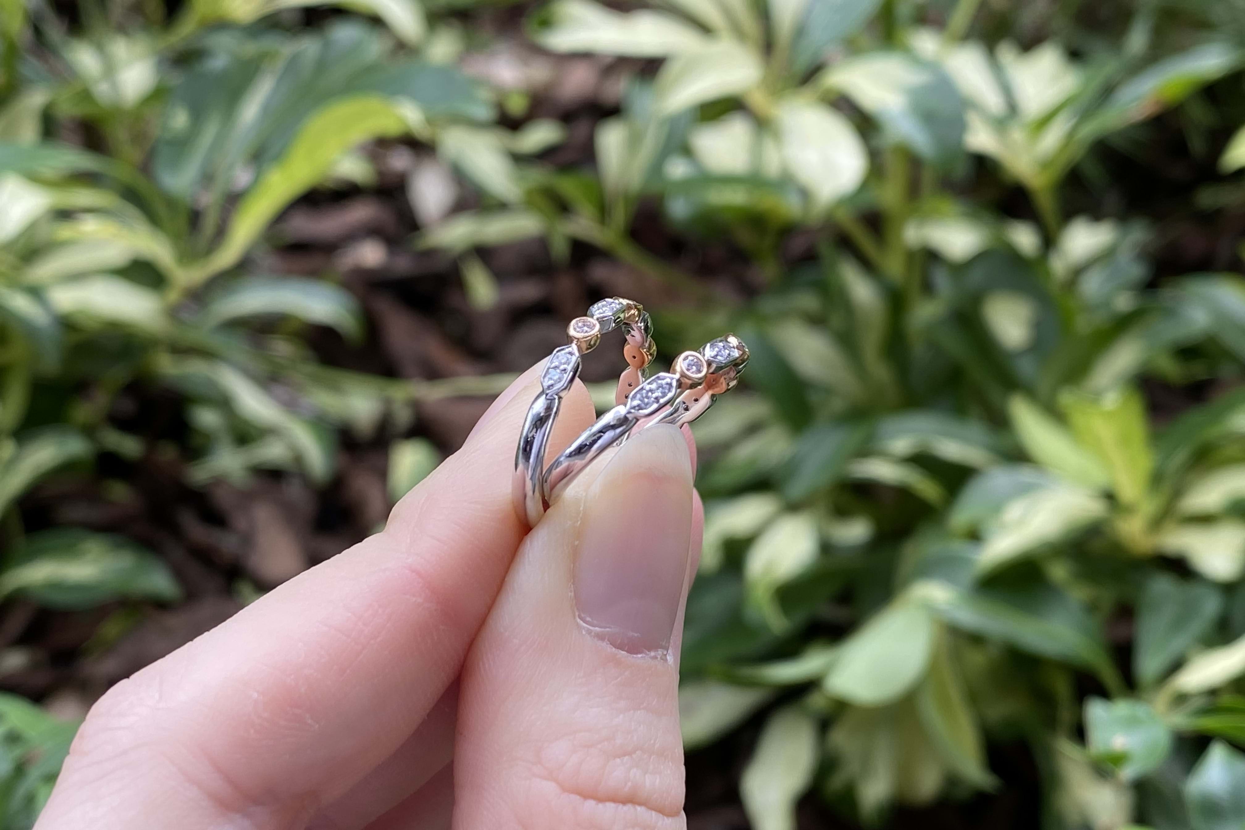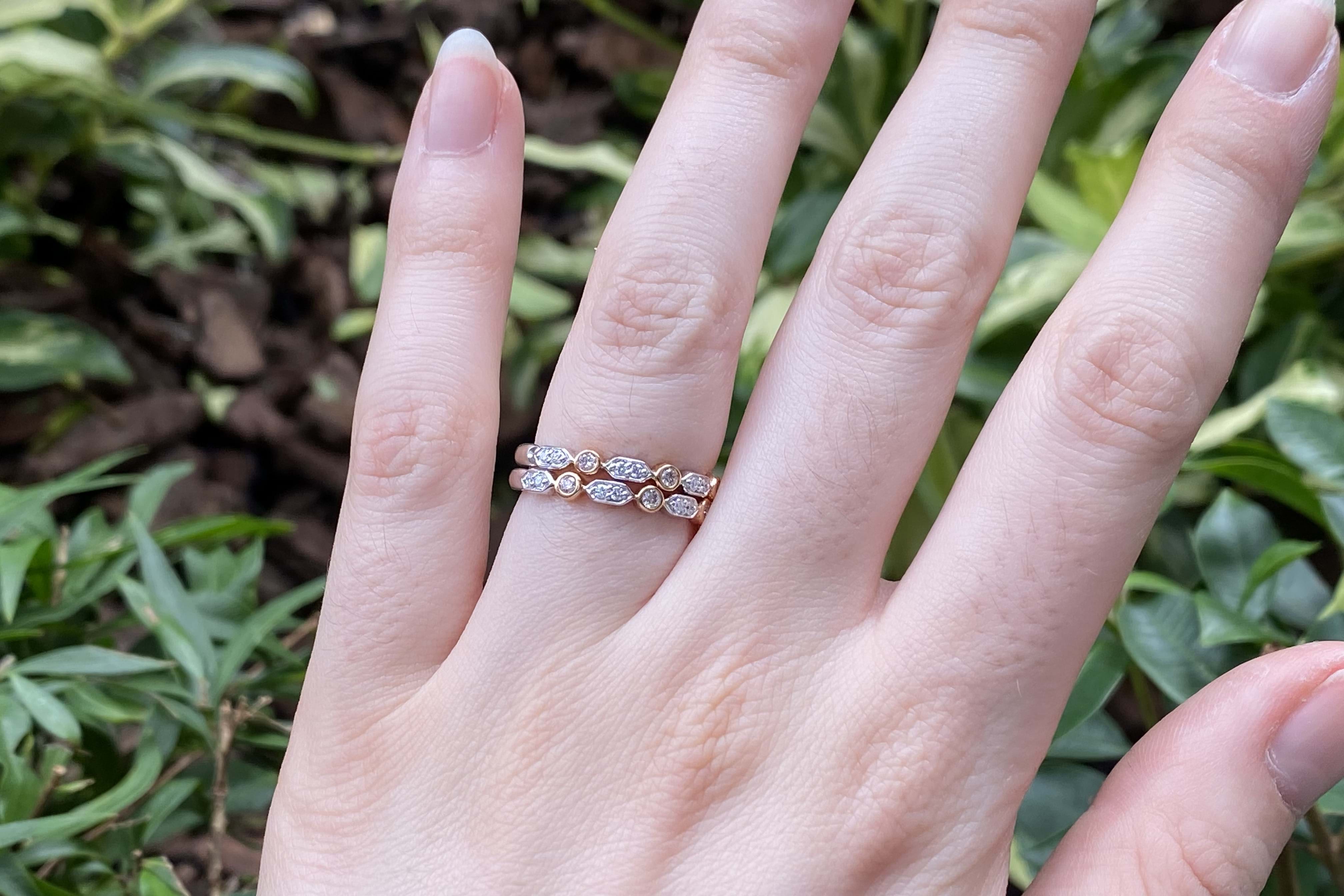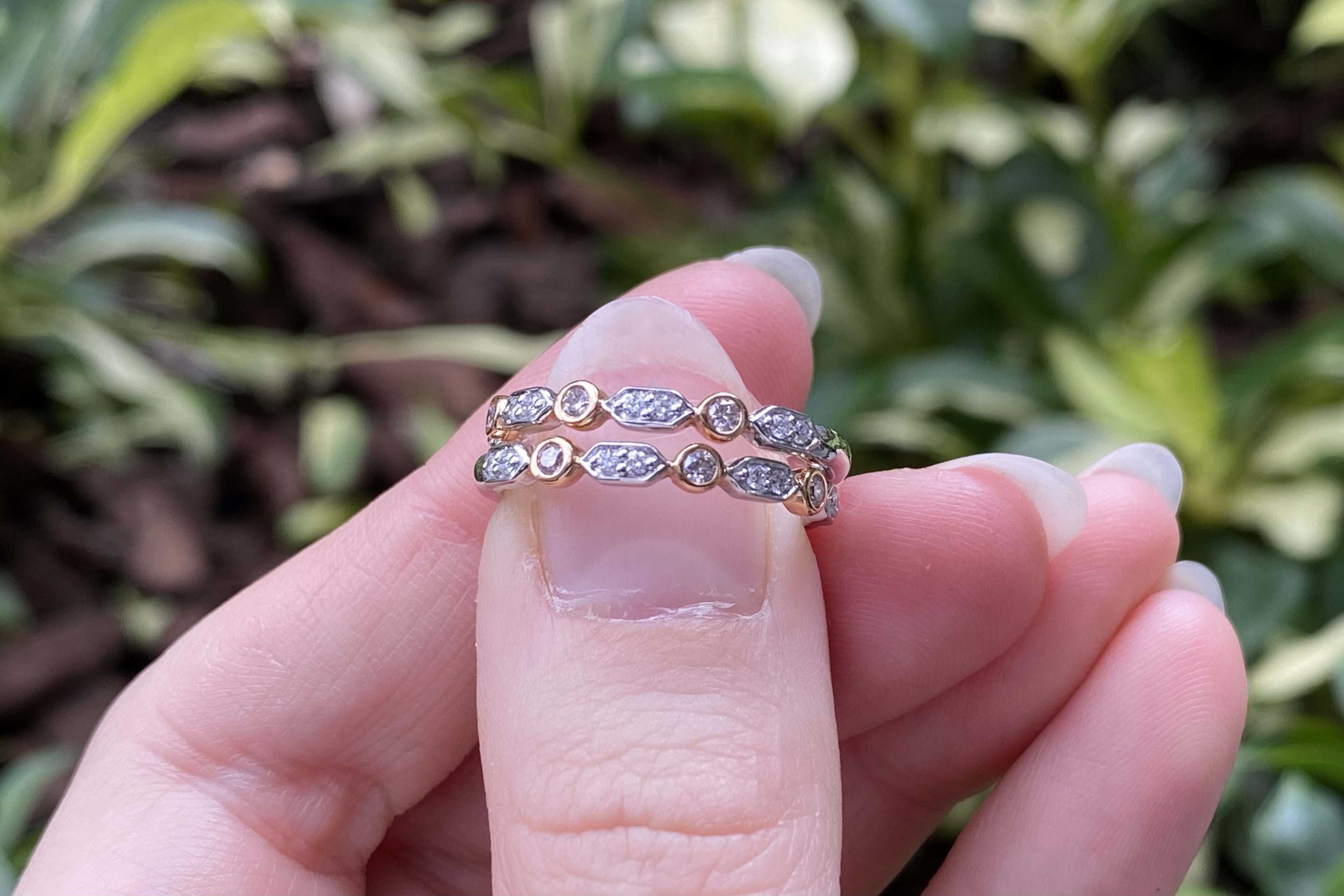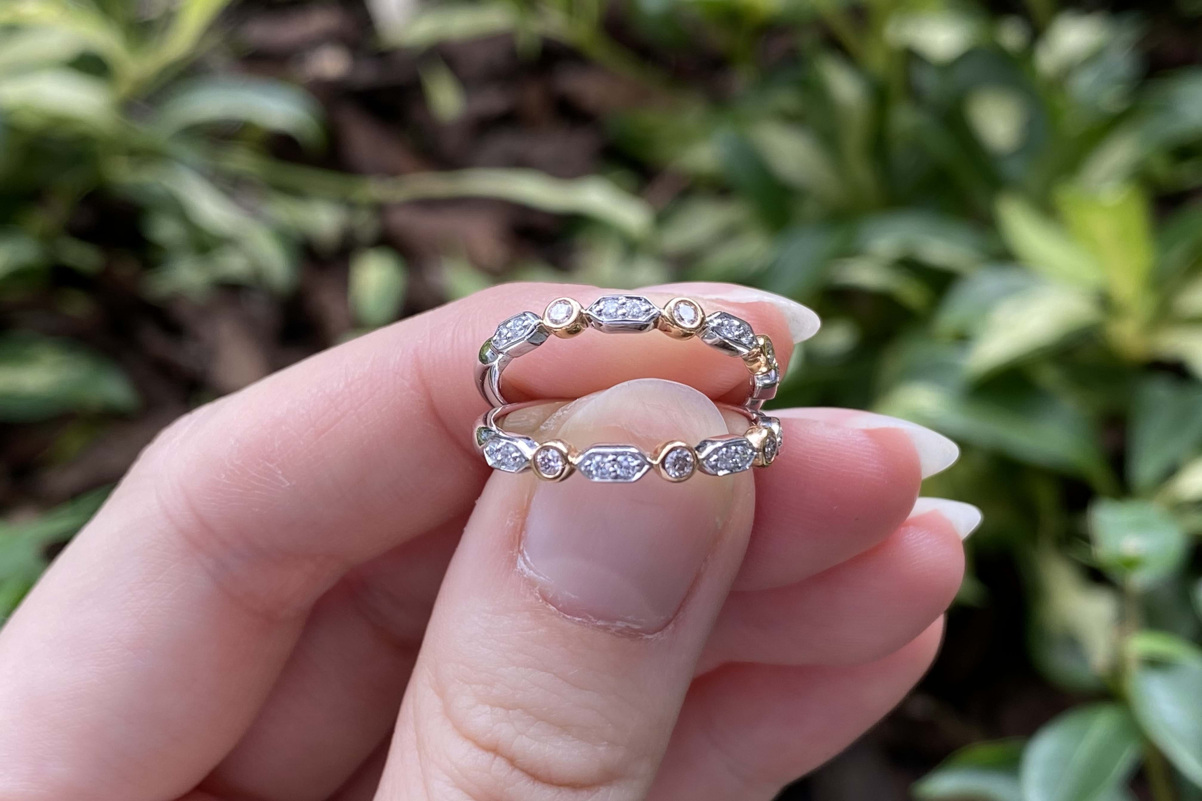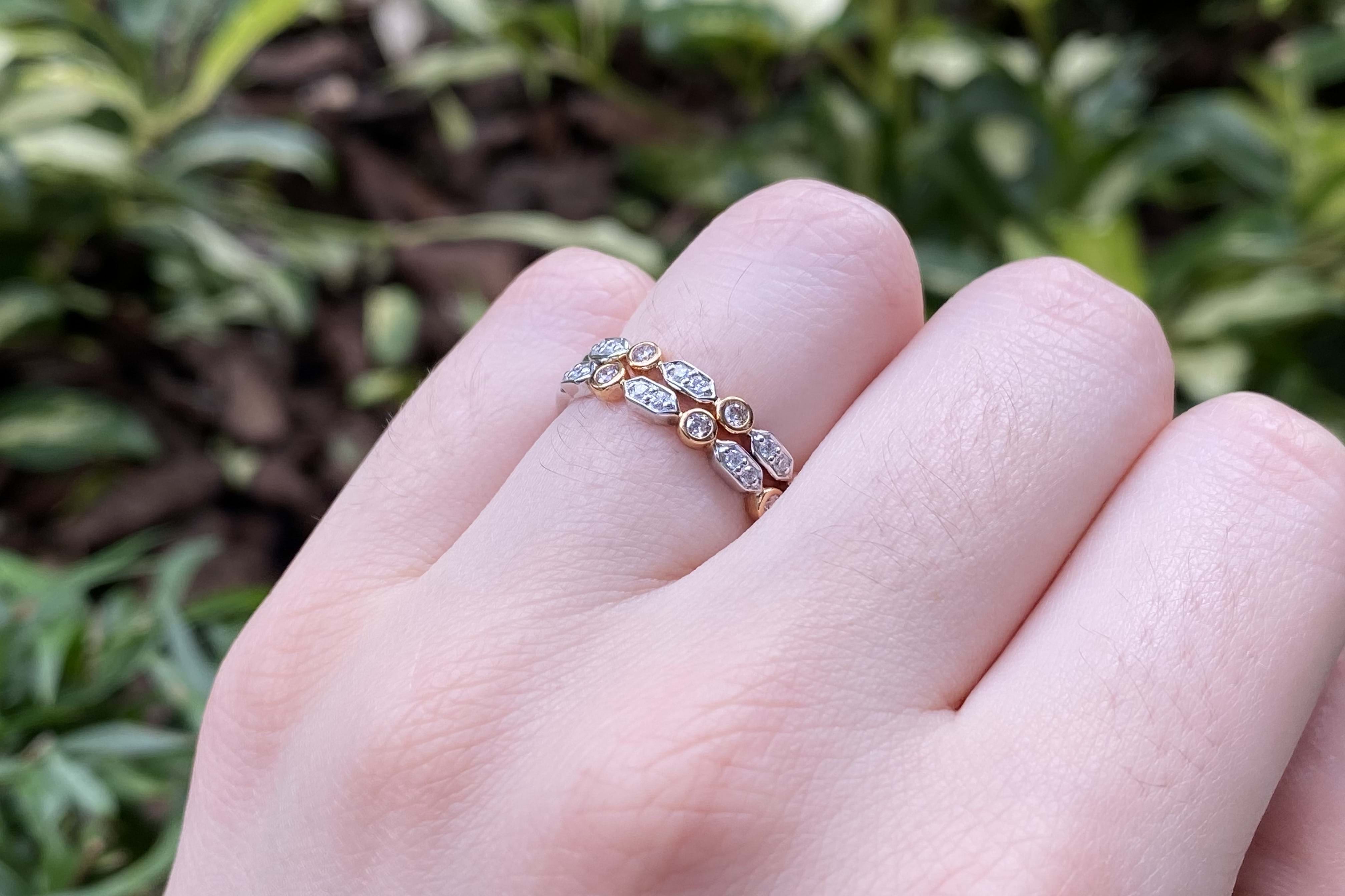 Stunning Art Deco inspired band crafted in 18ct white and rose gold featuring three Argyle pink diamonds totalling 0.07ct (NCP/SI) and eight white diamonds equalling 0.06cts (GSI). Finger size L. Priced per band. Argyle lot number & Independent Valuation Supplied
