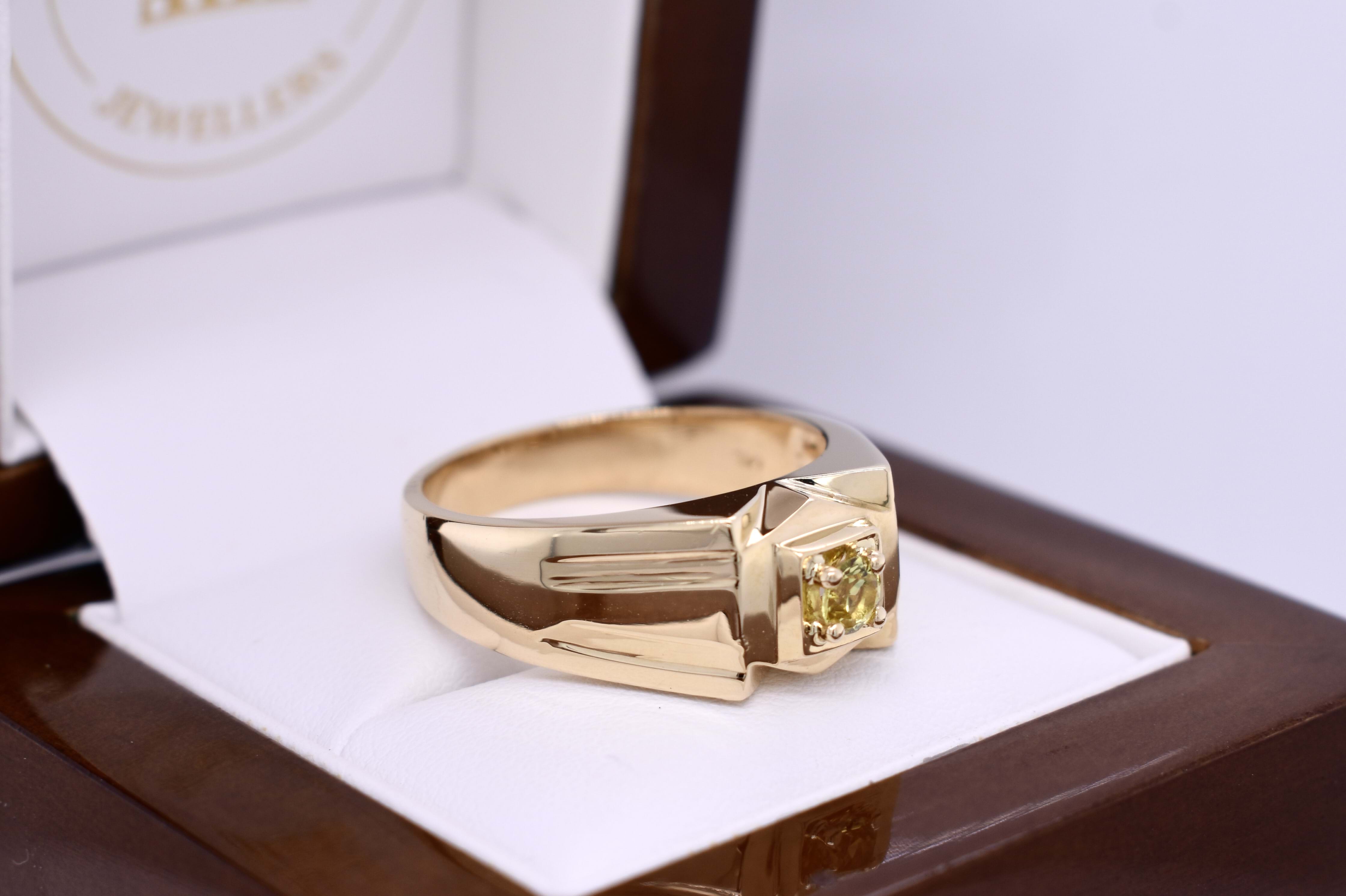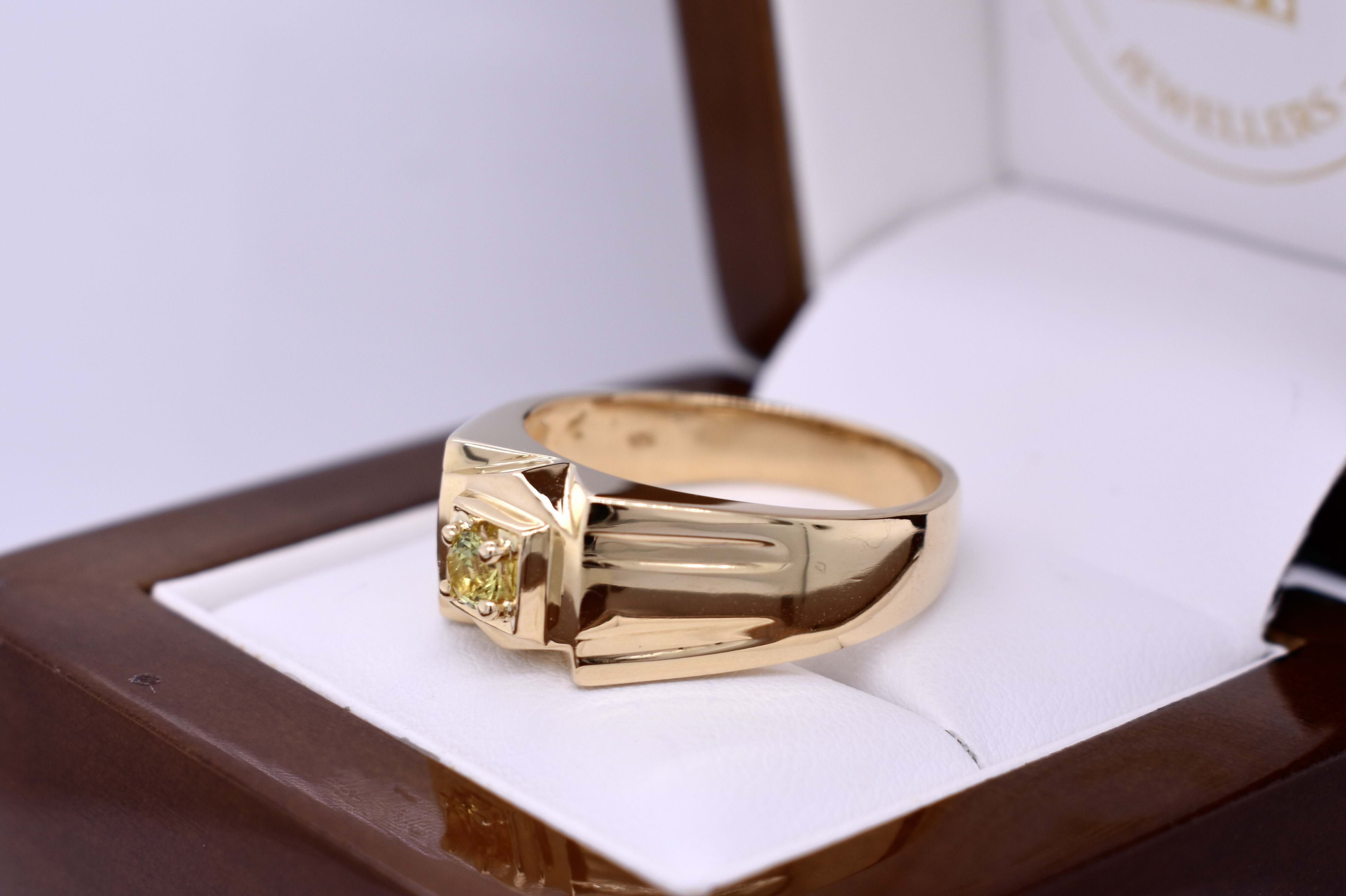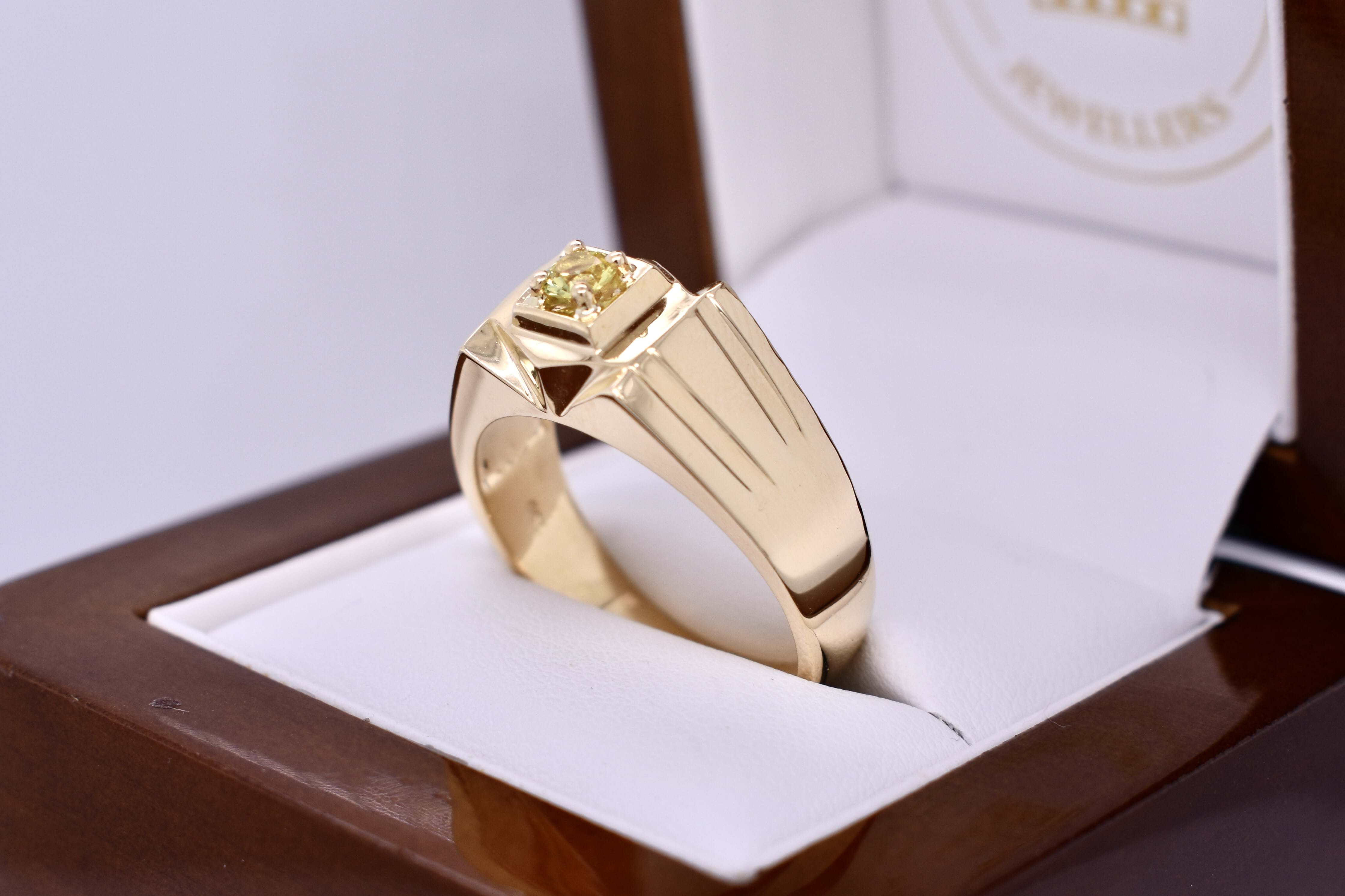 This ring is crafted in 18ct yellow gold with a flat, raised top and features a round, greenish yellow Australian sapphire weighing approx. 0.25ct, four claw set in the centre. The ring has grooved tapered shoulders, measuring 9.6mm wide at the top and 4.3mm at the band. Finger size X. Total weight 11.3grams. Independent valuation supplied.