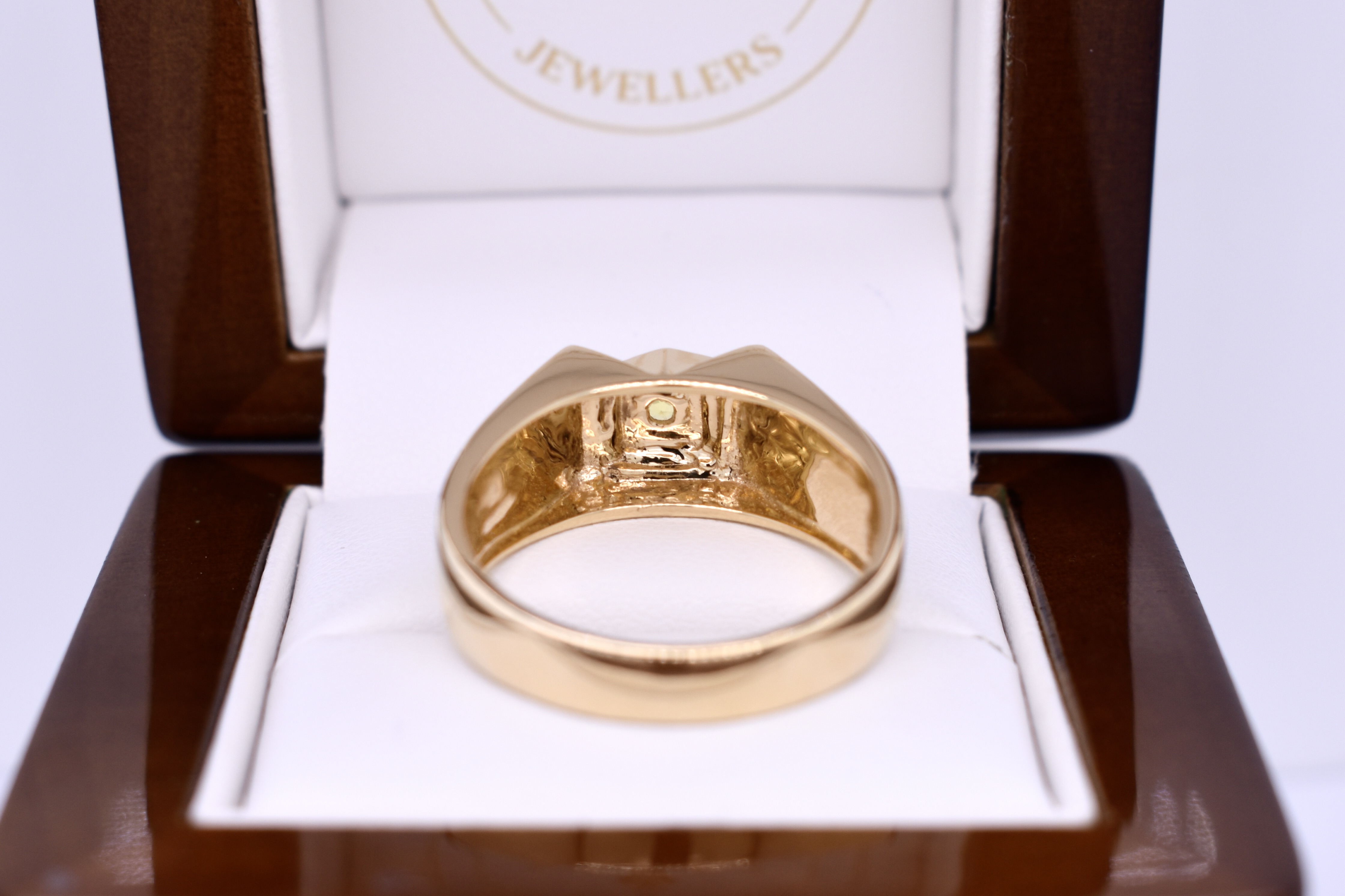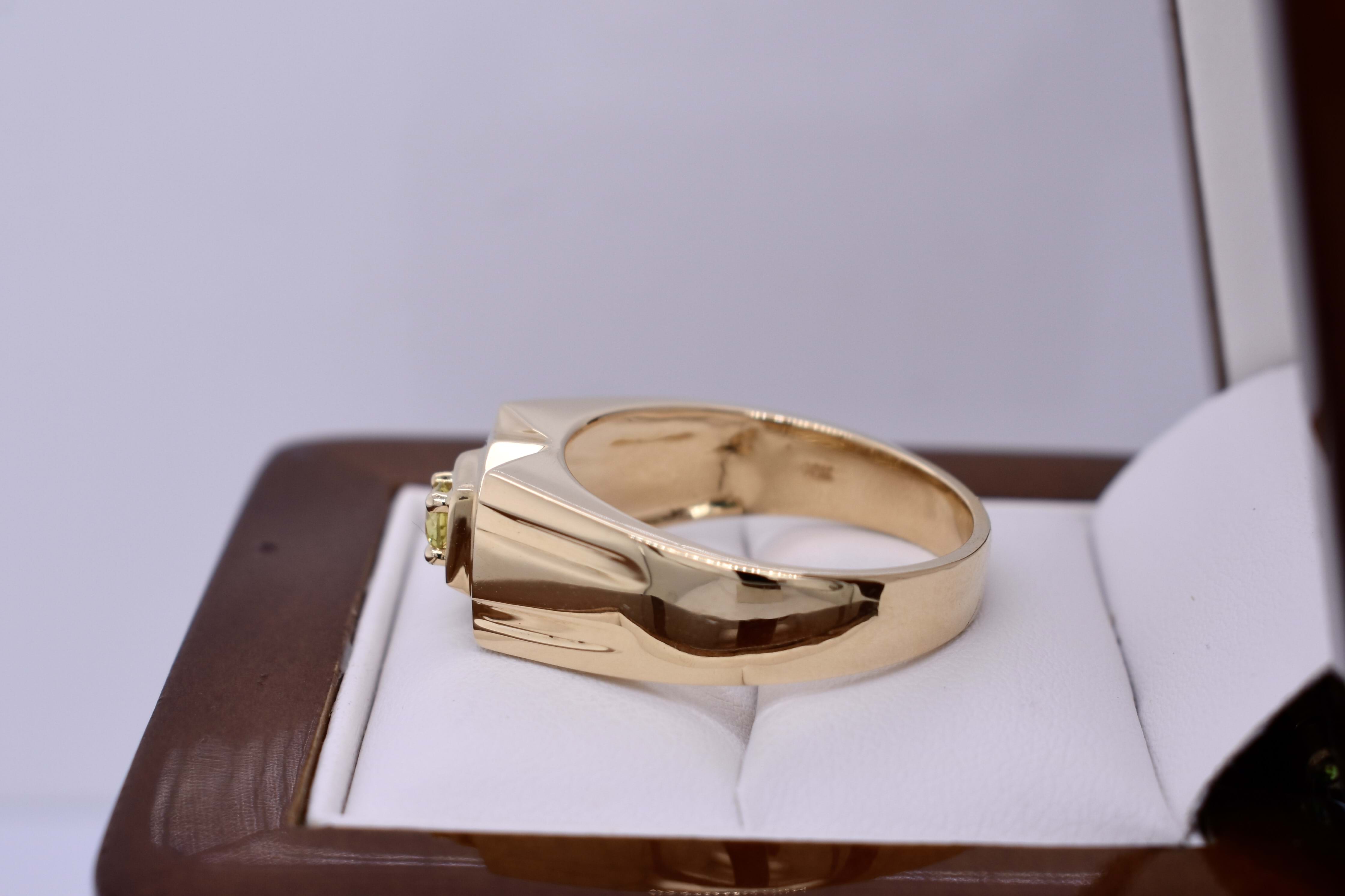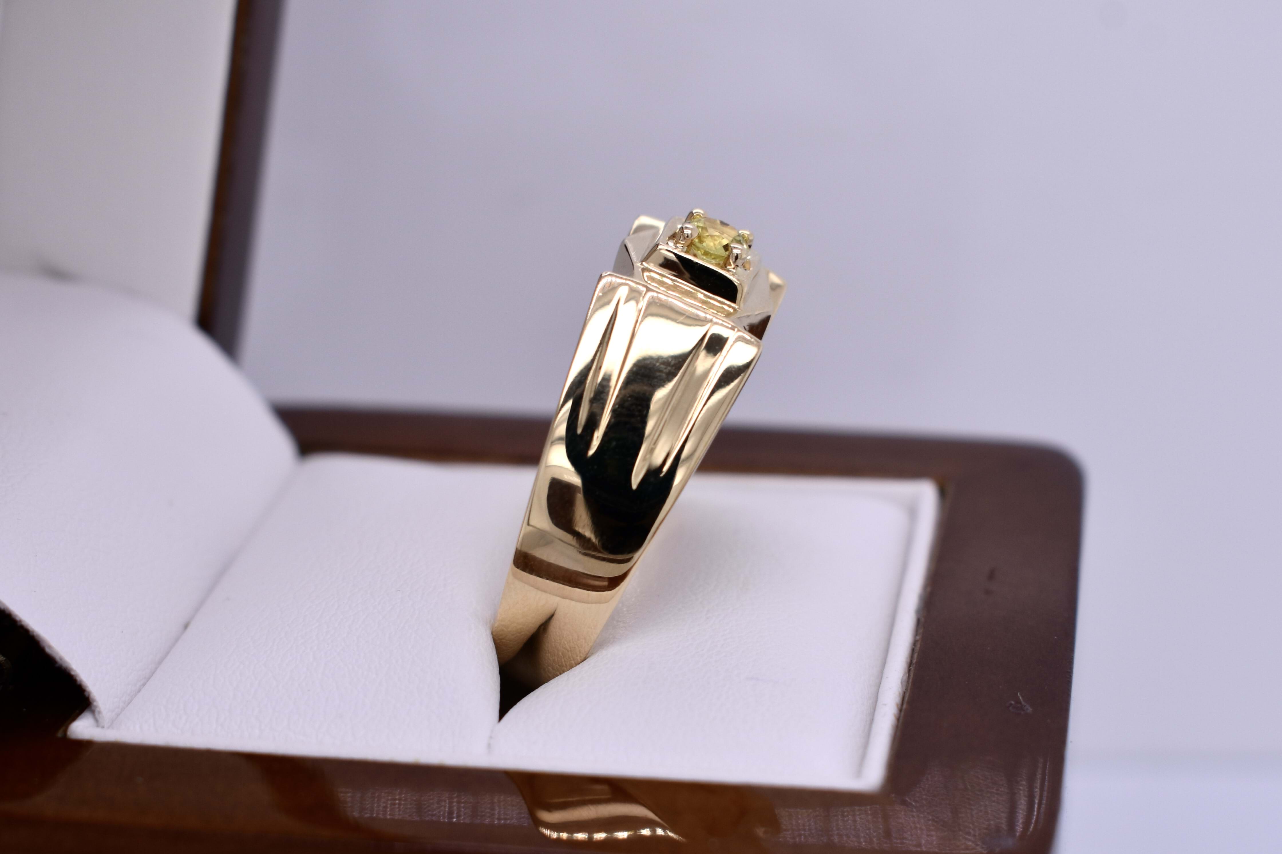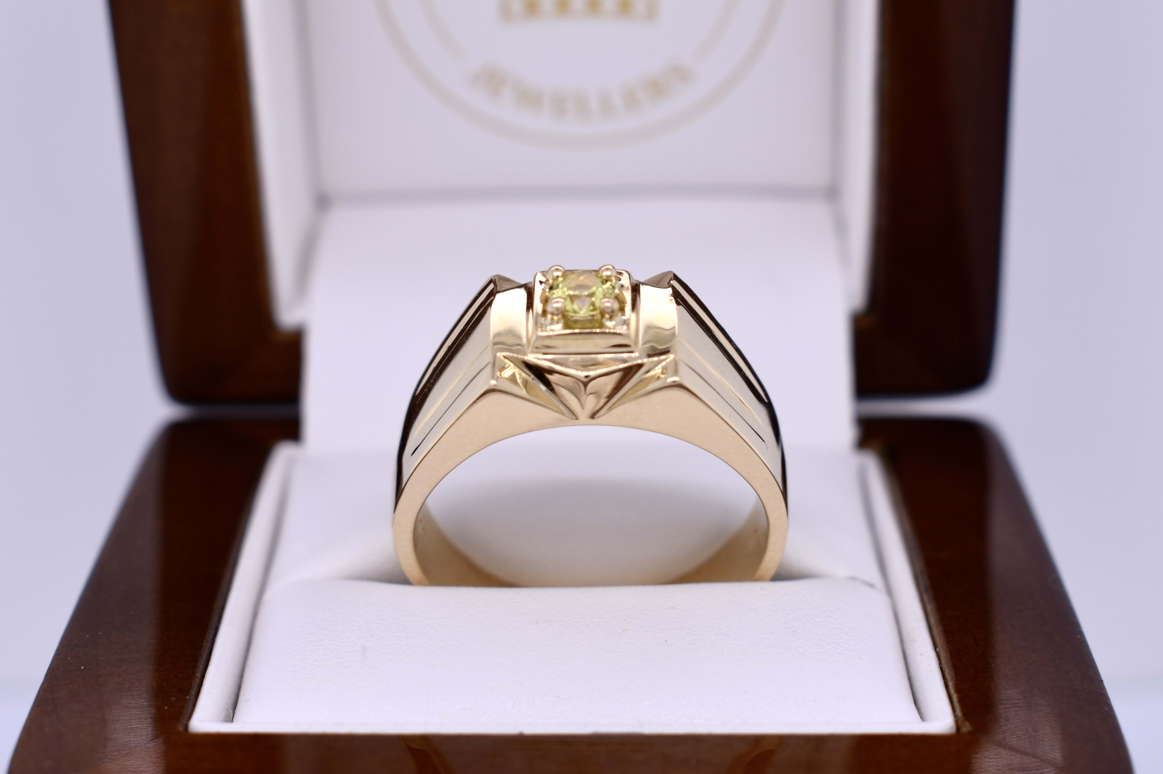 This ring is crafted in 18ct yellow gold with a flat, raised top and features a round, greenish yellow Australian sapphire weighing approx. 0.25ct, four claw set in the centre. The ring has grooved tapered shoulders, measuring 9.6mm wide at the top and 4.3mm at the band. Finger size X. Total weight 11.3grams. Independent valuation supplied.
