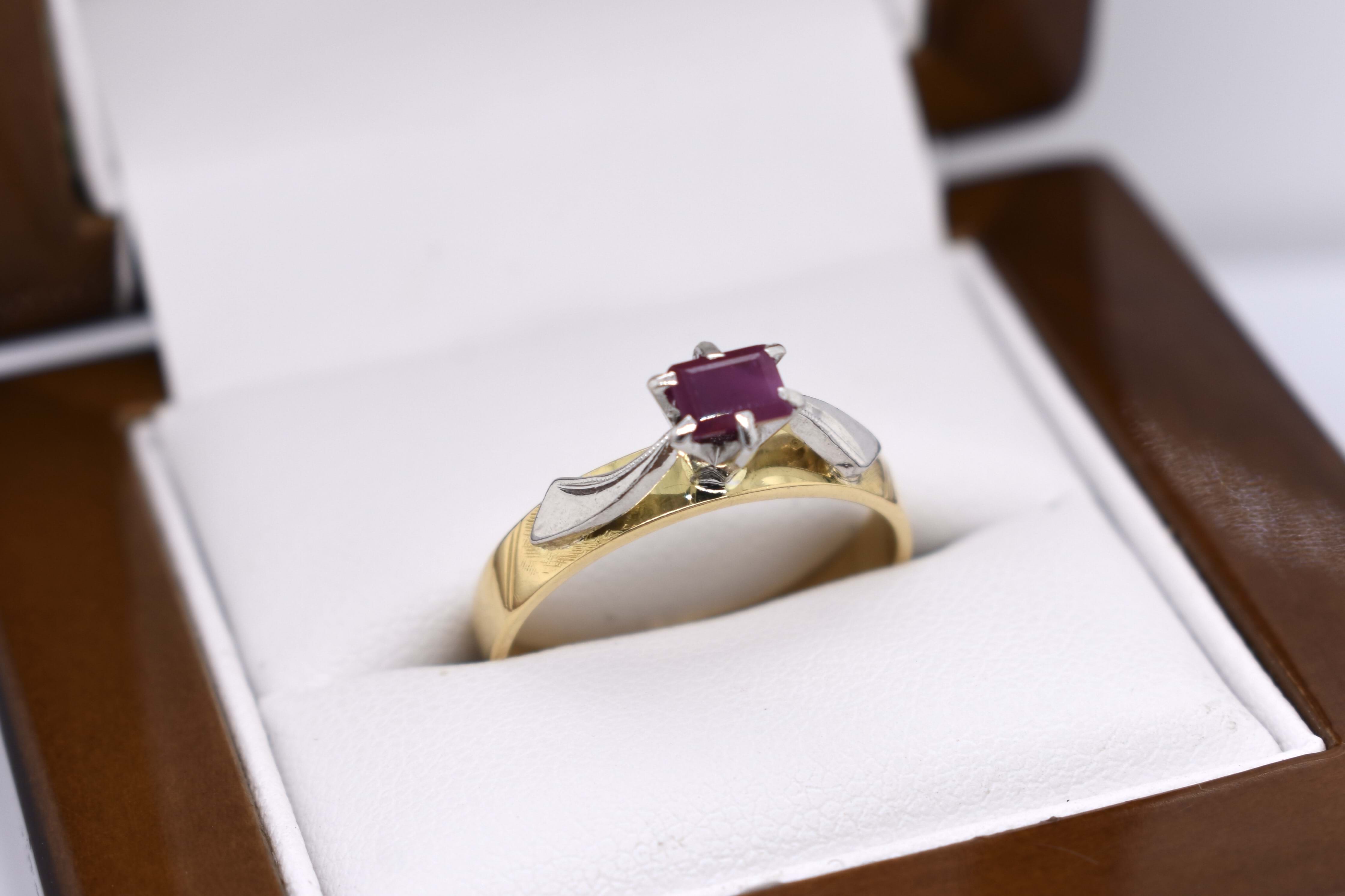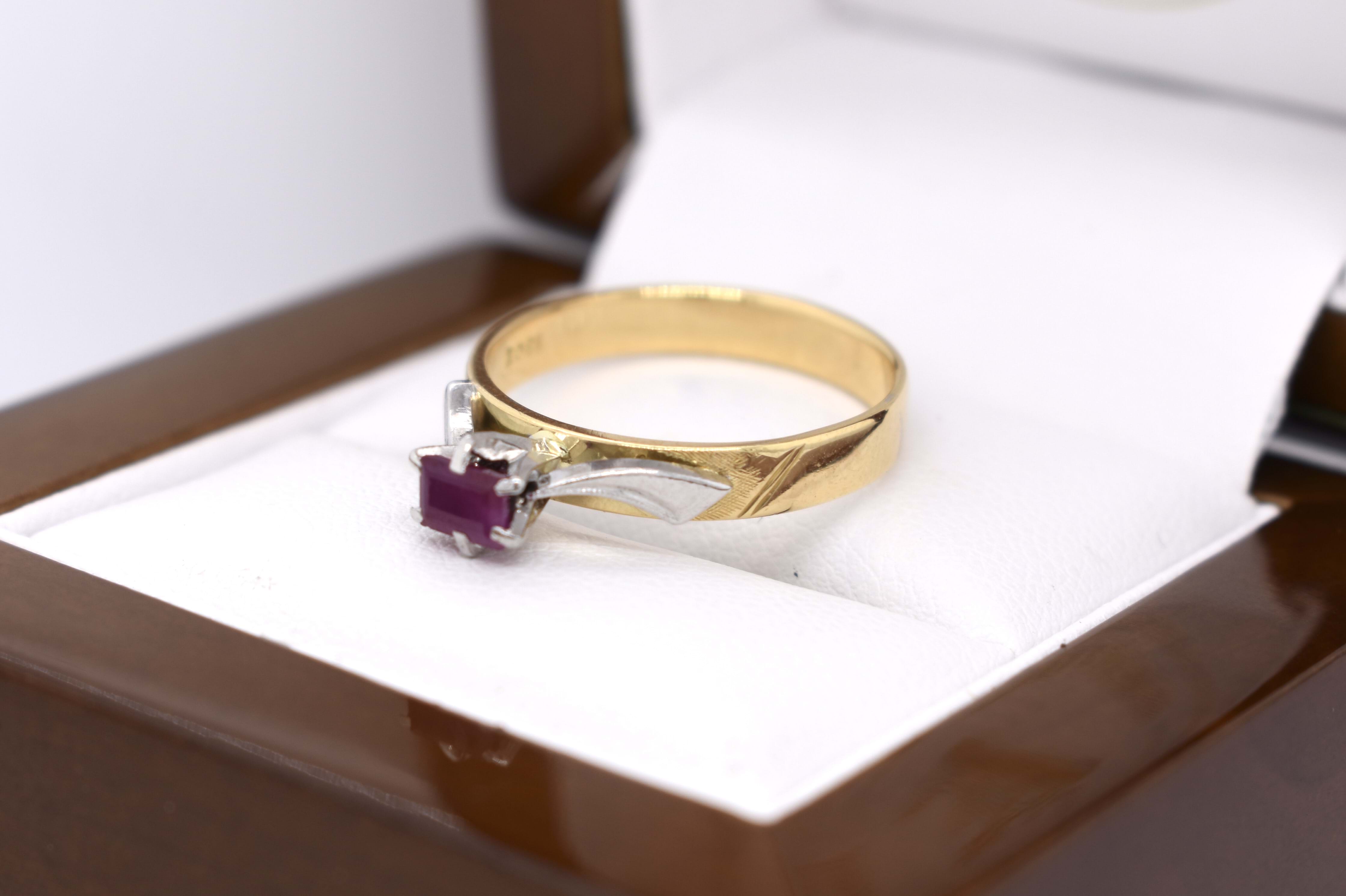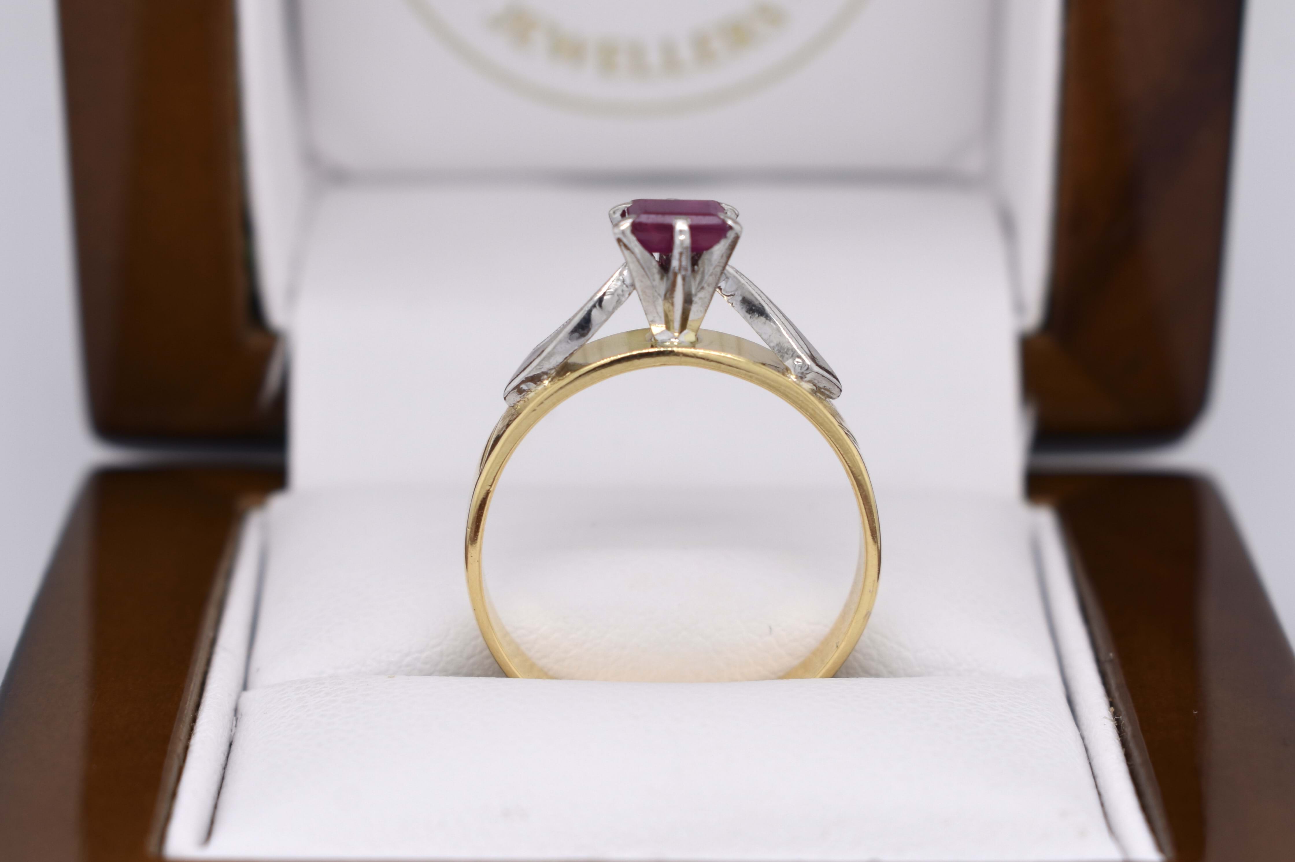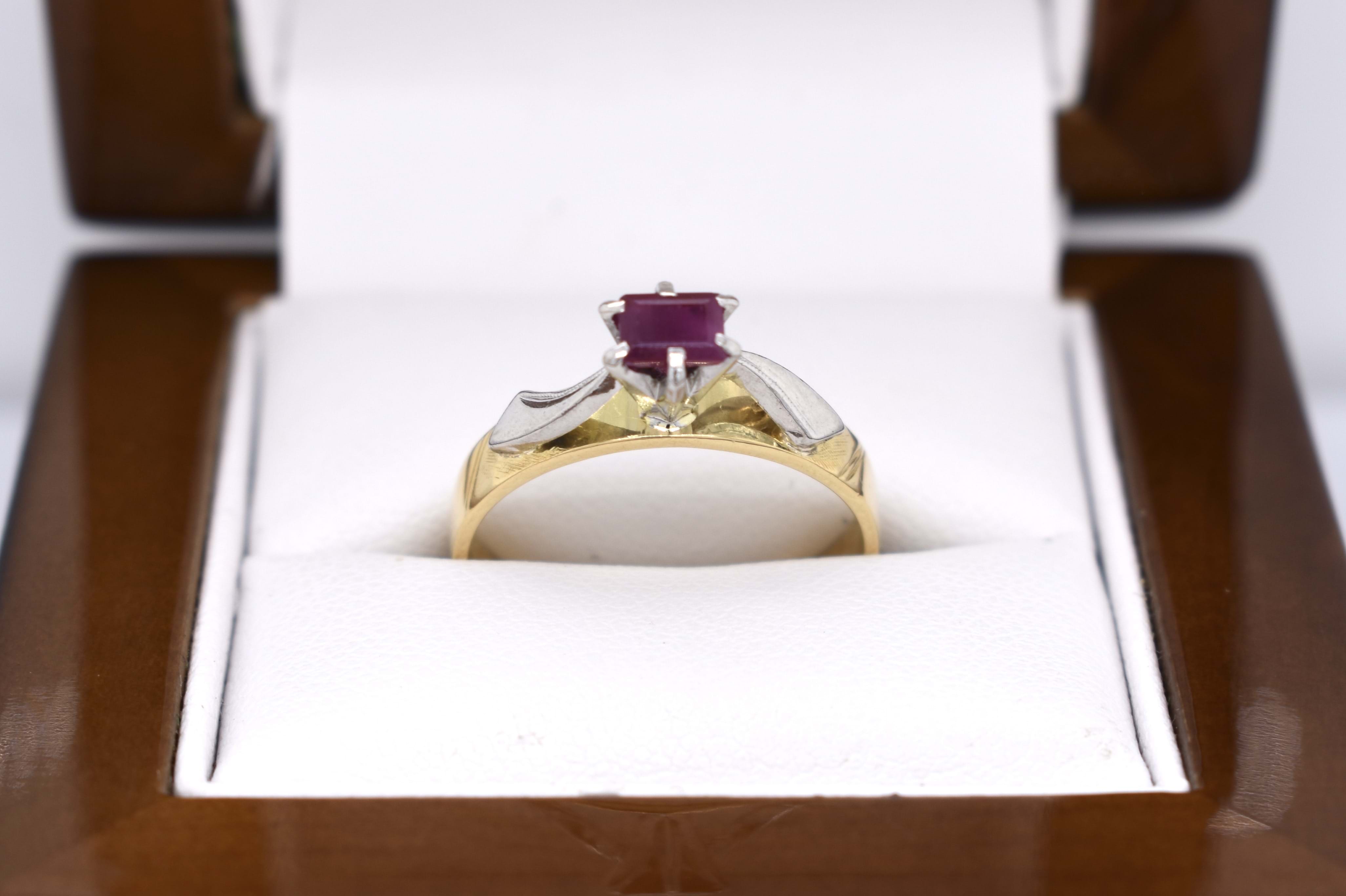 Lovely vintage ring crafted in 18ct yellow and white gold, featuring one baguette shaped ruby of 0.40ct, east/west six claw set. Ruby measures 4.5x3.4mm and is a strong pink/red colour. The shoulders of the ring have engraved leaf detailing and are set on a yellow gold 3.5mm flat profiled band. Finger size O. Independent Valuation Supplied.