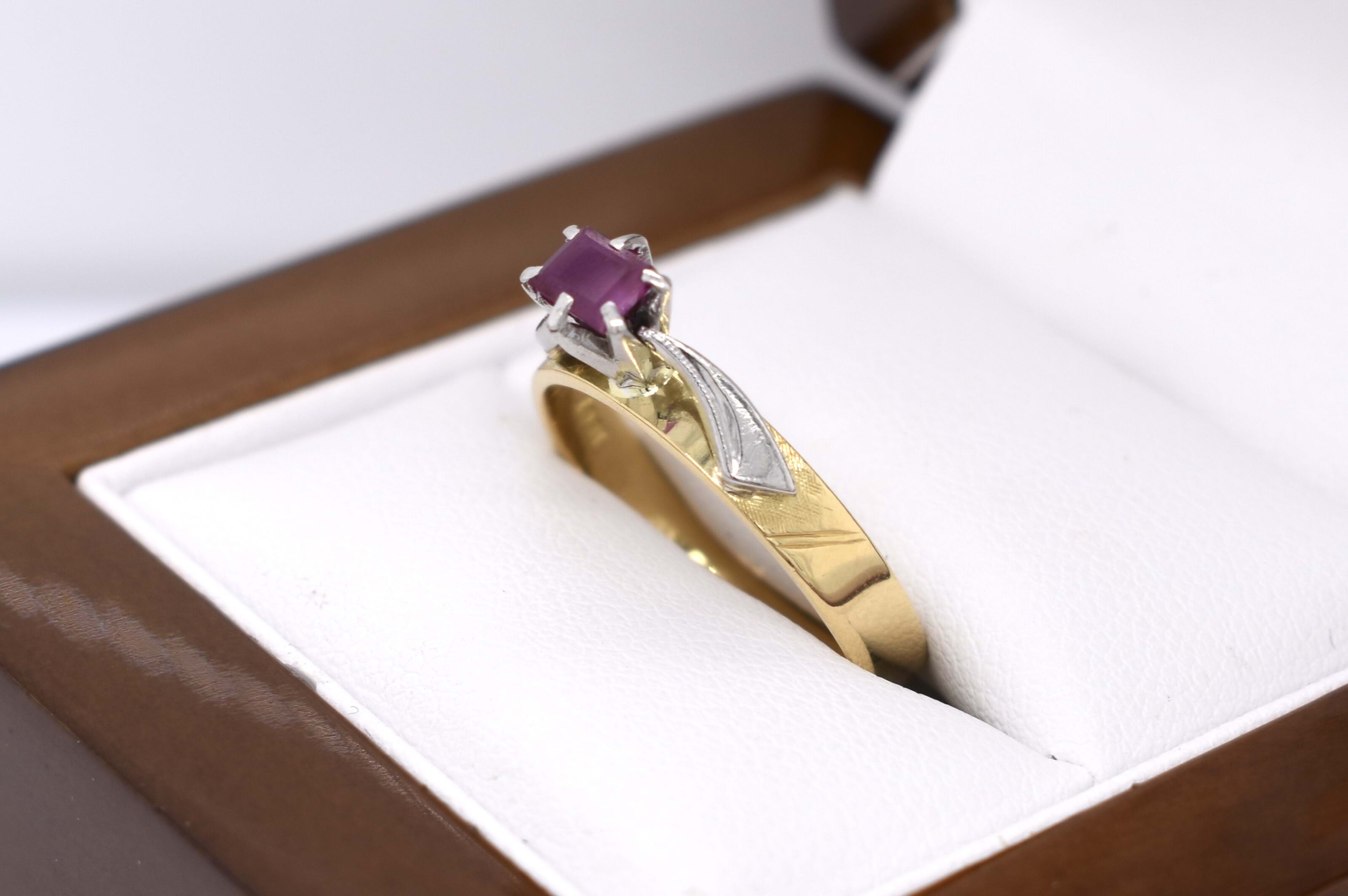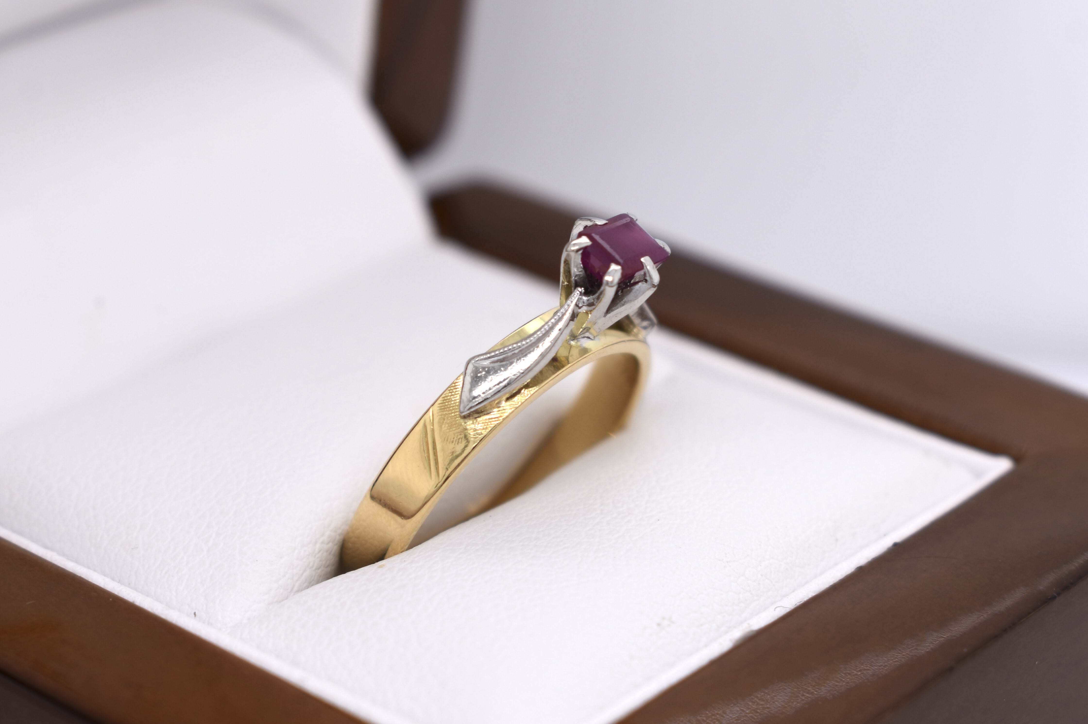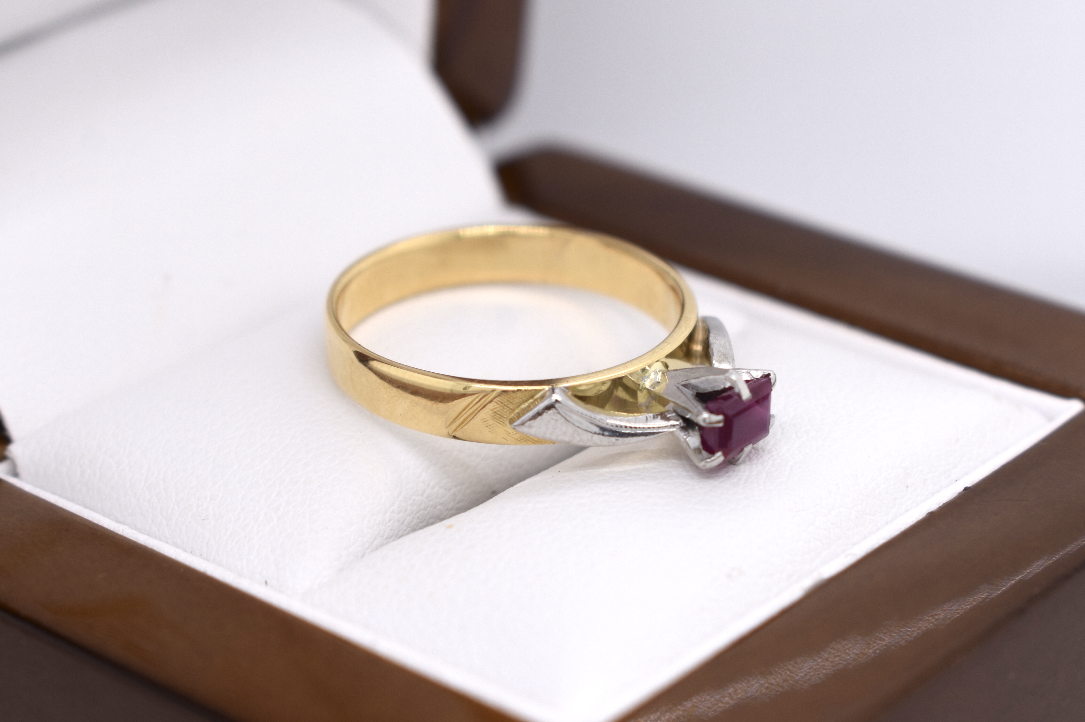 Lovely vintage ring crafted in 18ct yellow and white gold, featuring one baguette shaped ruby of 0.40ct, east/west six claw set. Ruby measures 4.5x3.4mm and is a strong pink/red colour. The shoulders of the ring have engraved leaf detailing and are set on a yellow gold 3.5mm flat profiled band. Finger size O. Independent Valuation Supplied.