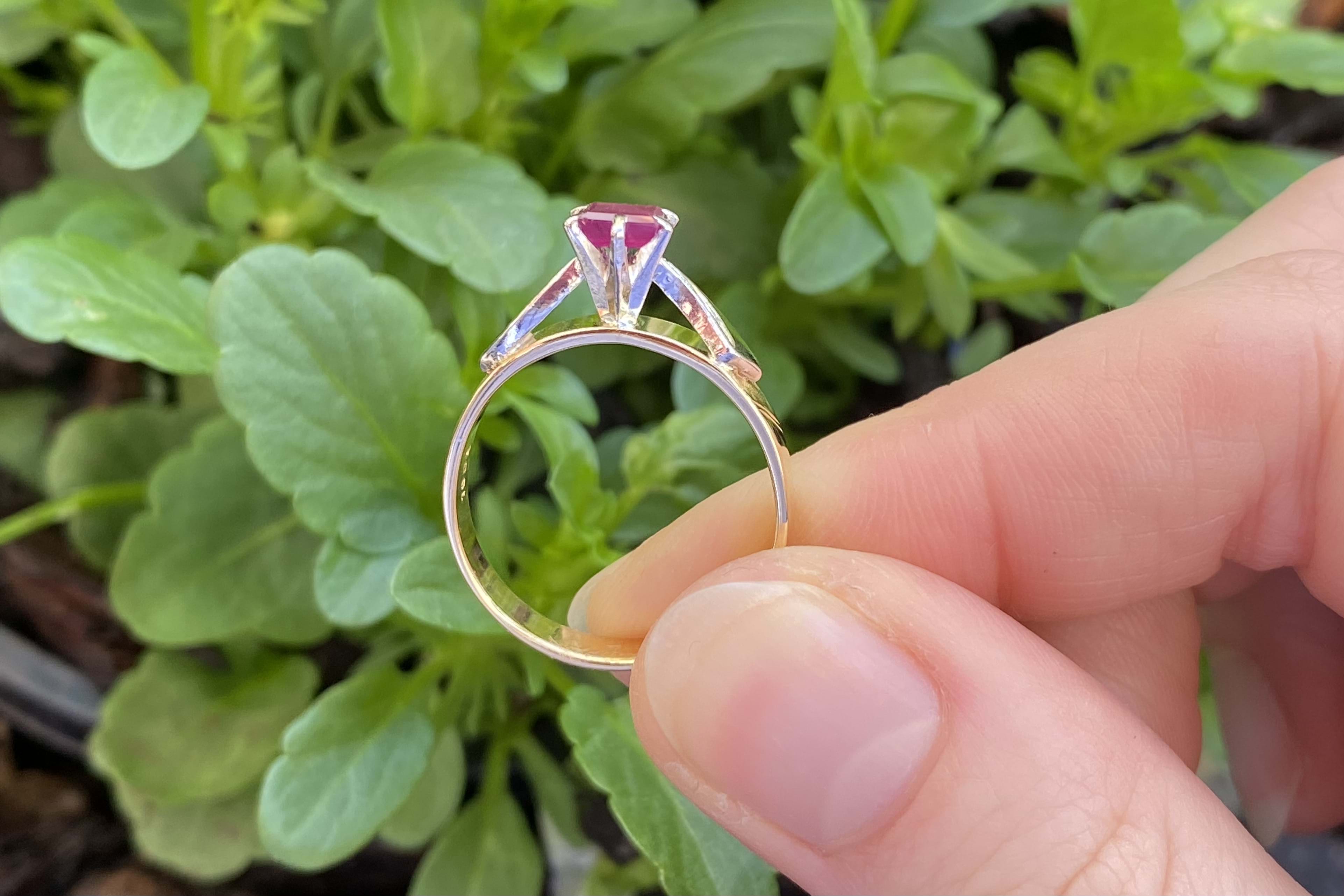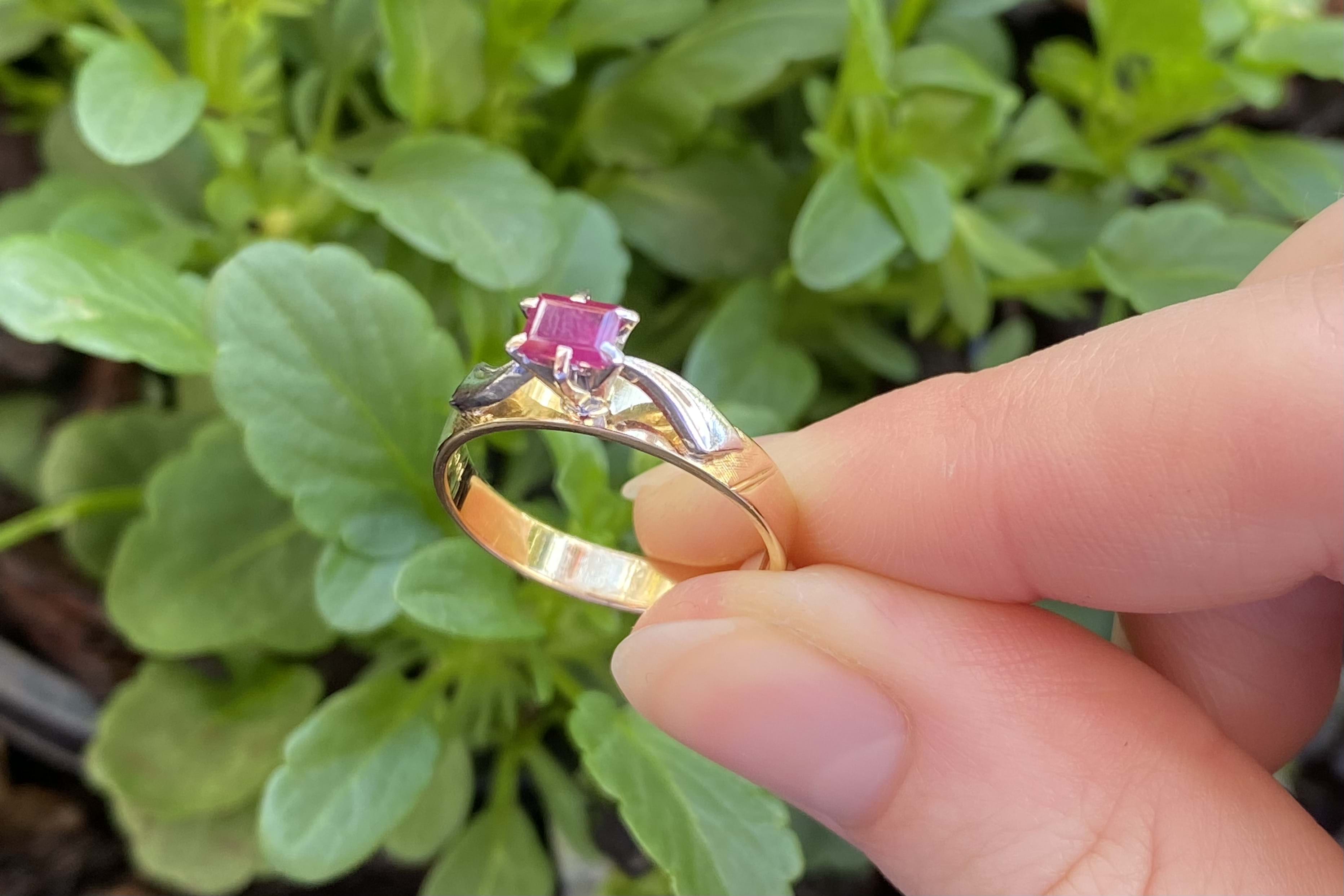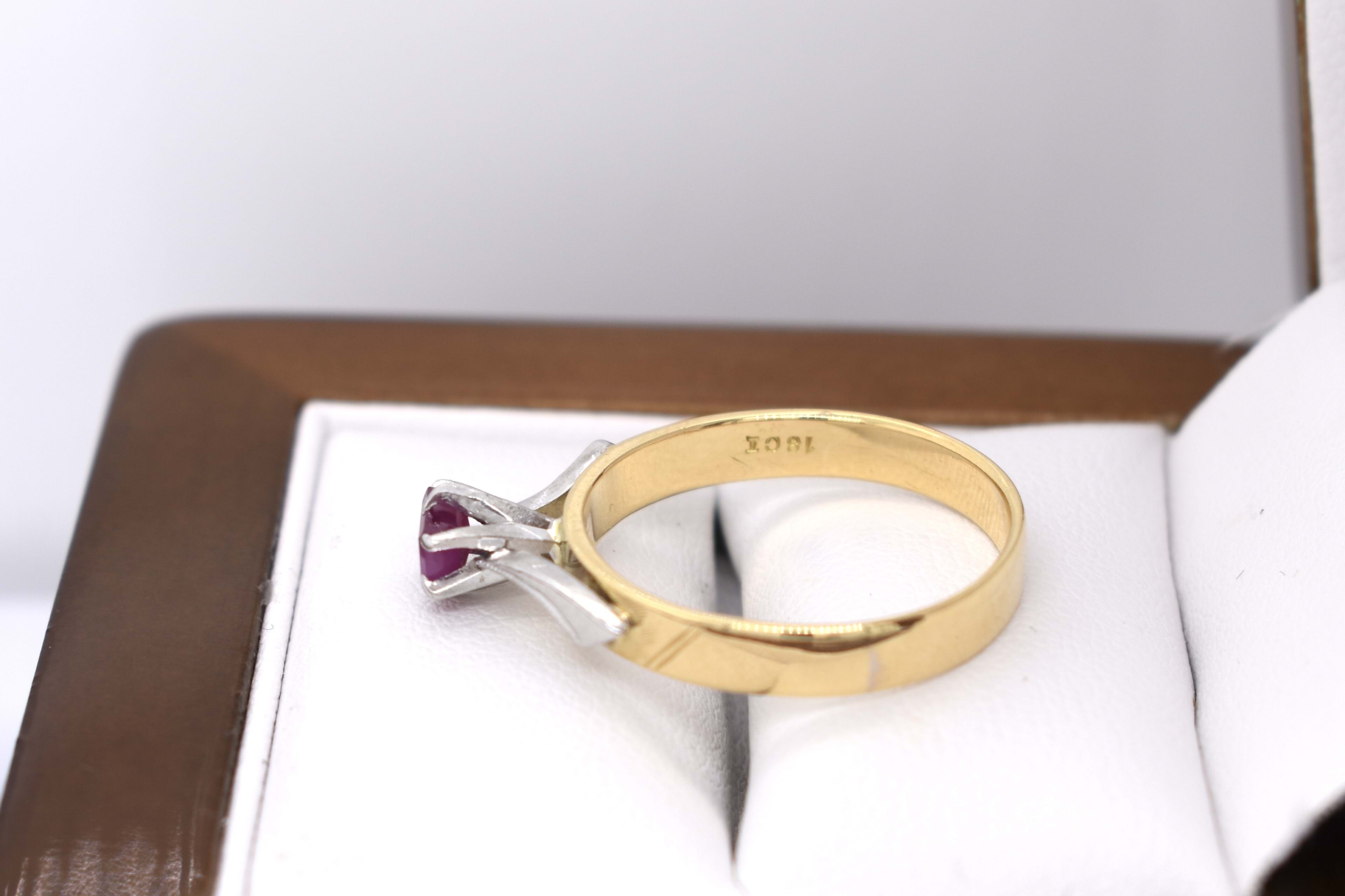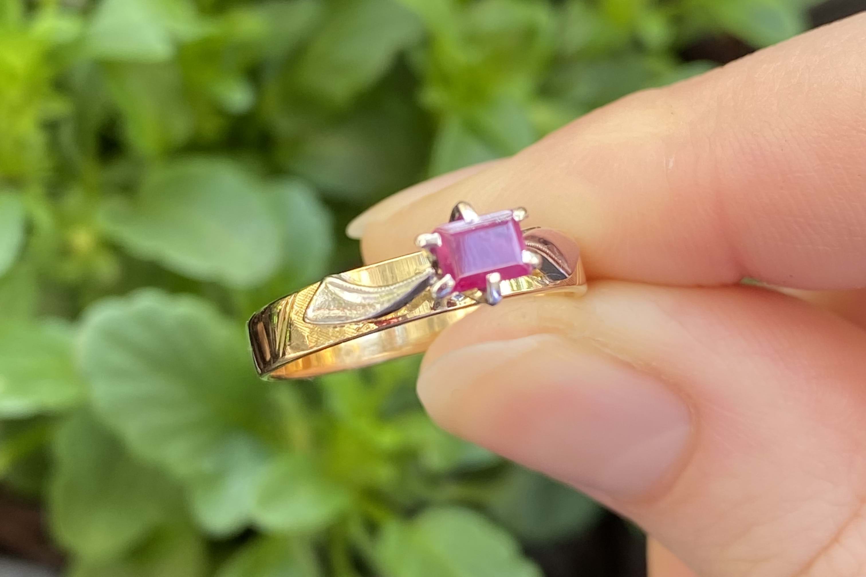 Lovely vintage ring crafted in 18ct yellow and white gold, featuring one baguette shaped ruby of 0.40ct, east/west six claw set. Ruby measures 4.5x3.4mm and is a strong pink/red colour. The shoulders of the ring have engraved leaf detailing and are set on a yellow gold 3.5mm flat profiled band. Finger size O. Independent Valuation Supplied.