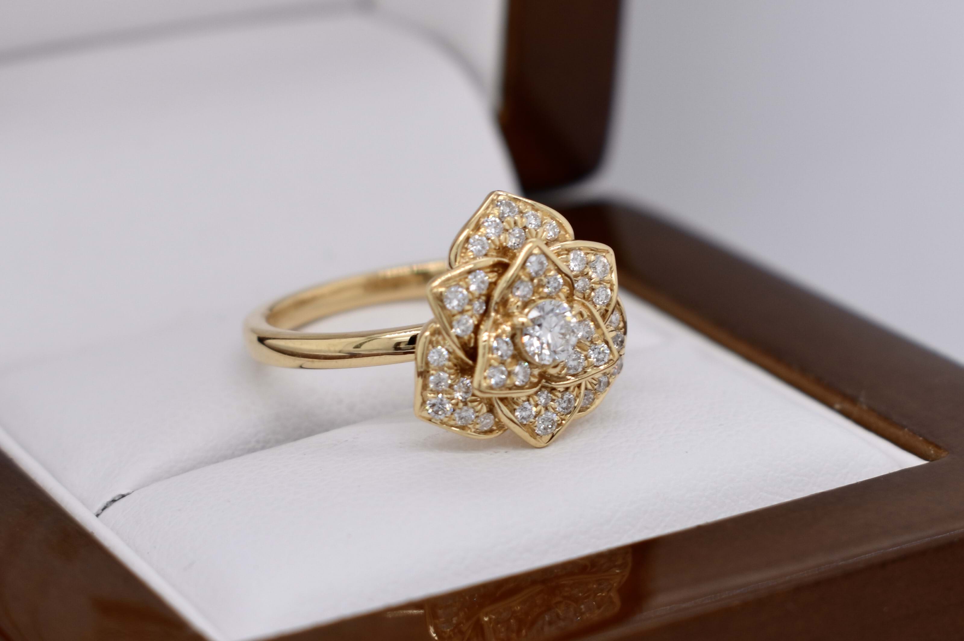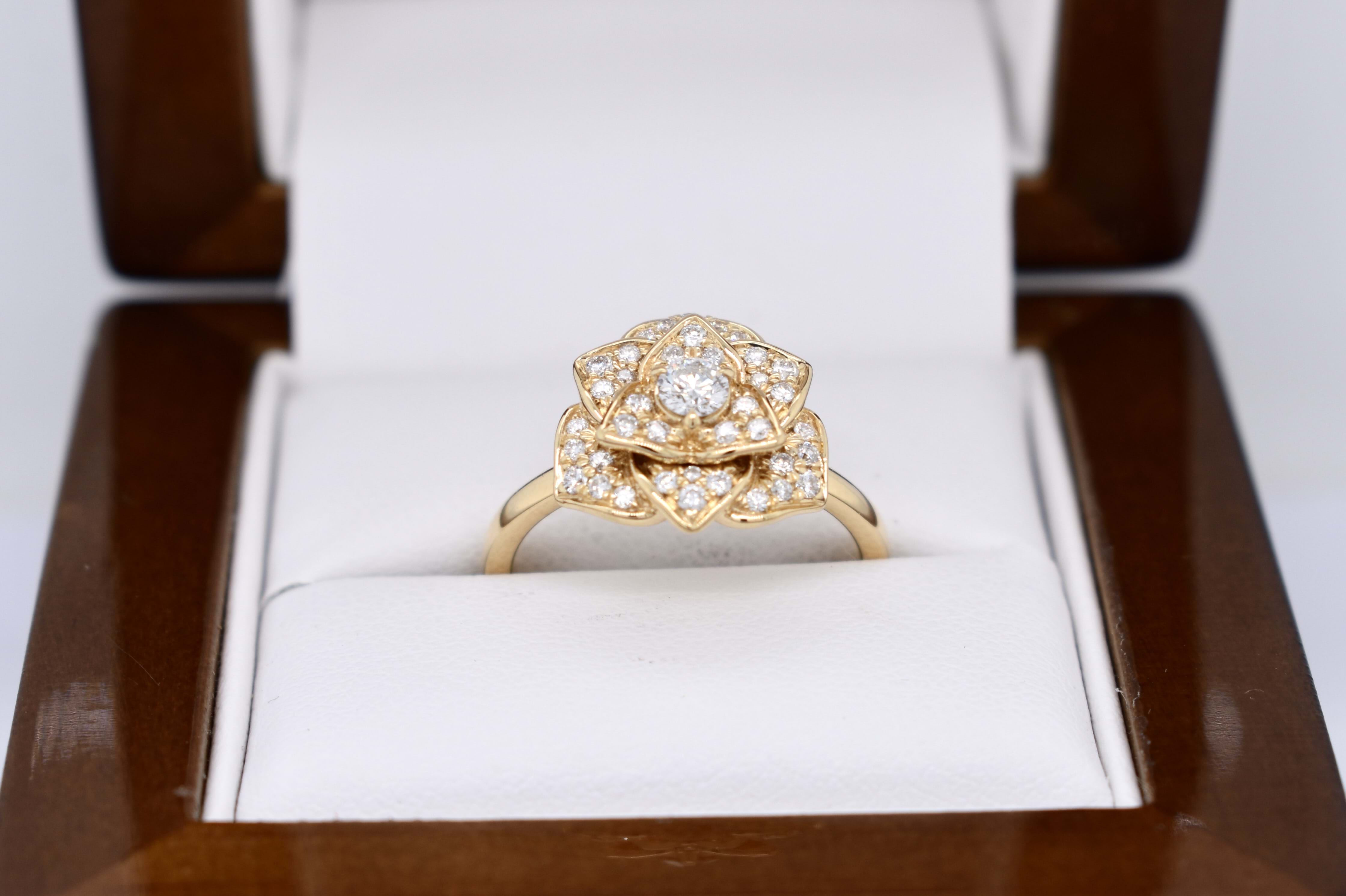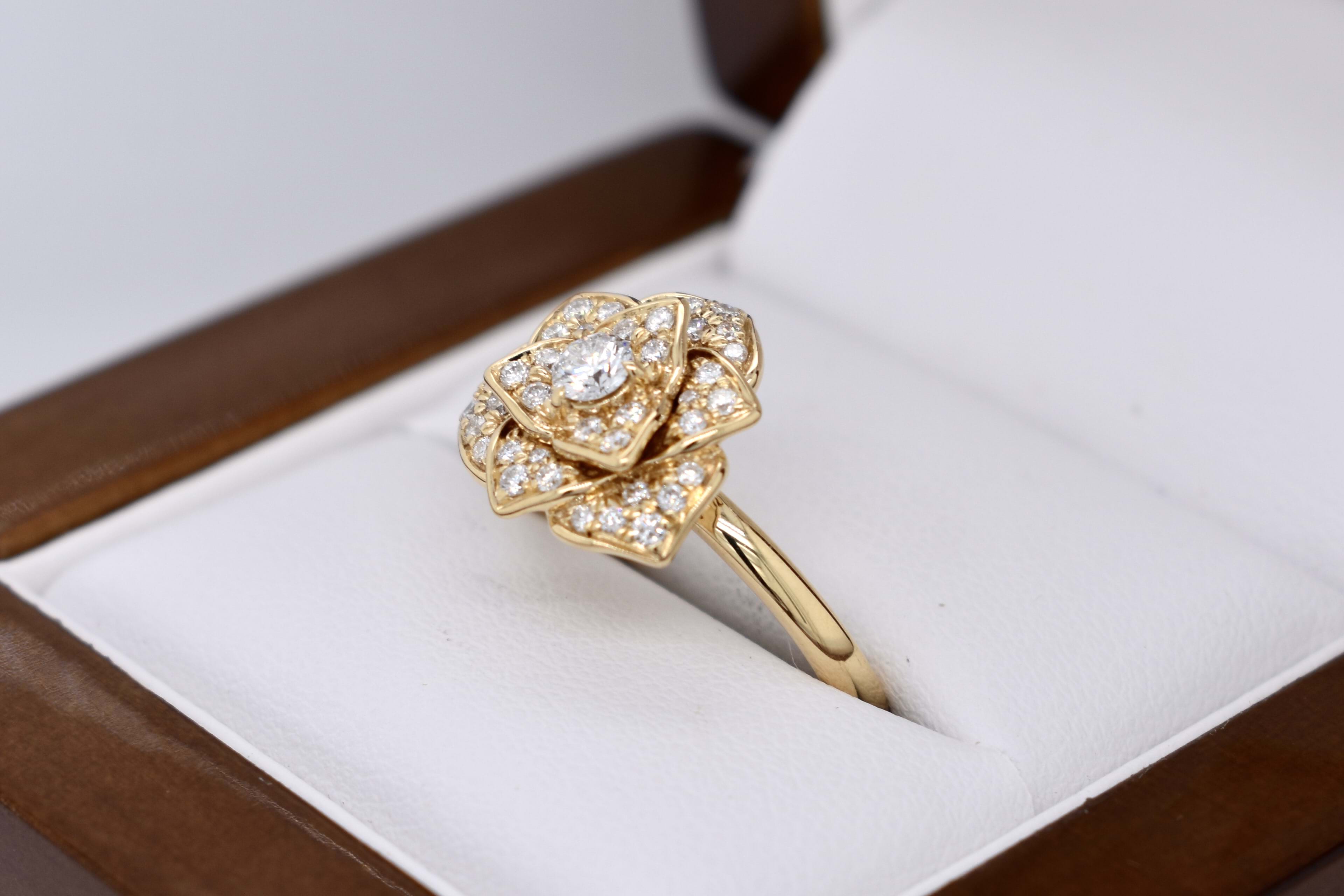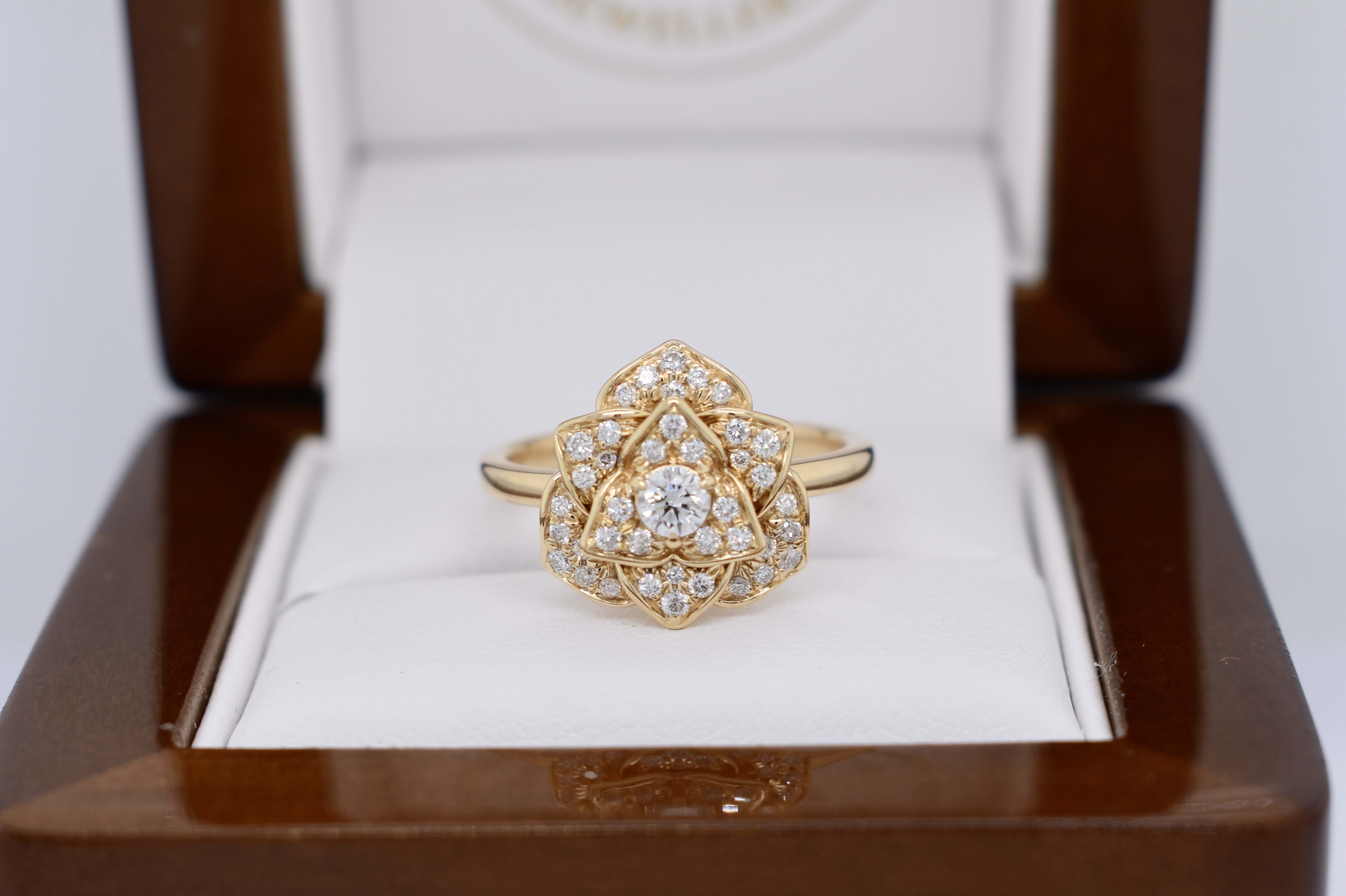 Crafted in 18ct yellow gold, this lovable flower design ring is set with 40 round brilliant cut diamonds, a larger one in the centre. Total diamond weight of 0.44ct G SI1. Completed on a plain band. Complete the set with the matching pendant: 20374099 and earrings: 20374105. Independent Valuation available upon purchase.