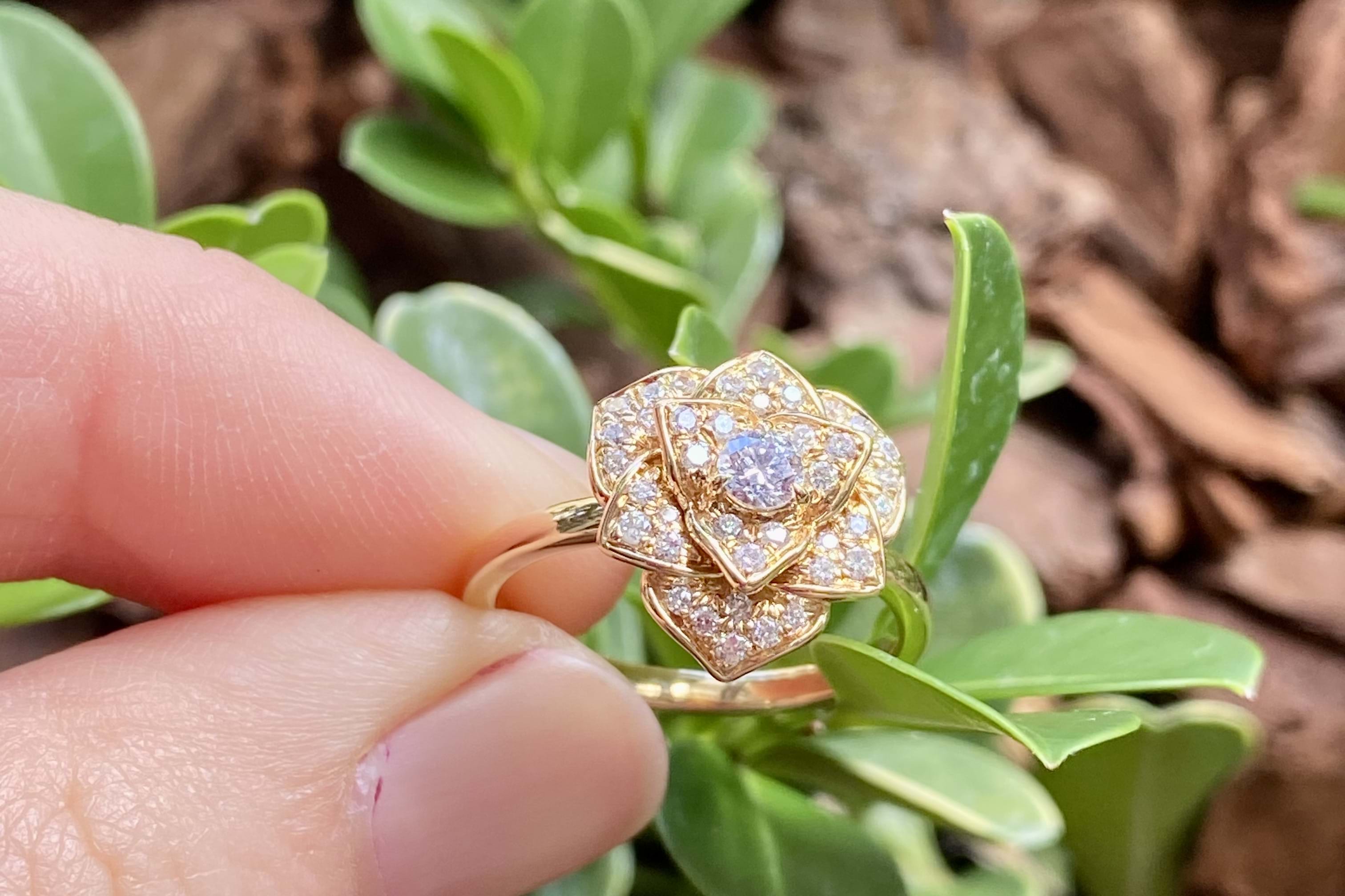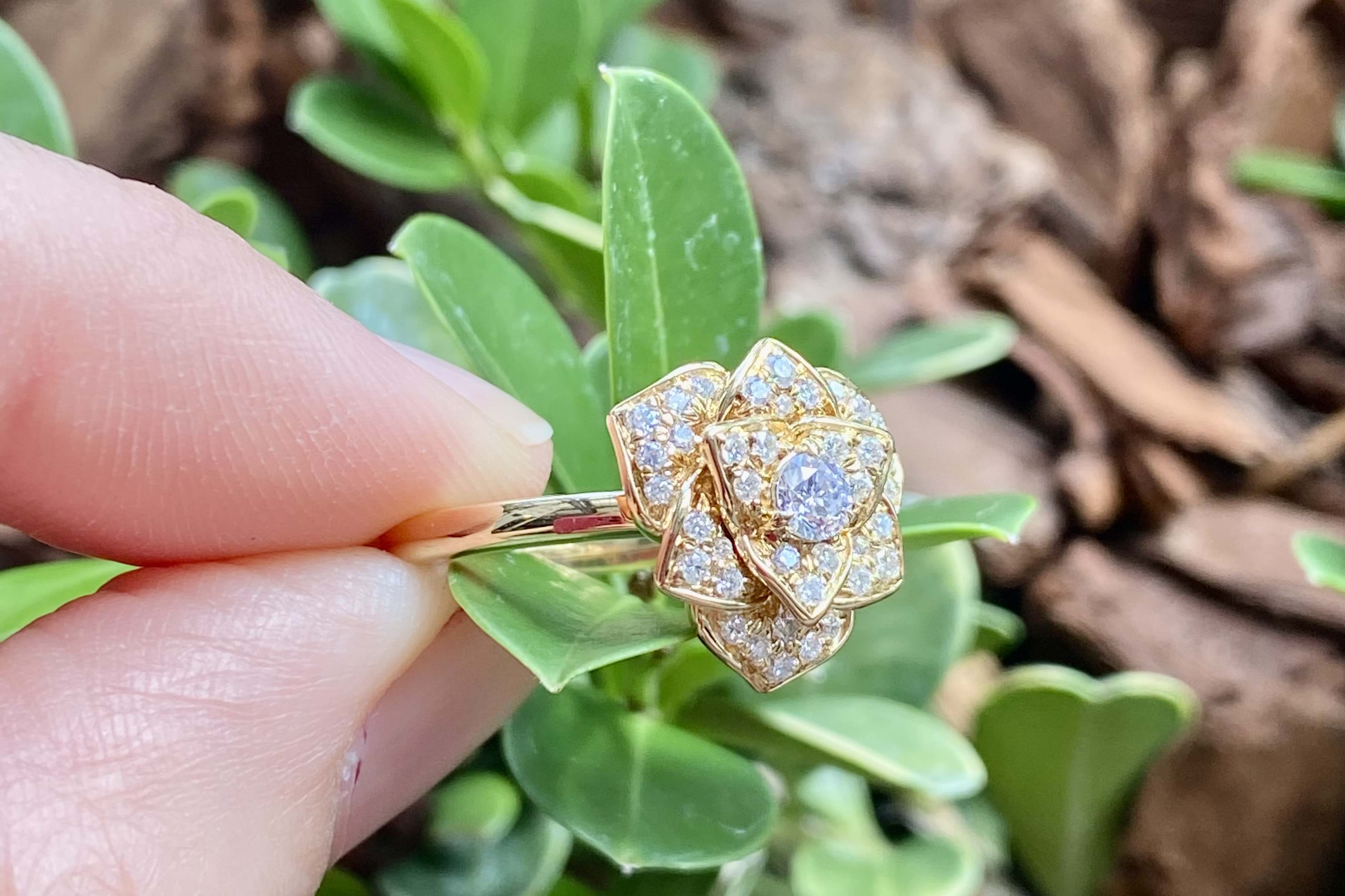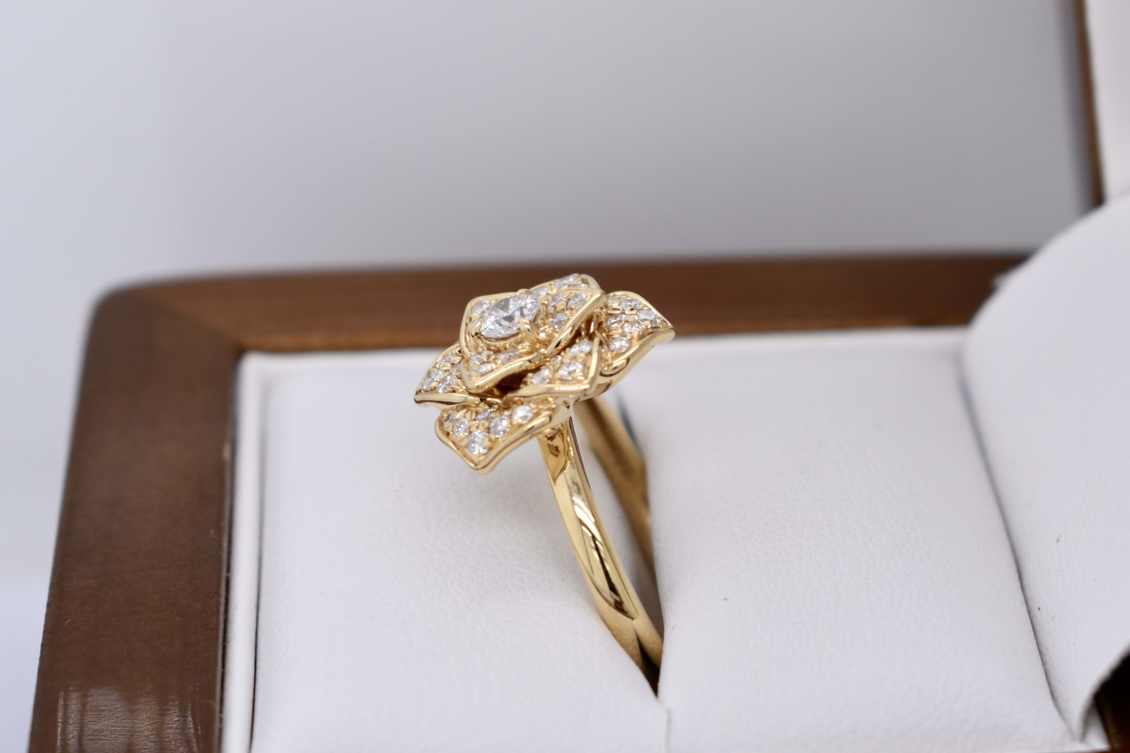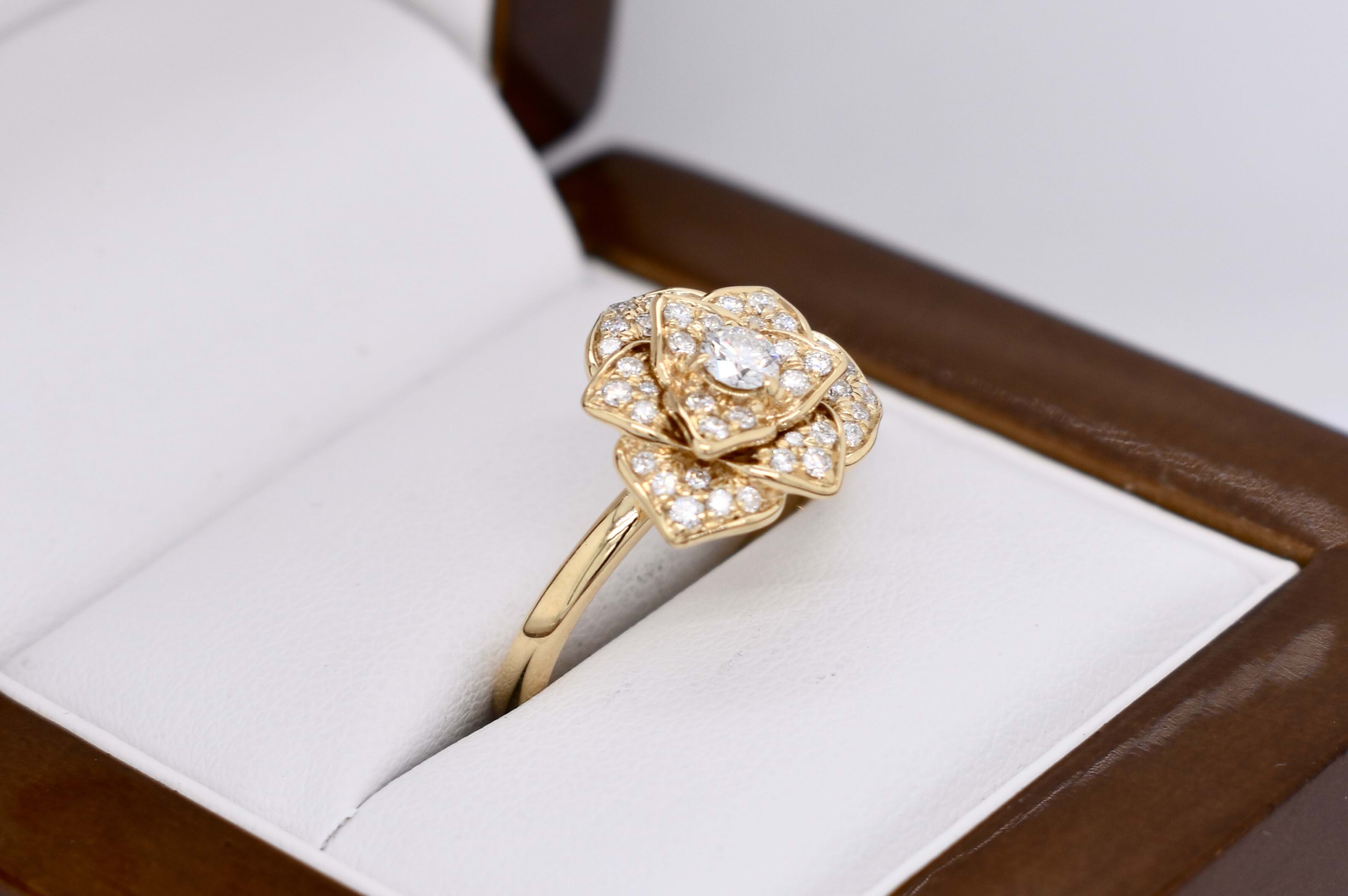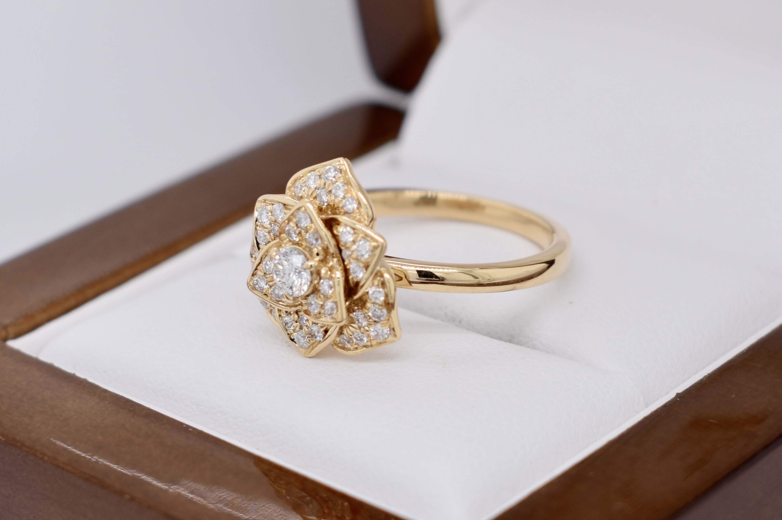Crafted in 18ct yellow gold, this lovable flower design ring is set with 40 round brilliant cut diamonds, a larger one in the centre. Total diamond weight of 0.44ct G SI1. Completed on a plain band. Complete the set with the matching pendant: 20374099 and earrings: 20374105. Independent Valuation available upon purchase.