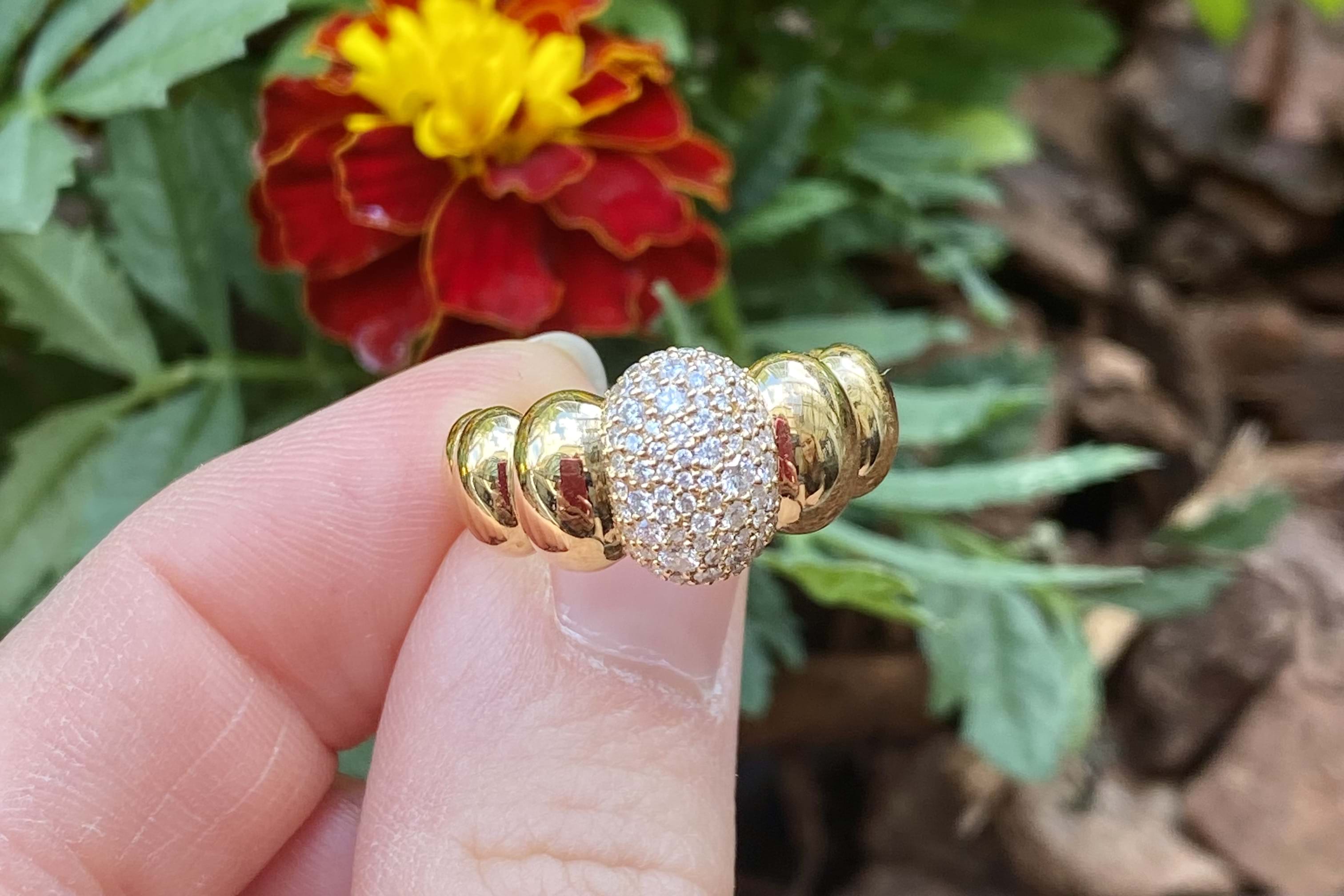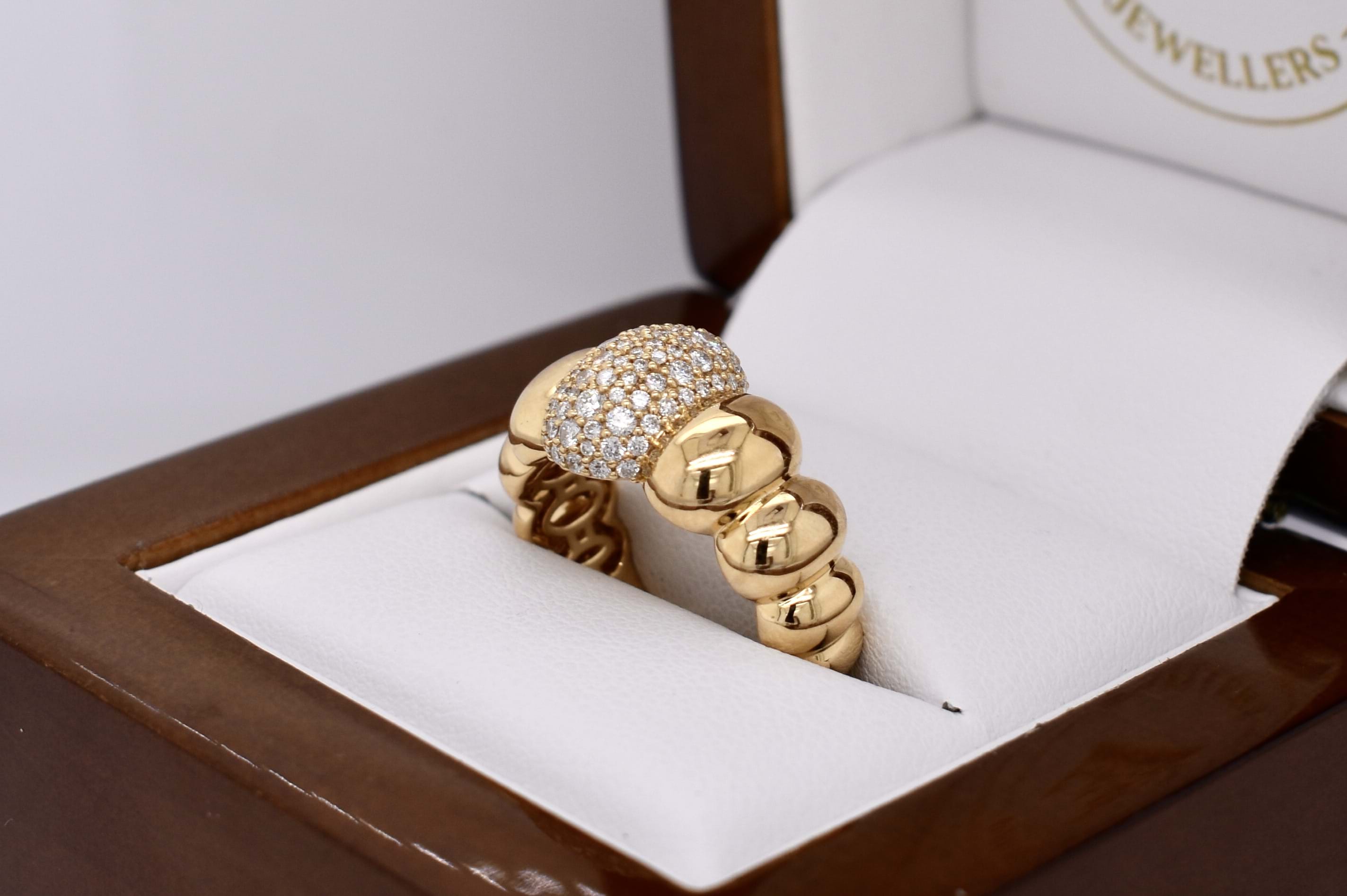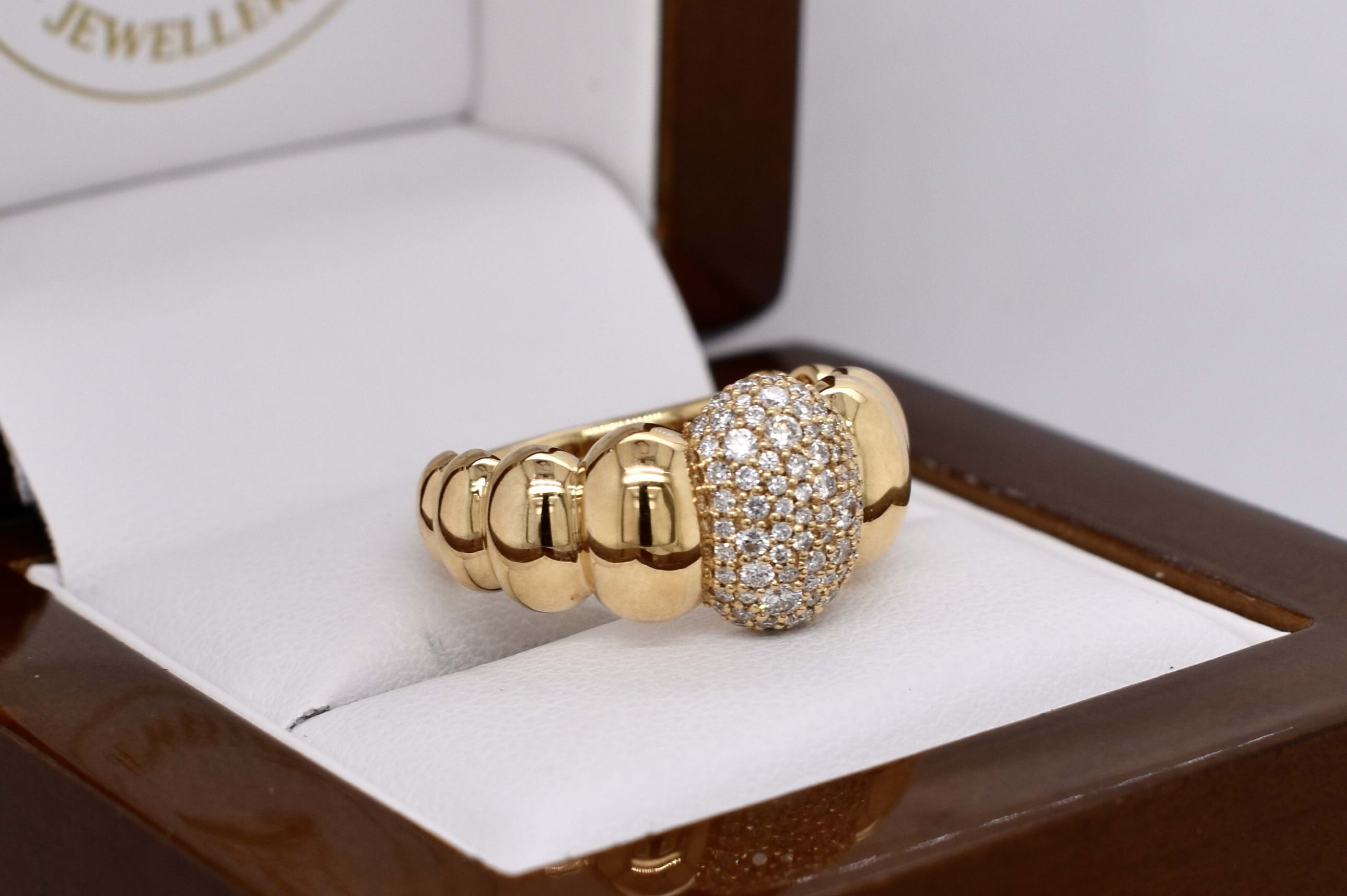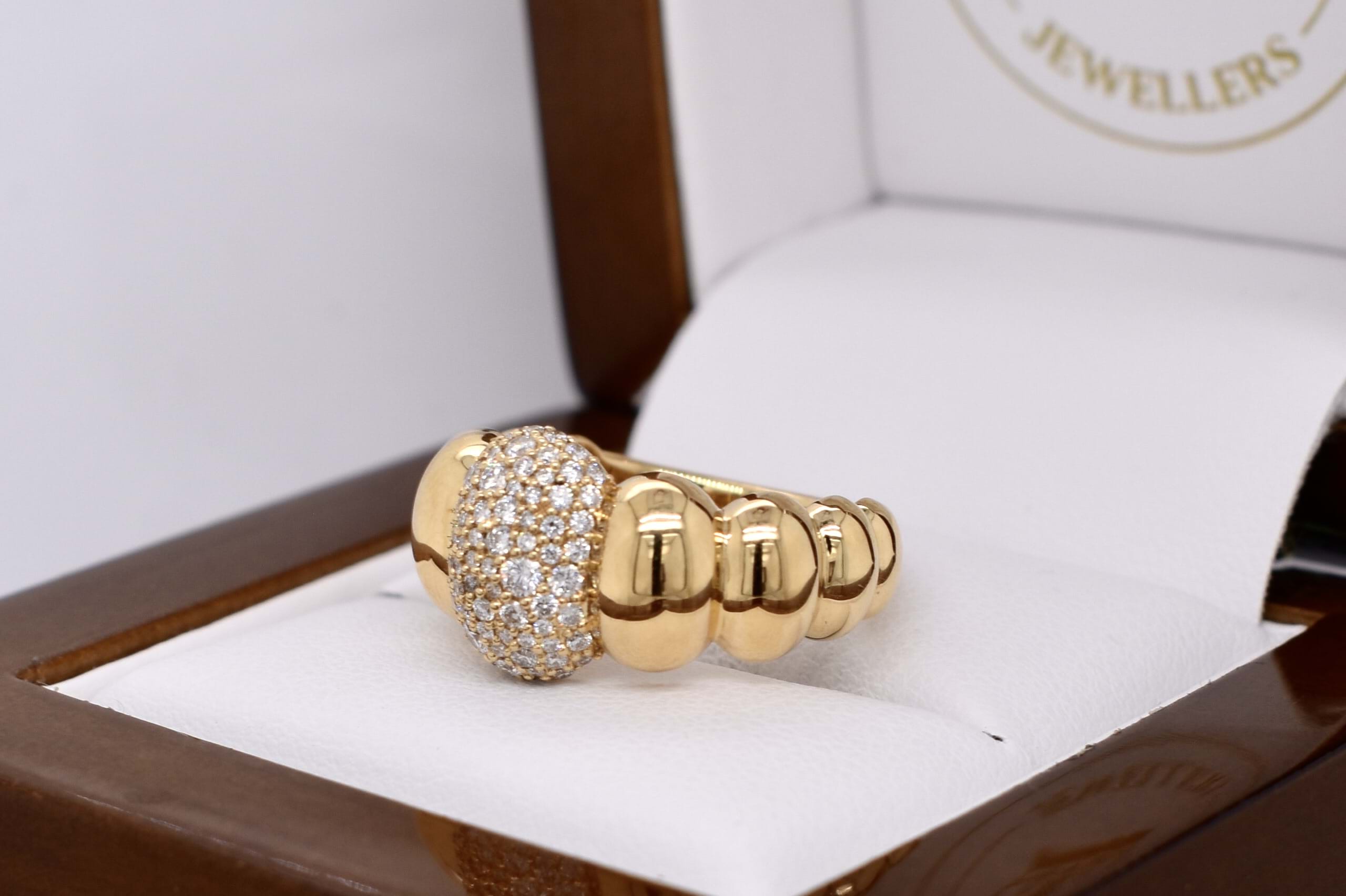 Beautiful and classy, this graduating oval puff ring features 78 round brilliant cut diamonds incrusting the centre oval, the rest plain gold. With a total diamond weight of 0.48ct G SI. Finger size M+.