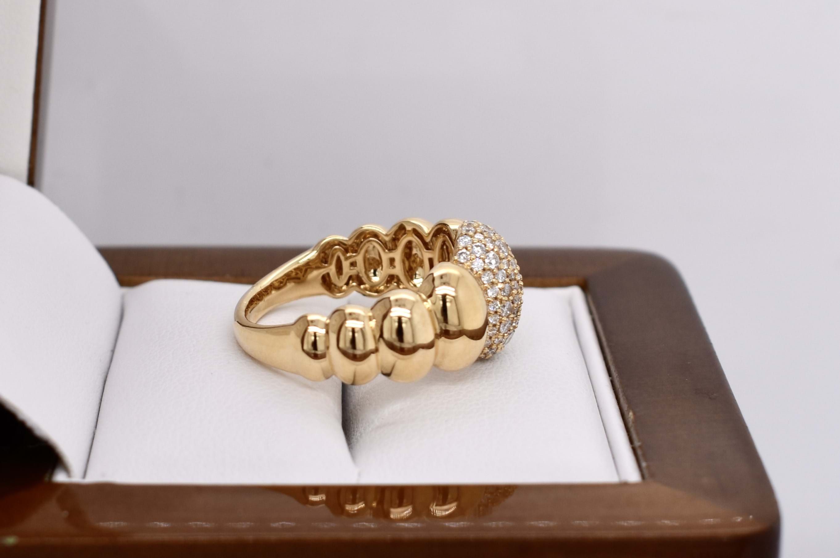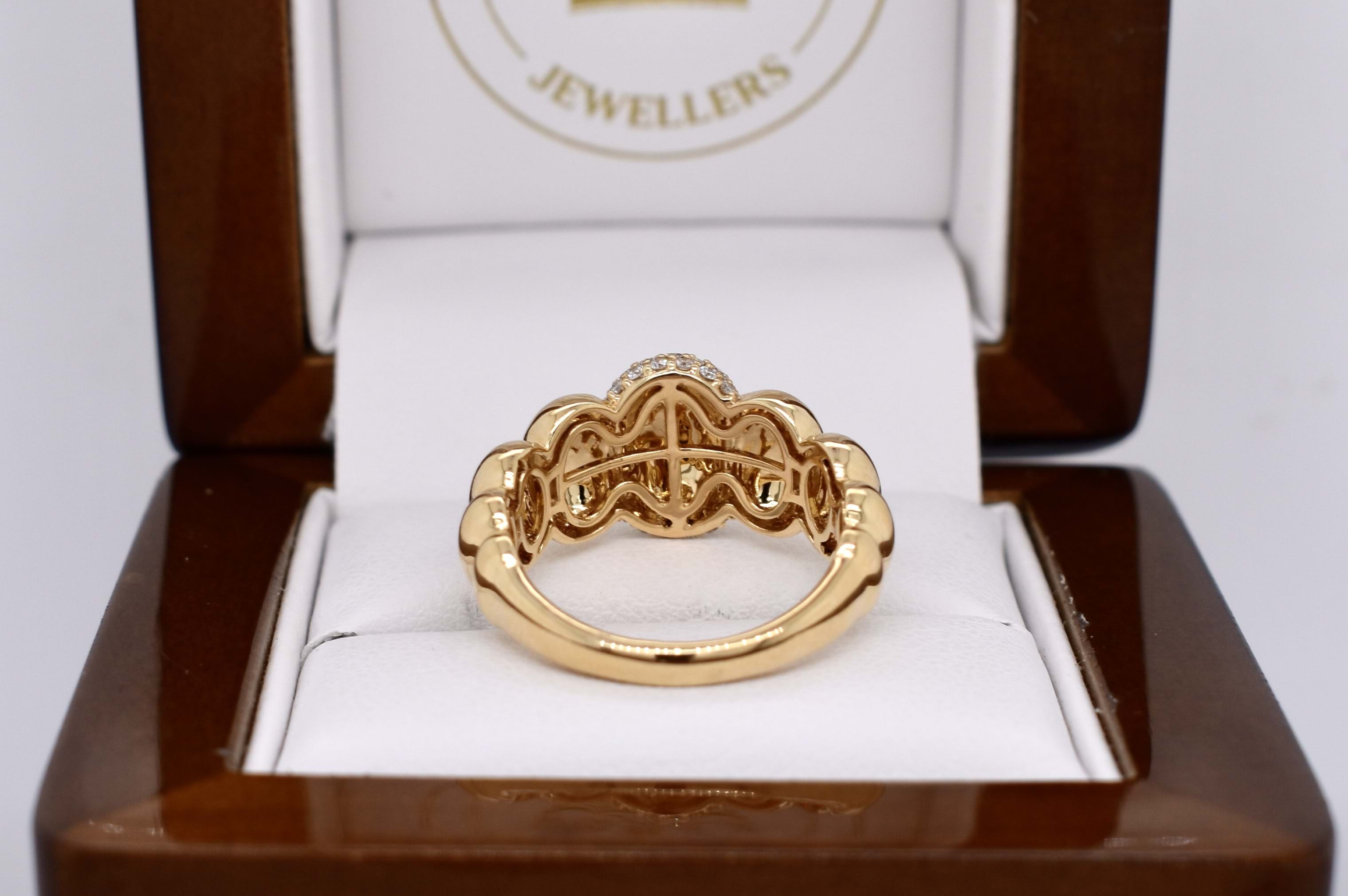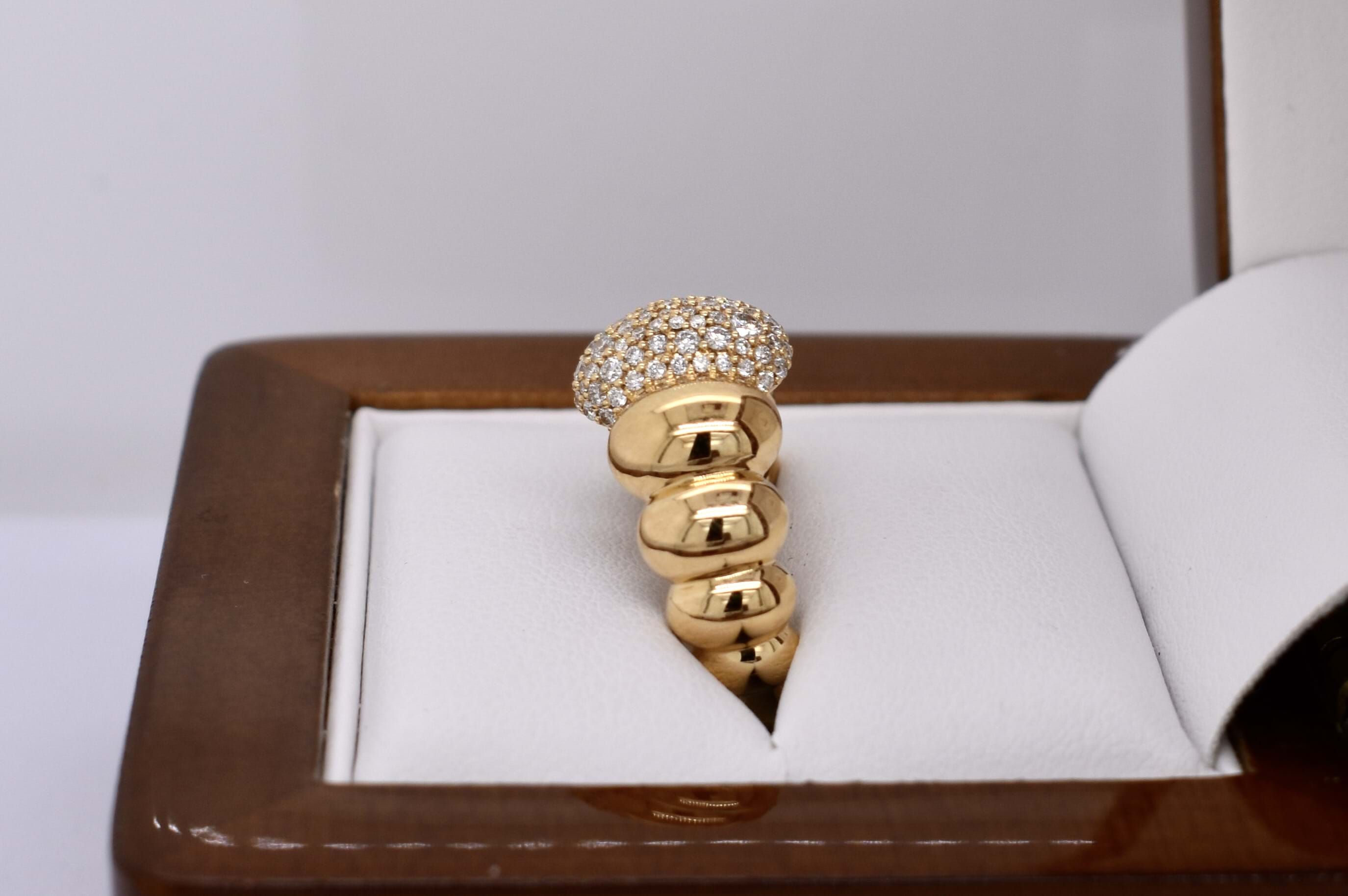 Beautiful and classy, this graduating oval puff ring features 78 round brilliant cut diamonds incrusting the centre oval, the rest plain gold. With a total diamond weight of 0.48ct G SI. Finger size M+.