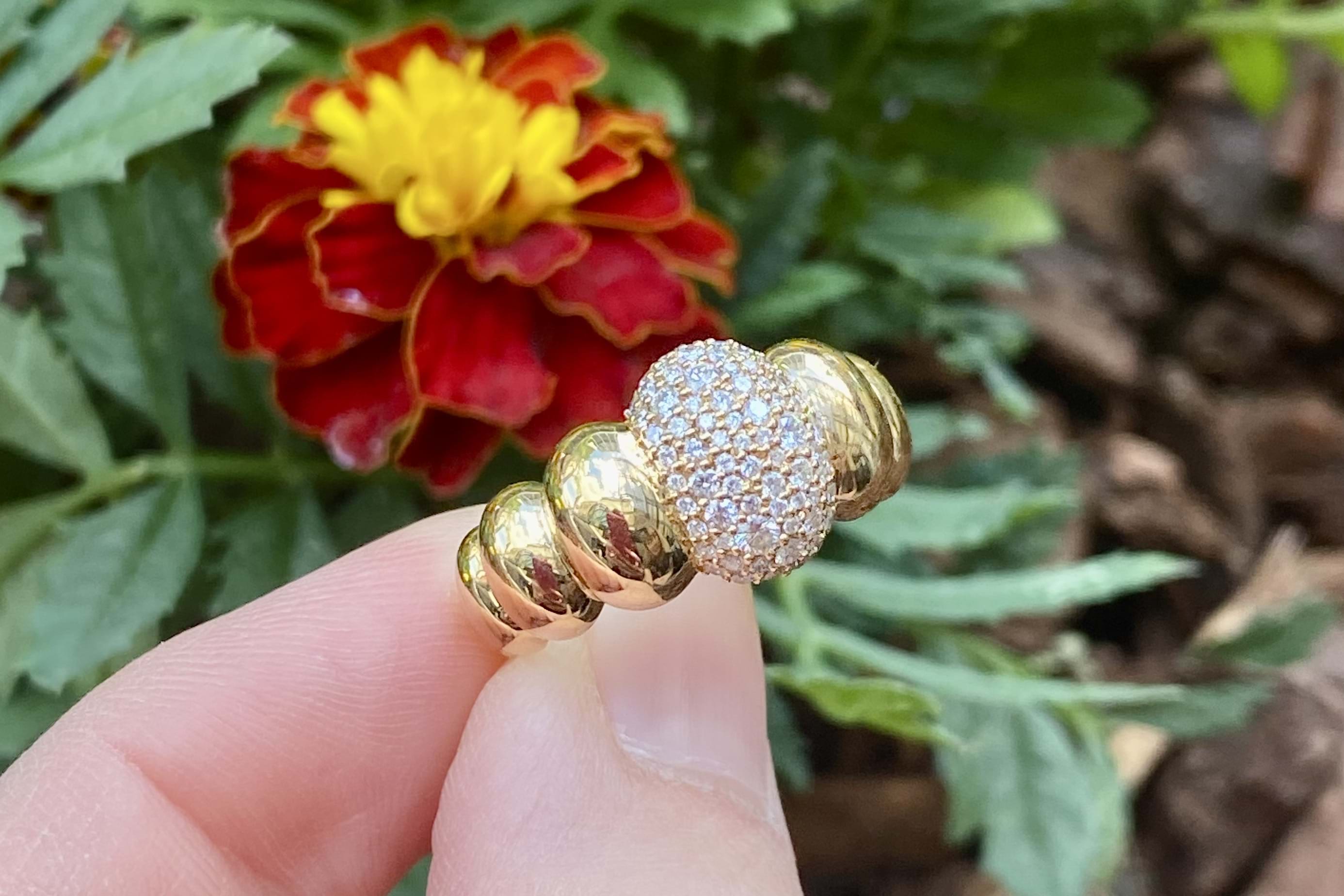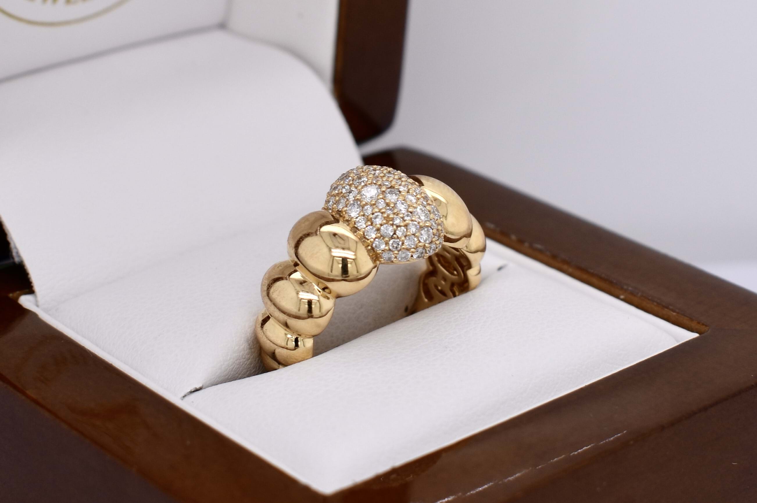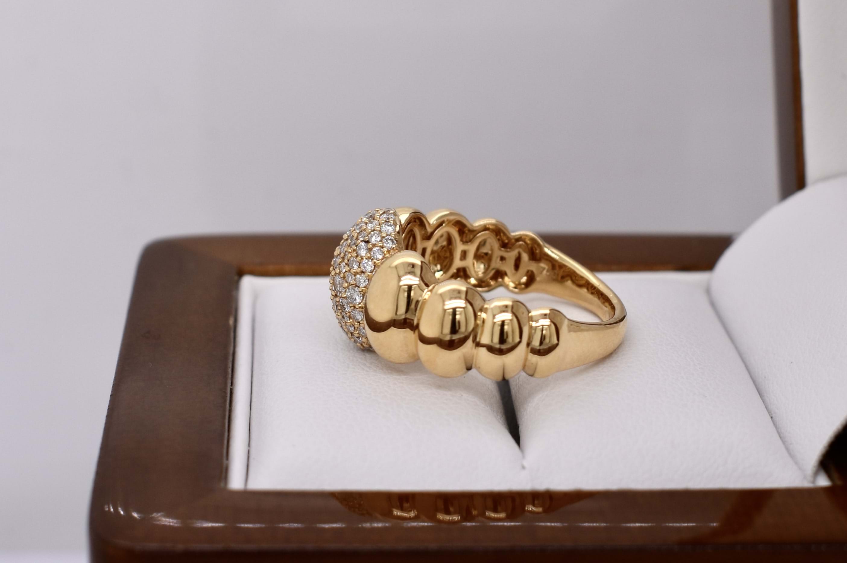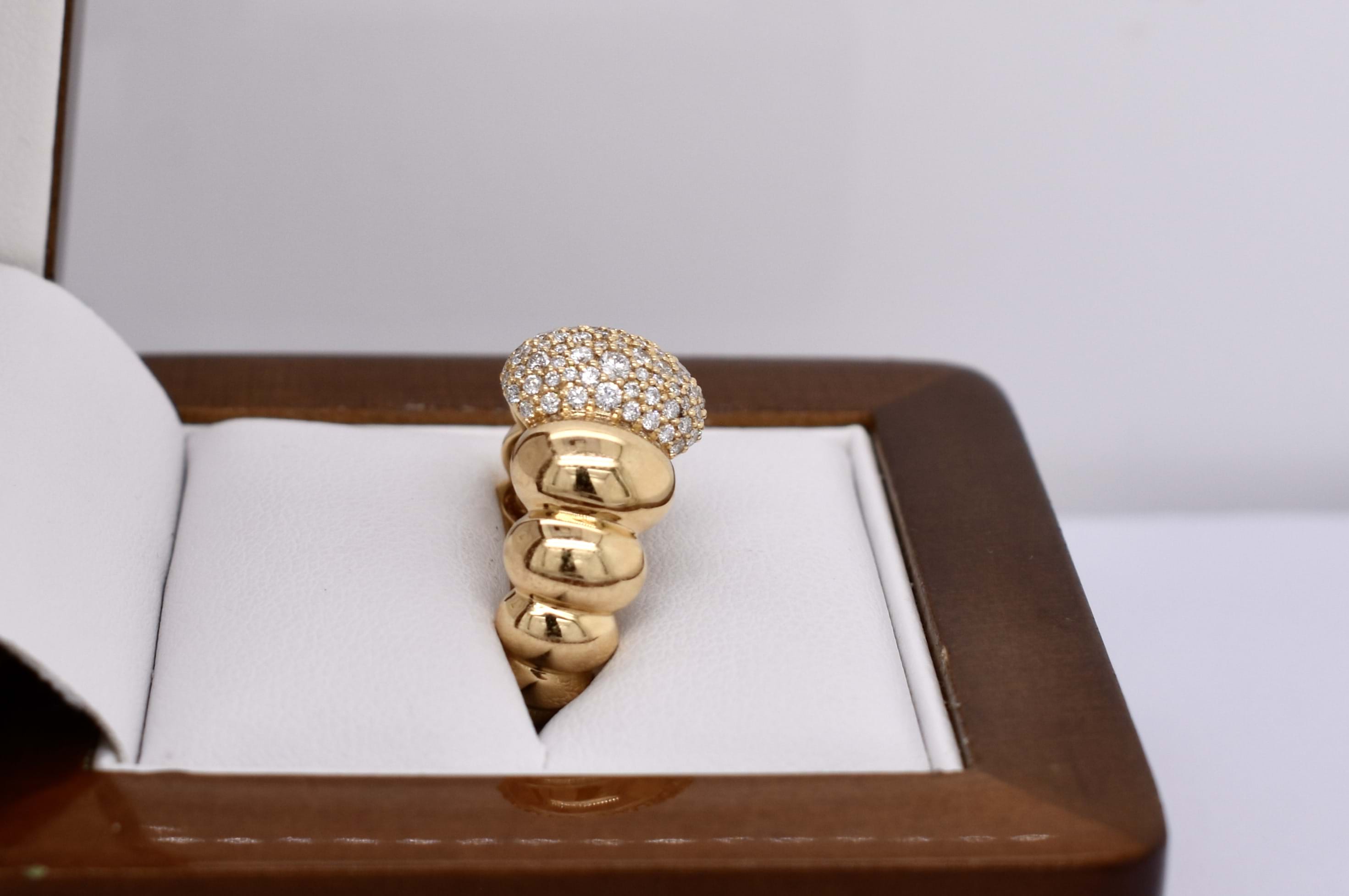 Beautiful and classy, this graduating oval puff ring features 78 round brilliant cut diamonds incrusting the centre oval, the rest plain gold. With a total diamond weight of 0.48ct G SI. Finger size M+.