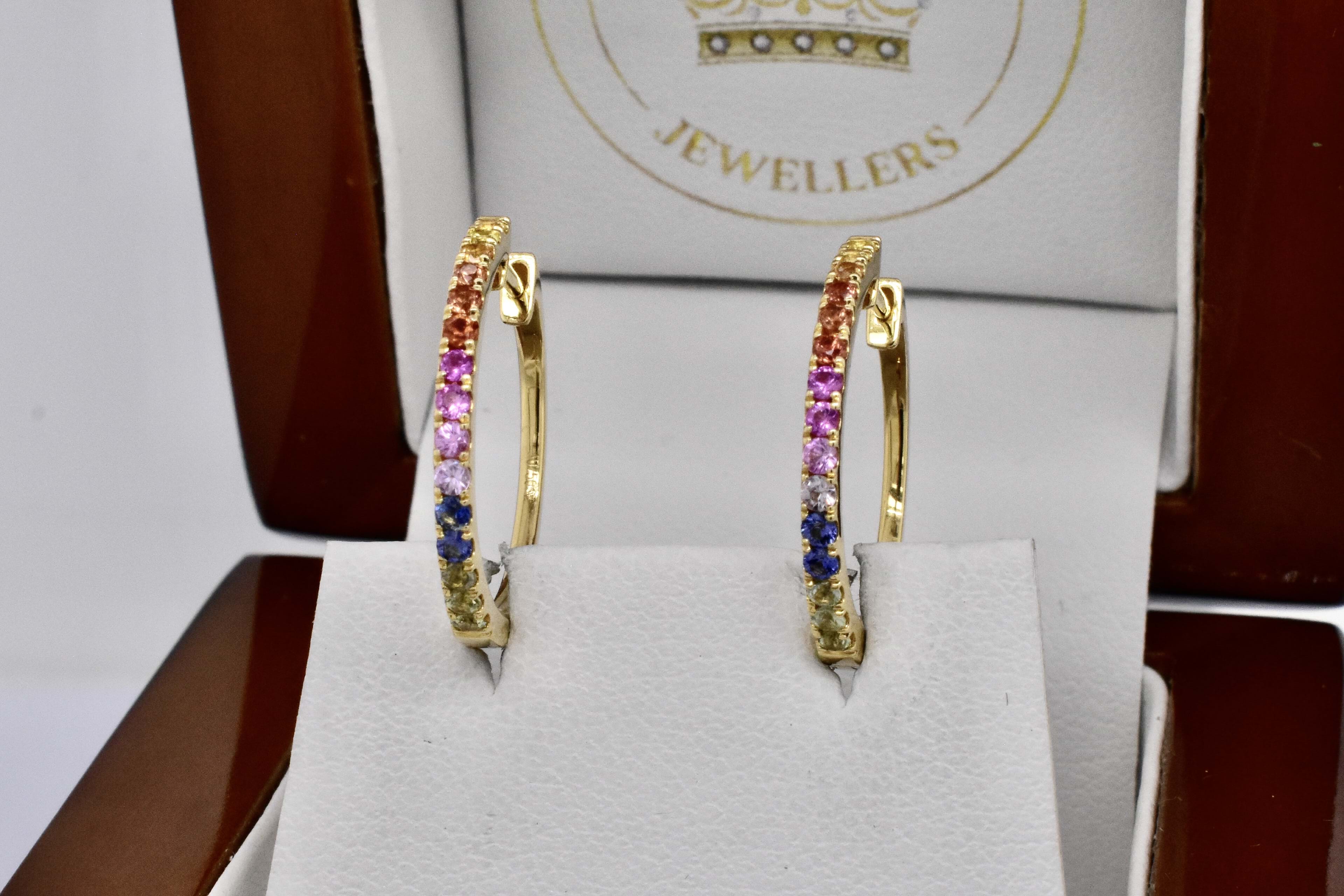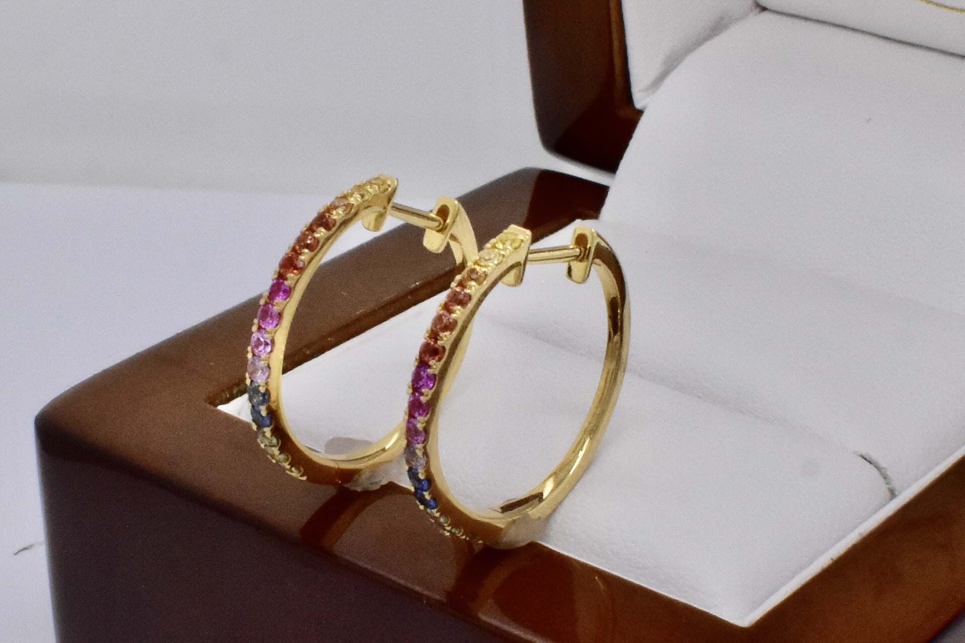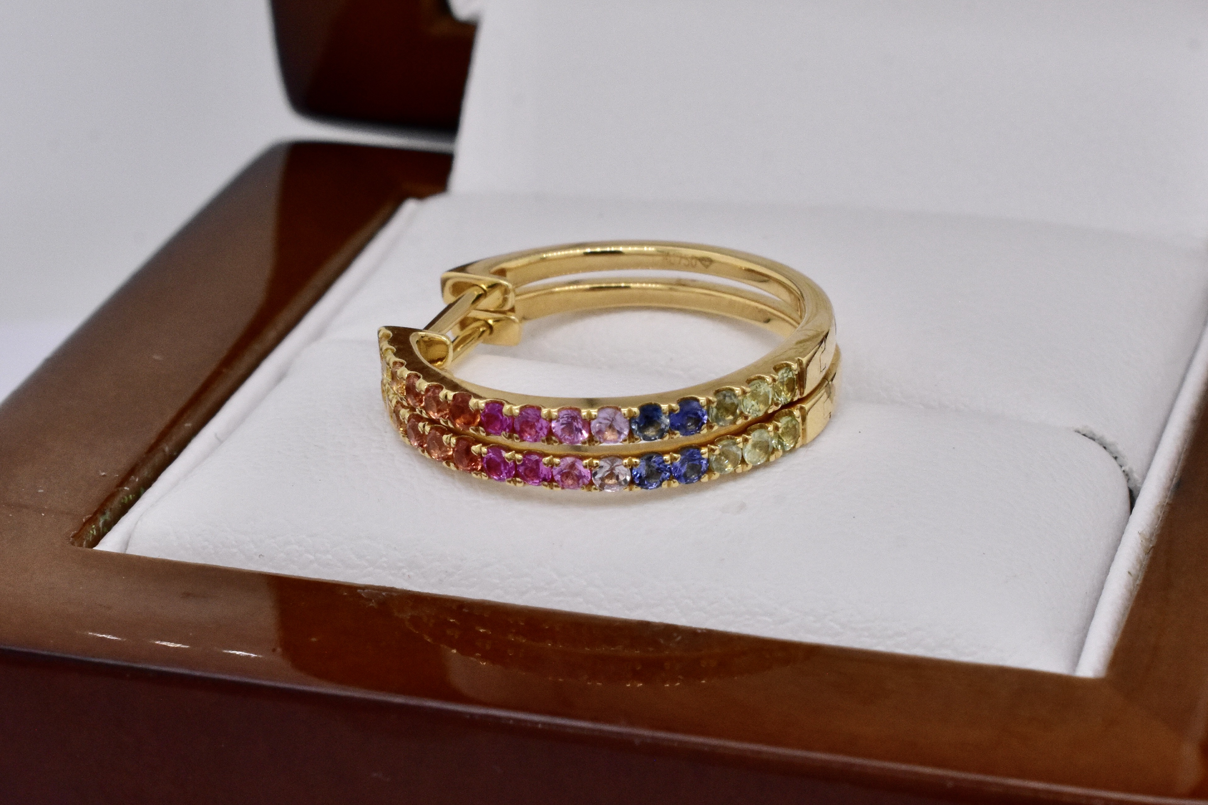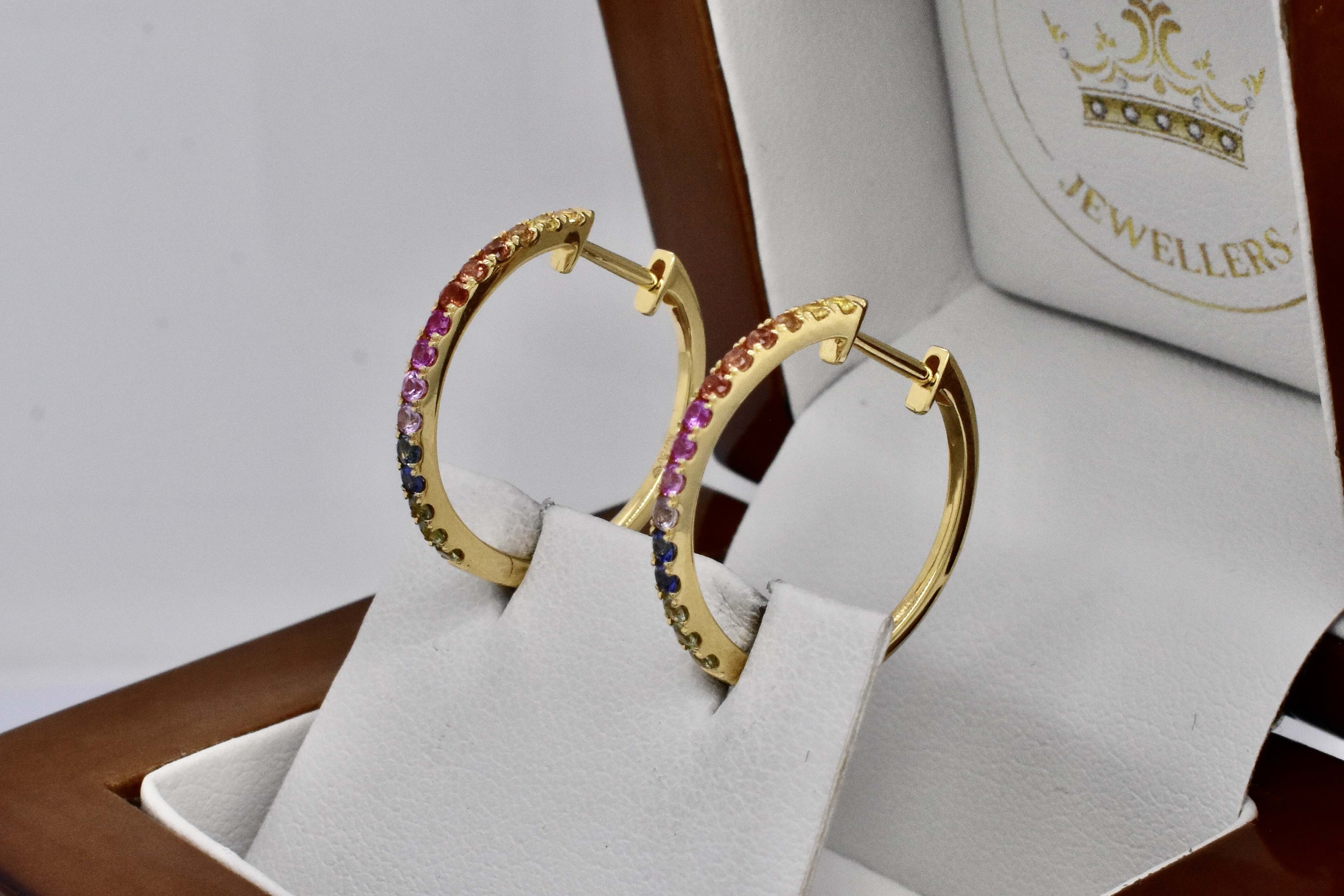 A colourful pair of 18ct yellow gold oval huggies, each cut down claw set with 15 round 1.50mm sapphires in various shades including green, blue, pink , orange and yellow, with a combined total weight of 0.58ct. Finished with clipped post fittings. Perfect to add a pop of colour to any outfit. Independent Valuation Supplied.