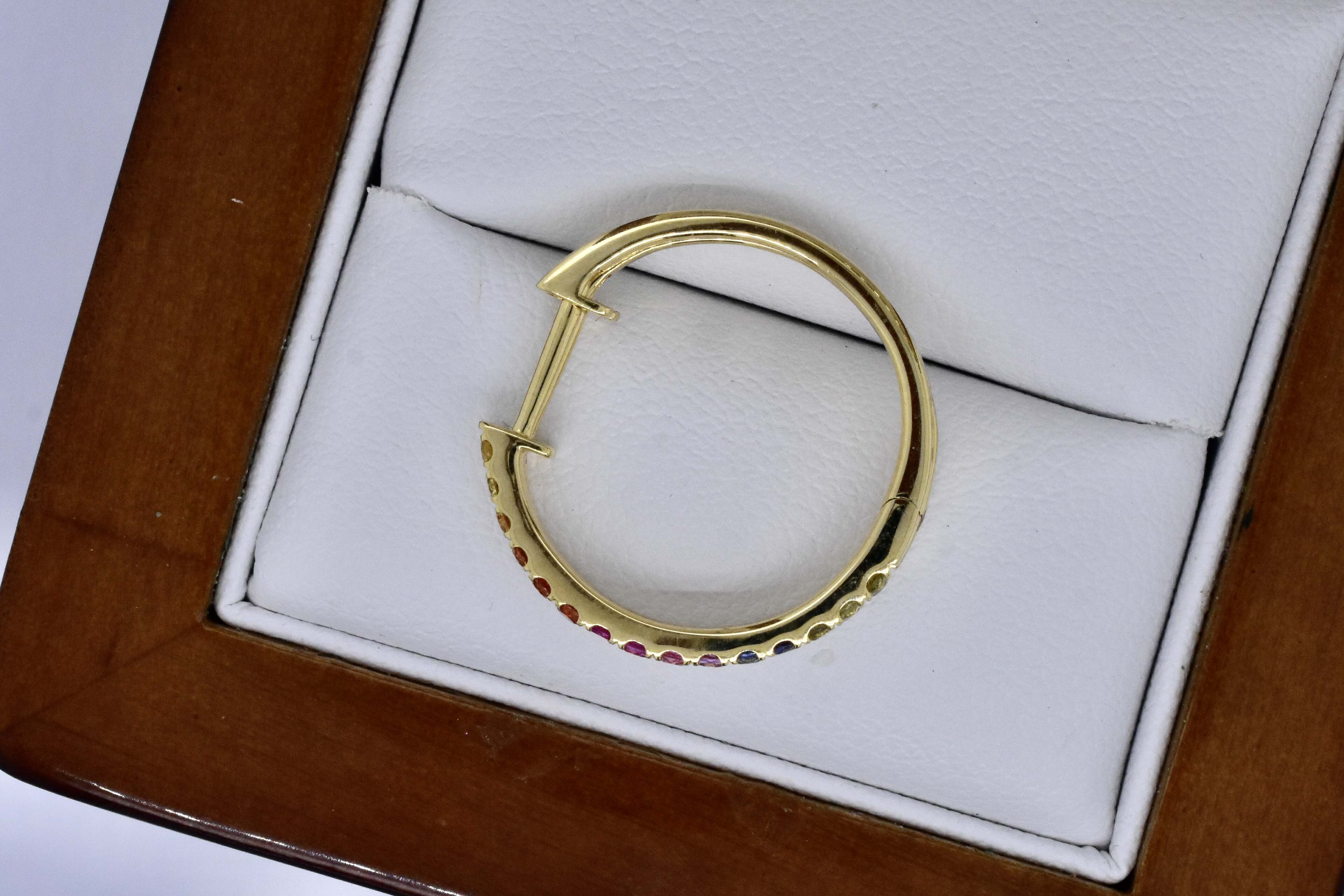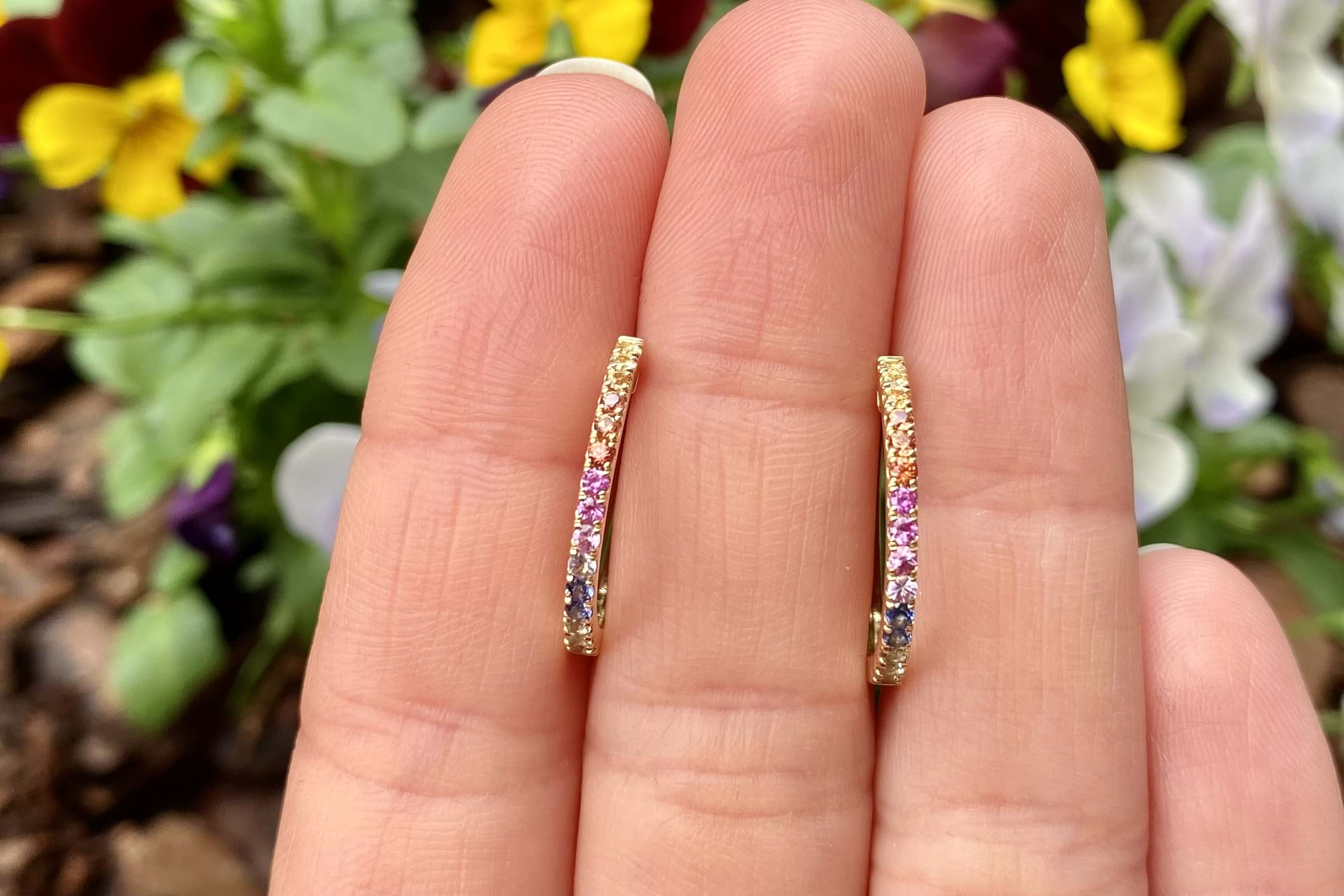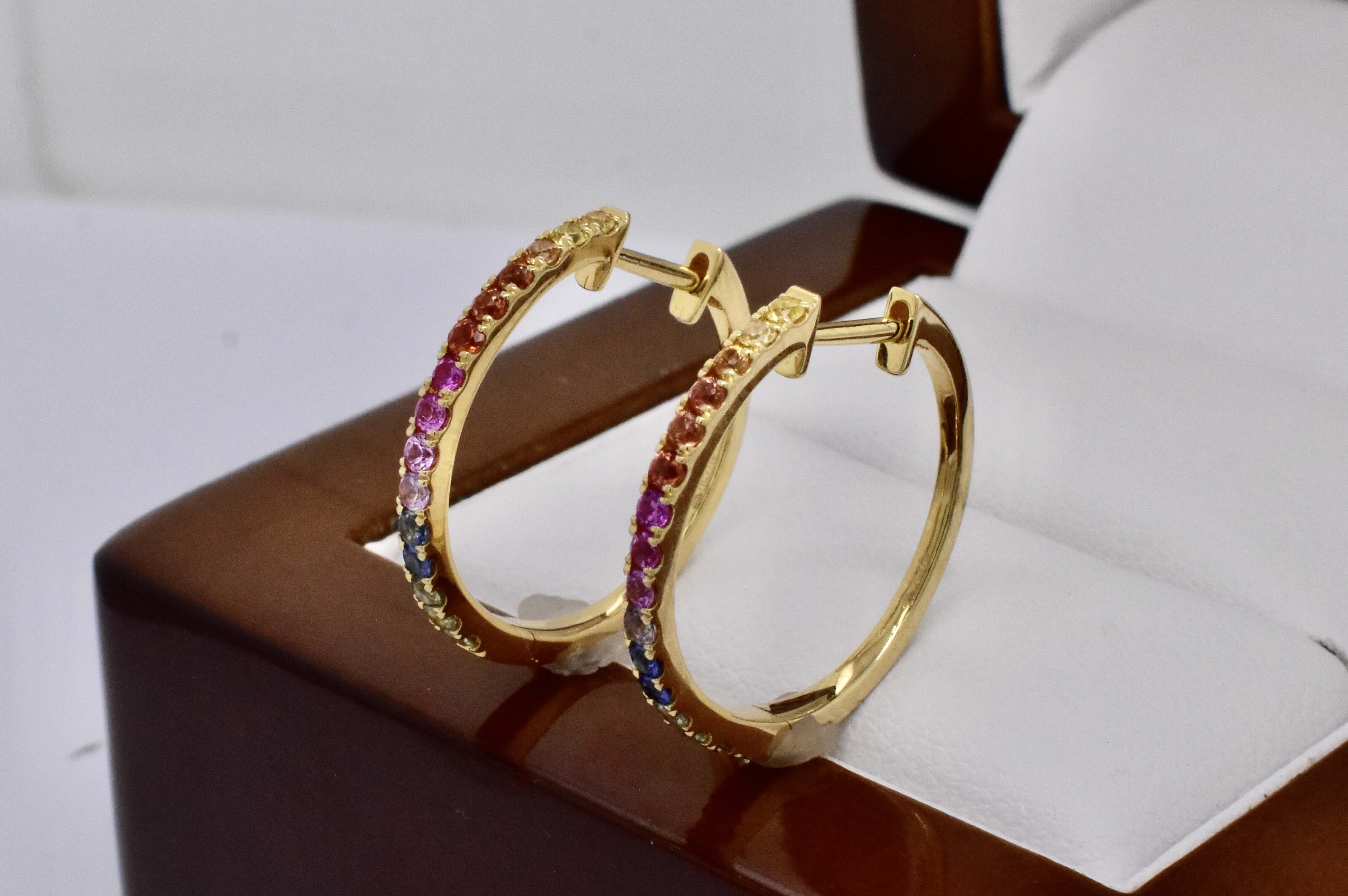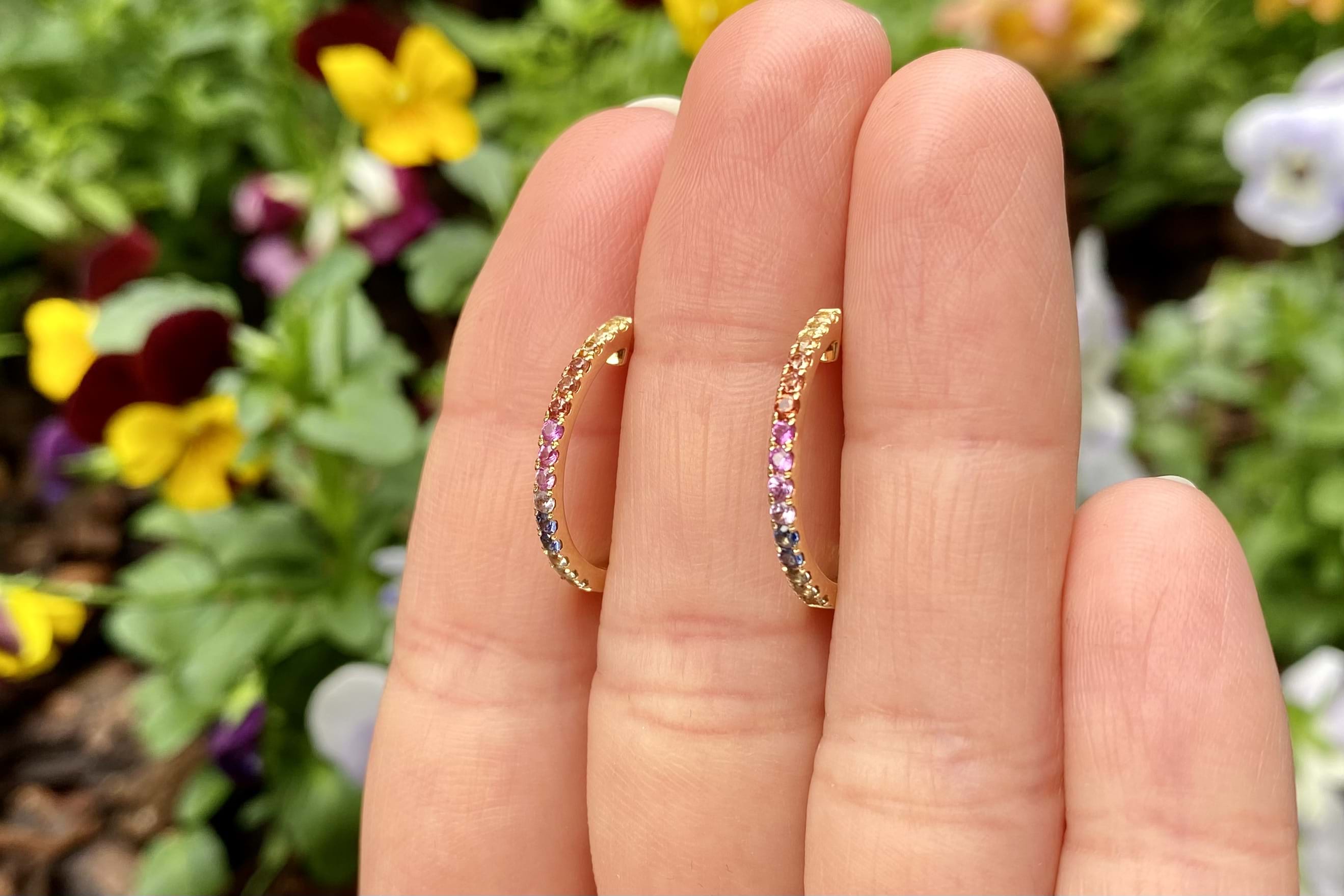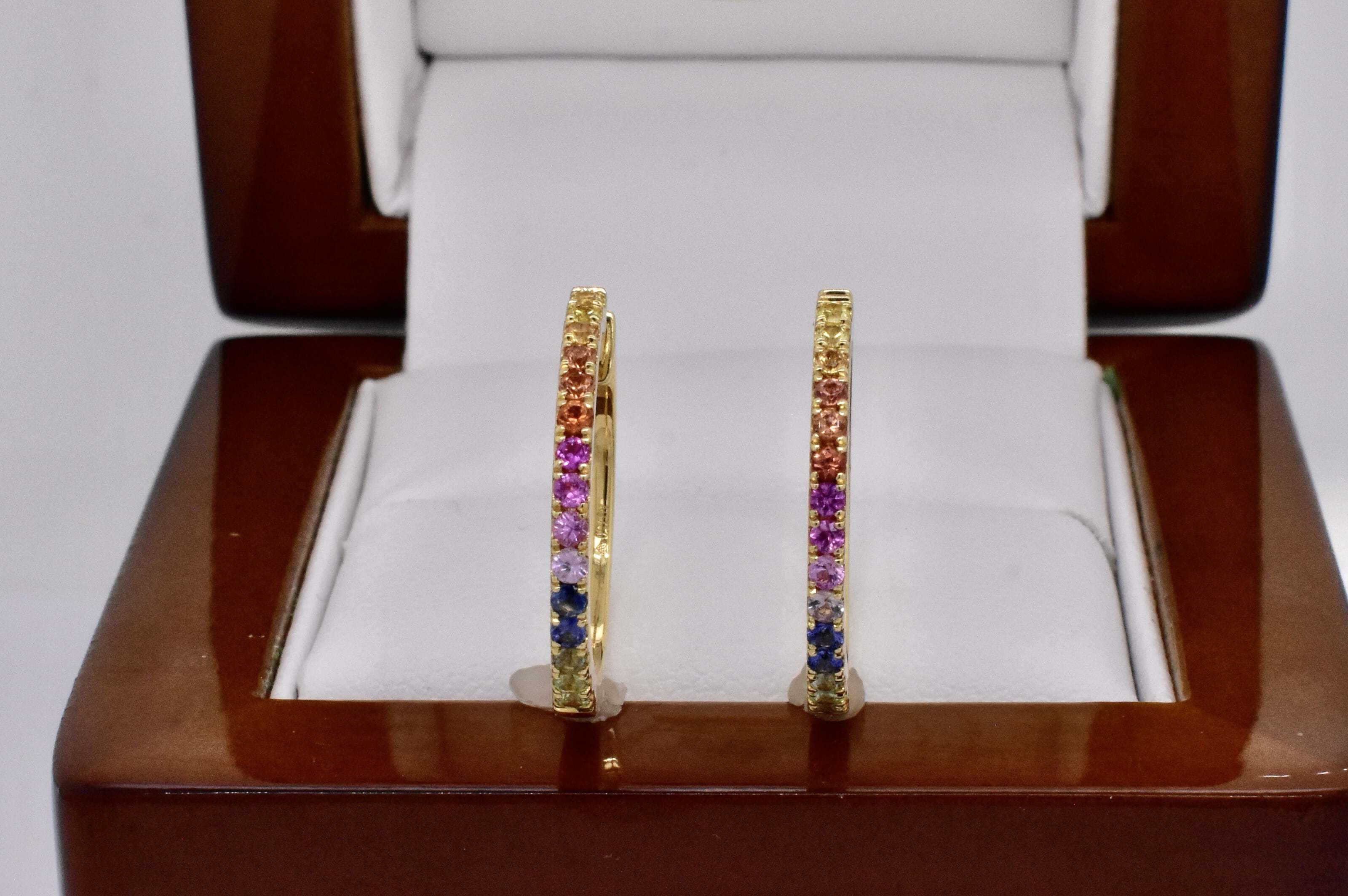 A colourful pair of 18ct yellow gold oval huggies, each cut down claw set with 15 round 1.50mm sapphires in various shades including green, blue, pink , orange and yellow, with a combined total weight of 0.58ct. Finished with clipped post fittings. Perfect to add a pop of colour to any outfit. Independent Valuation Supplied.