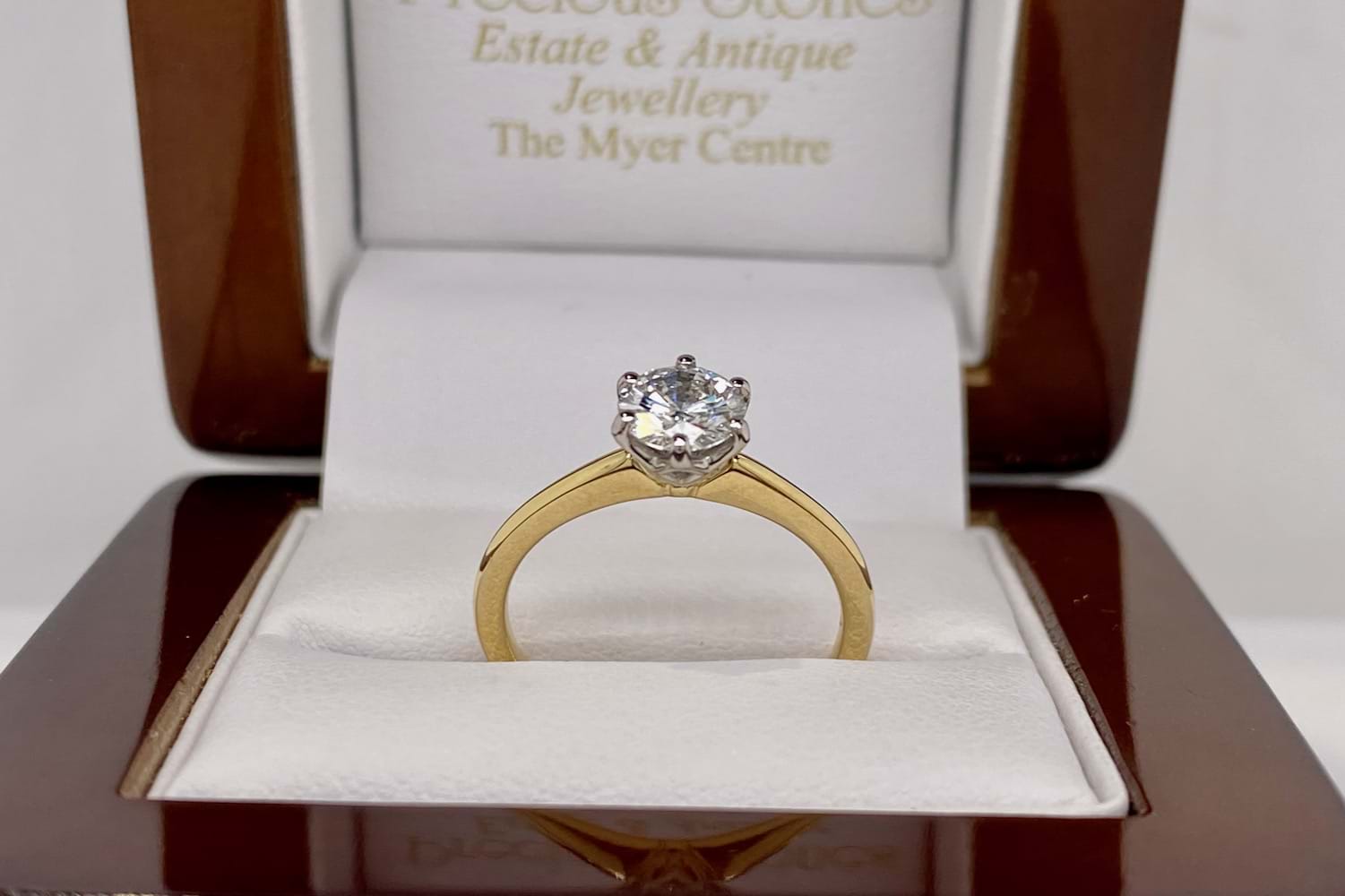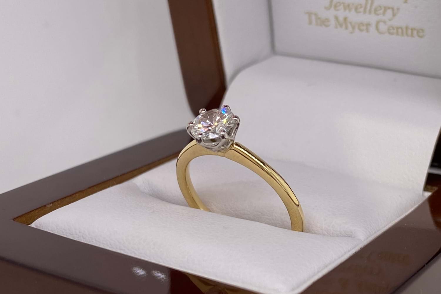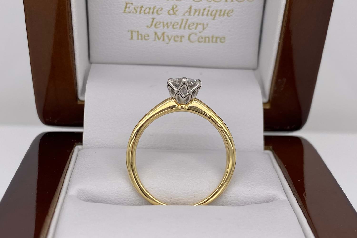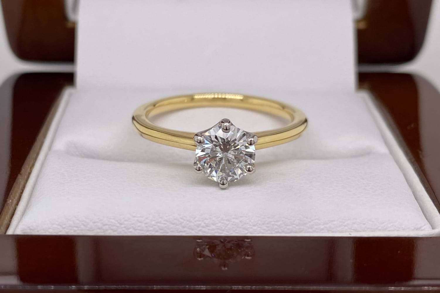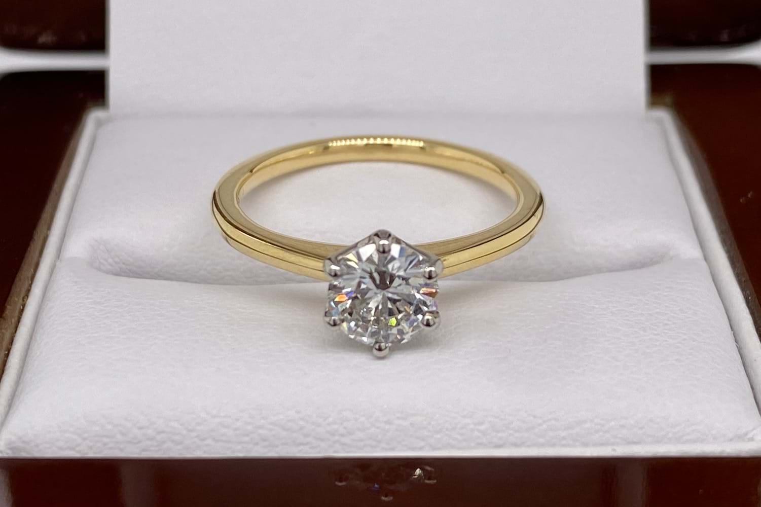 This scintillating 0.71ct G/SI2 round brilliant cut diamond has been hand selected in store to feature in one of our signature solitaire designs - the vine. A feminine, yet practical, setting which showcases the beauty of the diamond through its contemporary simplicity. This ring features a gentle knife edge band in 18ct yellow gold with a white gold vine basket. Our vine solitaire is available in any quality round diamond (0.50ct+) and in any combination of metals. Size M. Independent Valuation Supplied