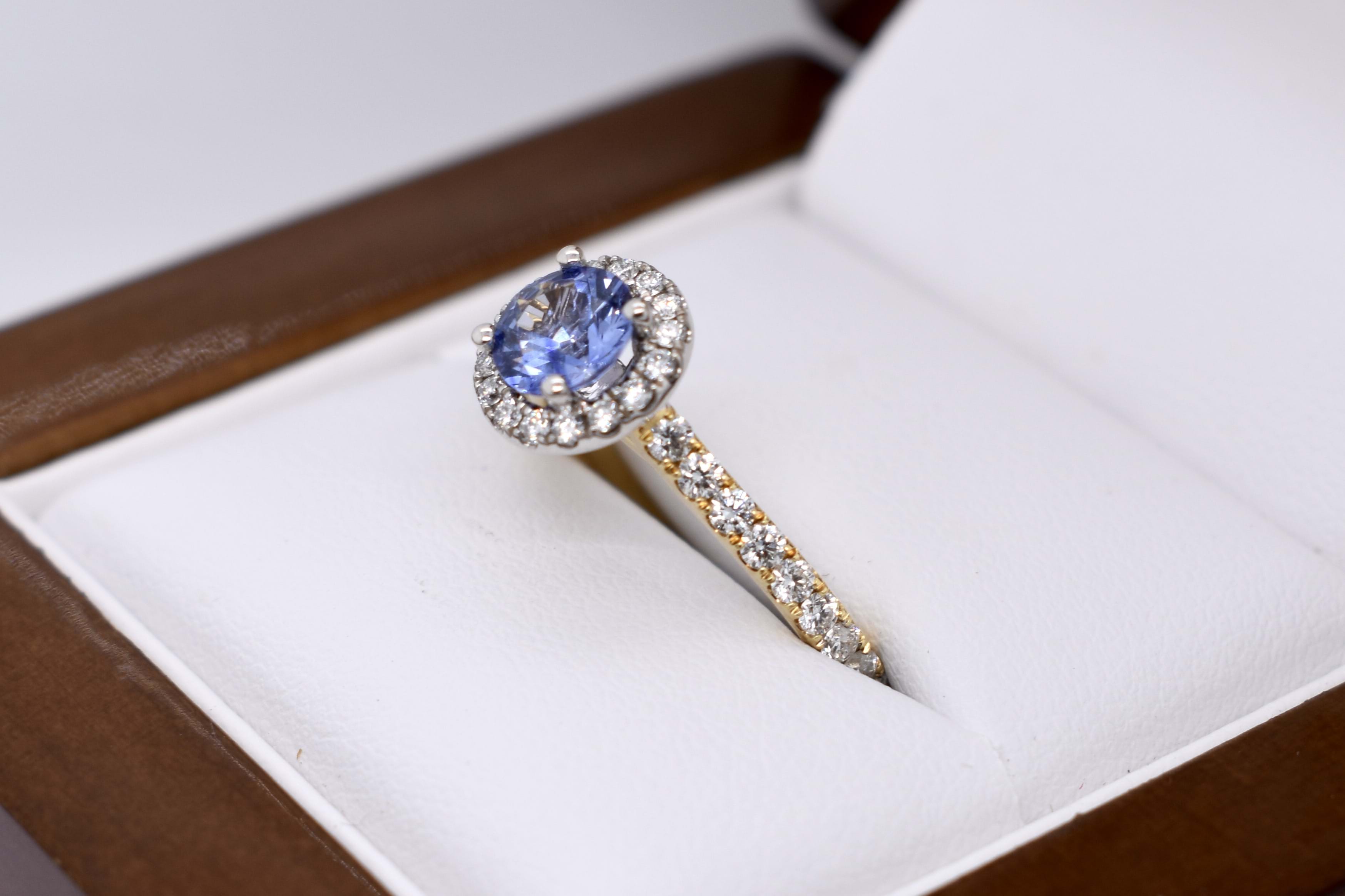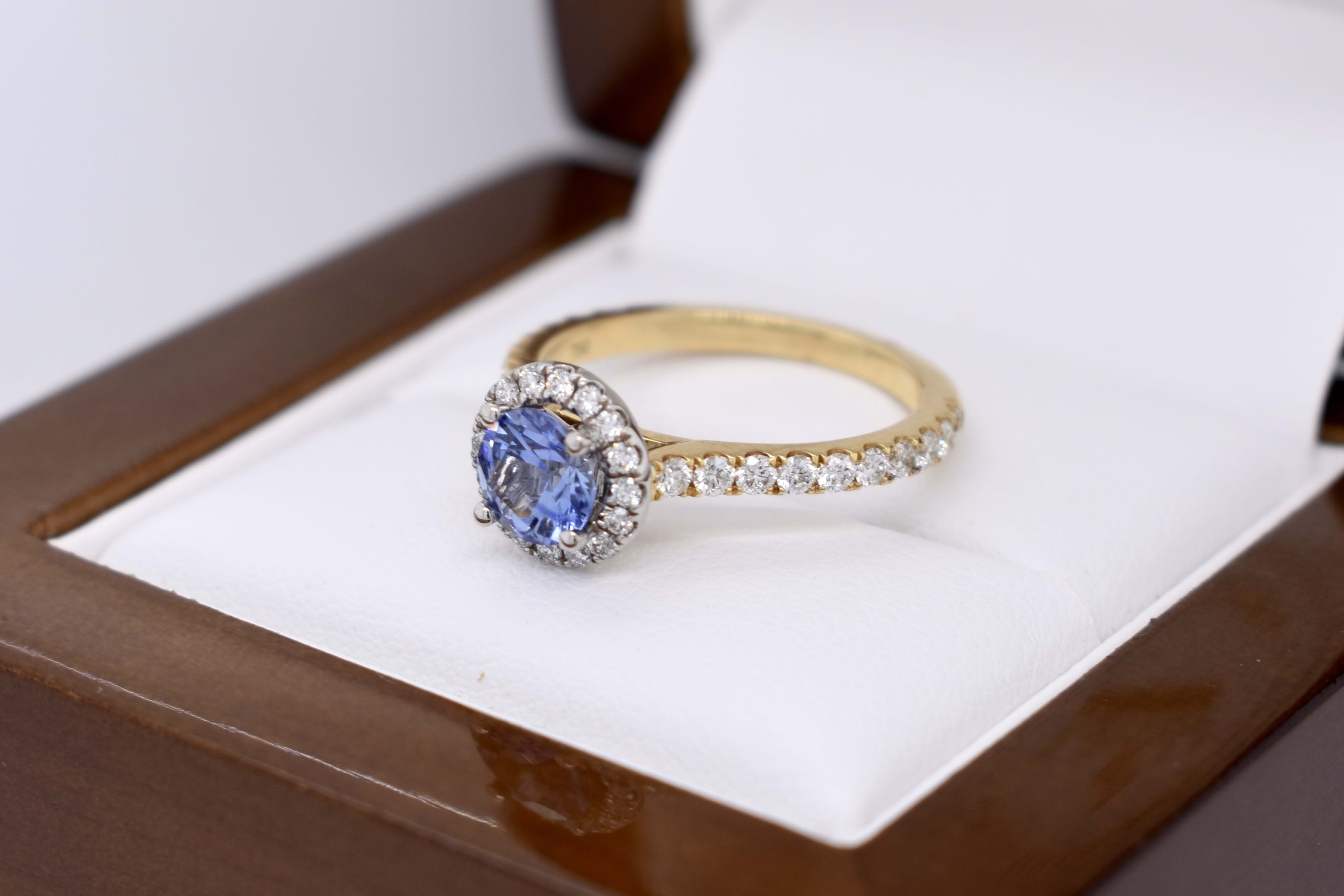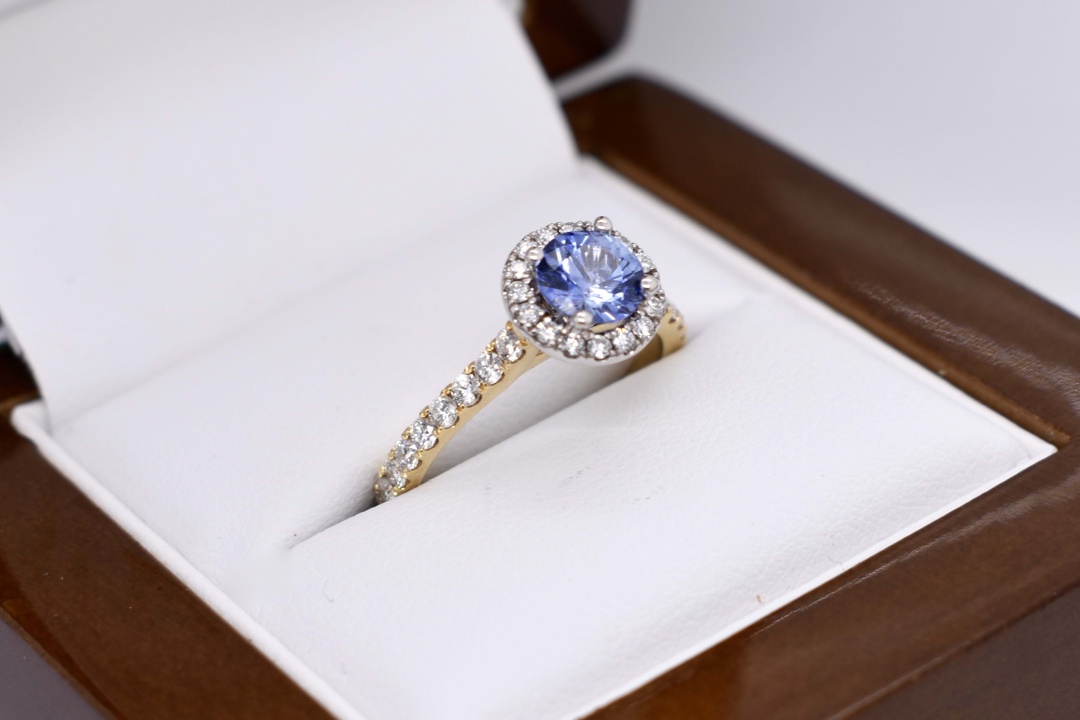 This gorgeous ring features a bright/light blue round Ceylon sapphire weighing 0.87ct and is four claw set, in 18ct yellow gold. Set with a dazzling round halo of round brilliant cut white diamonds which continue down the band. There is also a hidden diamond beneath the stone. Total of 38 diamonds, totalling 0.51ct G SI. Finger size L. Independent Valuation available upon purchase.