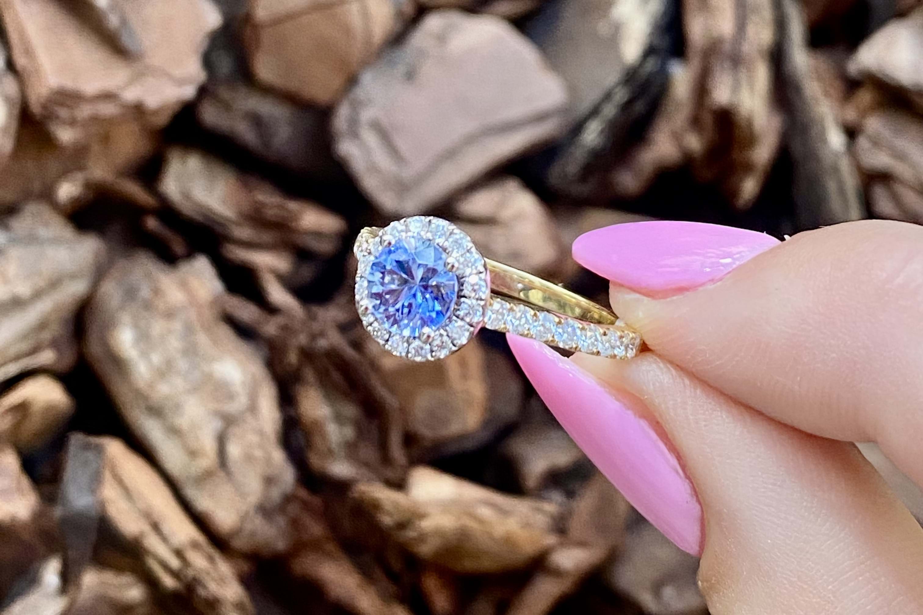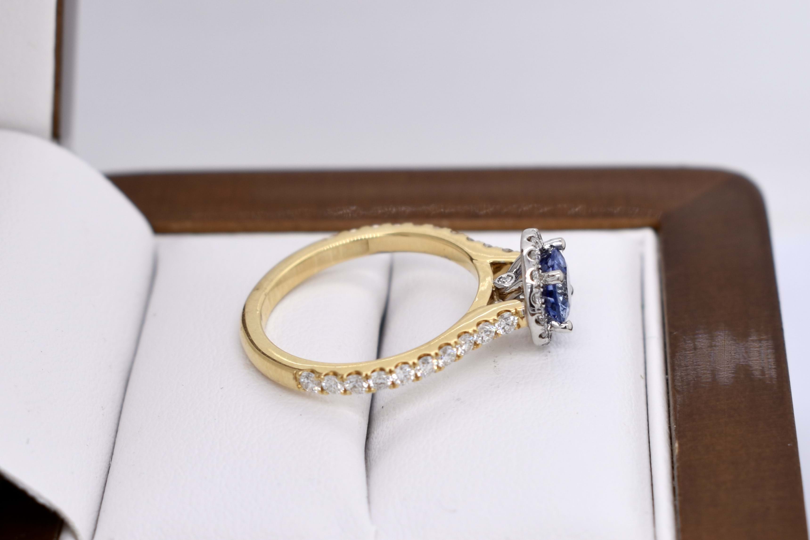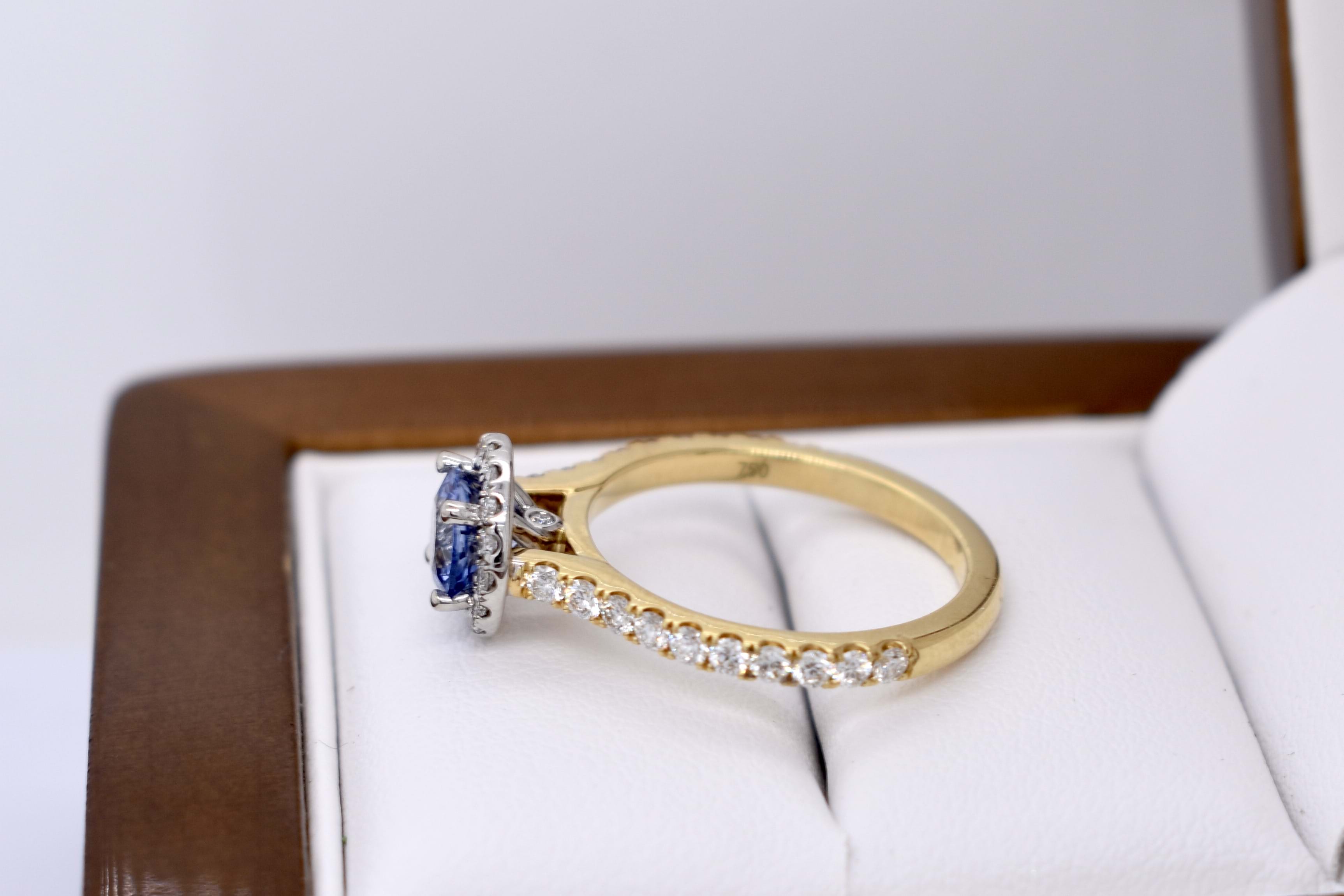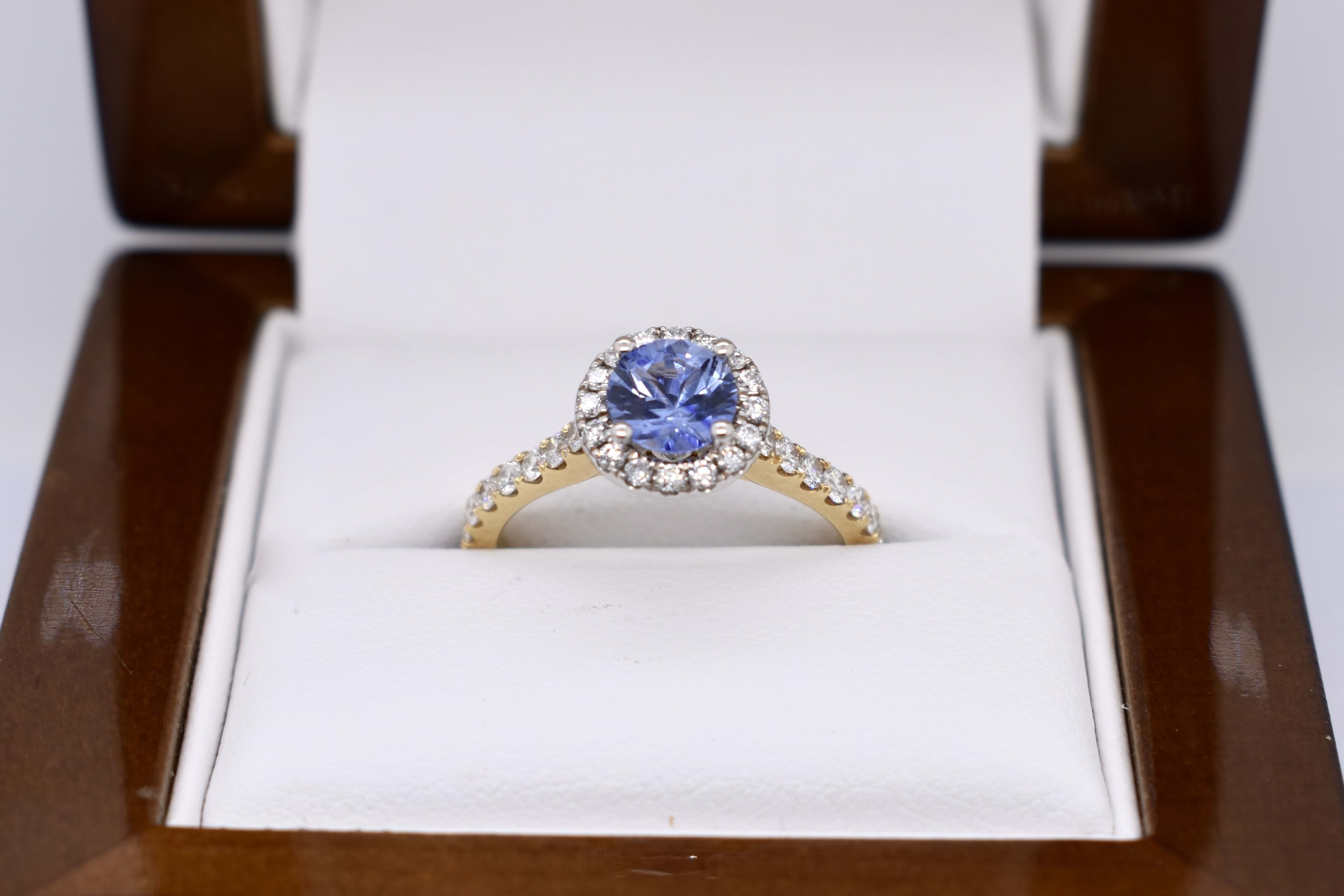This gorgeous ring features a bright/light blue round Ceylon sapphire weighing 0.87ct and is four claw set, in 18ct yellow gold. Set with a dazzling round halo of round brilliant cut white diamonds which continue down the band. There is also a hidden diamond beneath the stone. Total of 38 diamonds, totalling 0.51ct G SI. Finger size L. Independent Valuation available upon purchase.
