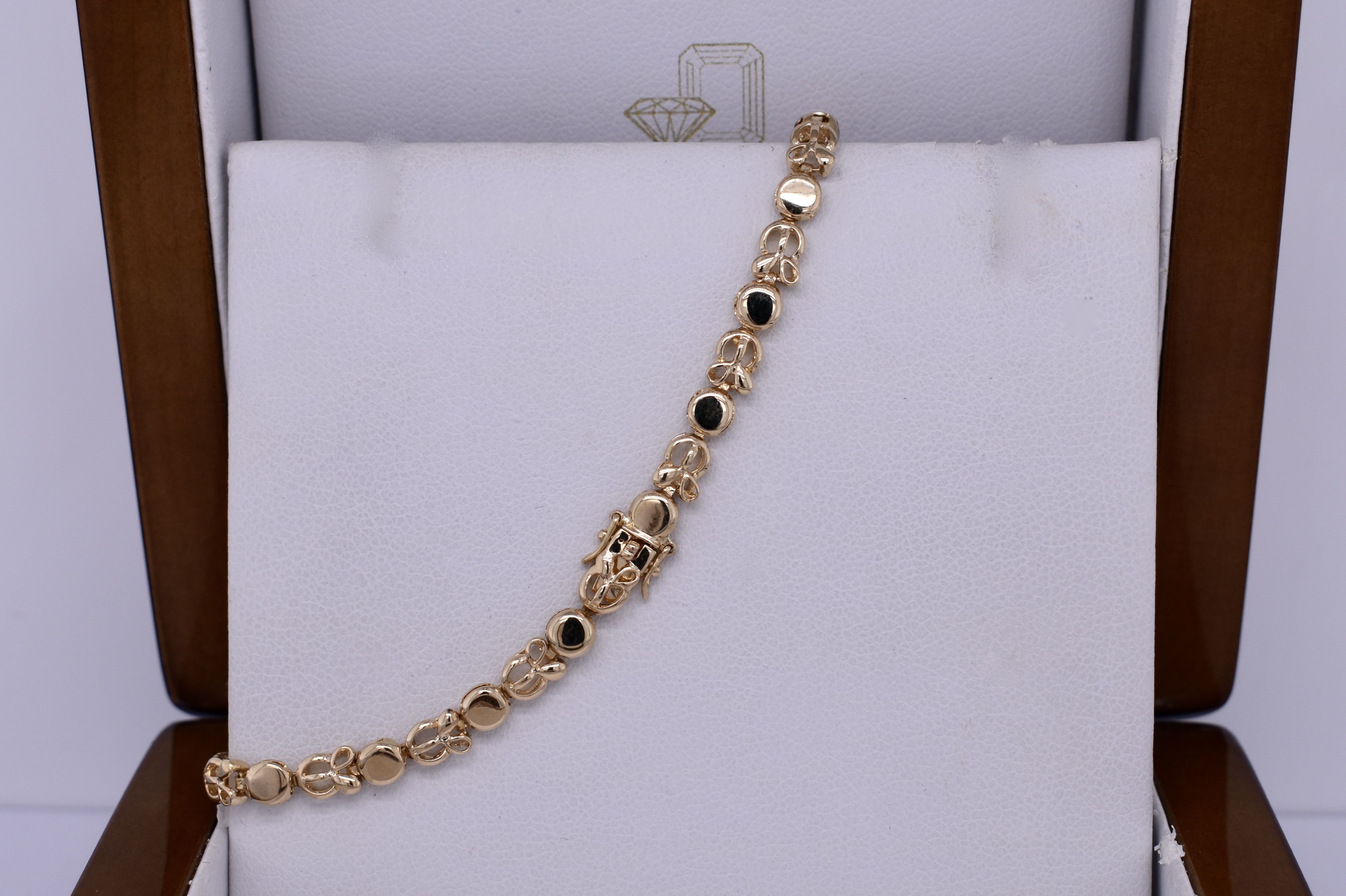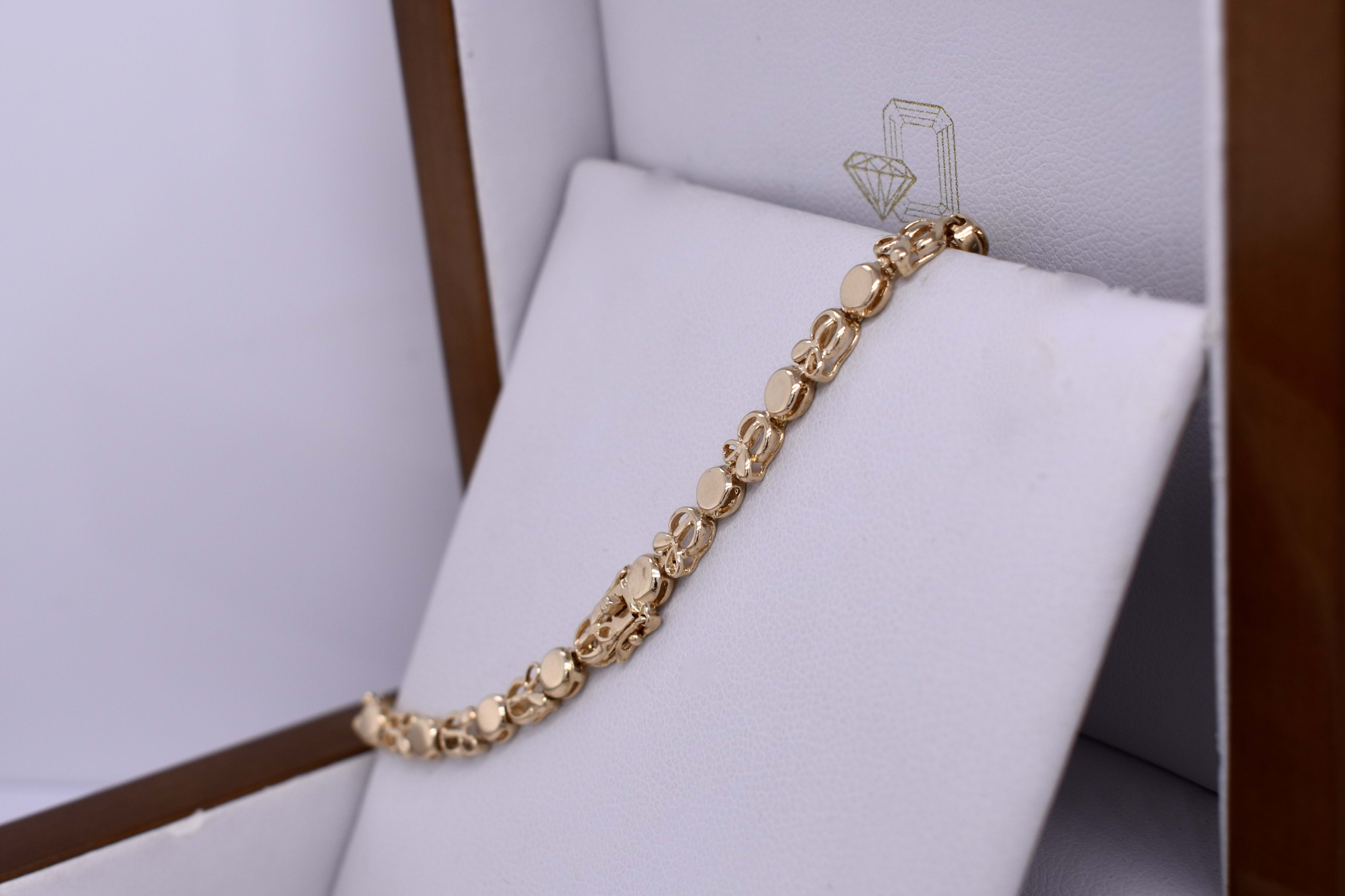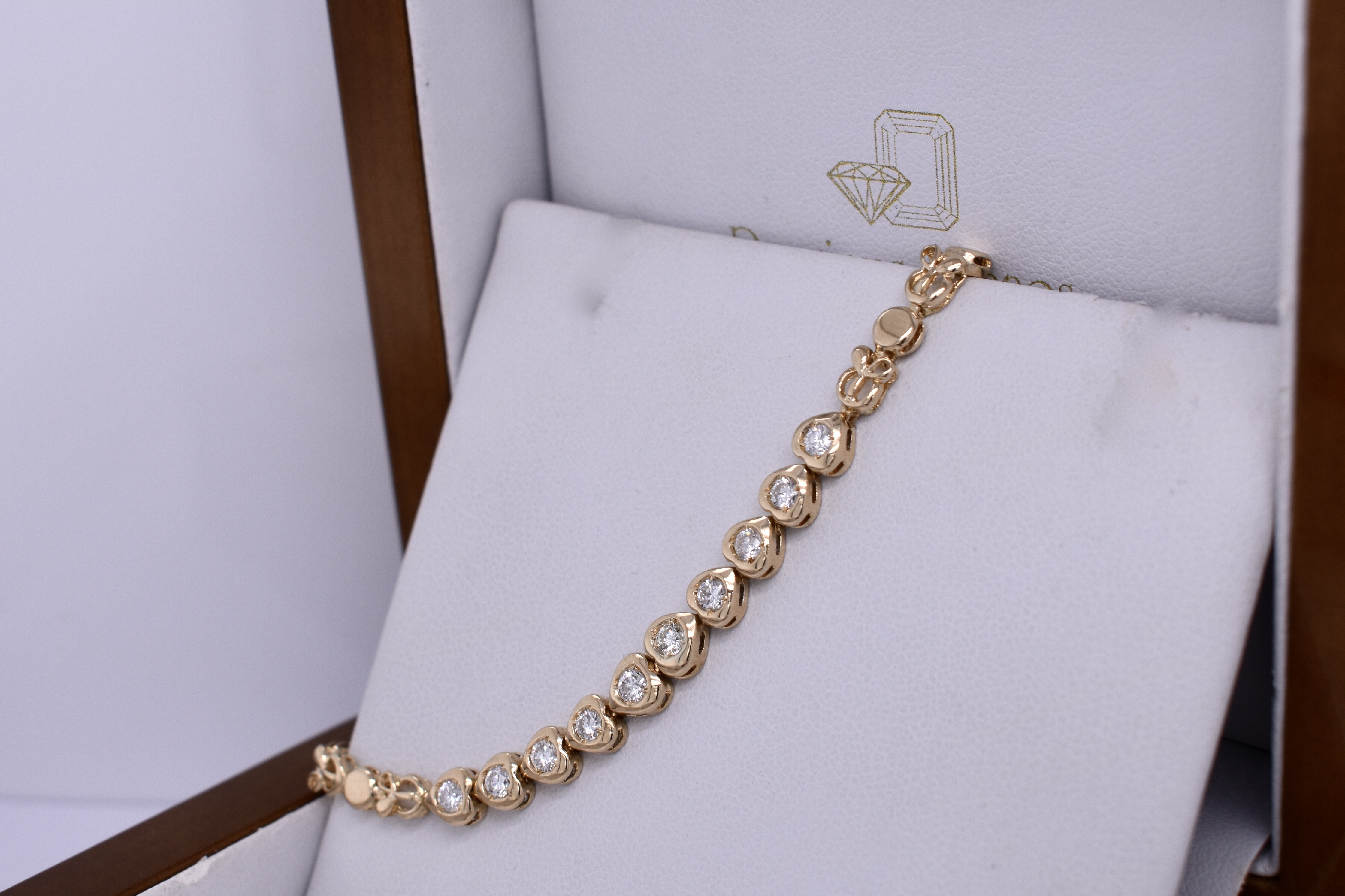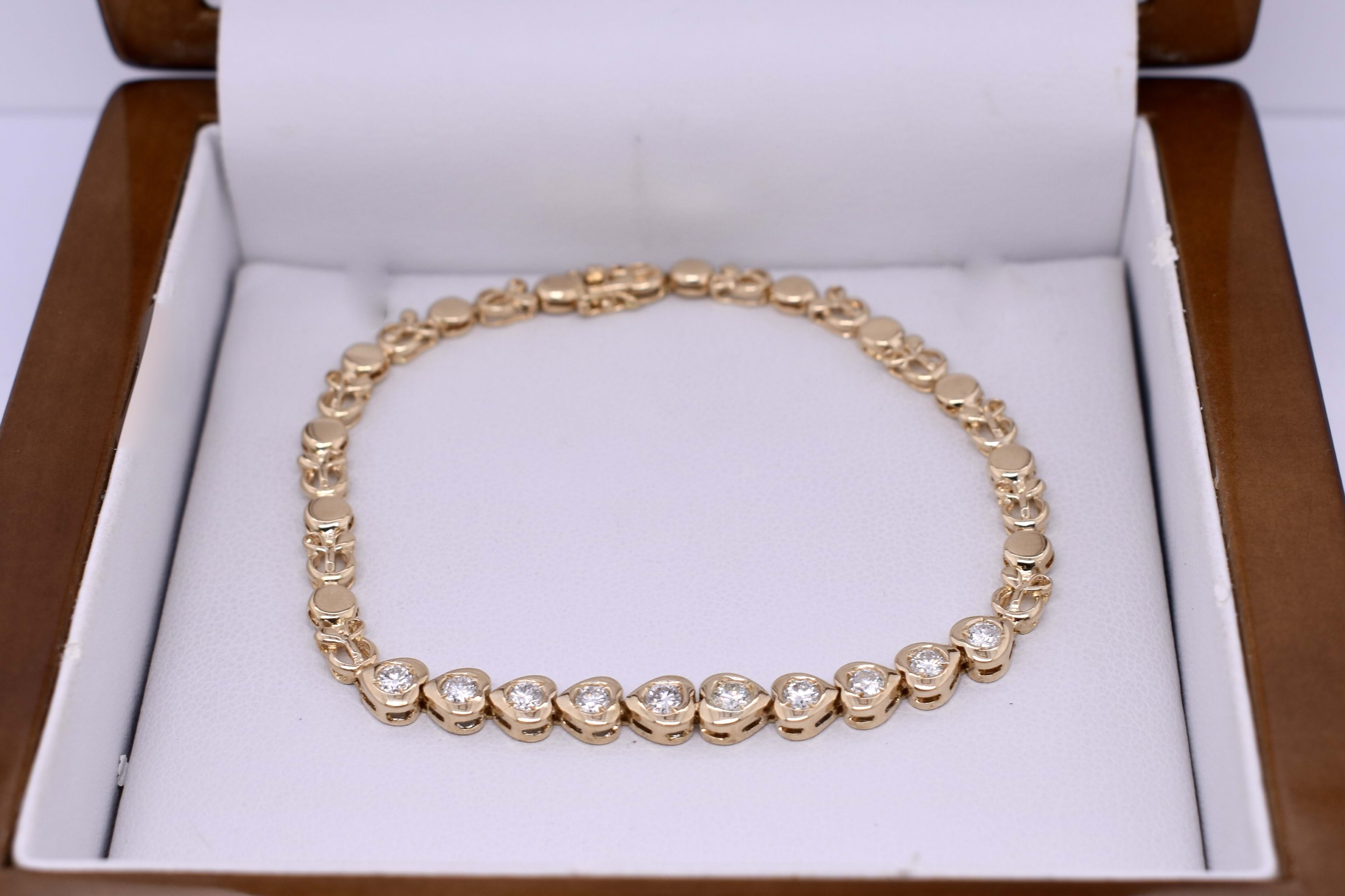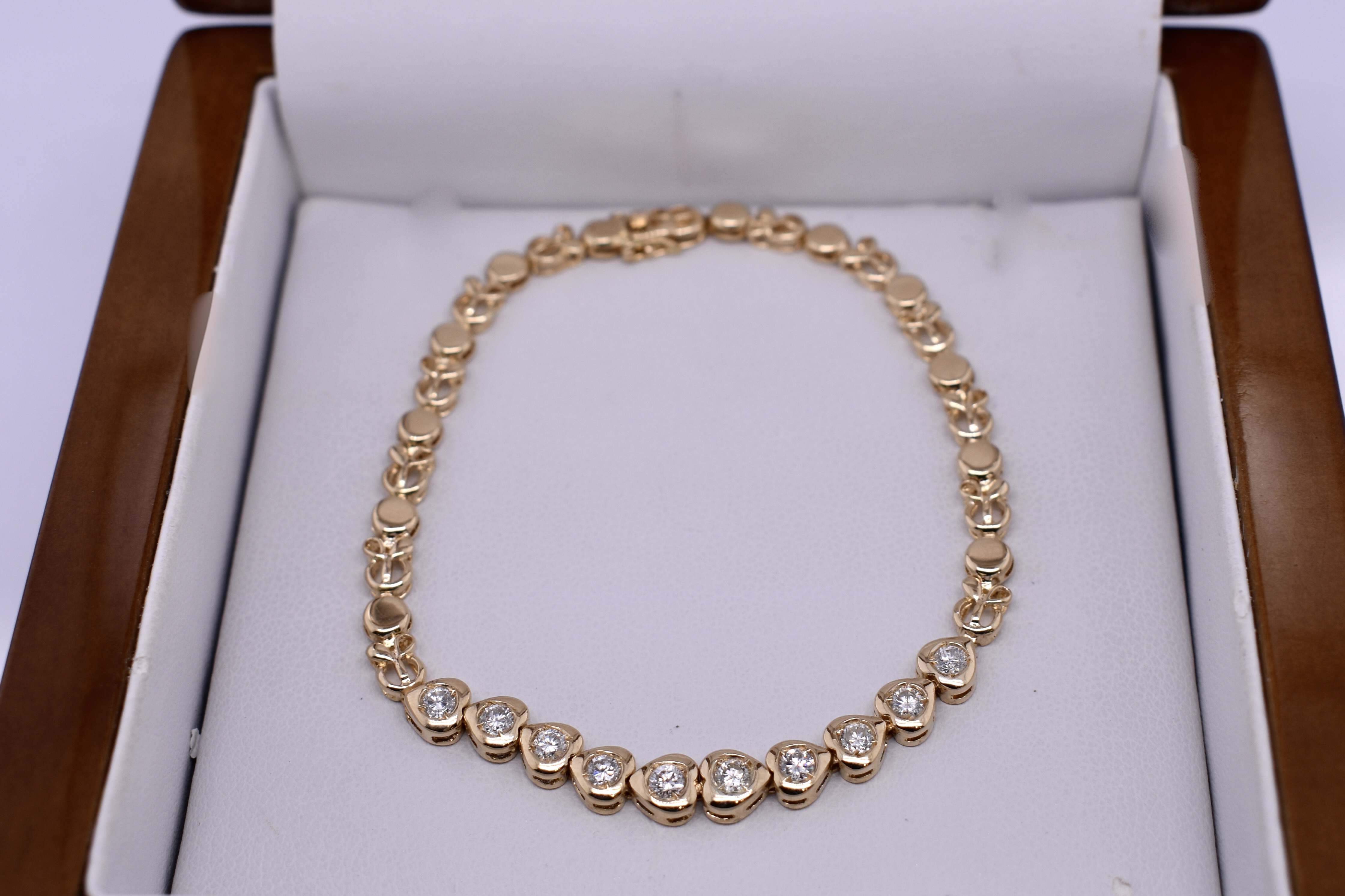 Crafted in 18ct yellow gold, this stunning diamond bracelet features a row of 10 round brilliant cut diamonds, each set within softly contoured heart shaped links. The diamonds, with a total weight of 1.00ct, are beautifully spaced in a gently graduated design. The bracelet measures 17.5cm in length and transitions into circular and looped gold links. Finished with a concealed box clasp and couple figure eight safety catches for extra security. Total weight 9.21grams.