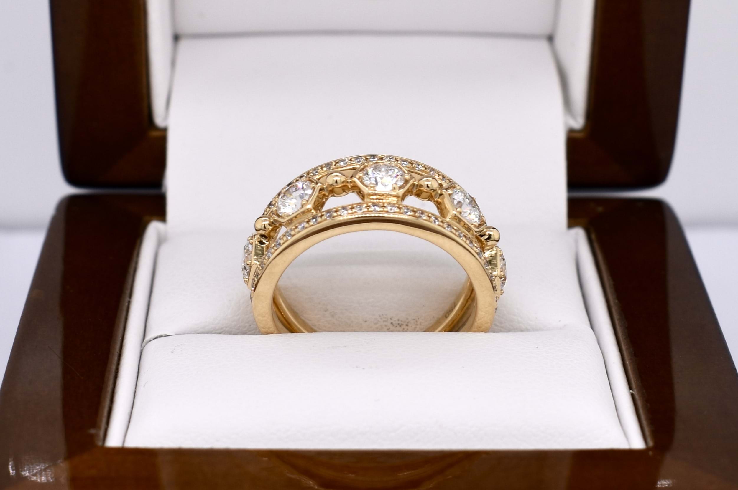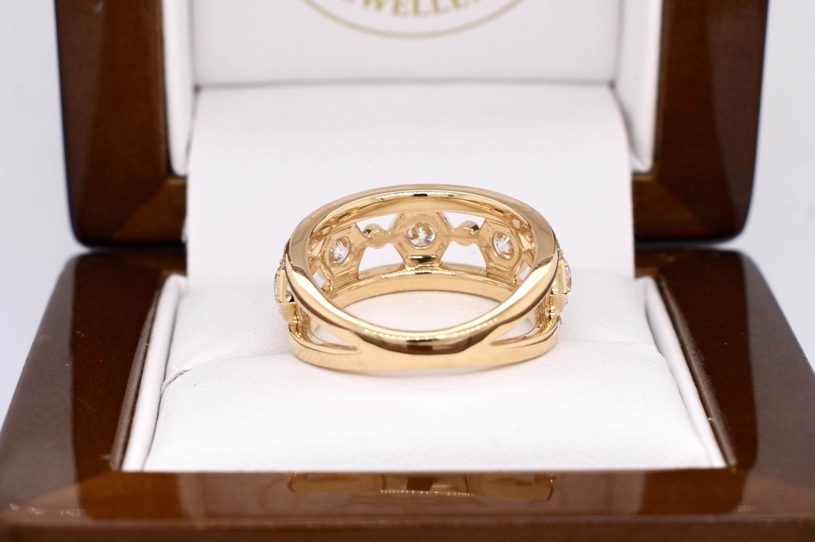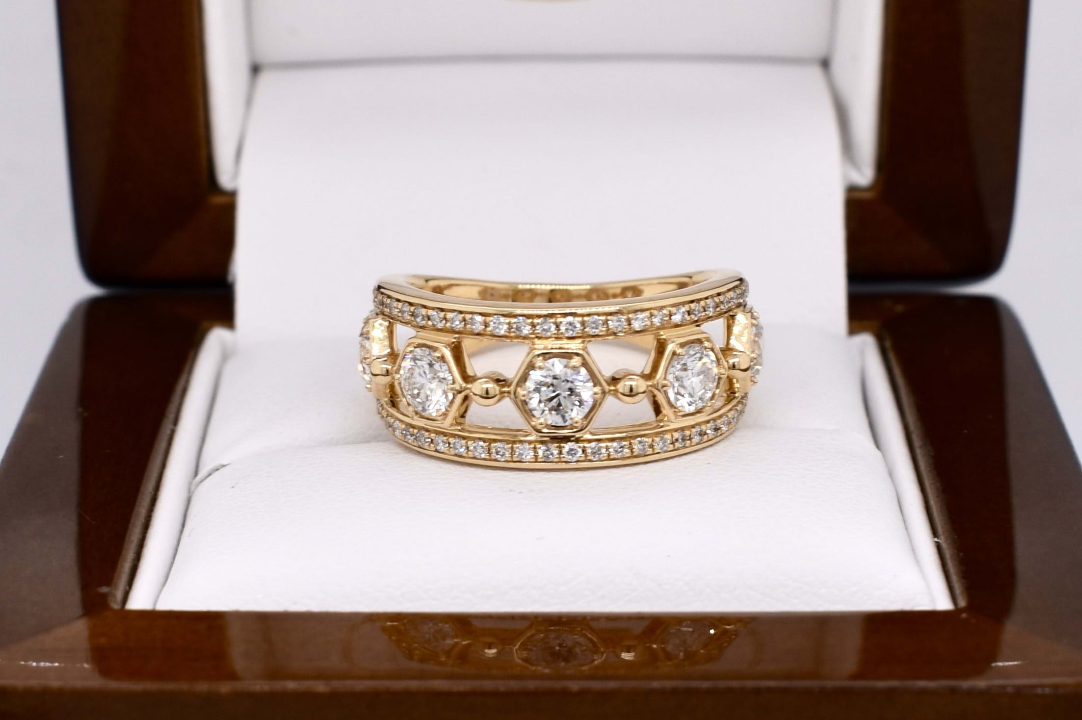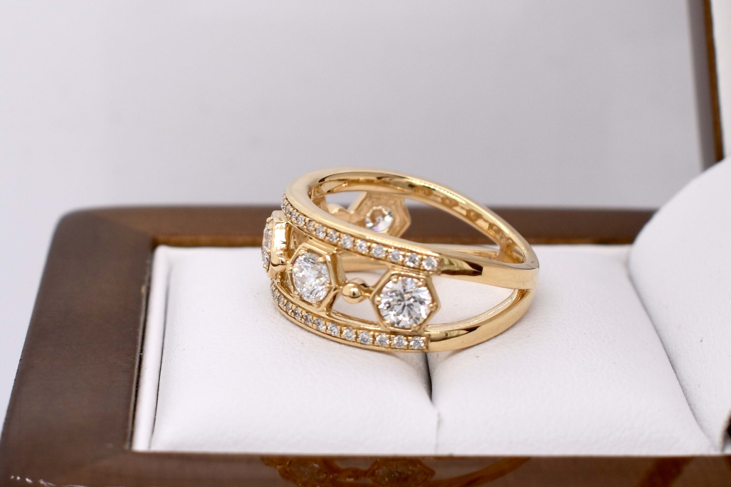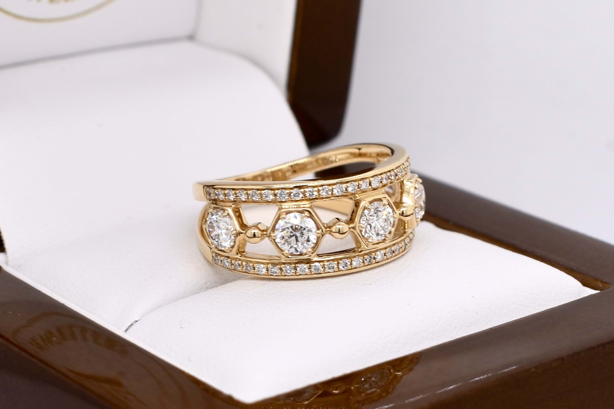 Absolute showstopper, this awesome wide dress ring is crafted in 18ct yellow gold and contains 57 round brilliant cut diamonds. The larger ones are set in hexagonal bezels through the gapped centre and a border of smaller diamonds are grain set above and below. Total diamond weight of 1.27ct G SI1. Finger size M+. Independent Valuation available upon purchase.