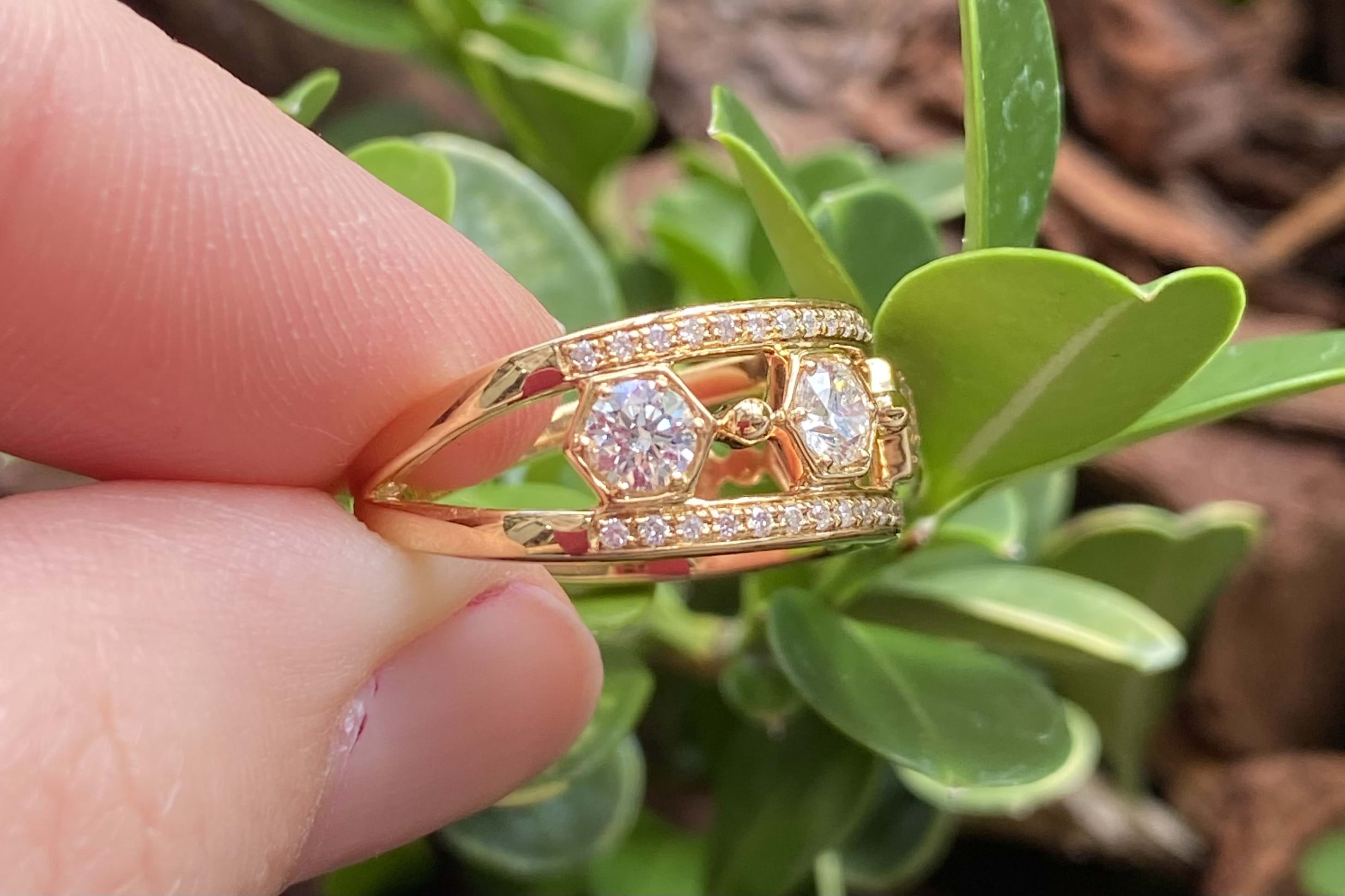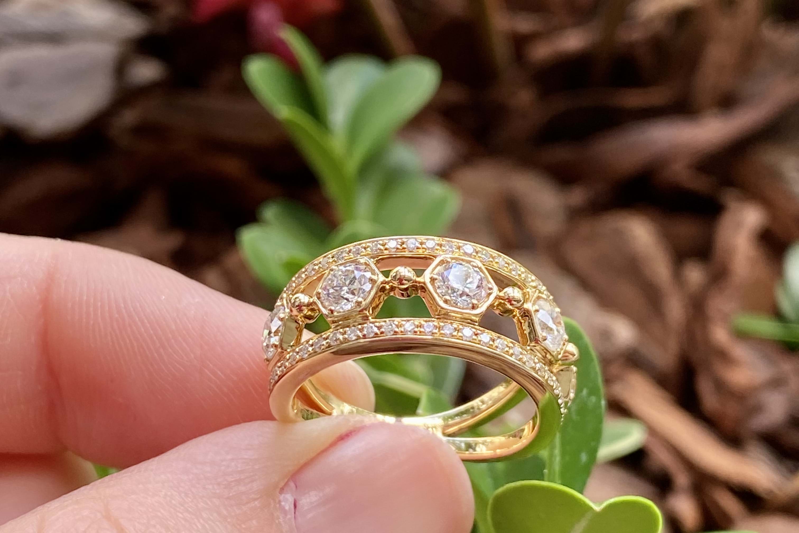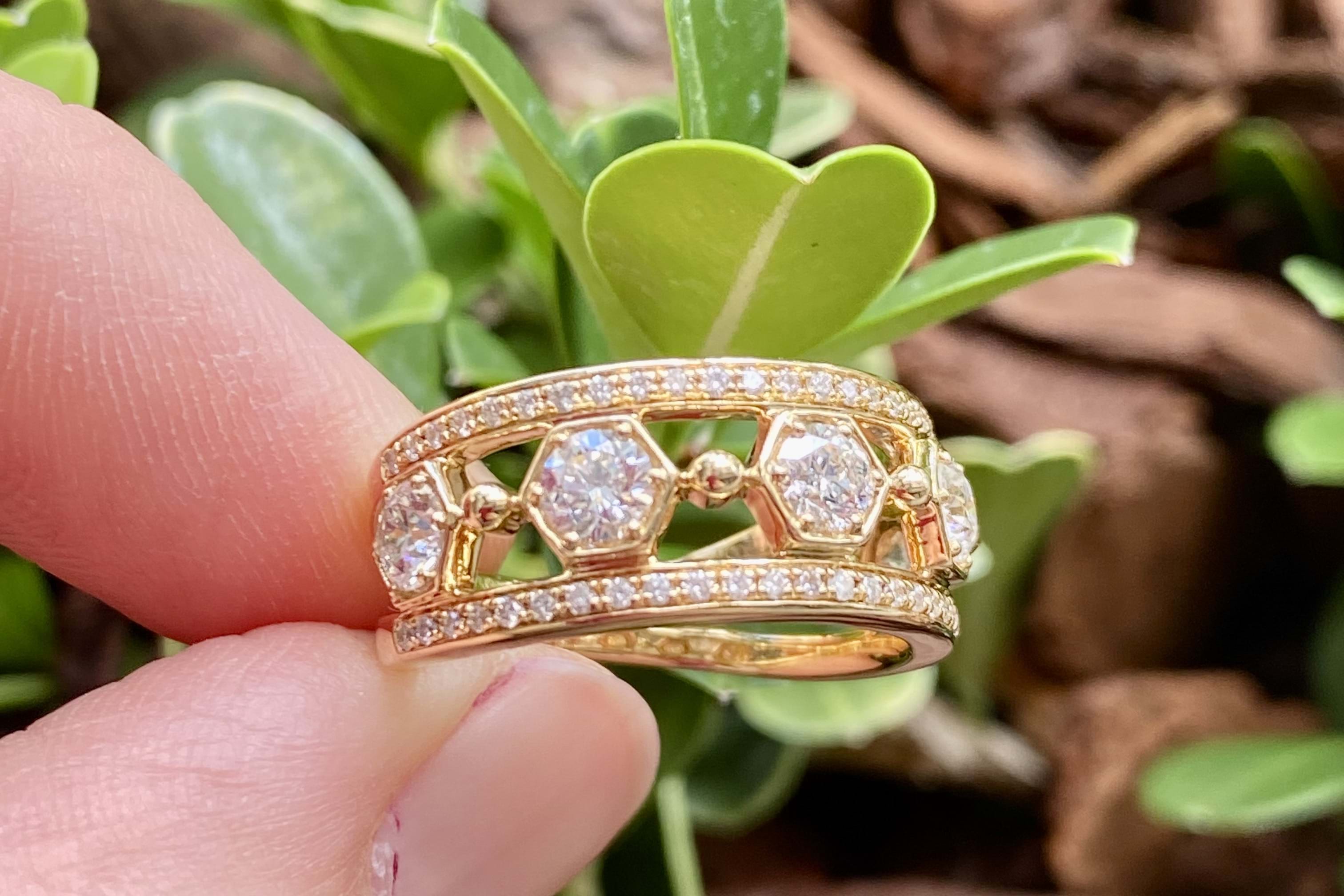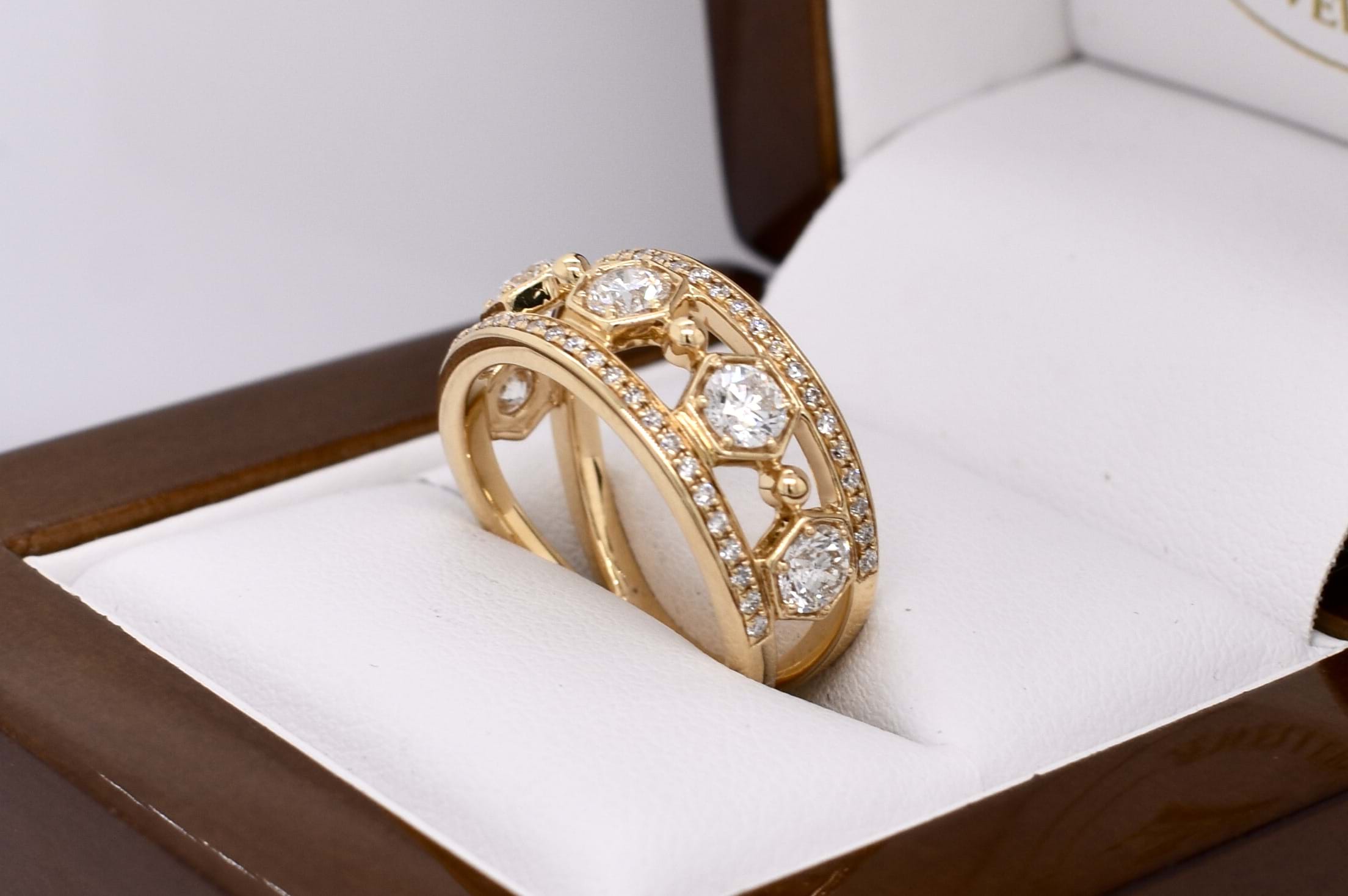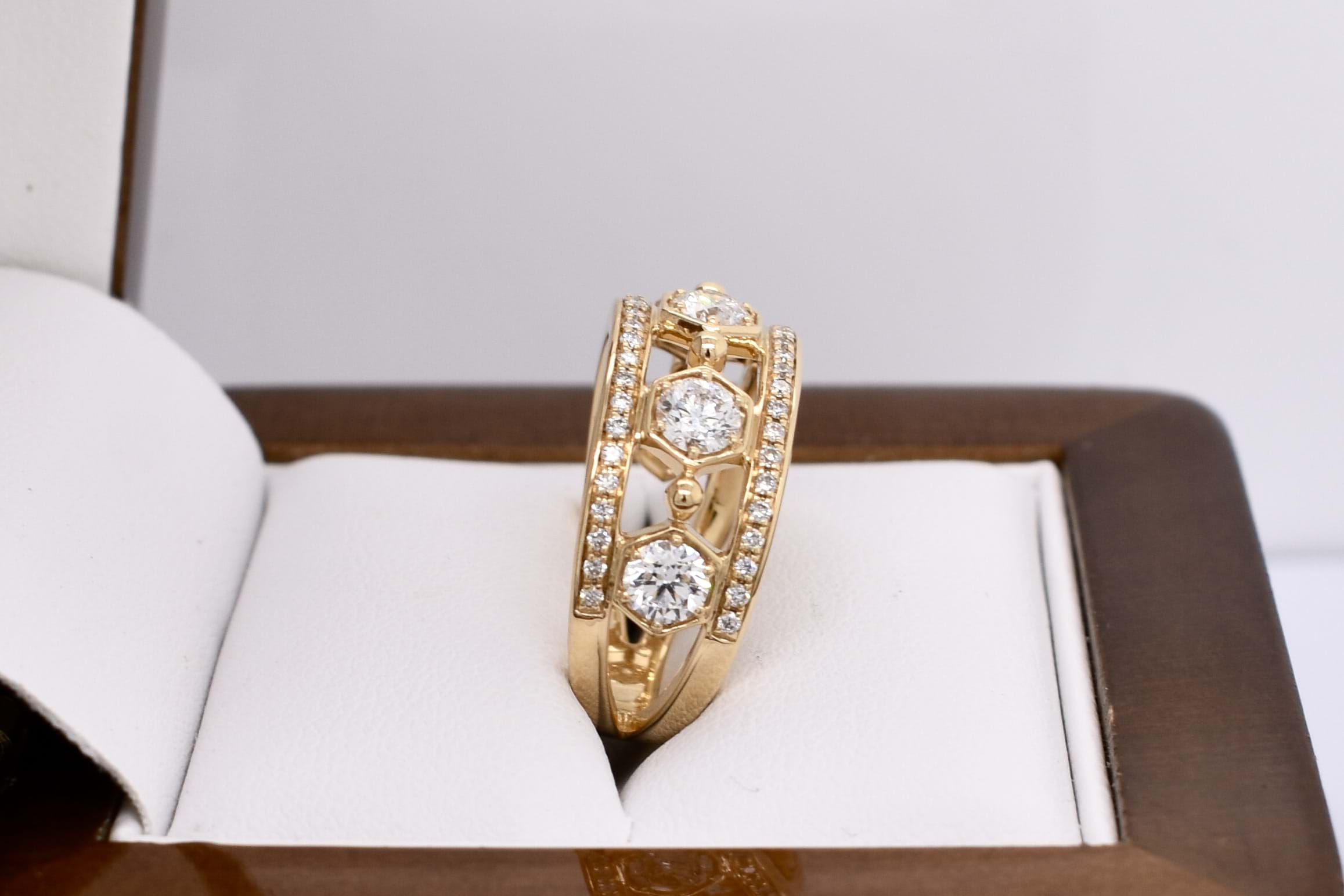 Absolute showstopper, this awesome wide dress ring is crafted in 18ct yellow gold and contains 57 round brilliant cut diamonds. The larger ones are set in hexagonal bezels through the gapped centre and a border of smaller diamonds are grain set above and below. Total diamond weight of 1.27ct G SI1. Finger size M+. Independent Valuation available upon purchase.