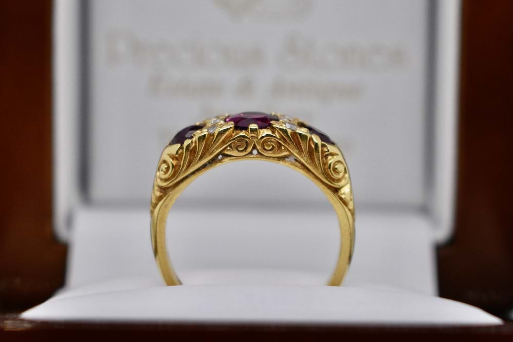Hallmarked London 1975 this stunning bridge ring has been crafted in 18ct yellow gold and features a large centre ruby of 0.80cts with a smaller ruby on each side totalling 2=0.66cts. The rubies are separated by three vertically grain set diamonds with a combined total of 0.12cts. Finger size K. Independent Valuation Supplied