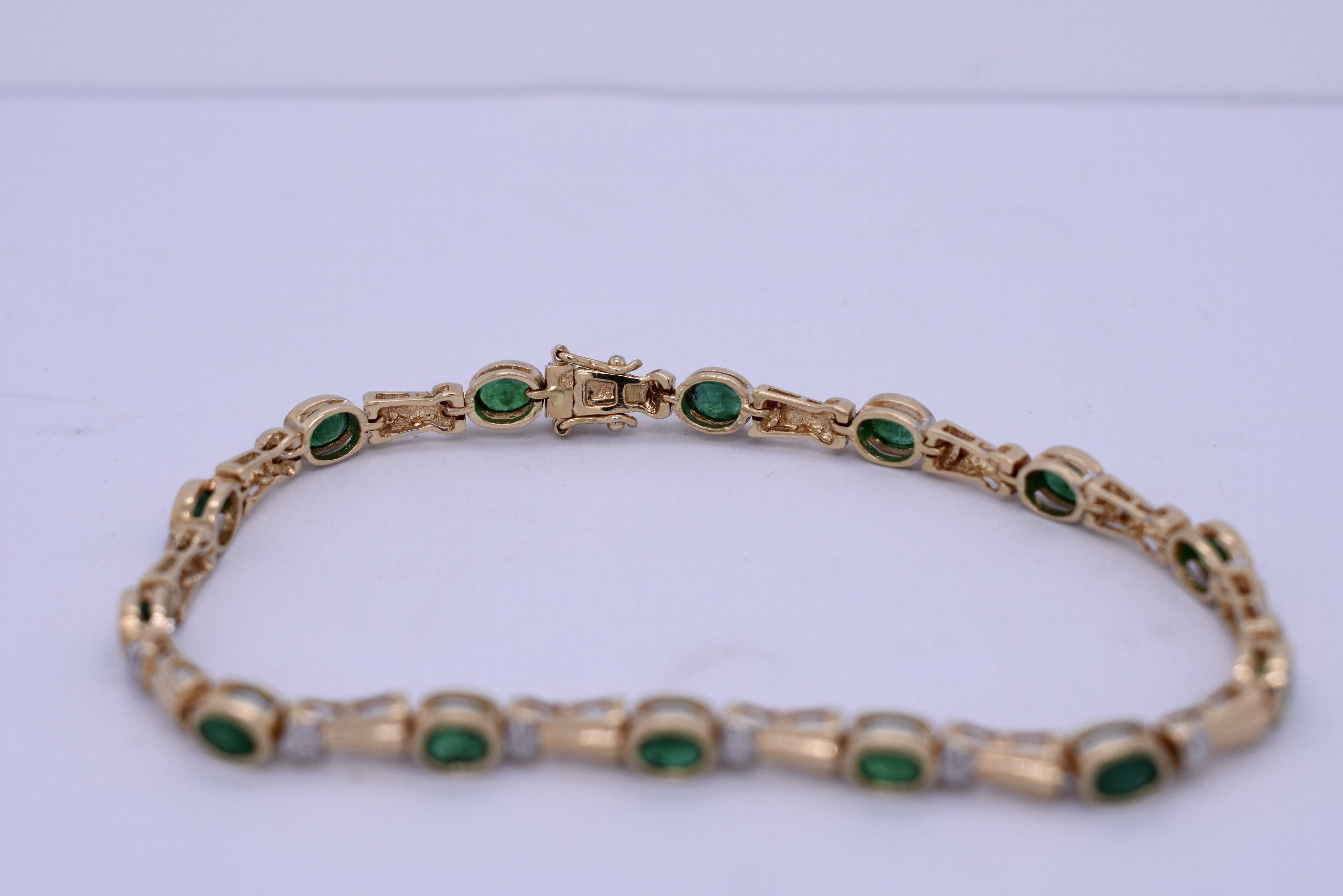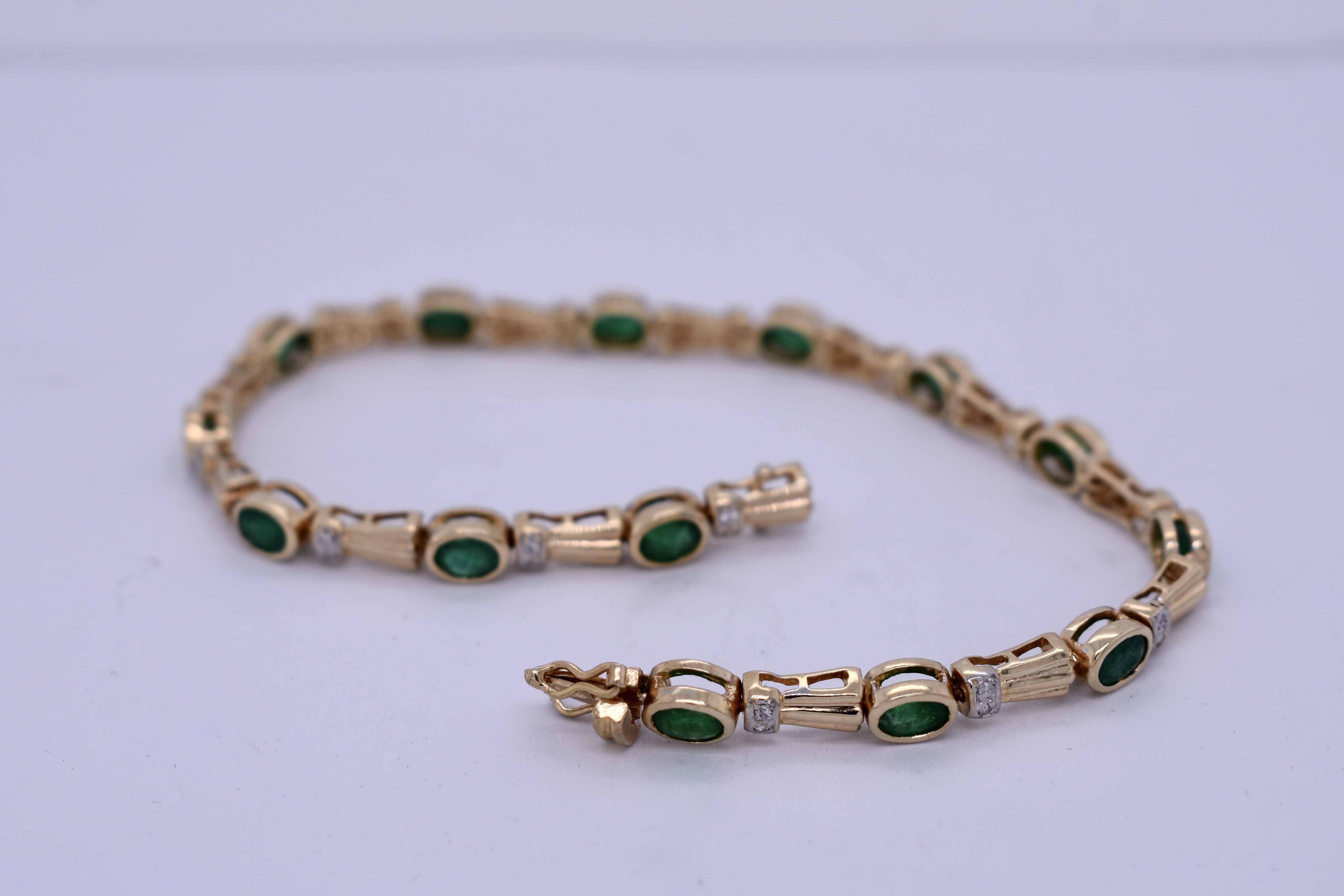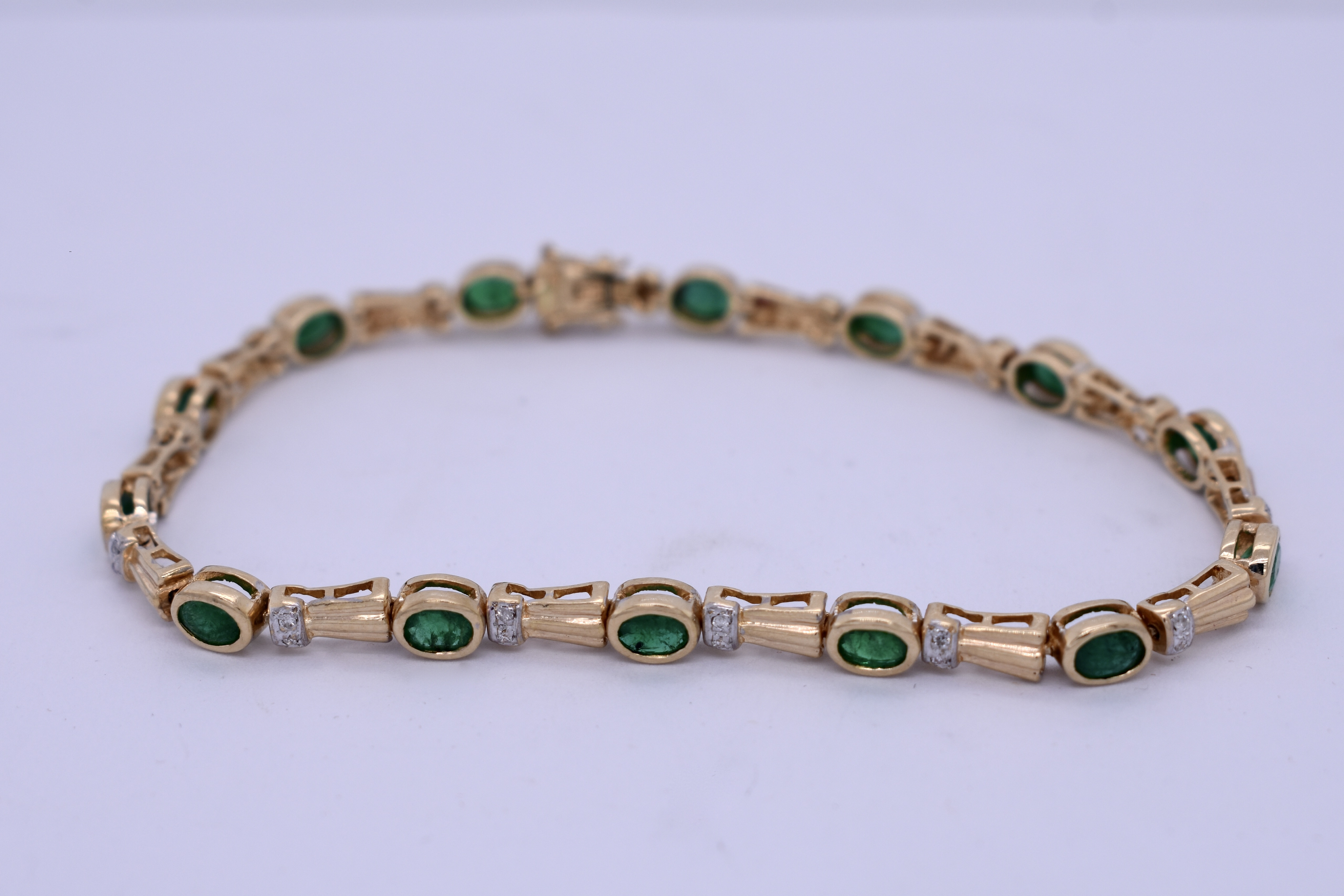 Crafted in 18ct yellow gold, this lovely bracelet alternates oval emeralds and diamond set links in a pretty, grooved design. Fourteen emeralds, totalling 1.80ct, are rub over set and show a mid to dark green hue. Between them, pairs of round brilliant cut diamonds are grain set into small white gold settings for extra sparkle. Combined weight of 0.11ct graded H-J colour and P2 clarity. The bracelet is finished with a concealed box clasp and double figure eight safety catches for extra security. Measuring a total of 17.5mm and 9.86grams. Independent valuation supplied.