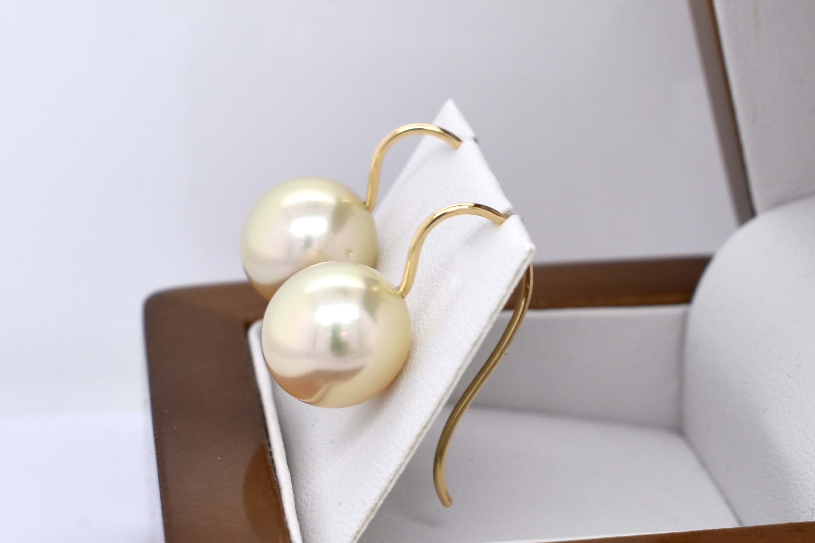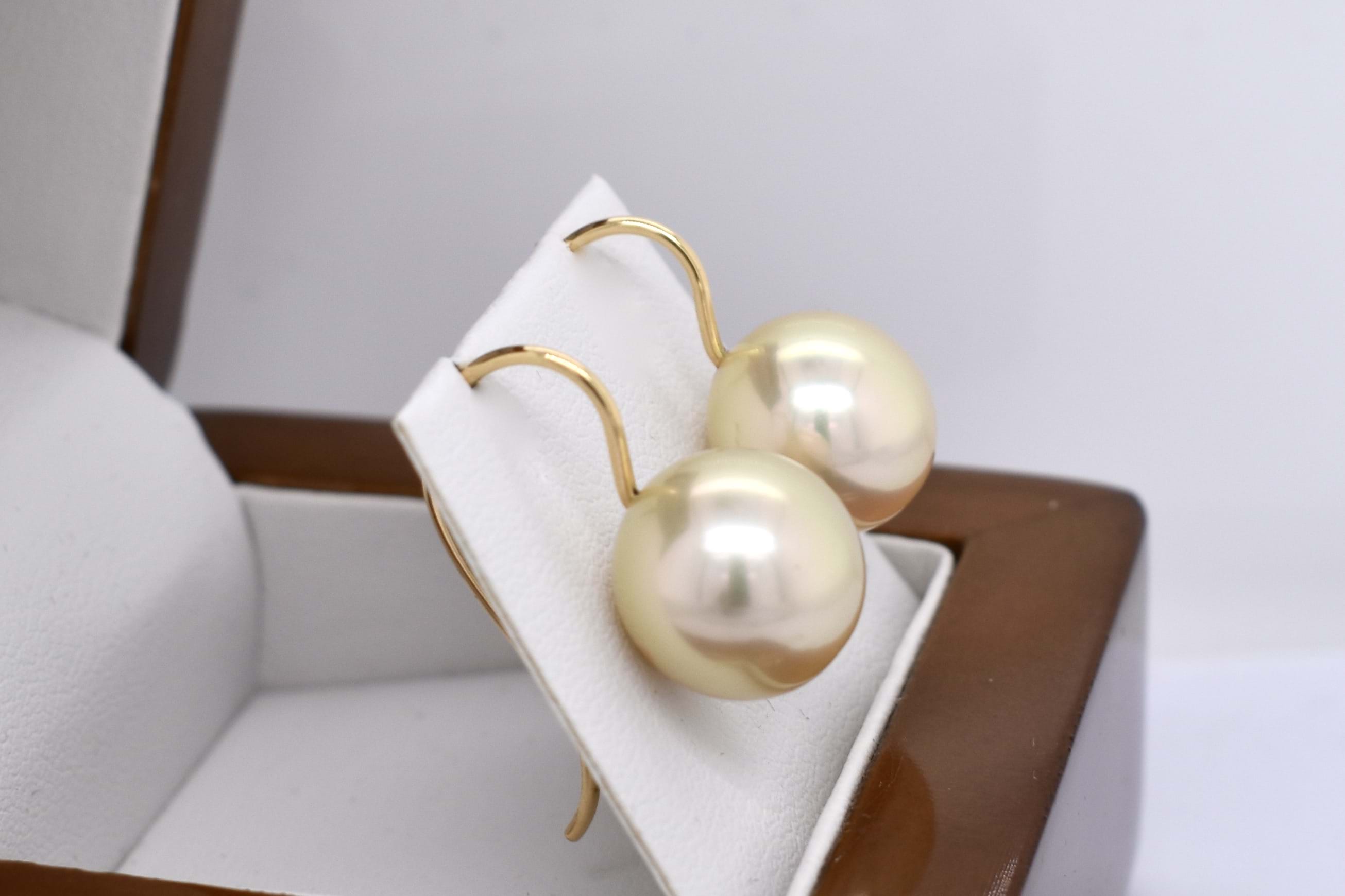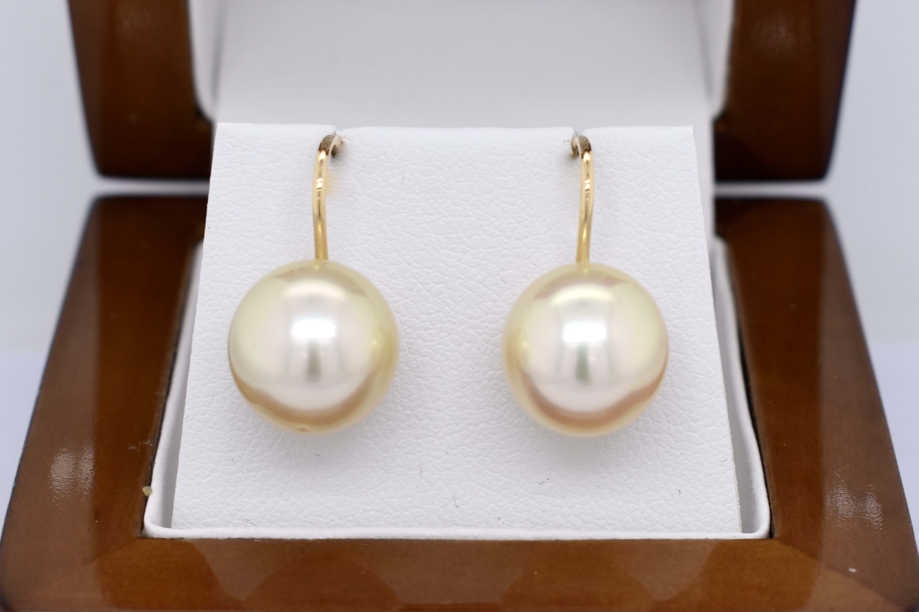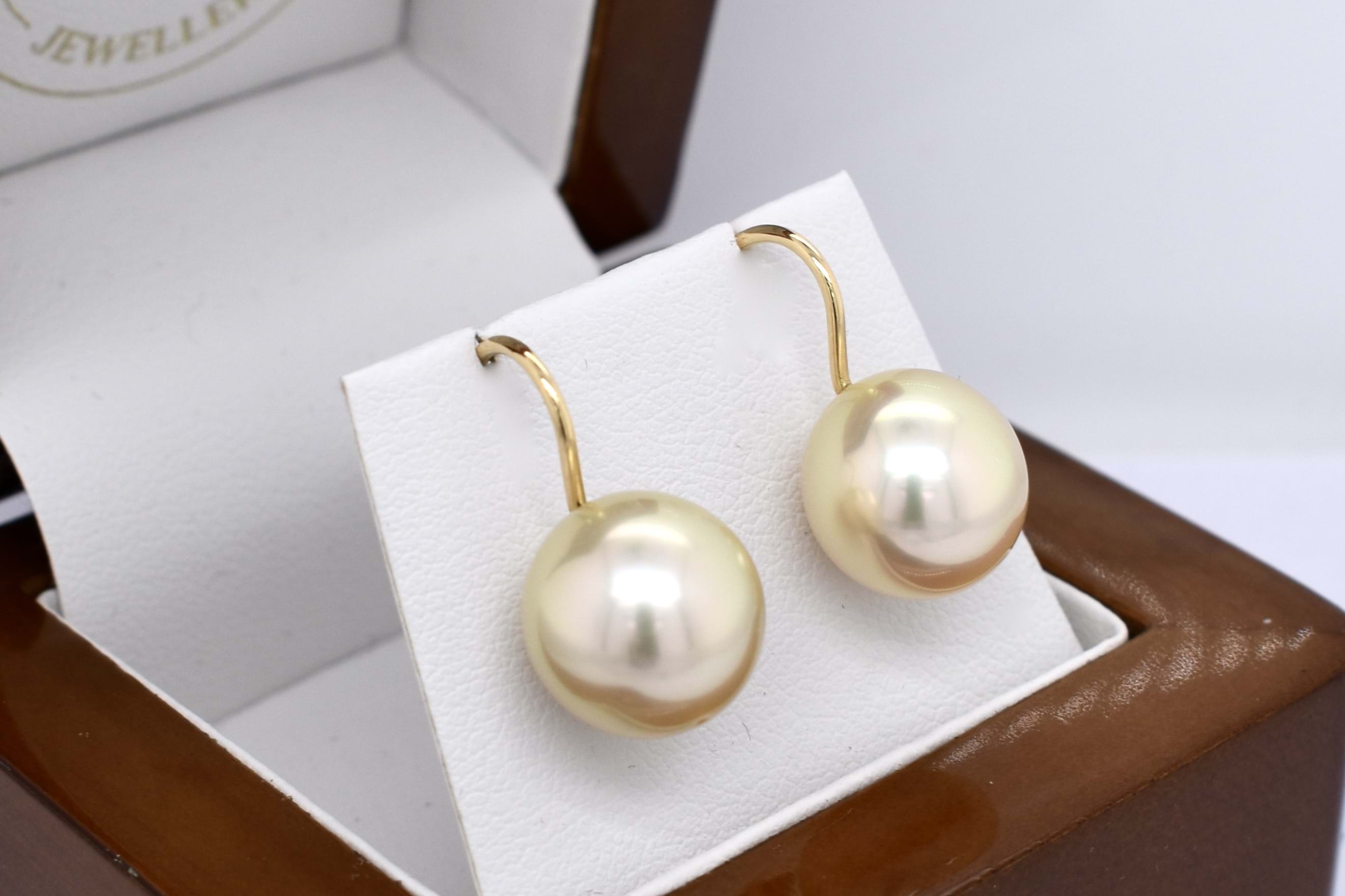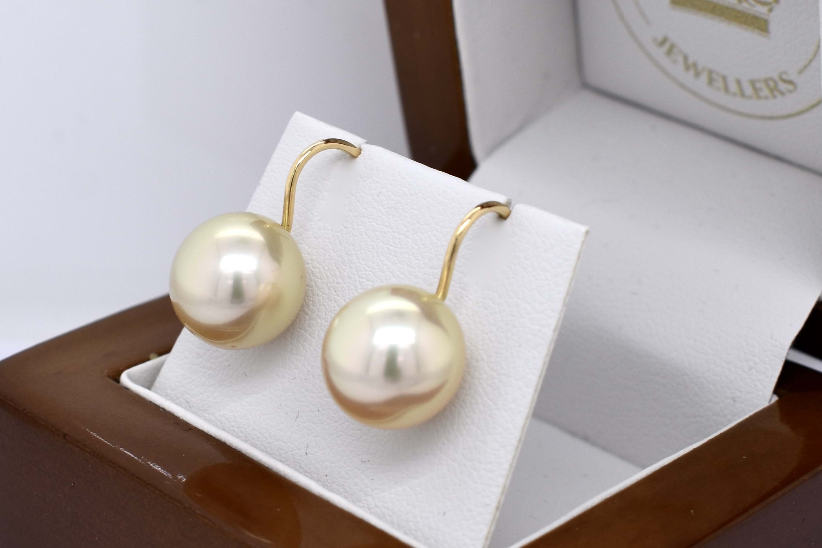 A sunny golden pair of south sea pearls measuring approx 11.5mm with a light gold colour and high lustre. Set in a simple curved 18ct yellow gold shepherd hook fittings.