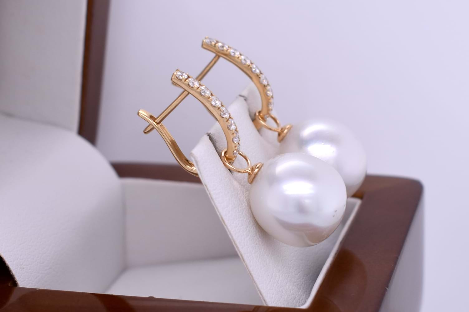 A simple and elegant pair of semi round 12.57-12.42mm south sea pearls with 18ct yellow gold cap and ring fittings perfect to suspend from diamond huggies. Pearls independently graded as: oval, good lustre, pink/white hue, moderately included. Independent Valuation Supplied. Diamond huggies pictured are available for separate purchase.