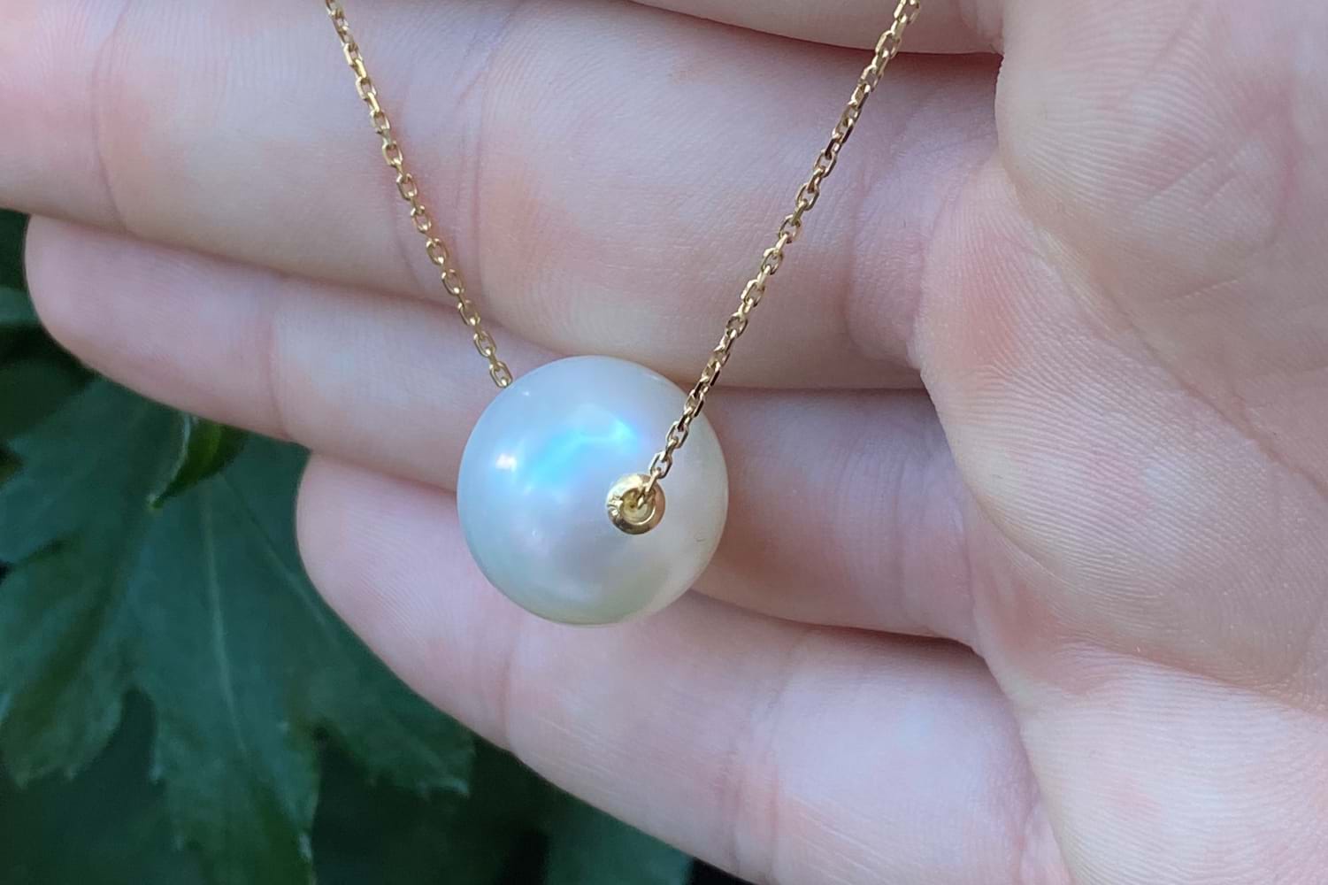 The prettiest south sea pearl necklet, featuring one white/light pink hue 16.09mm near round, good lustre pearl on an 18ct yellow gold diamond cut trace link chain. Chain goes through a drilled whole in the centre of the pearl to give a floating effect. Necklace measures 49cm. Independent Valuation Supplied