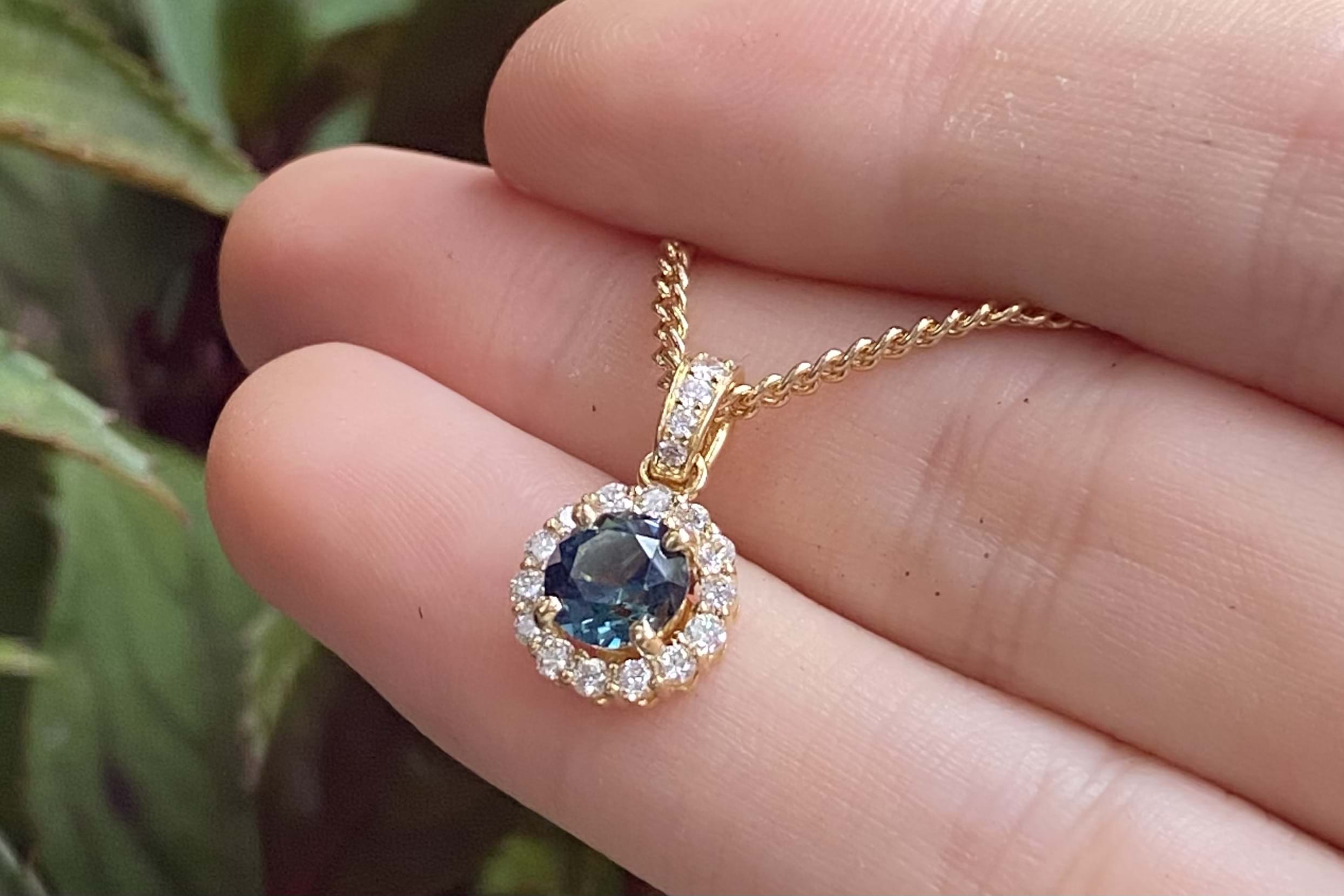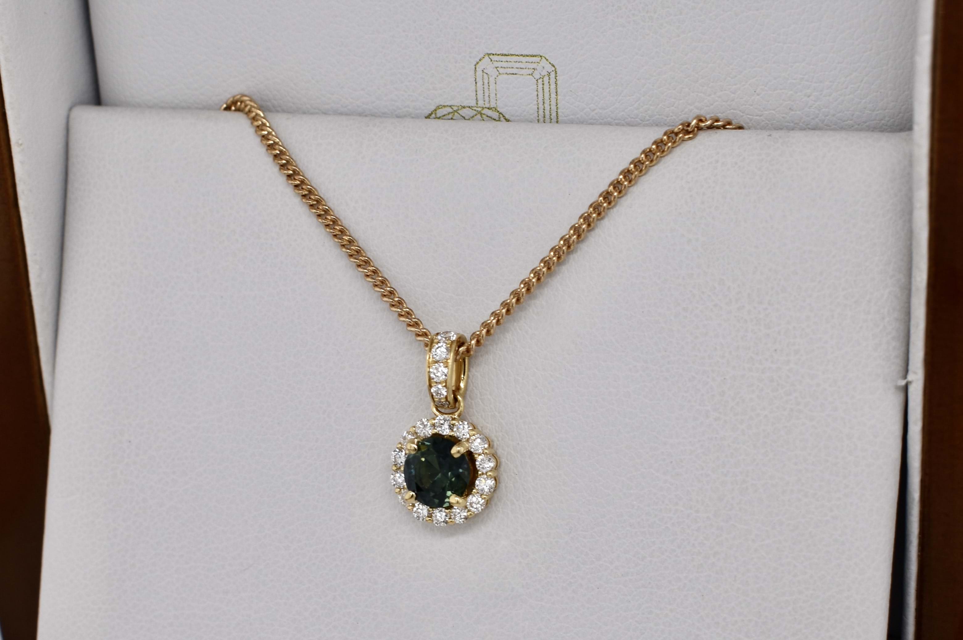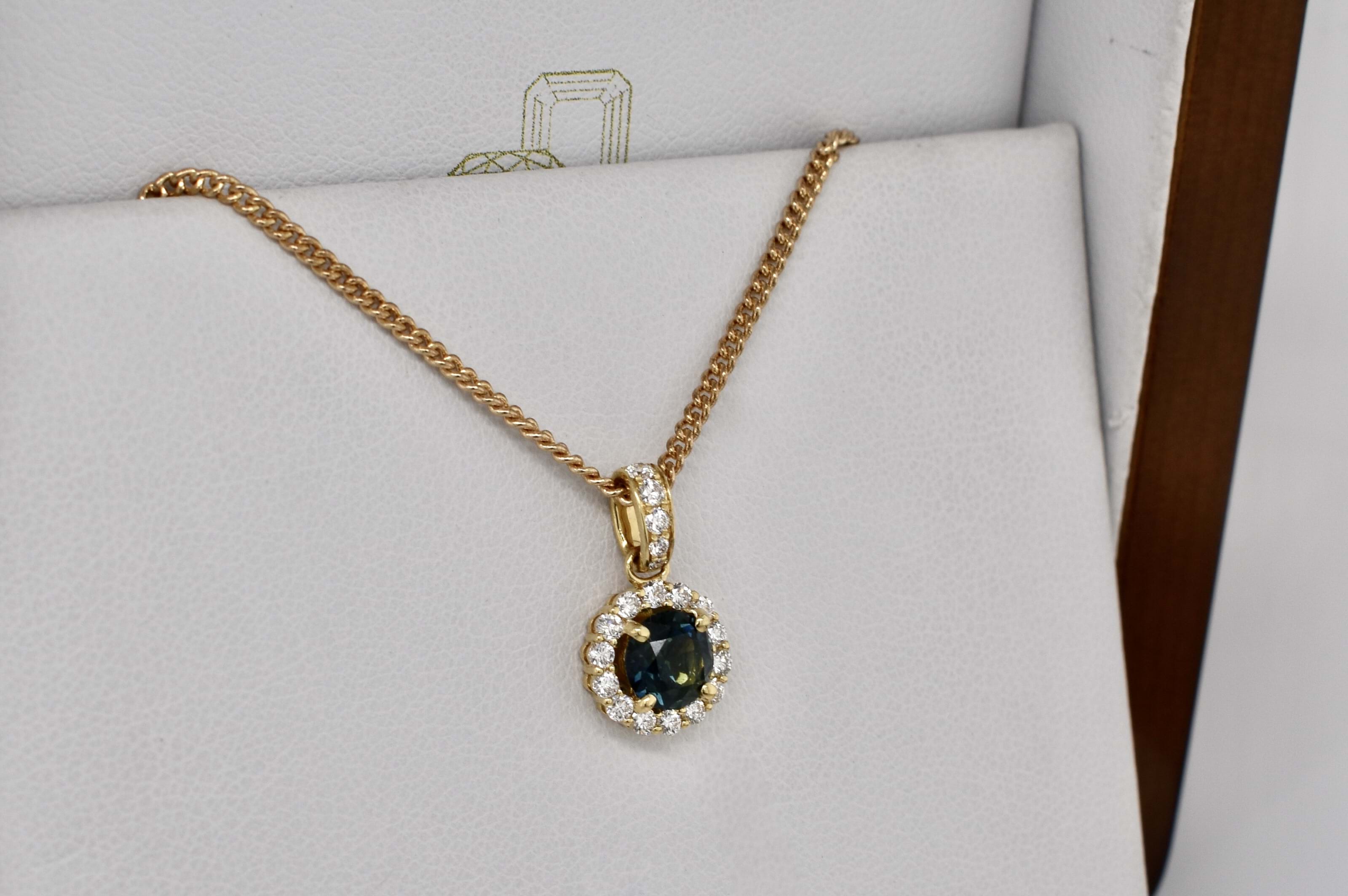 This beautiful 1.00ct Australian sapphire displays a stunning greenish blue colour (teal) and was hand selected in store to be the feature of this classic diamond pendant. Crafted in 18ct yellow gold the pendant has a simple shimmering halo of round brilliant diamonds and a diamond set bale with a total diamond content of 0.34ct FG/VS-SI. Chains are available for separate purchase. Independent Valuation Supplied