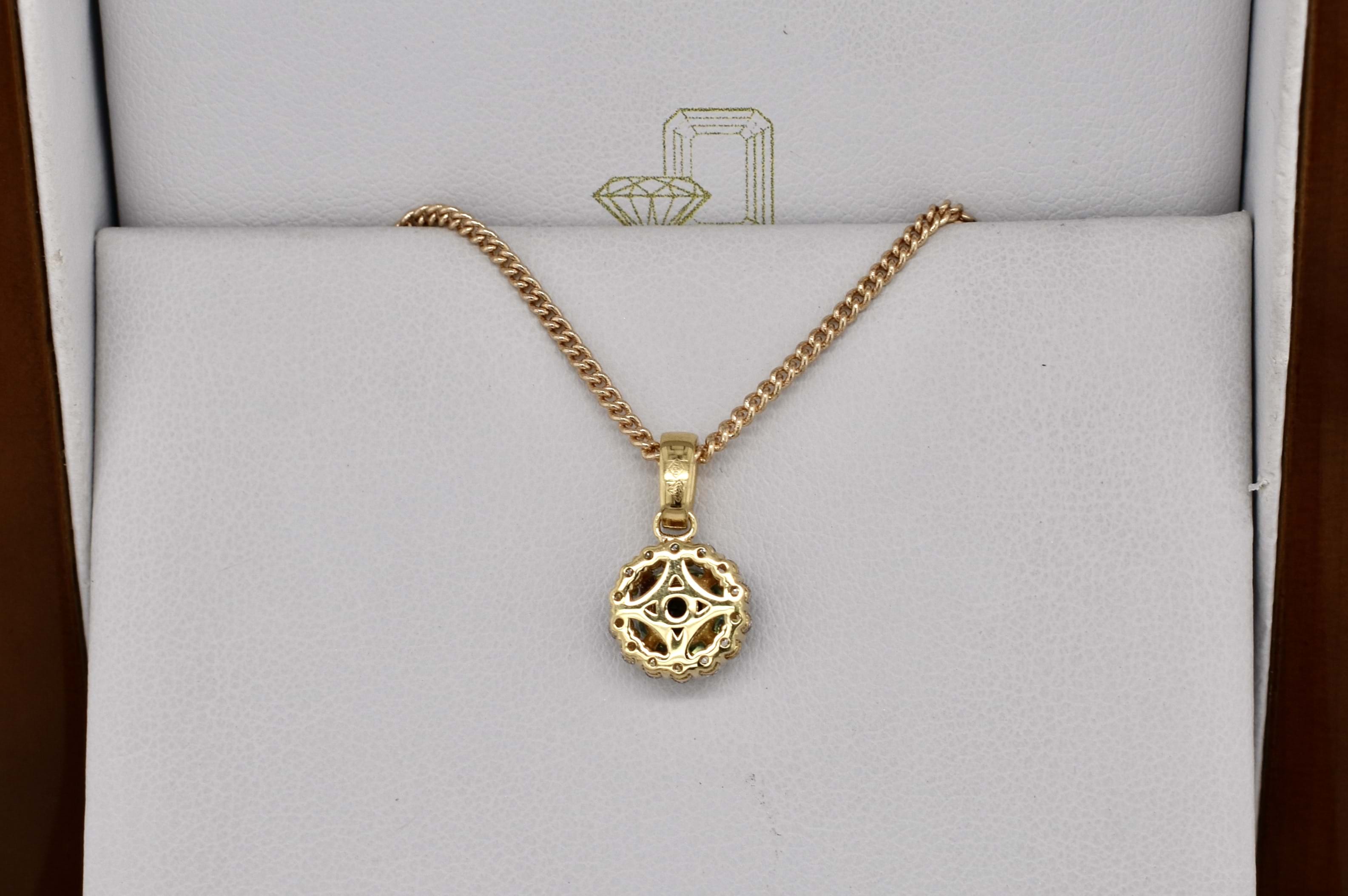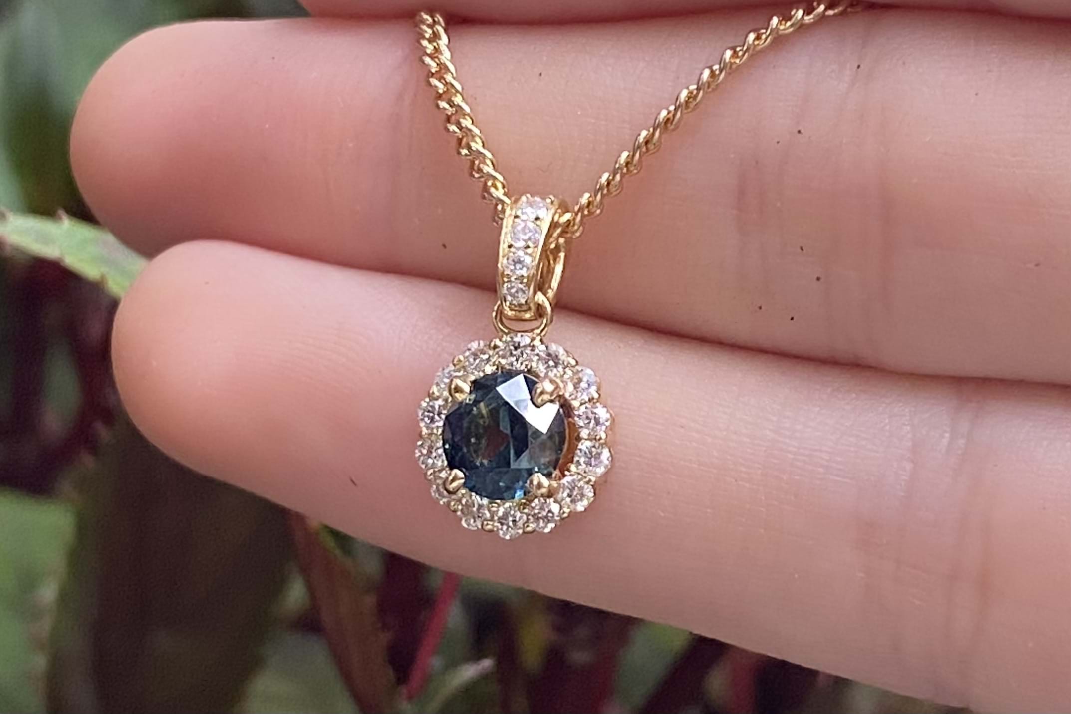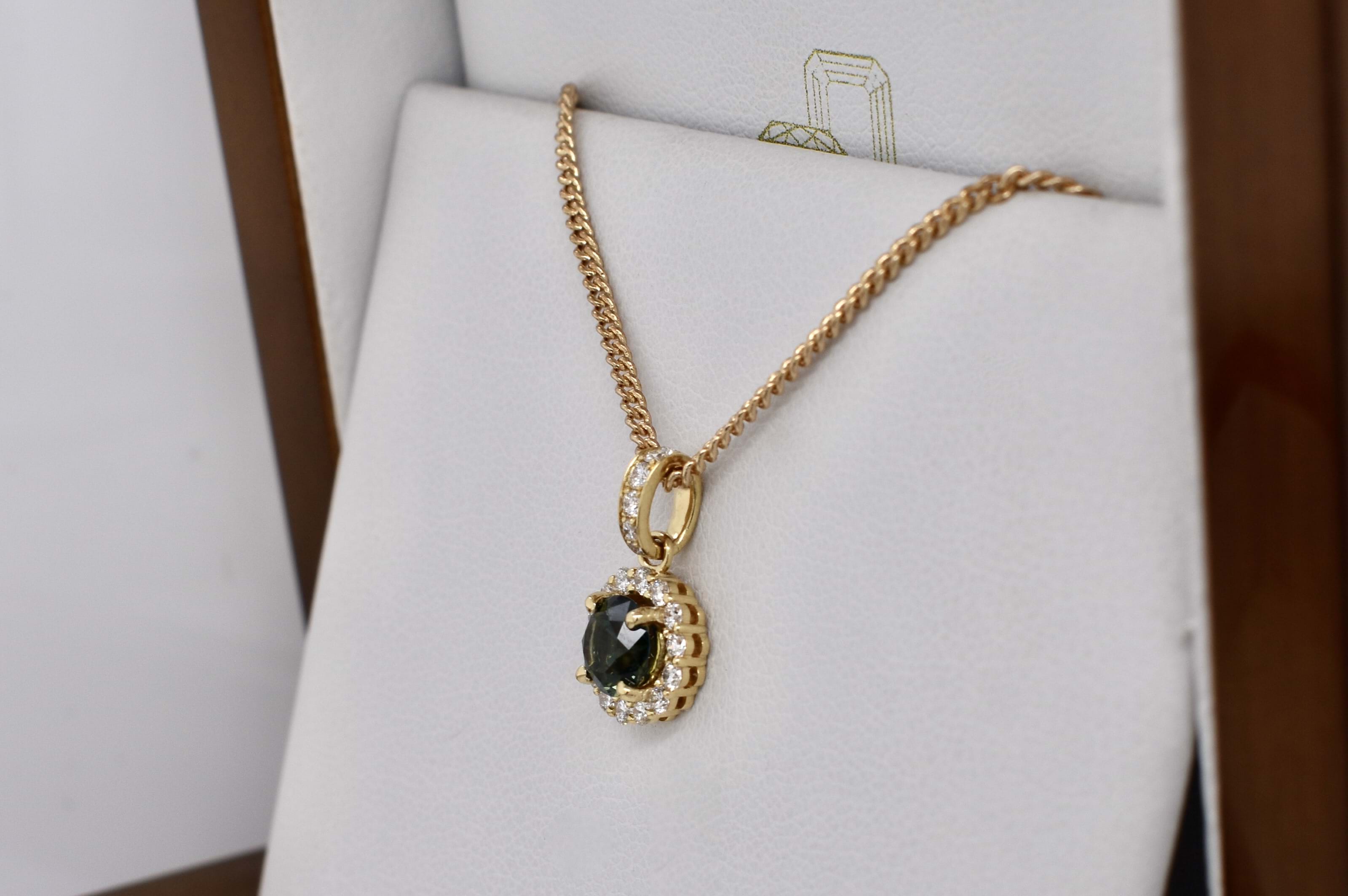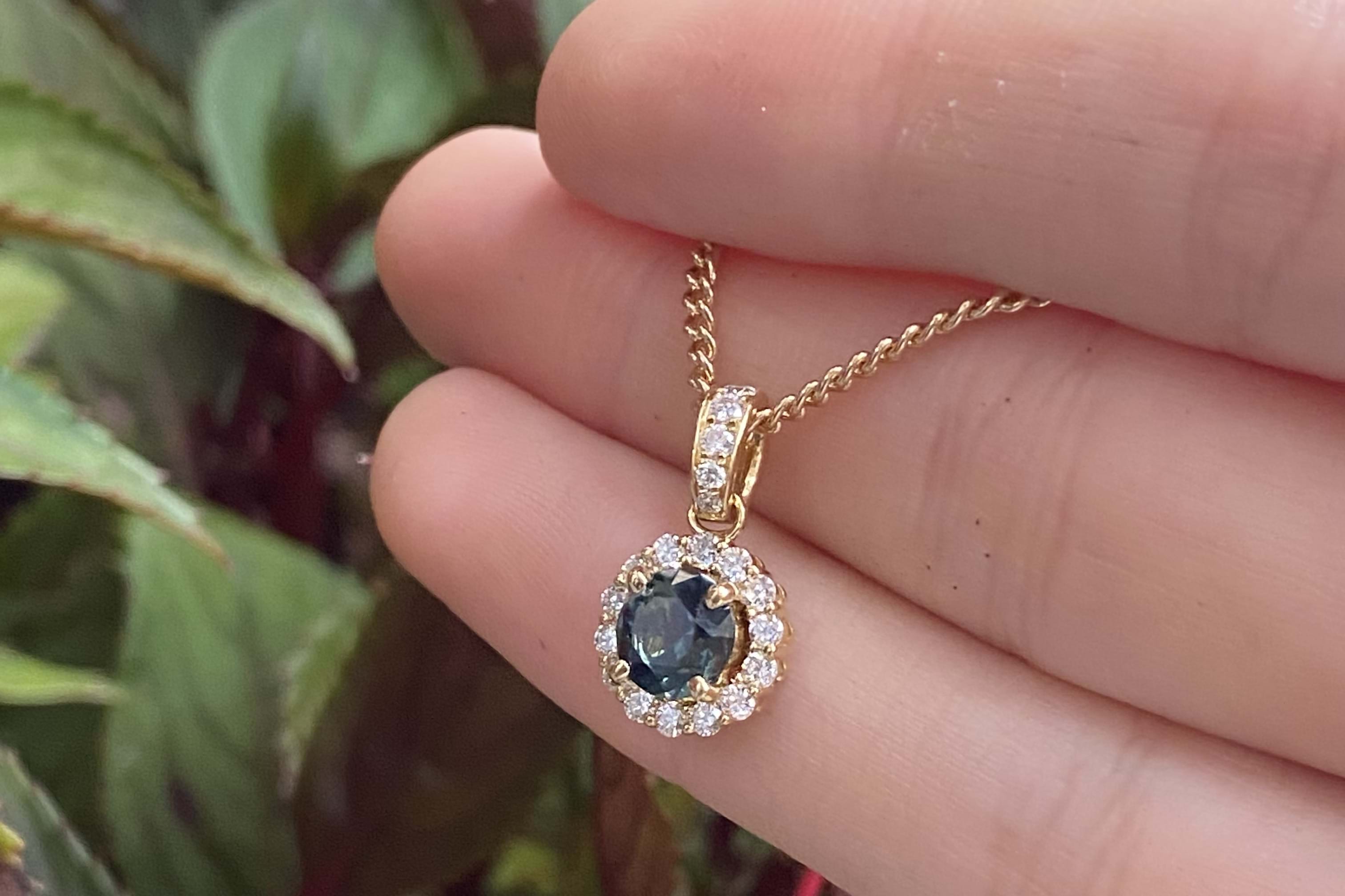 This beautiful 1.00ct Australian sapphire displays a stunning greenish blue colour (teal) and was hand selected in store to be the feature of this classic diamond pendant. Crafted in 18ct yellow gold the pendant has a simple shimmering halo of round brilliant diamonds and a diamond set bale with a total diamond content of 0.34ct FG/VS-SI. Chains are available for separate purchase. Independent Valuation Supplied